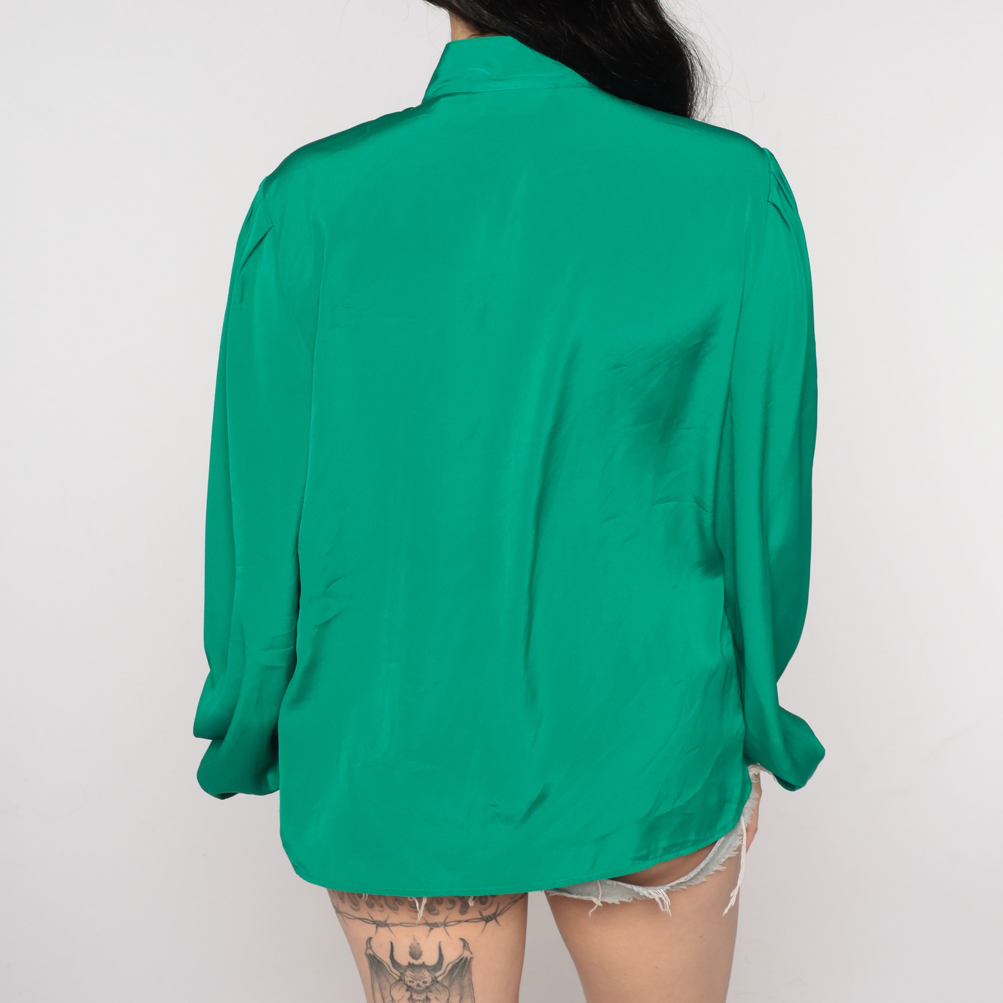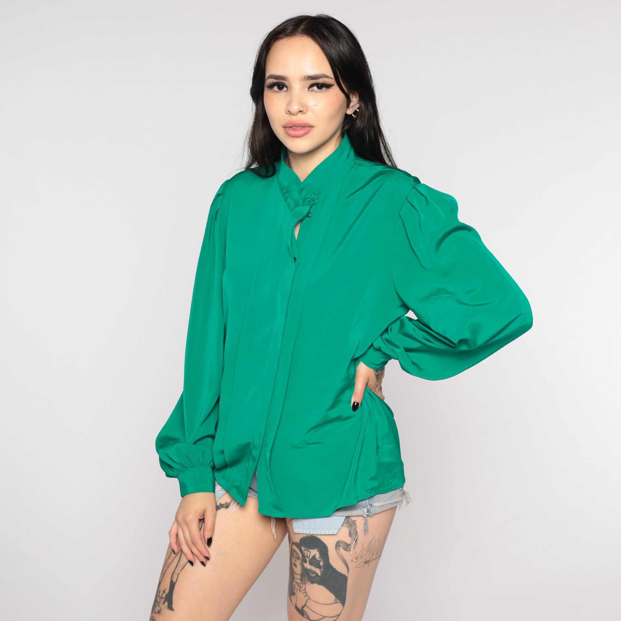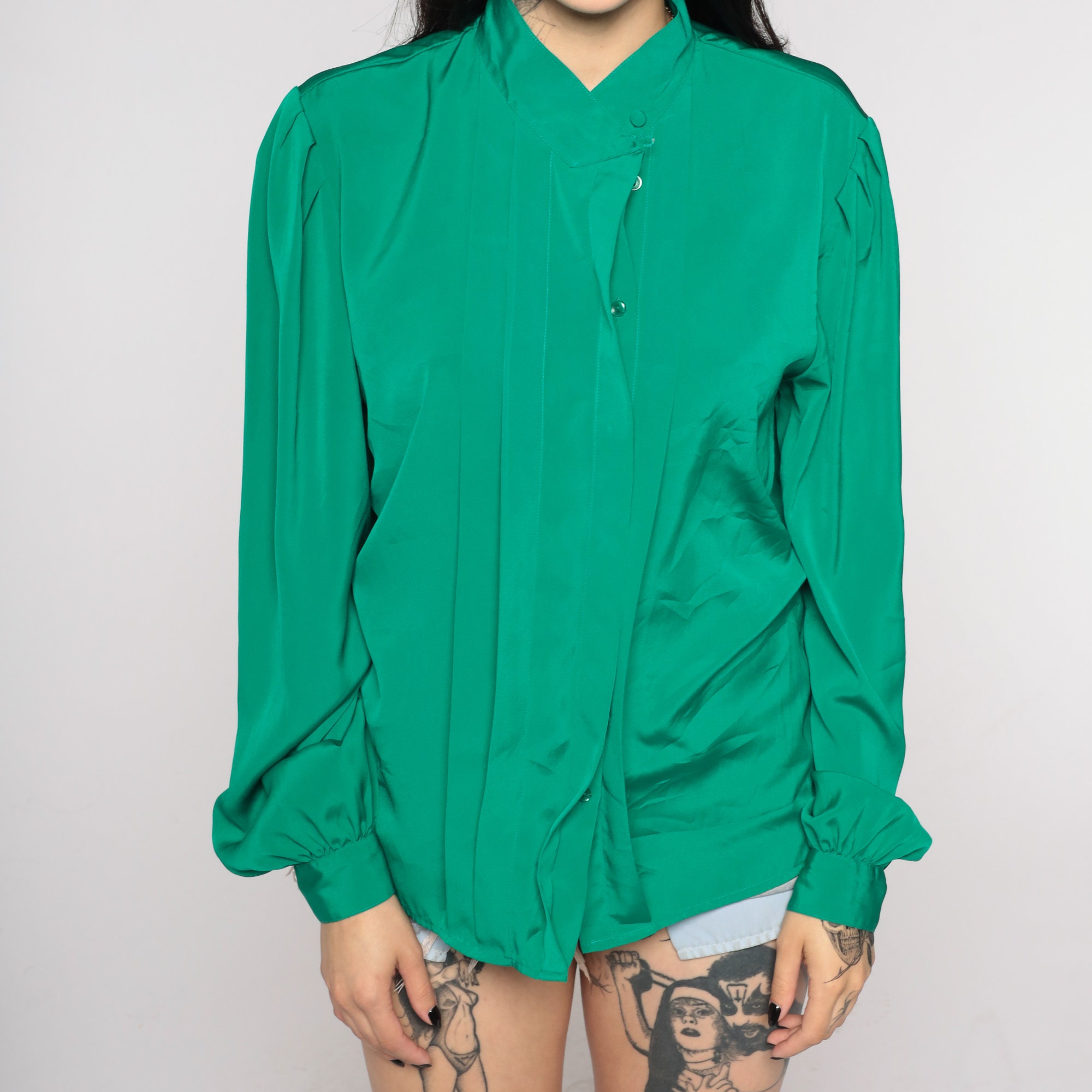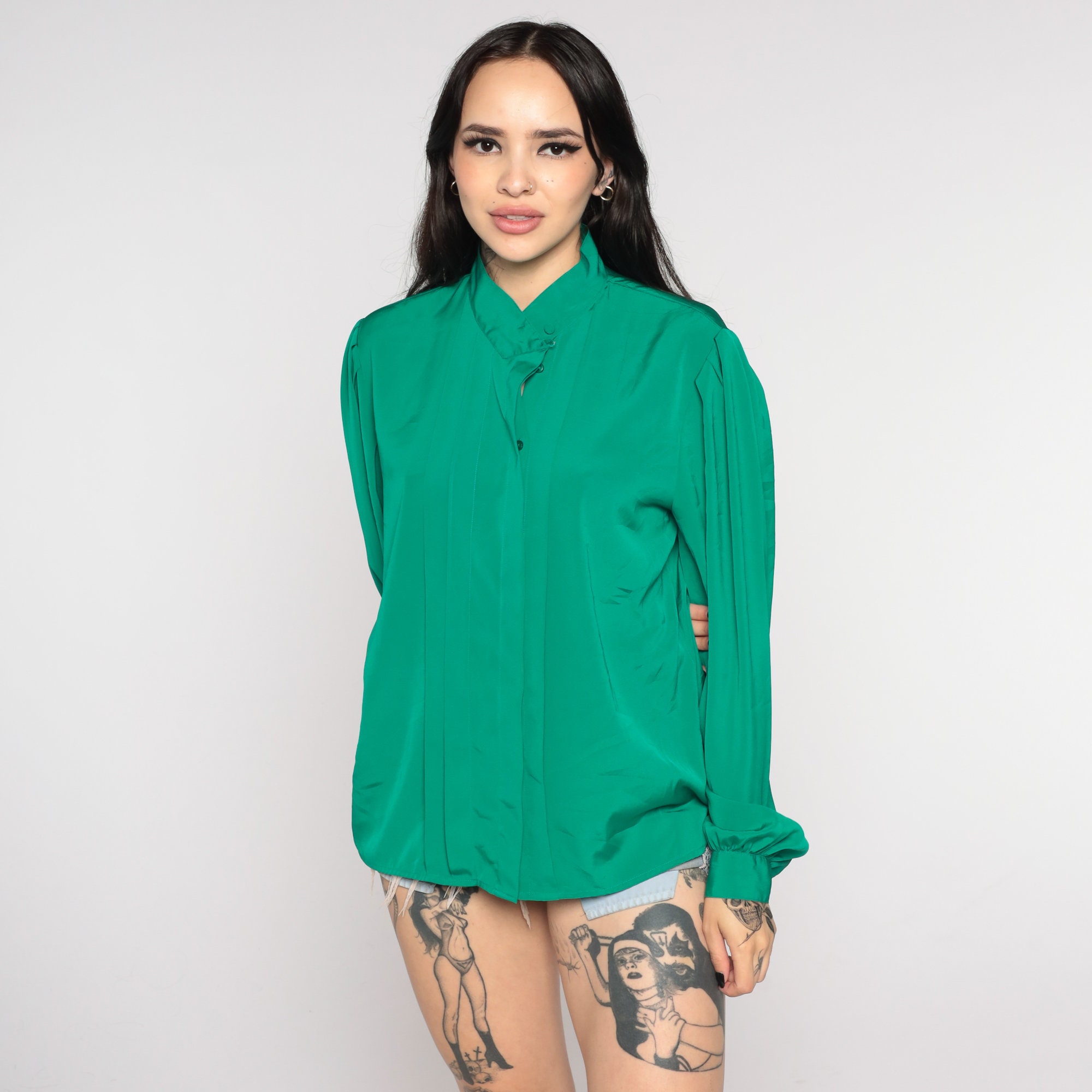 Vintage 80s shirt in green with long puff sleeves, pleats, and hidden buttons up the front.