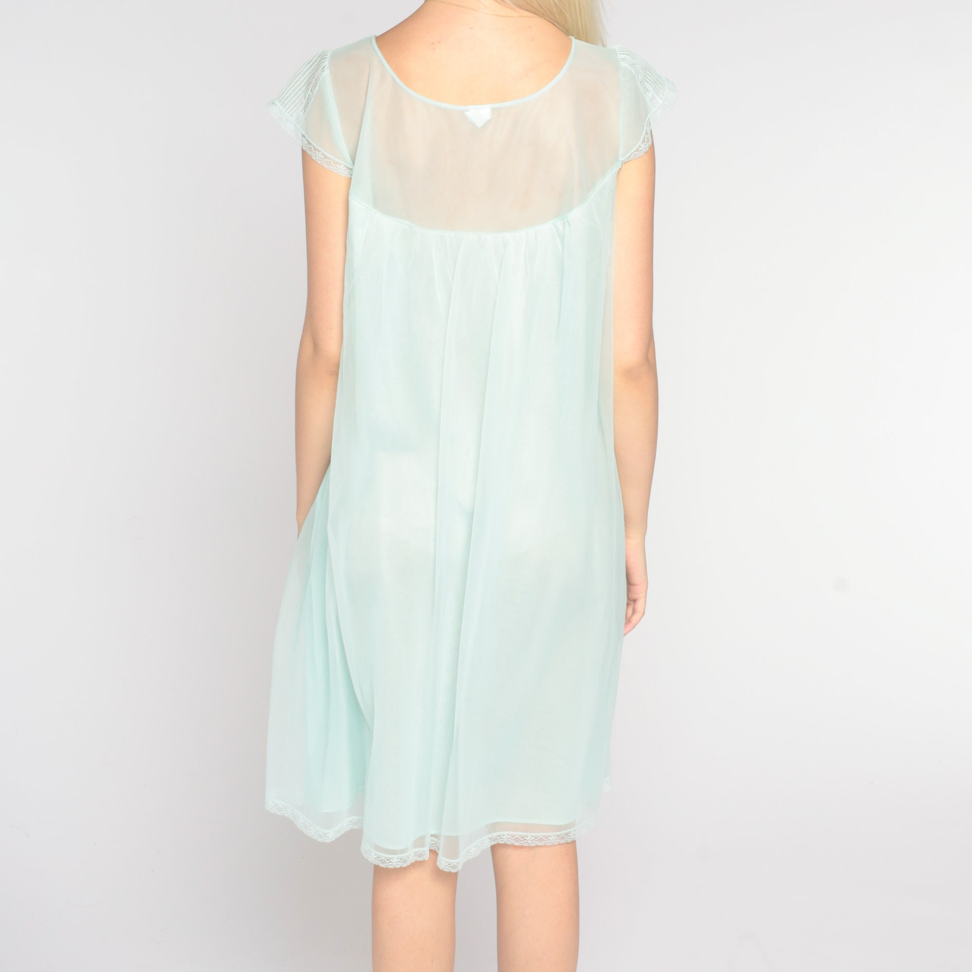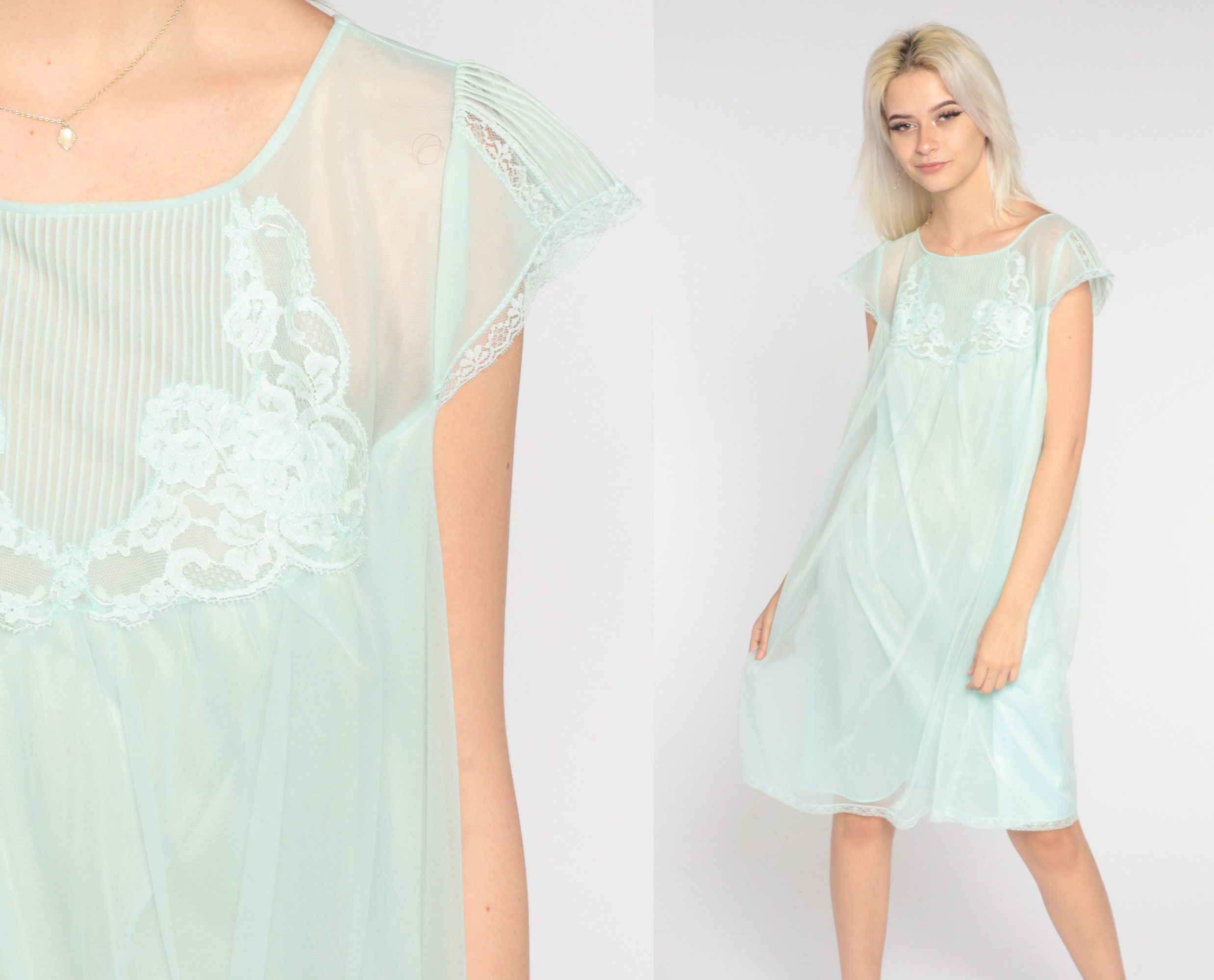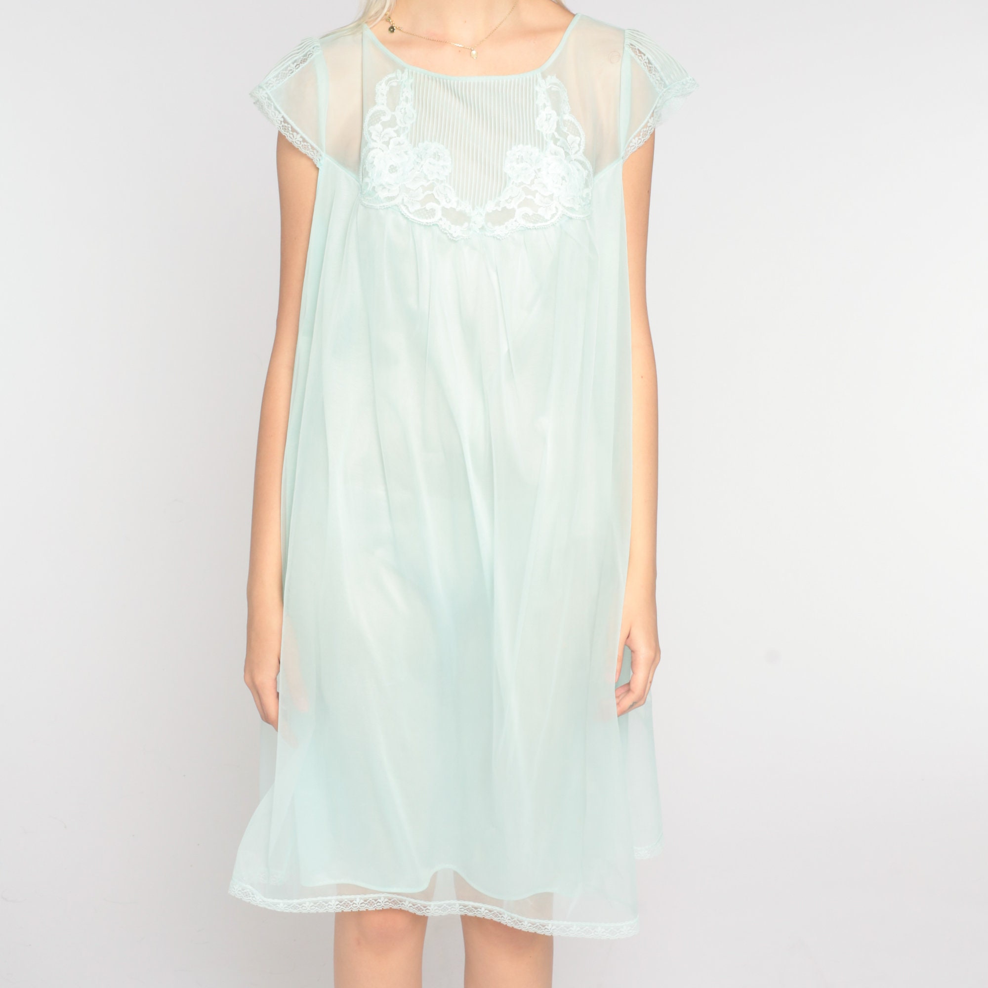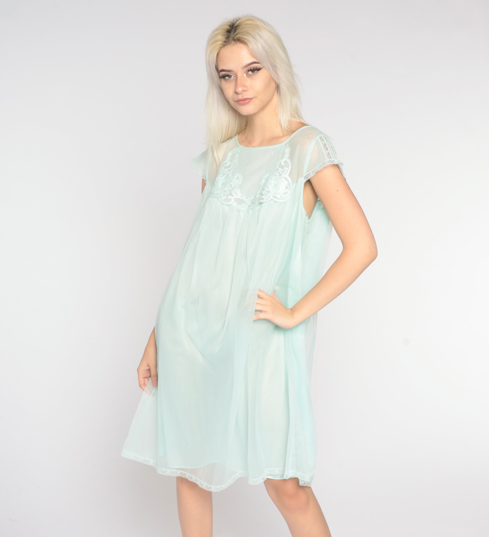 Vintage 70s nightgown in mint nylon with a tent cut and lace trim. Mini length.