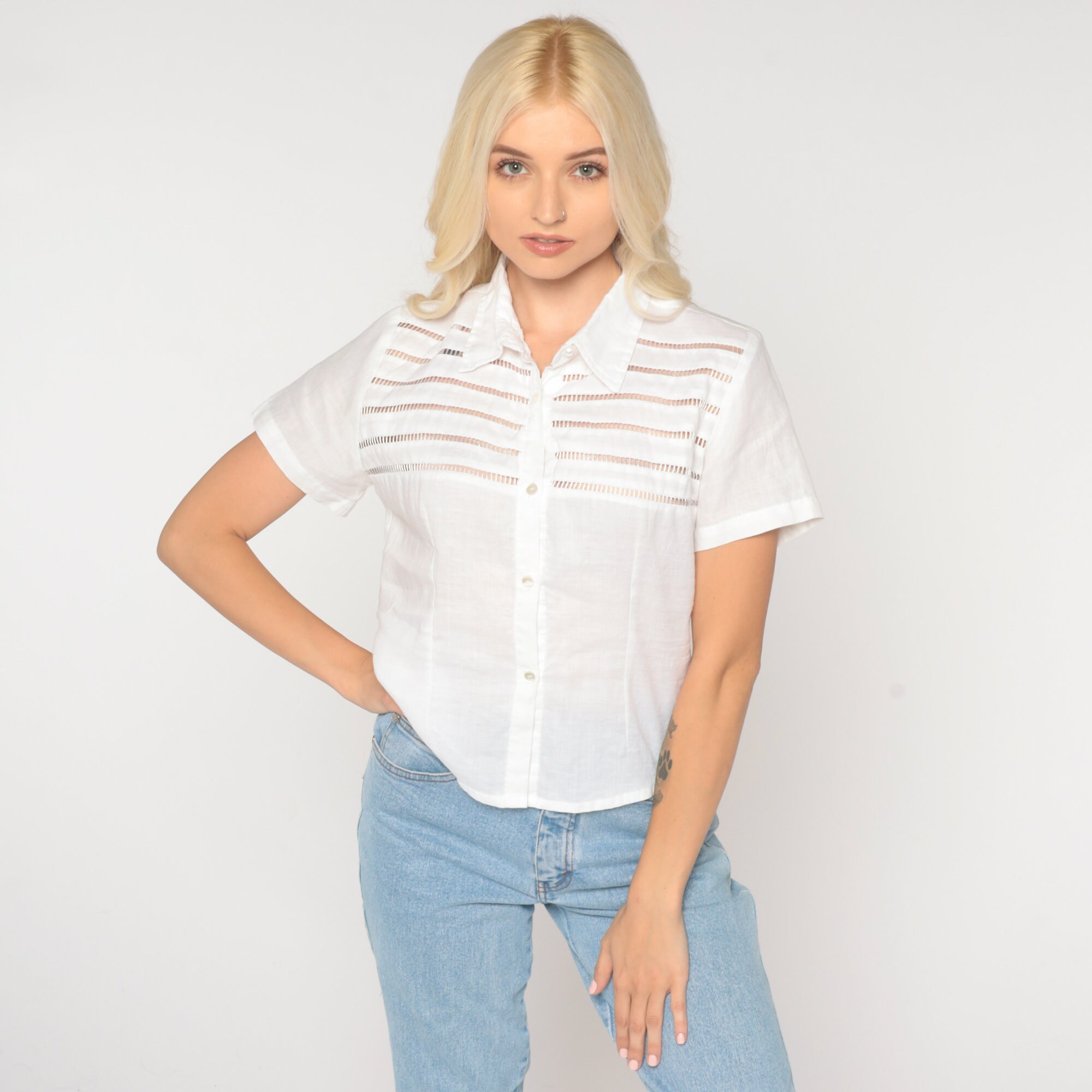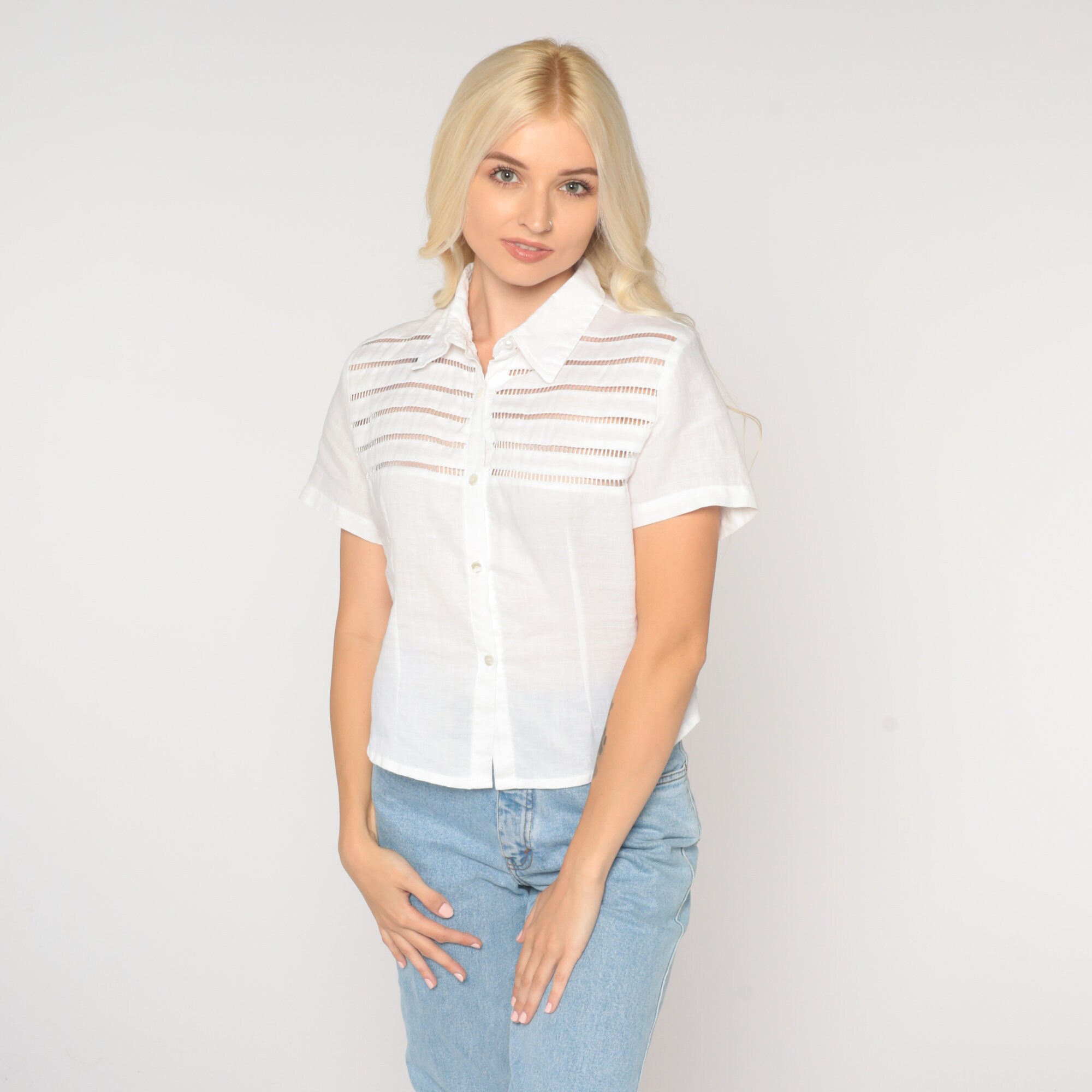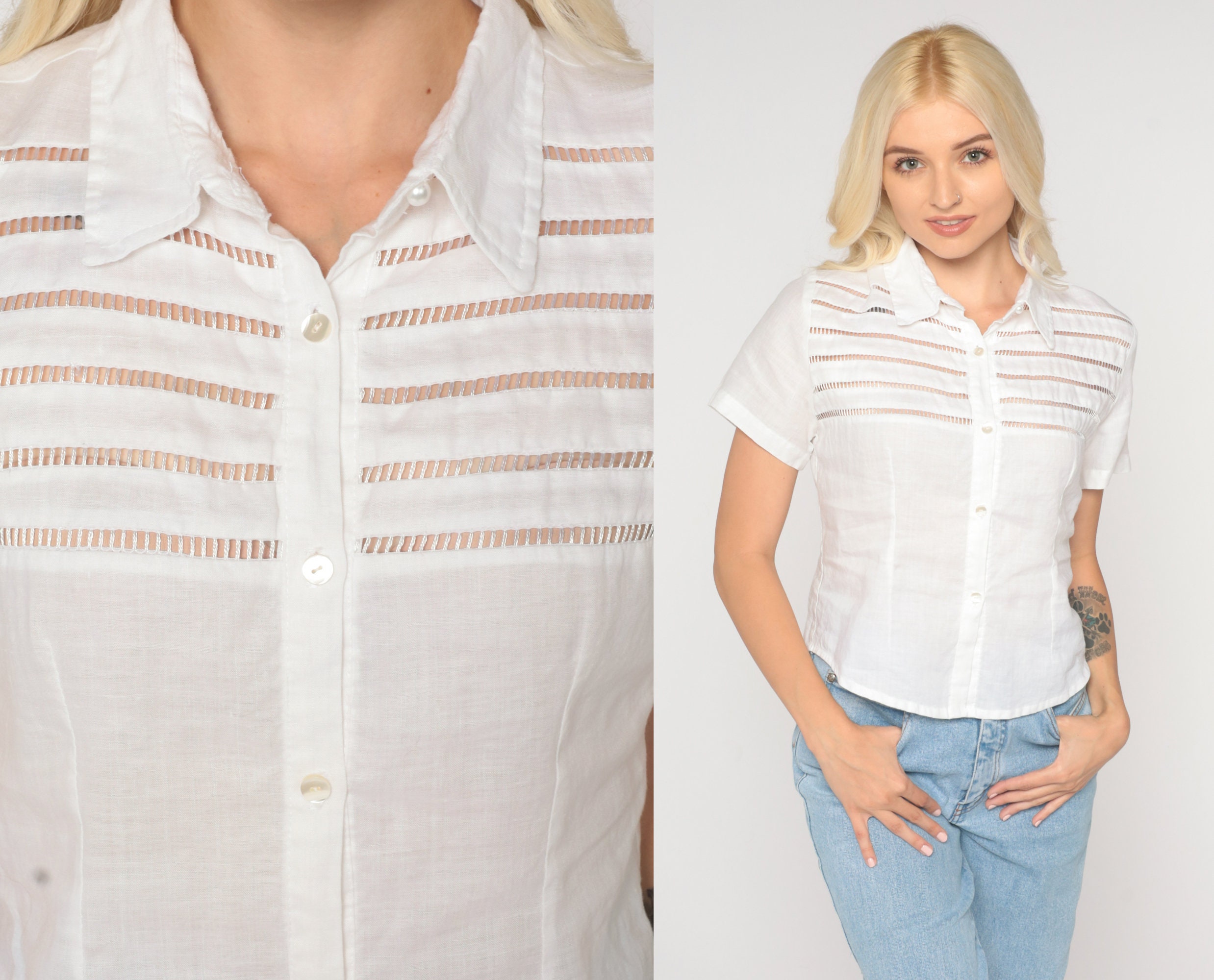 Vintage 90s blouse in white with cutouts. Short sleeves, buttons up the front.
