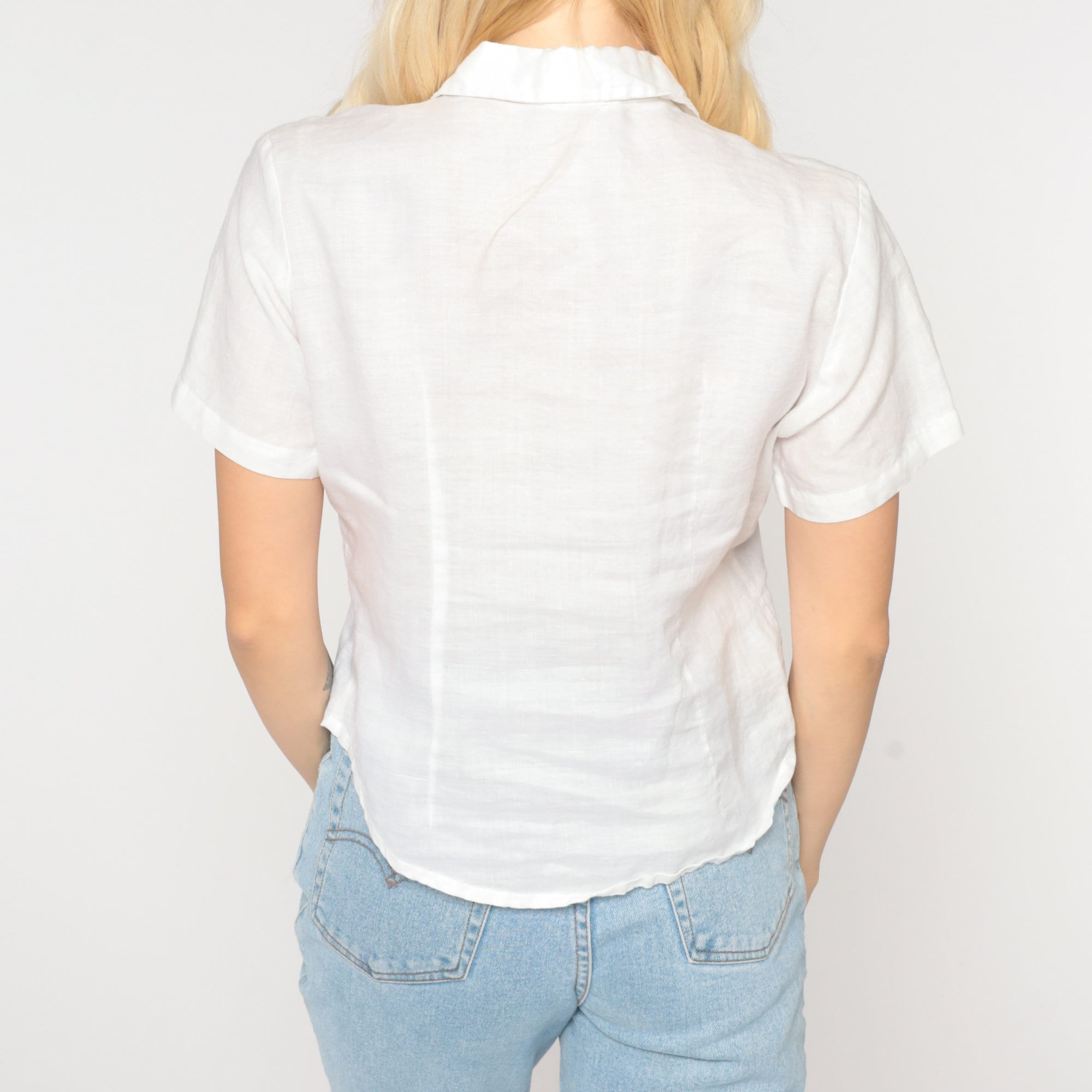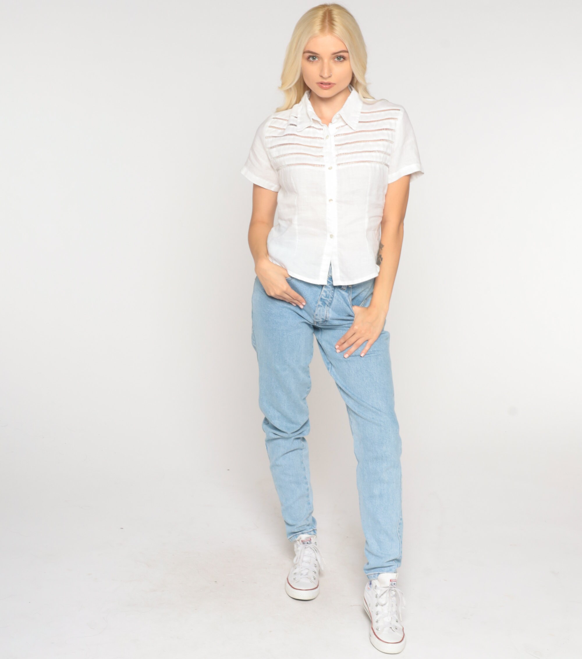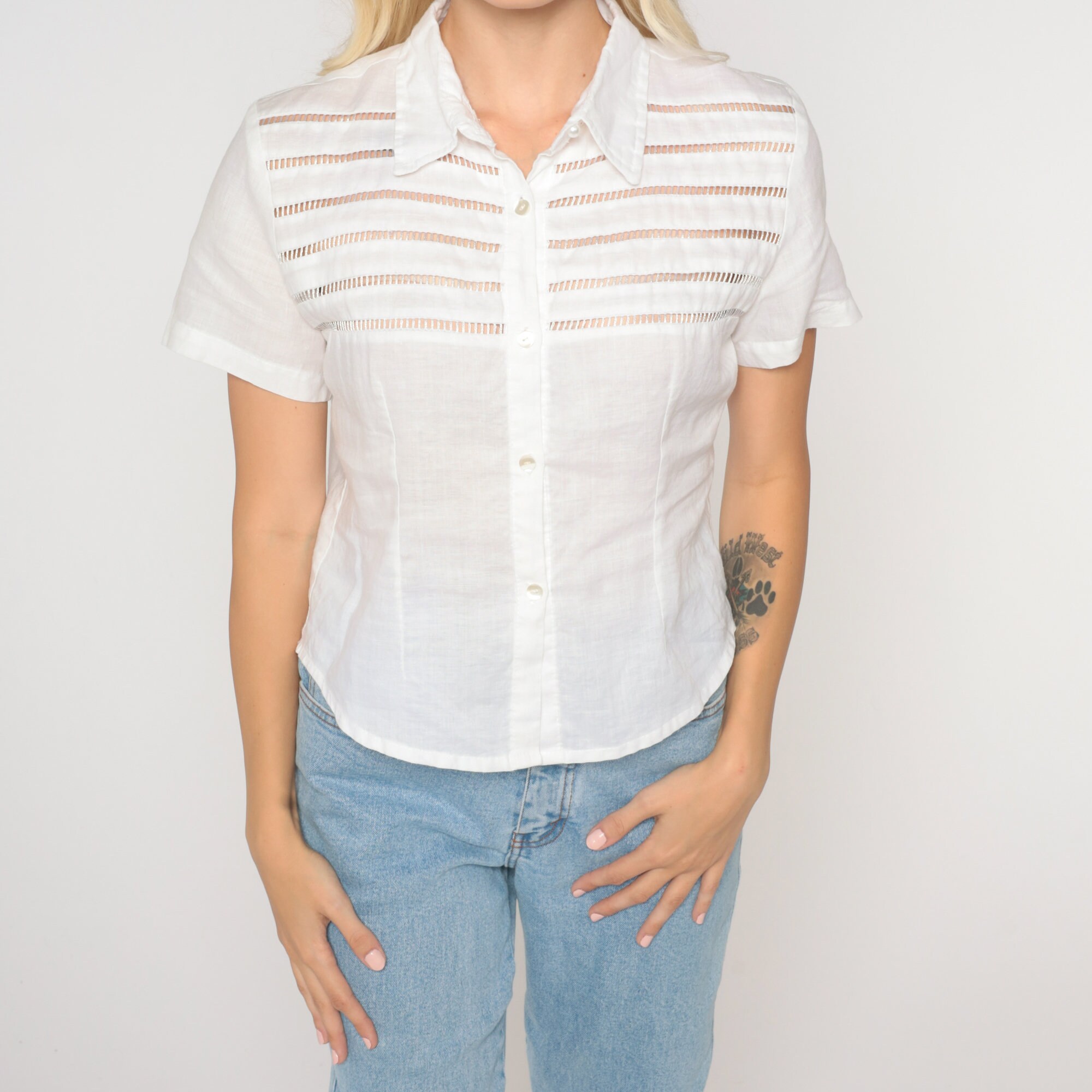 Vintage 90s blouse in white with cutouts. Short sleeves, buttons up the front.