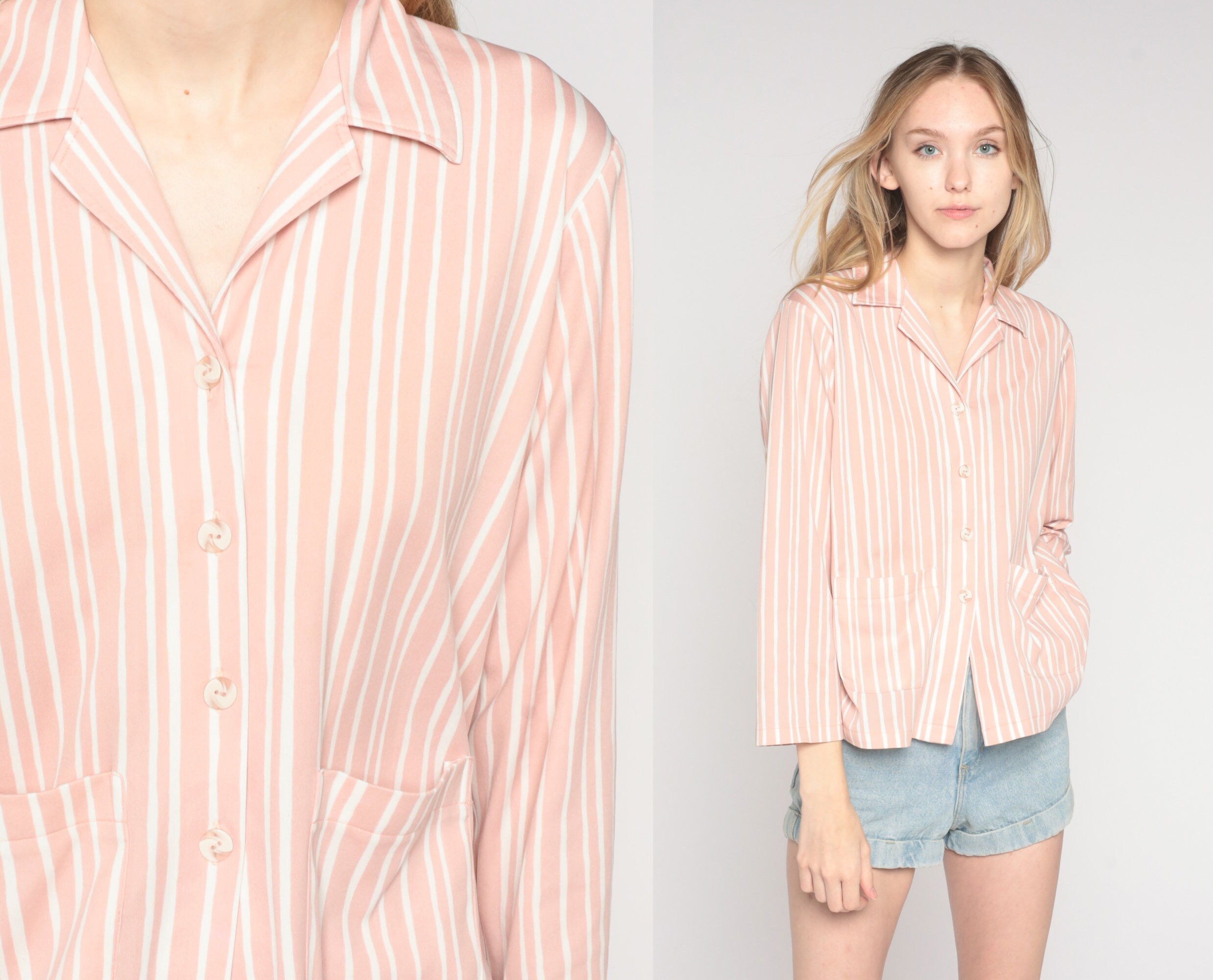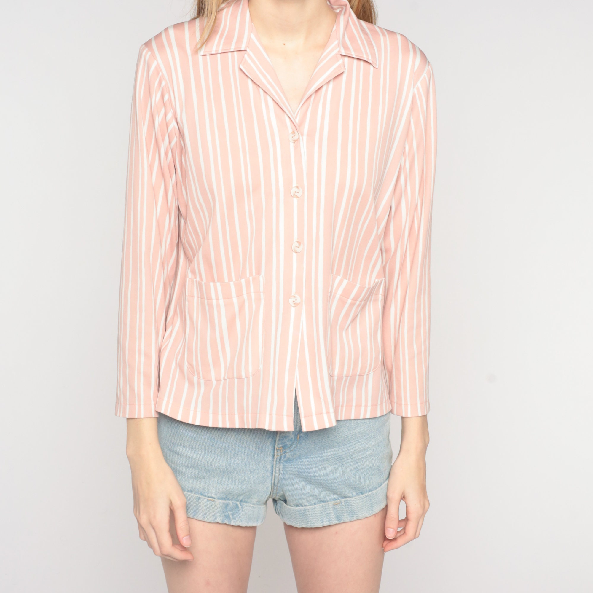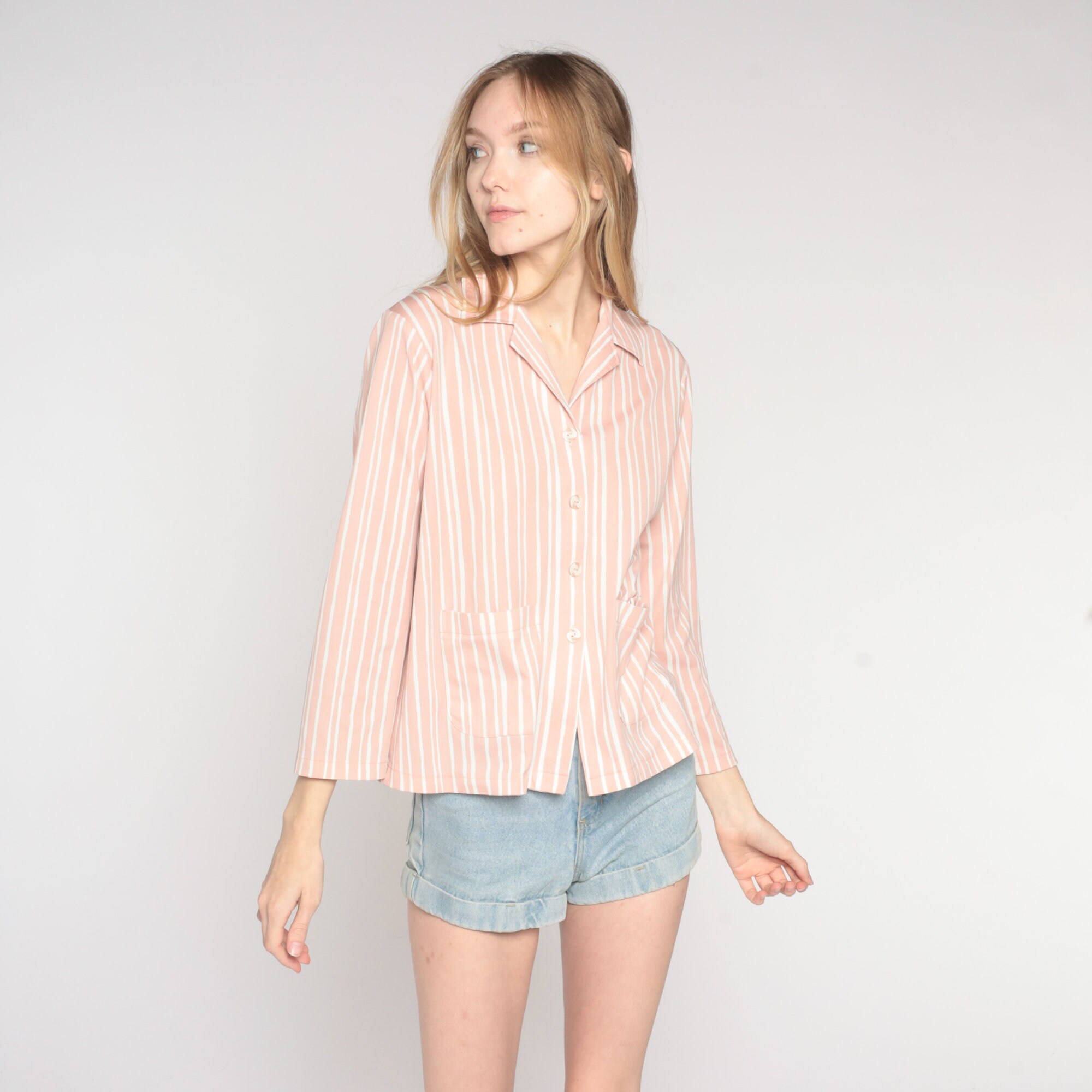 Vintage 70s shirt in a pink and white striped print. Buttons up the front with long sleeves, pockets, and a collar.
