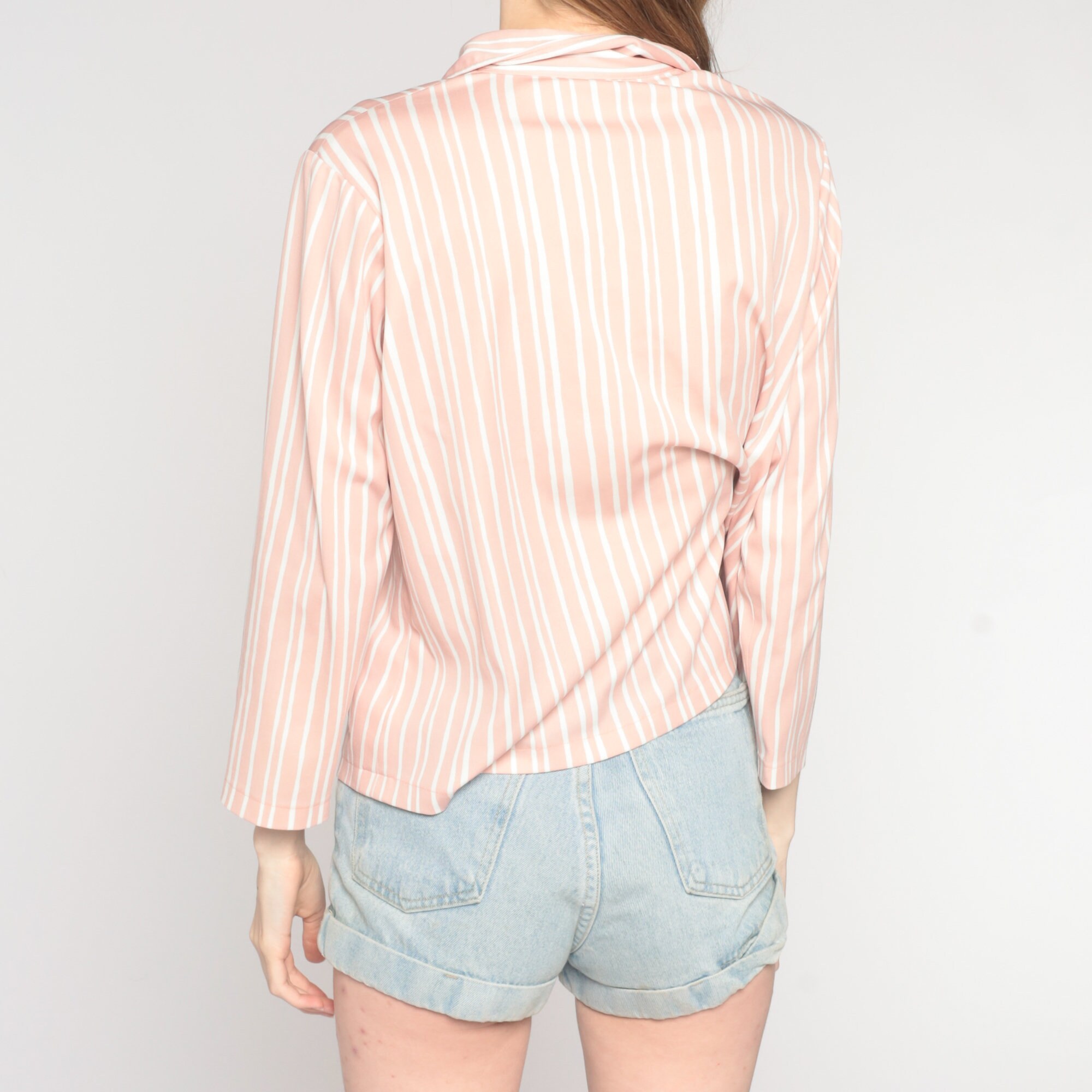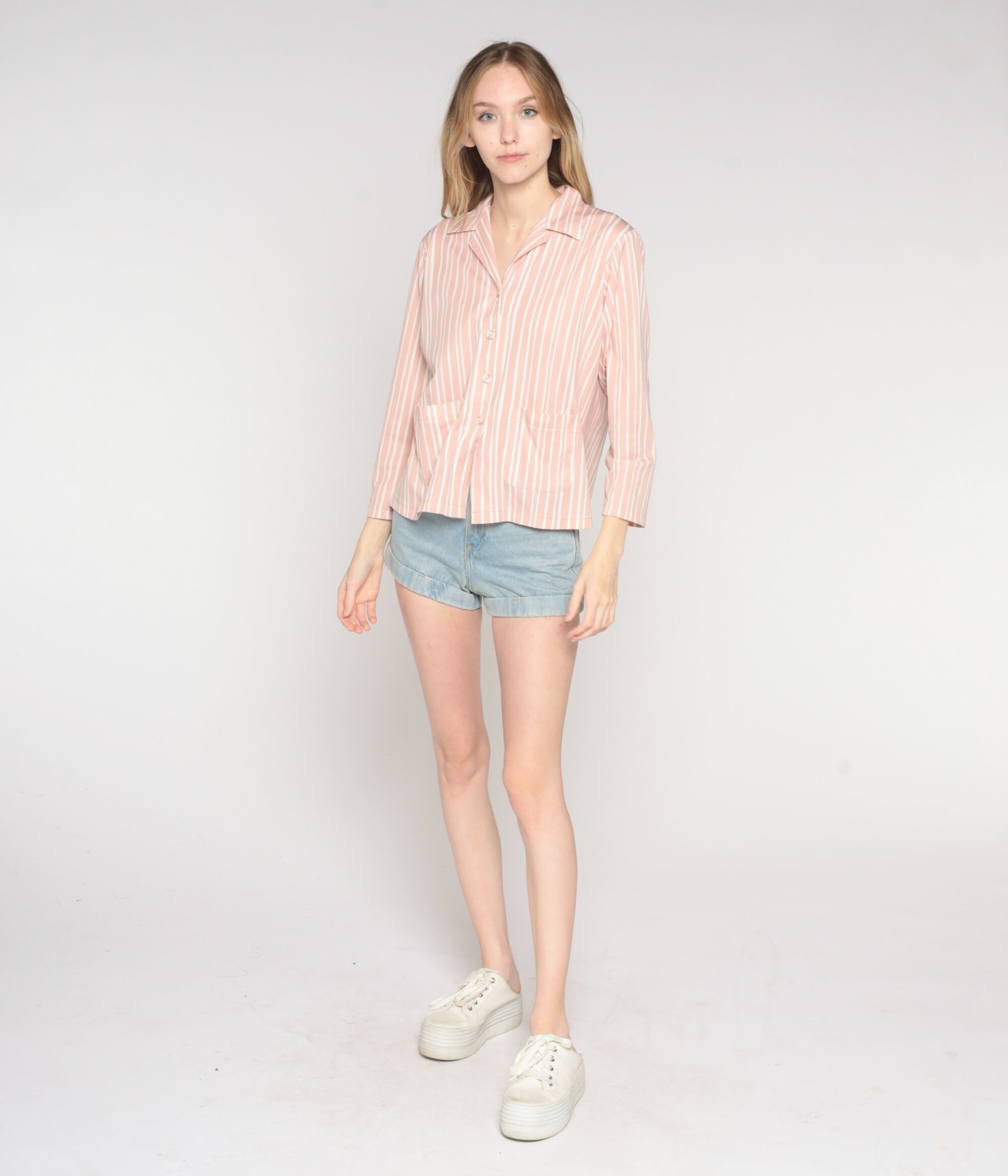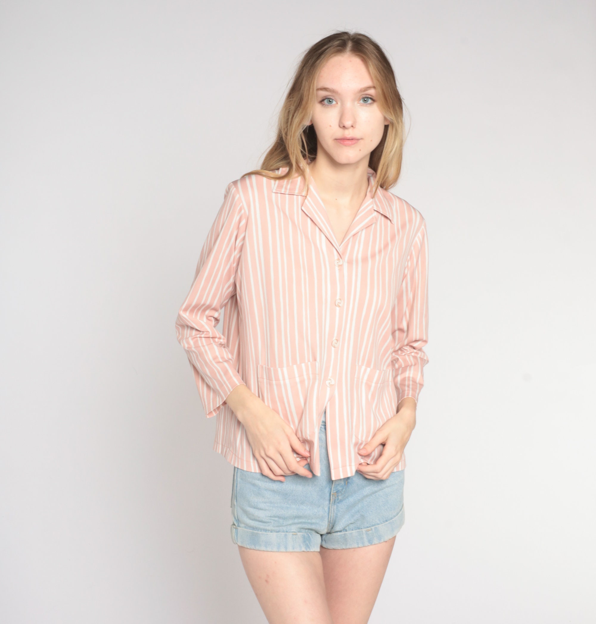 Vintage 70s shirt in a pink and white striped print. Buttons up the front with long sleeves, pockets, and a collar.