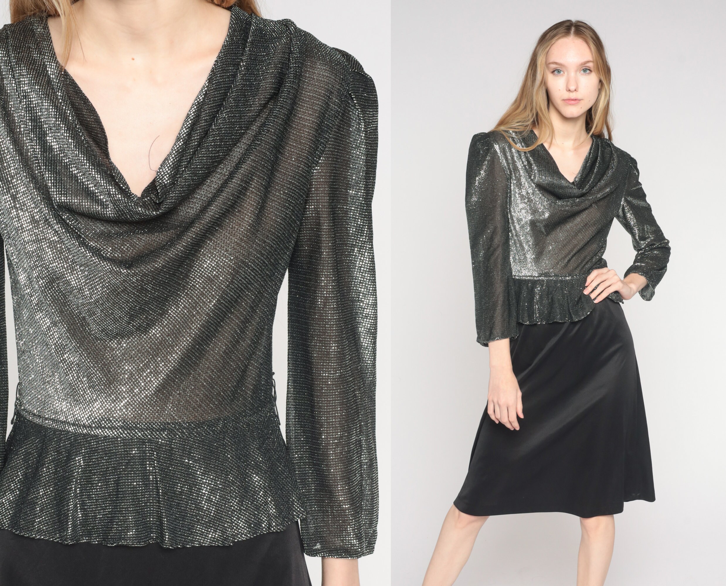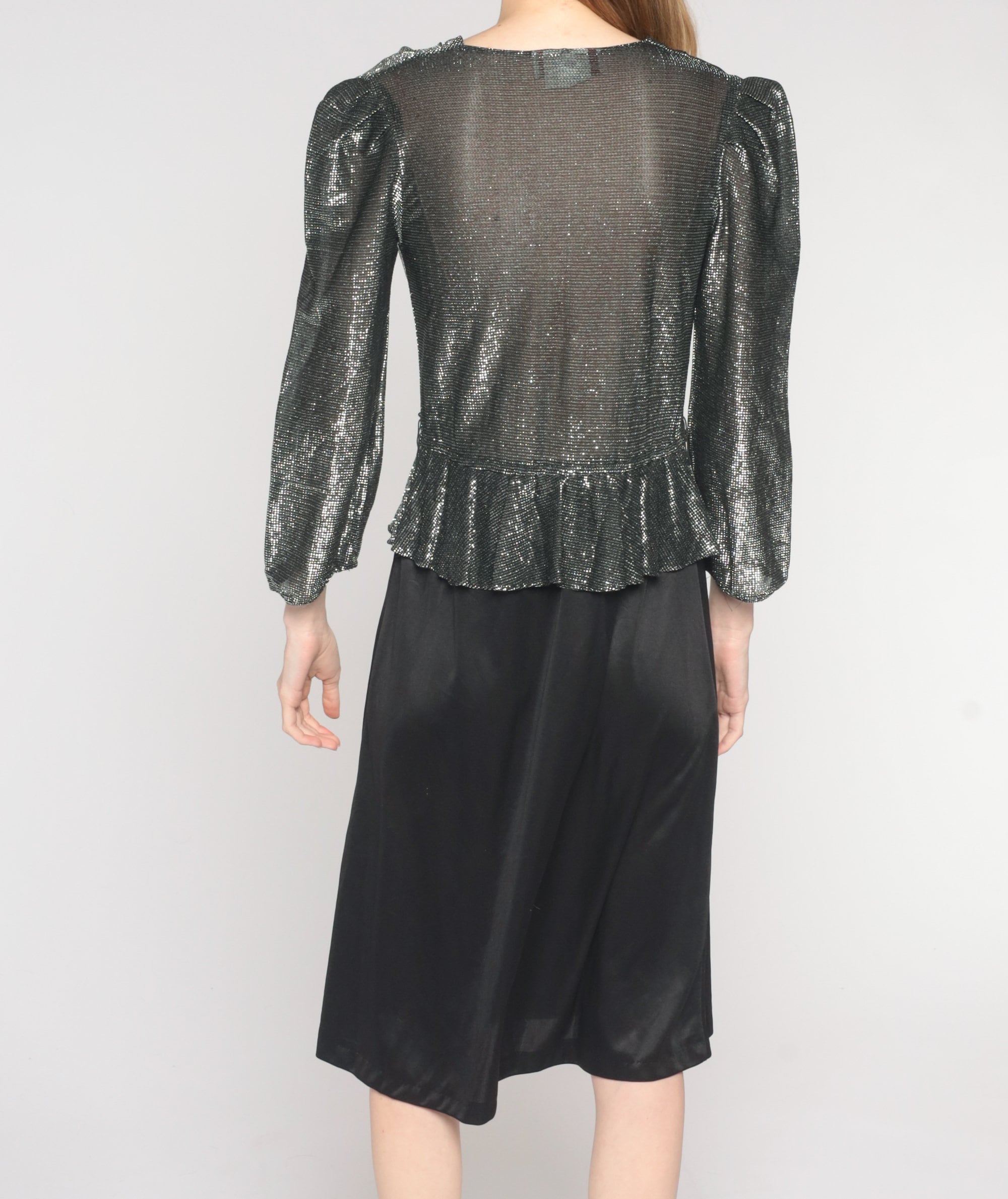 Vintage 80s dress with a black skirt and a semi sheer silver metallic bodice. It has long puff sleeves and a cowl neck. Midi length with a shift cut.