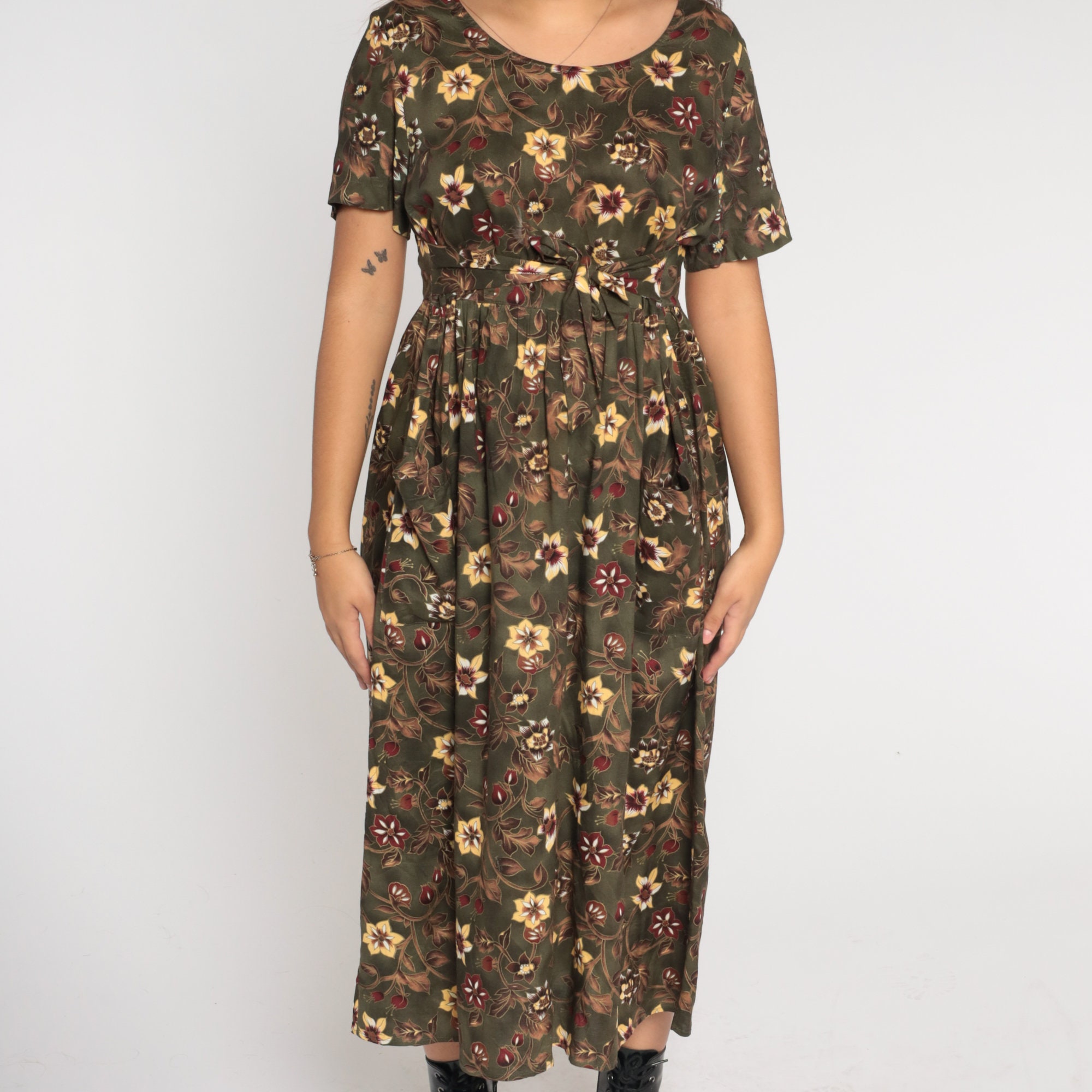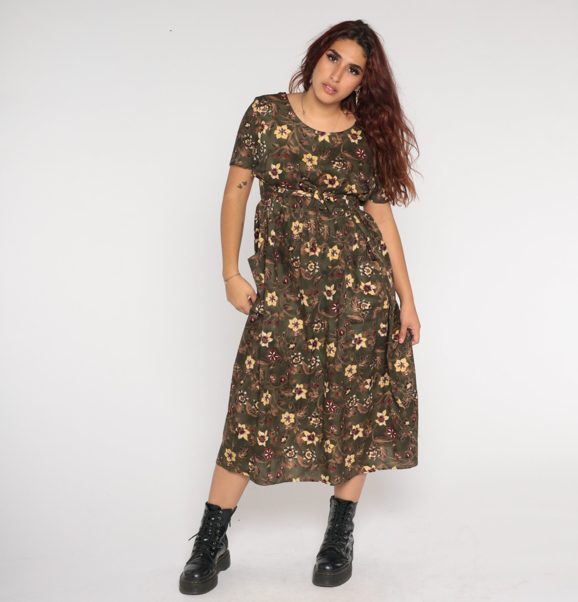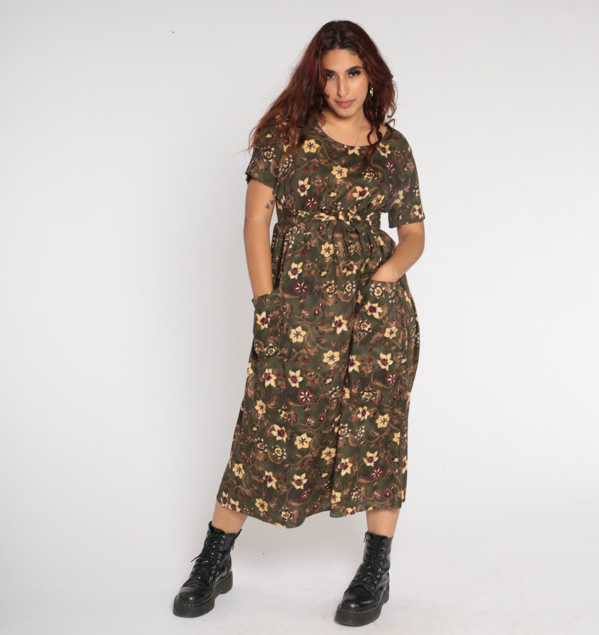 Vintage 90s dress in dark green with a floral print. It has a high waist and a tie belt with short sleeves. Midi length.