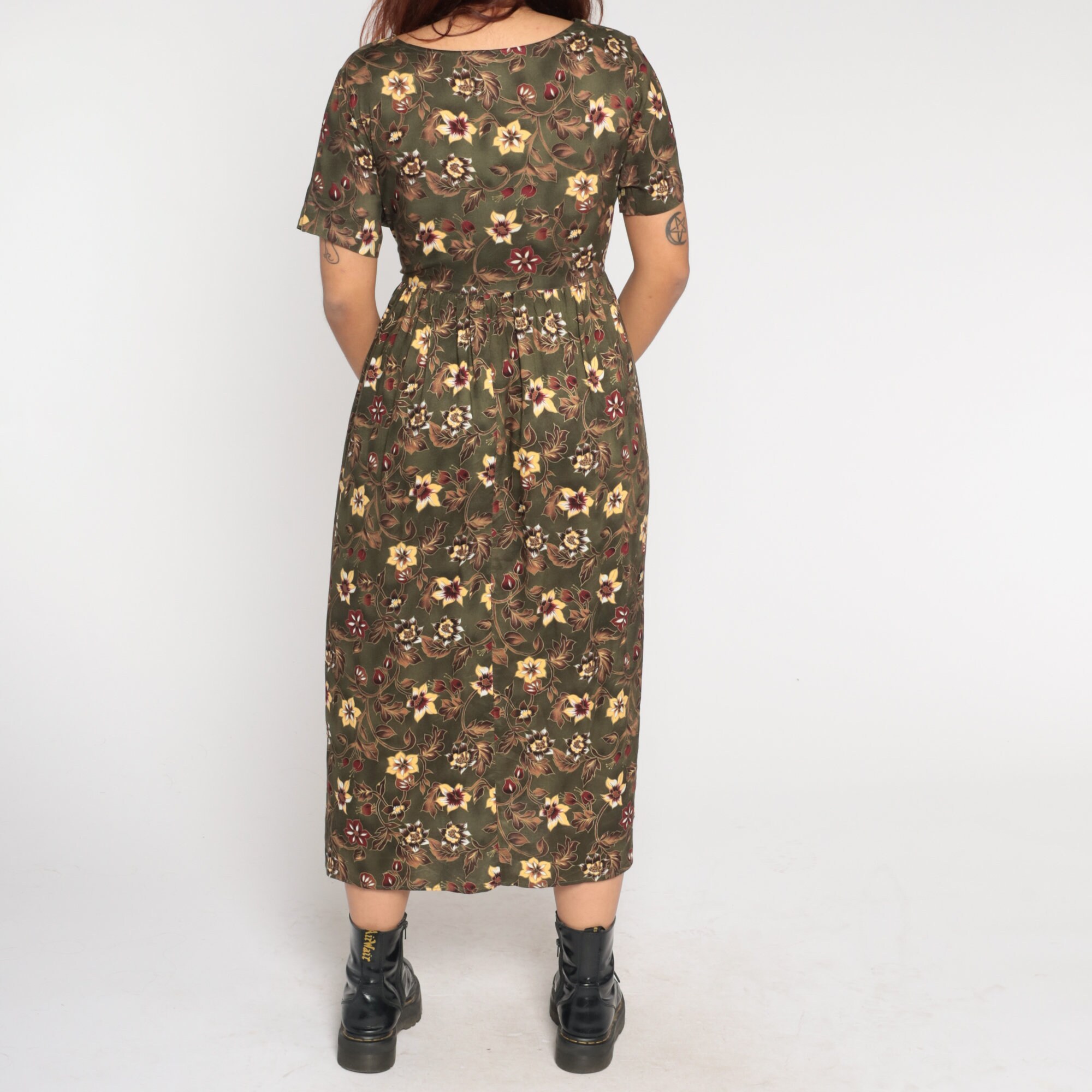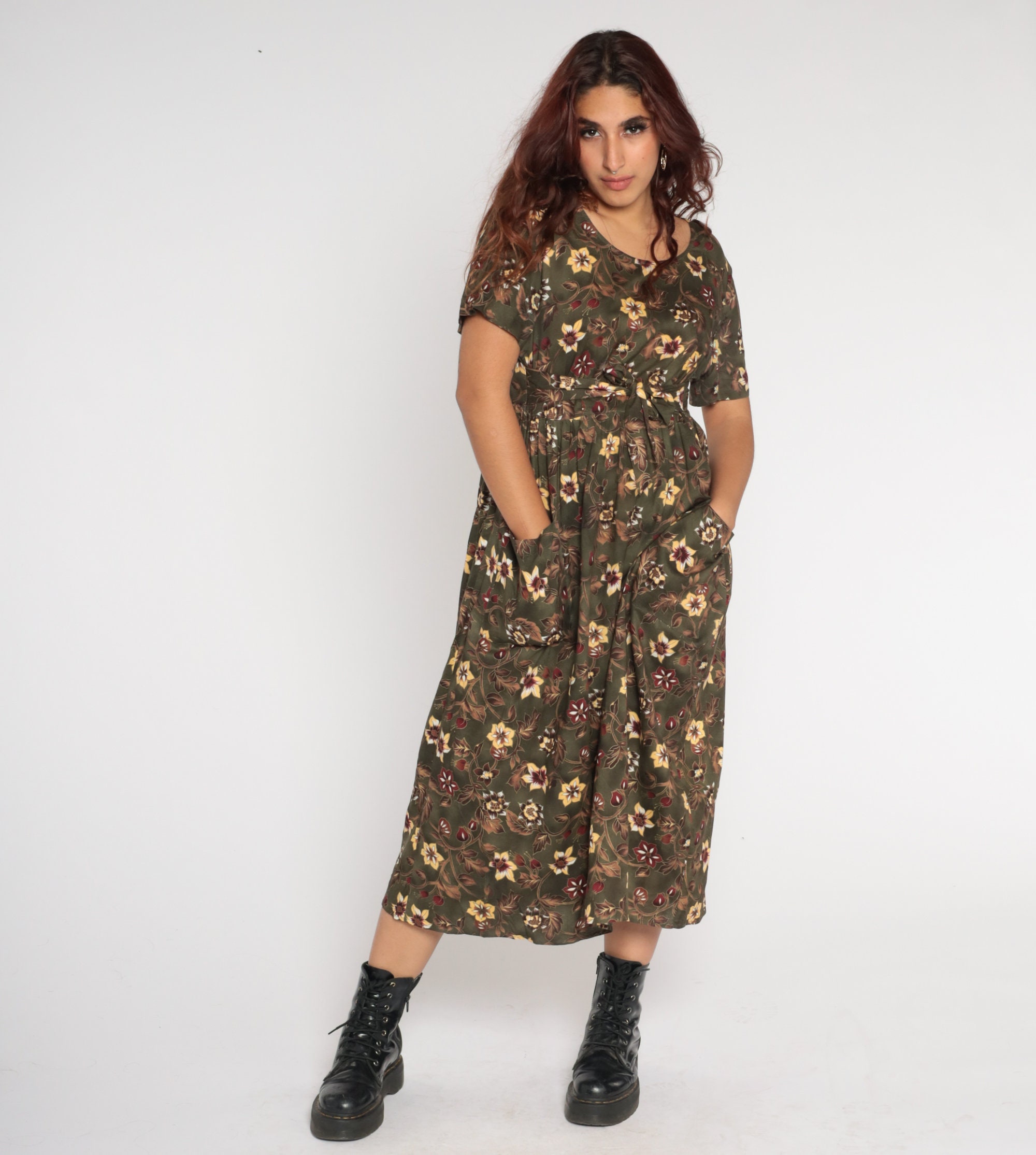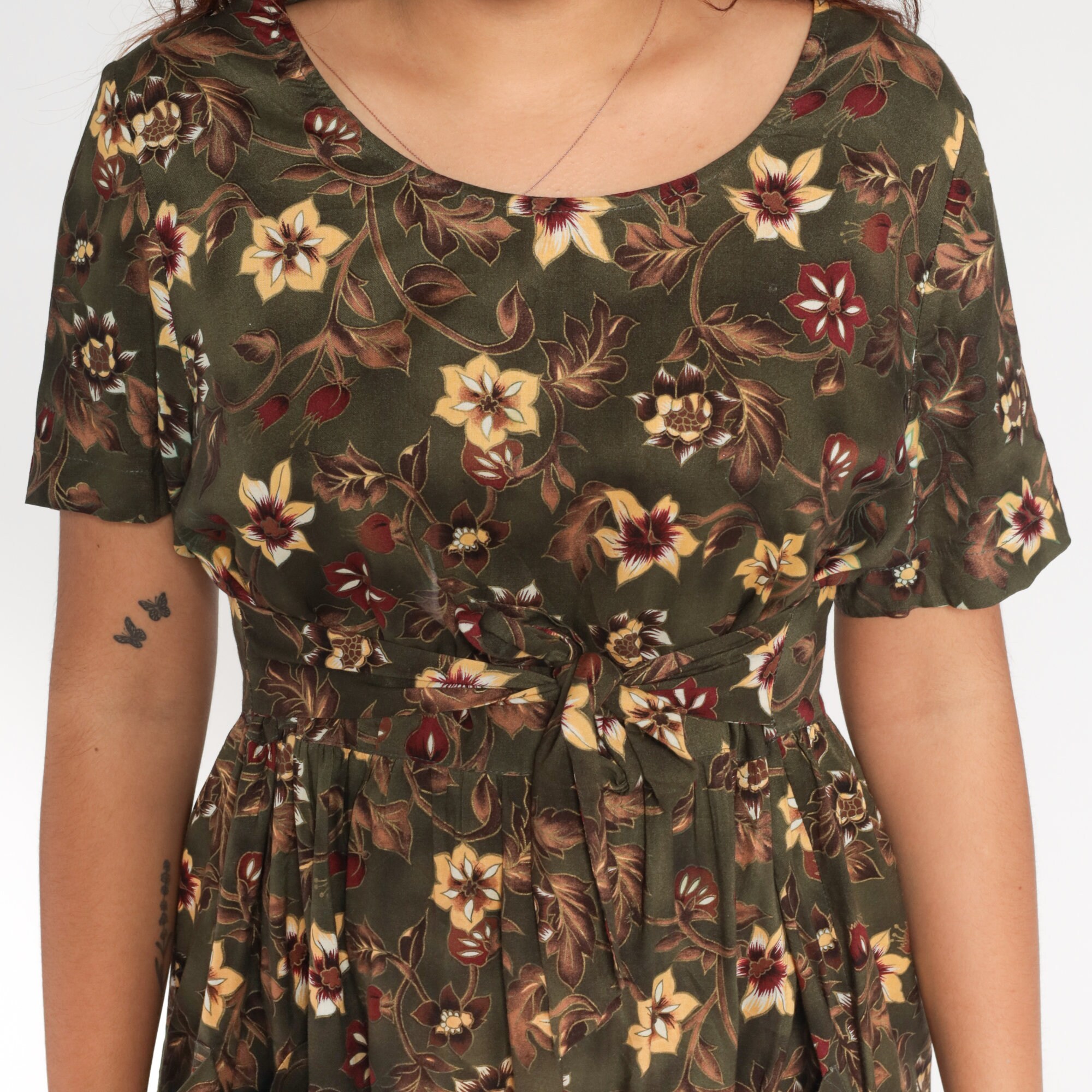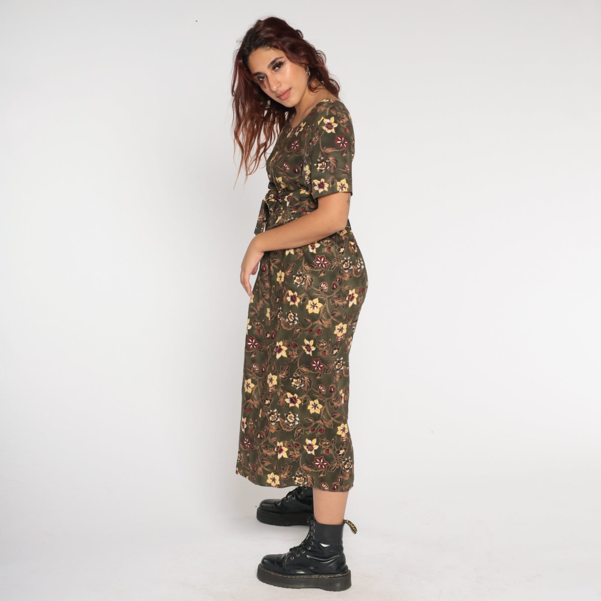 Vintage 90s dress in dark green with a floral print. It has a high waist and a tie belt with short sleeves. Midi length.