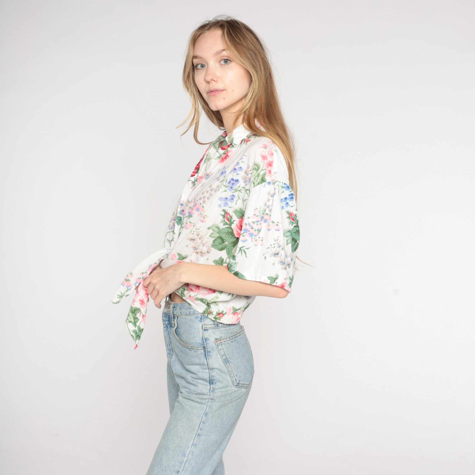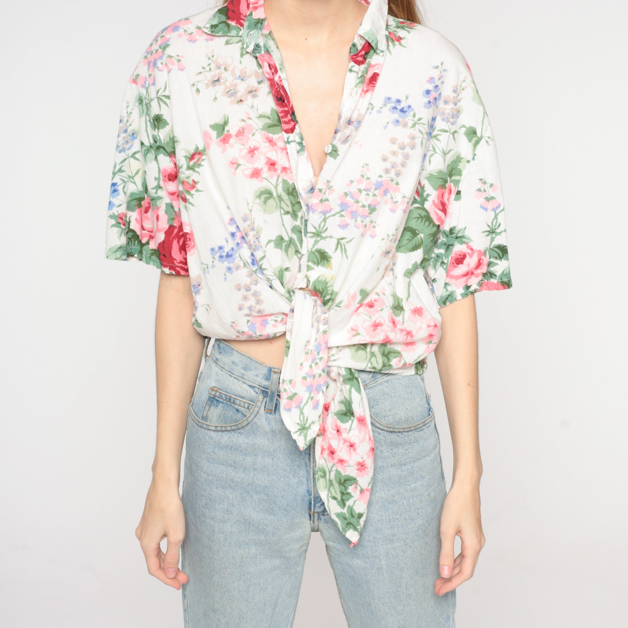 Vintage 90s blouse in a floral print with a collar and buttons up the front. It has short sleeves and a tie front.