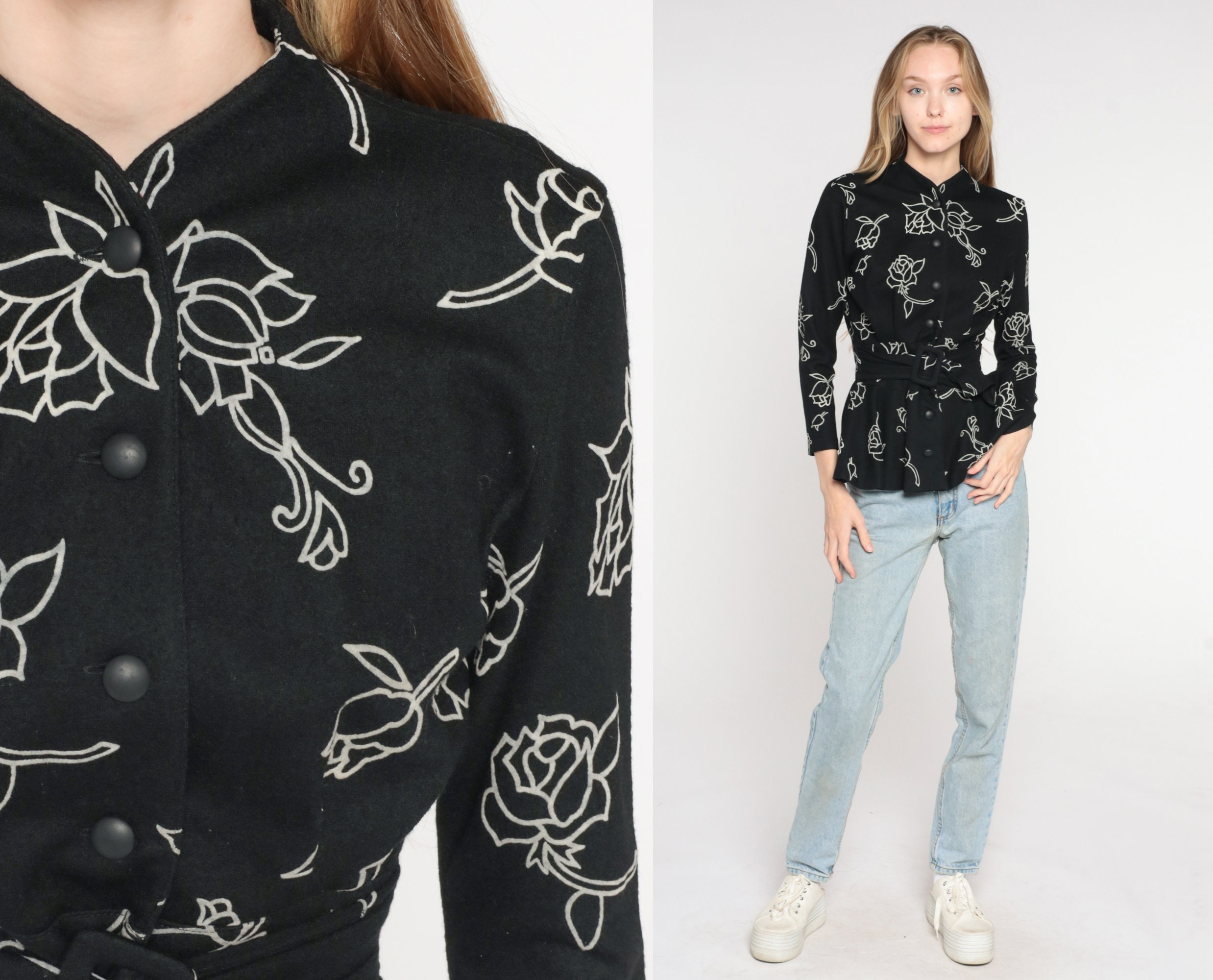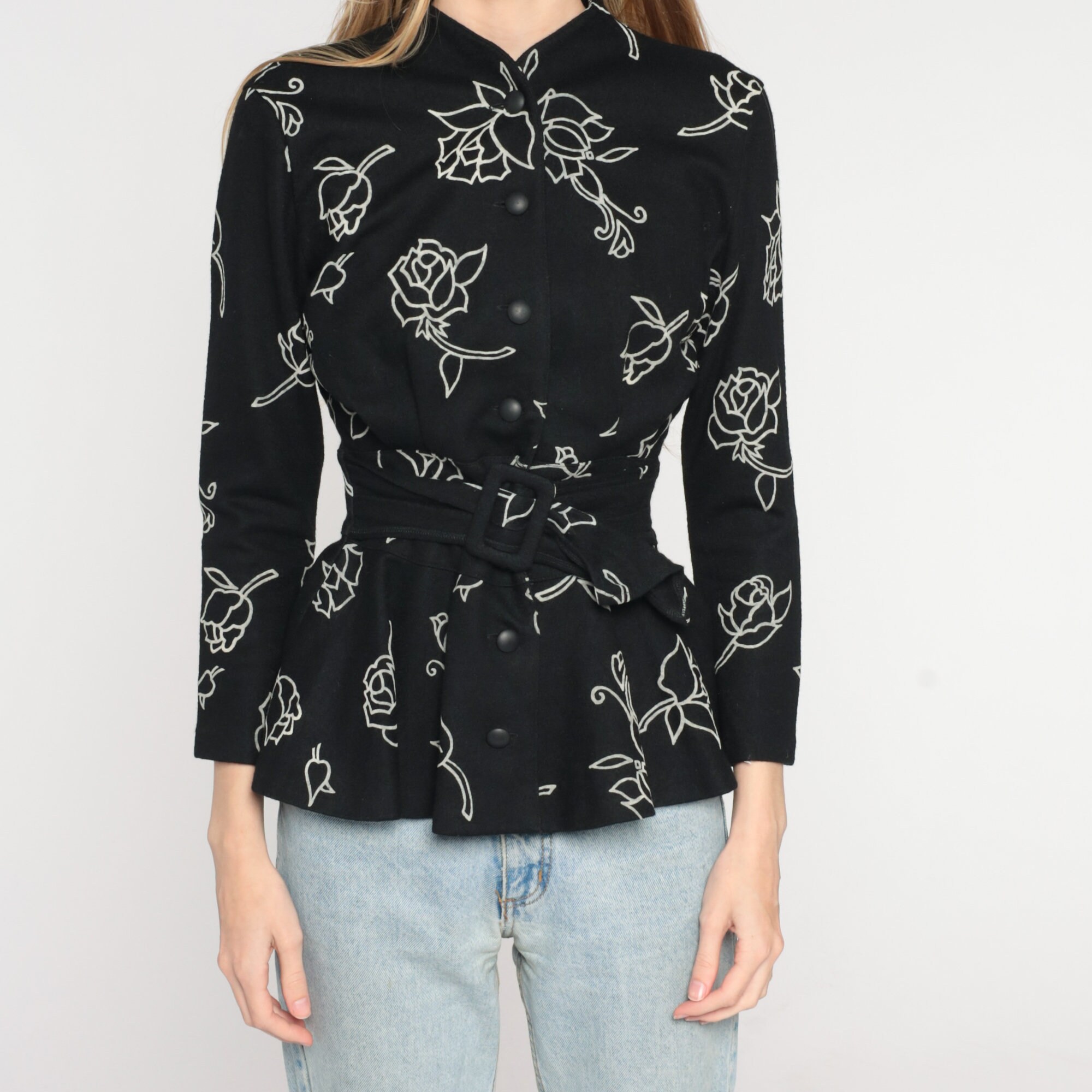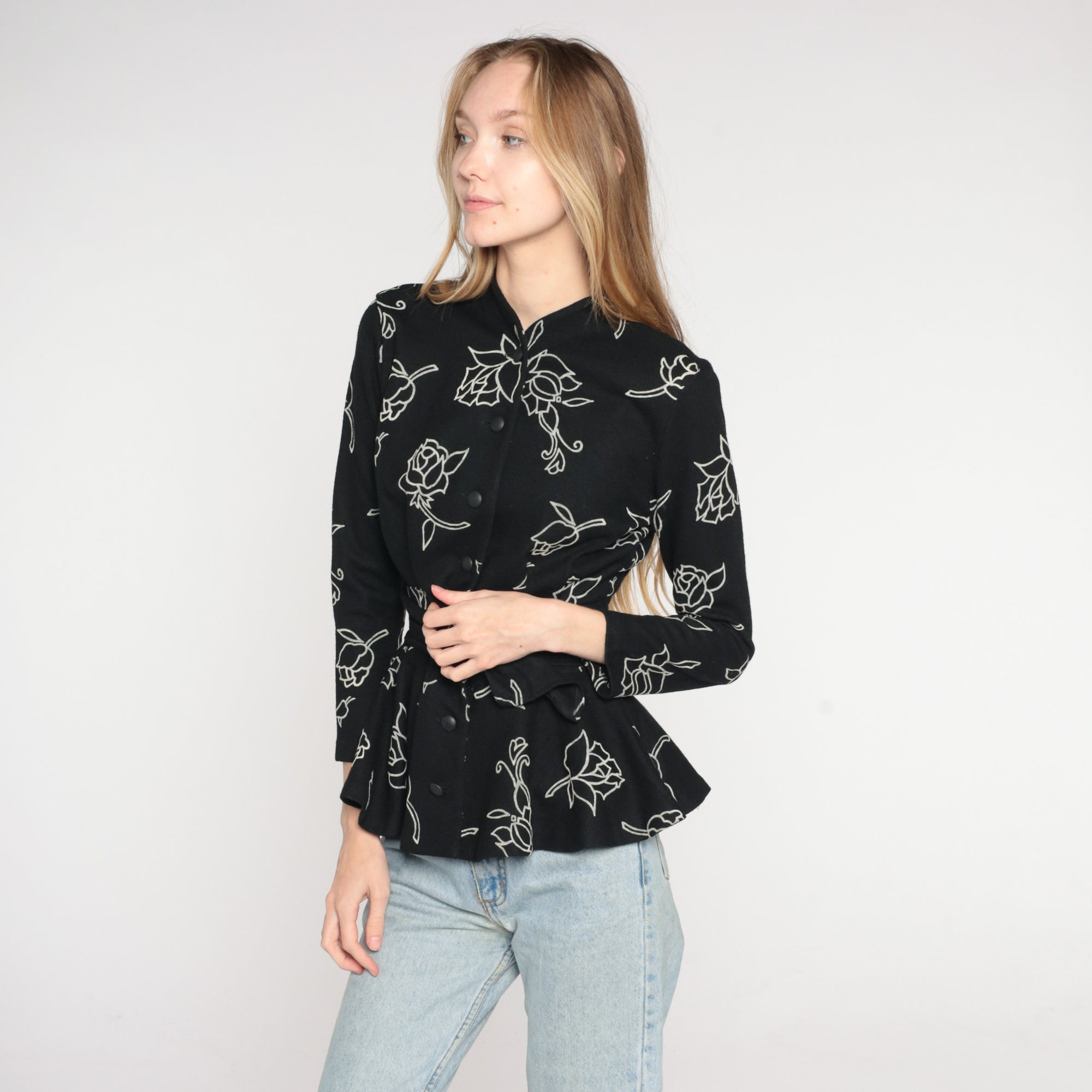 Vintage Y2k blouse in black wool with a rose floral print and a peplum. Long sleeves, a belt, and buttons up the front.