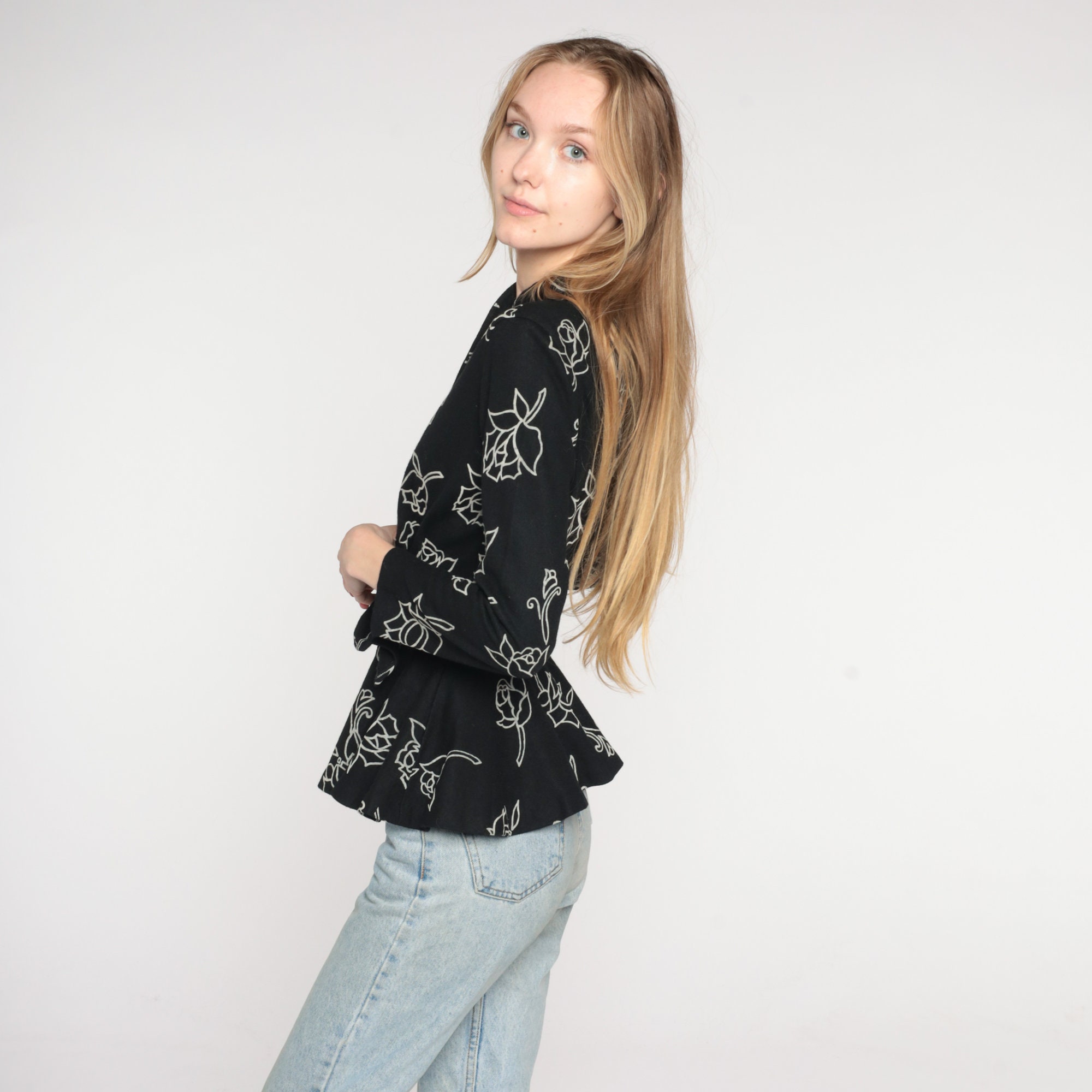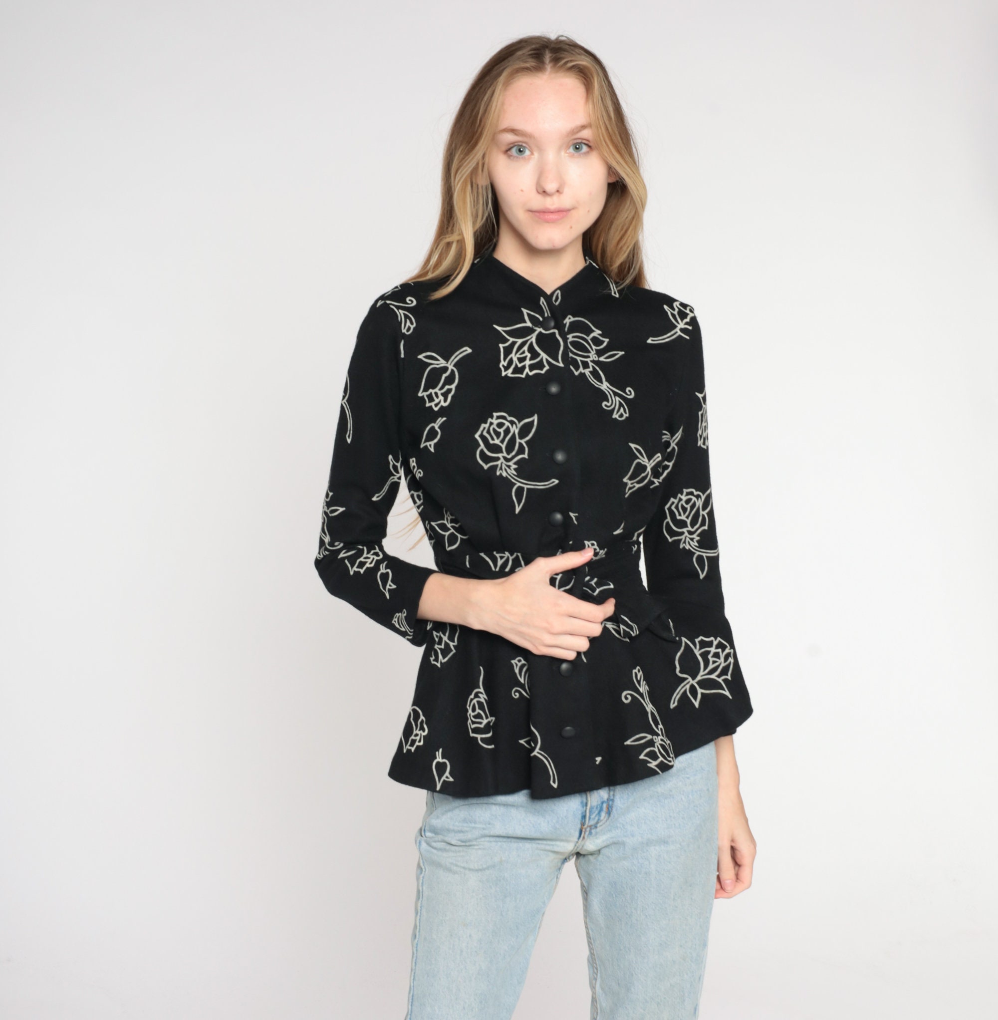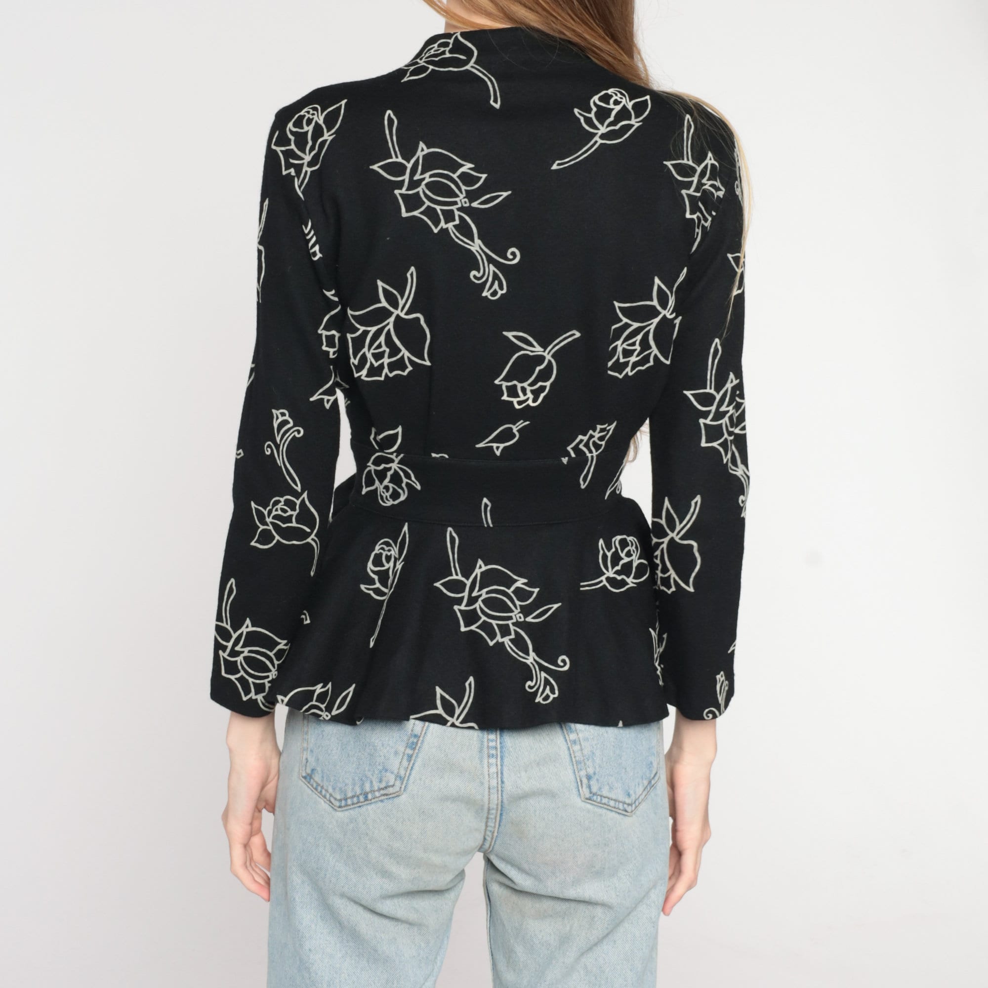 Vintage Y2k blouse in black wool with a rose floral print and a peplum. Long sleeves, a belt, and buttons up the front.
