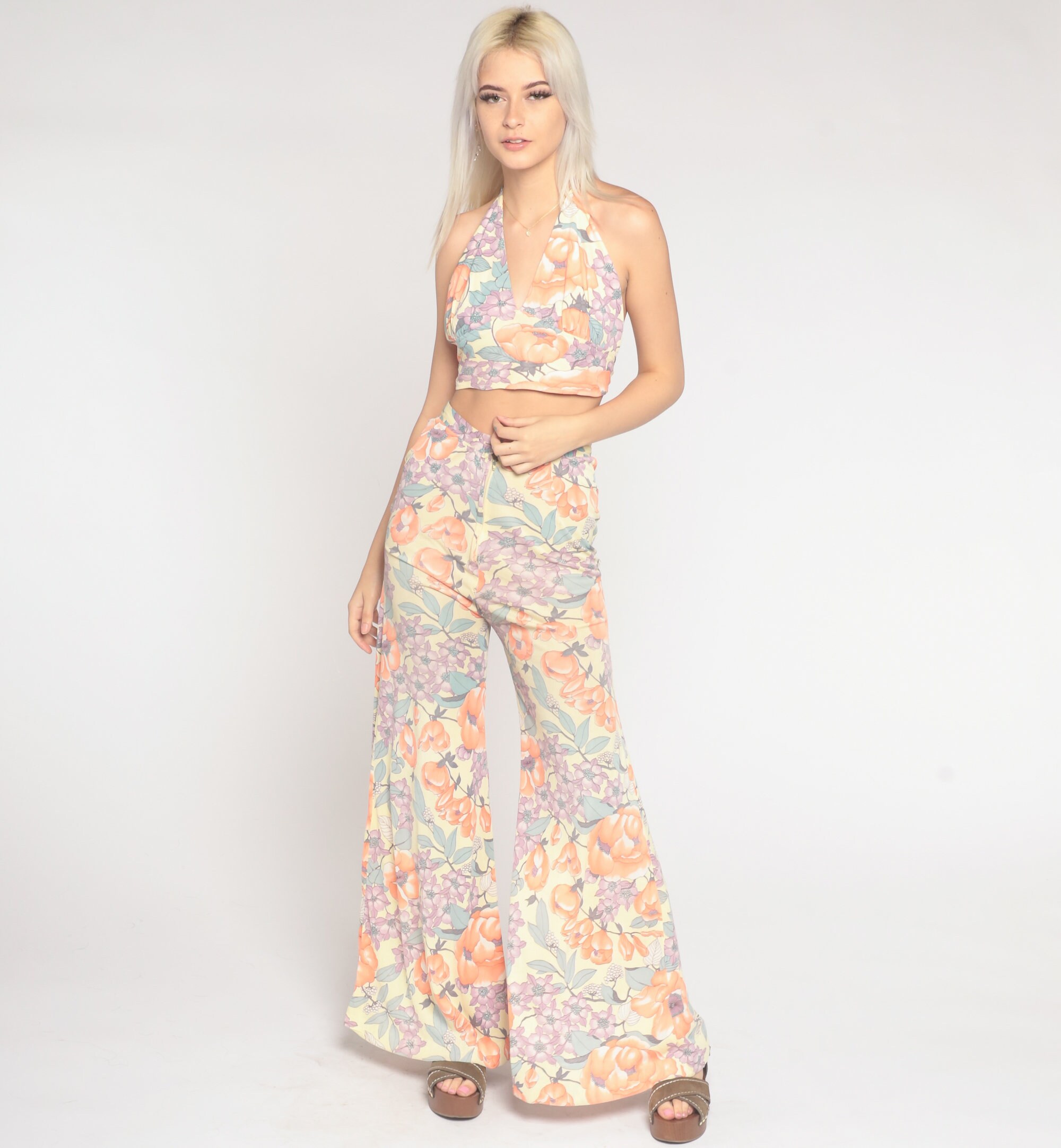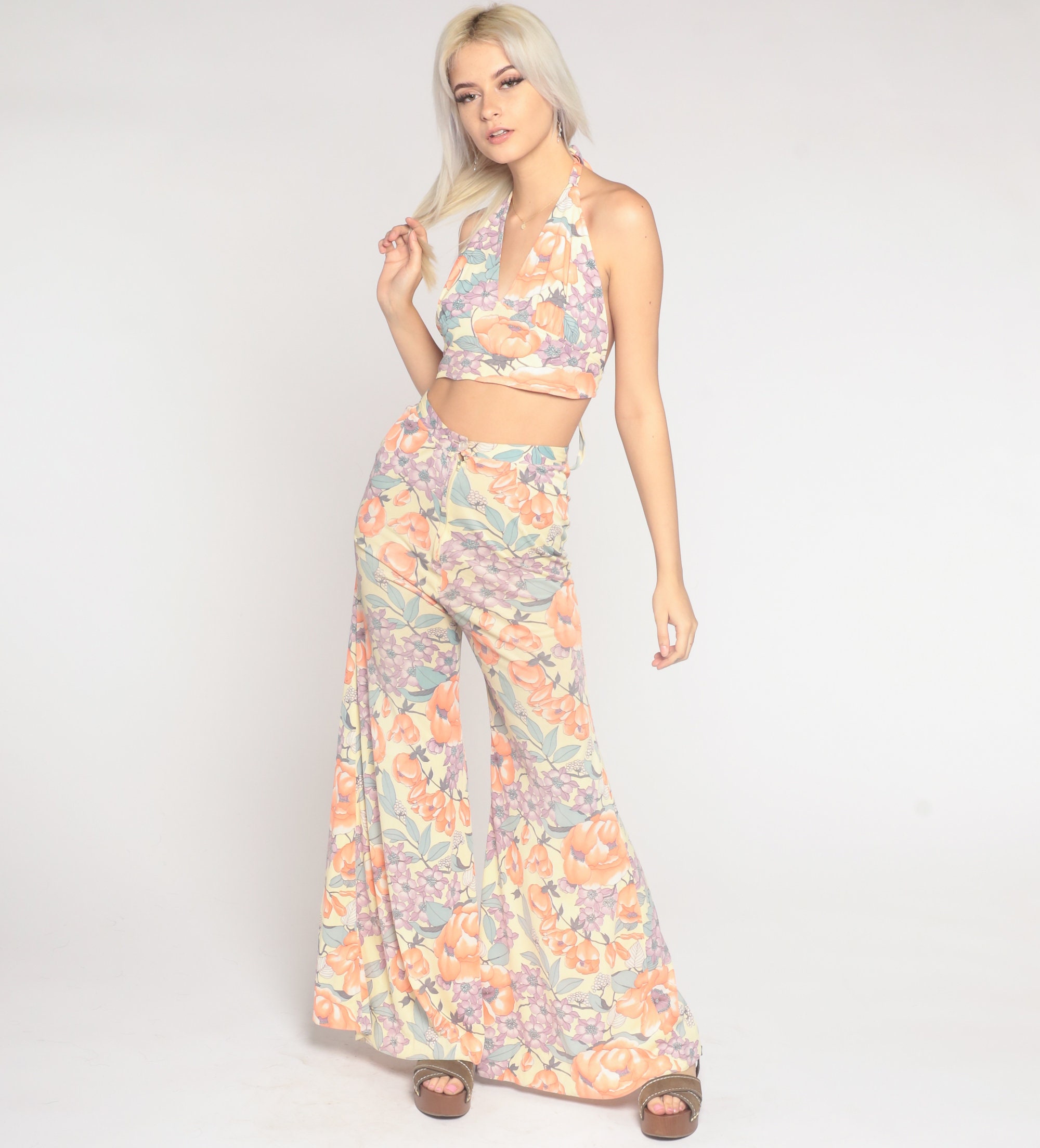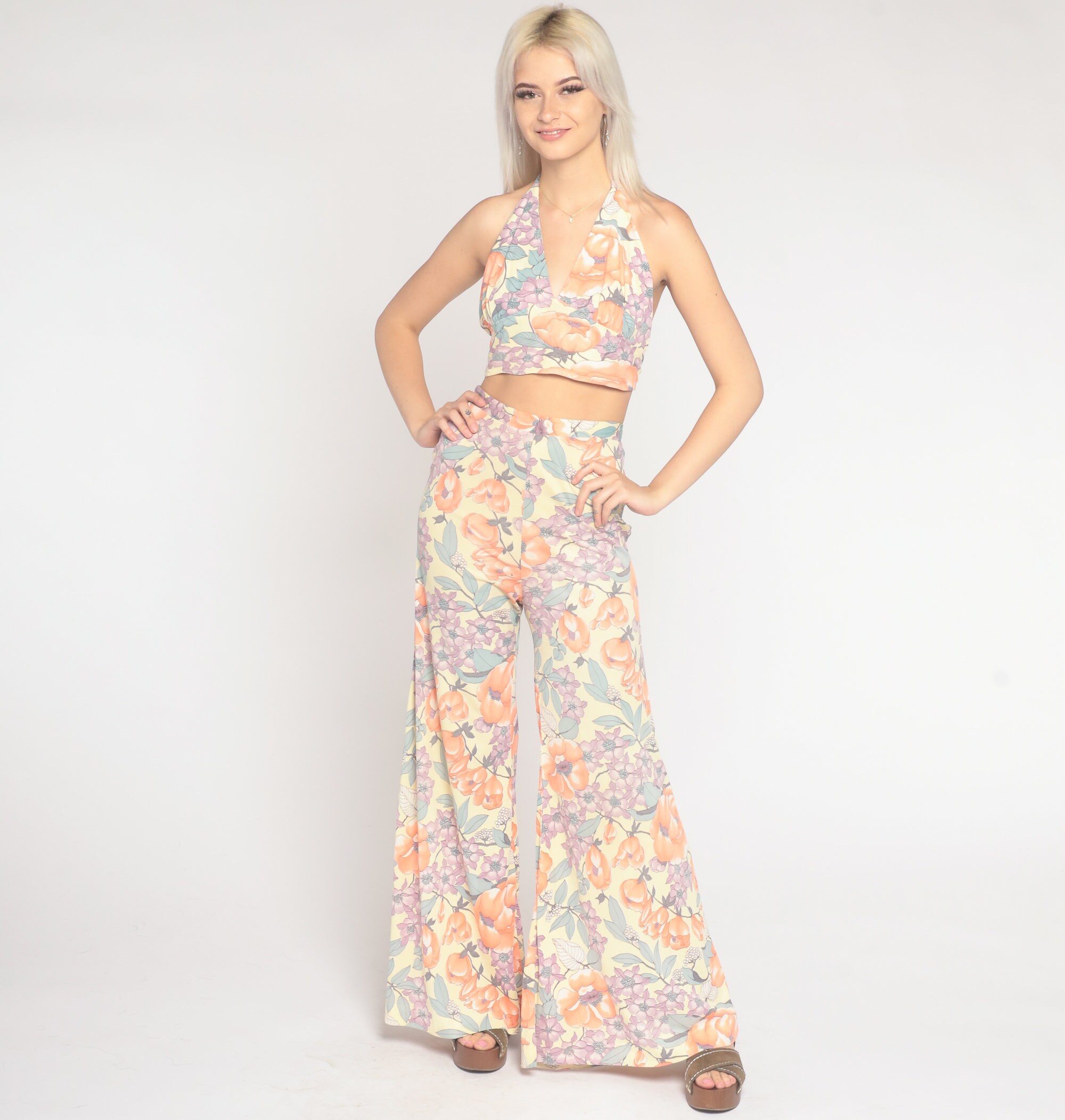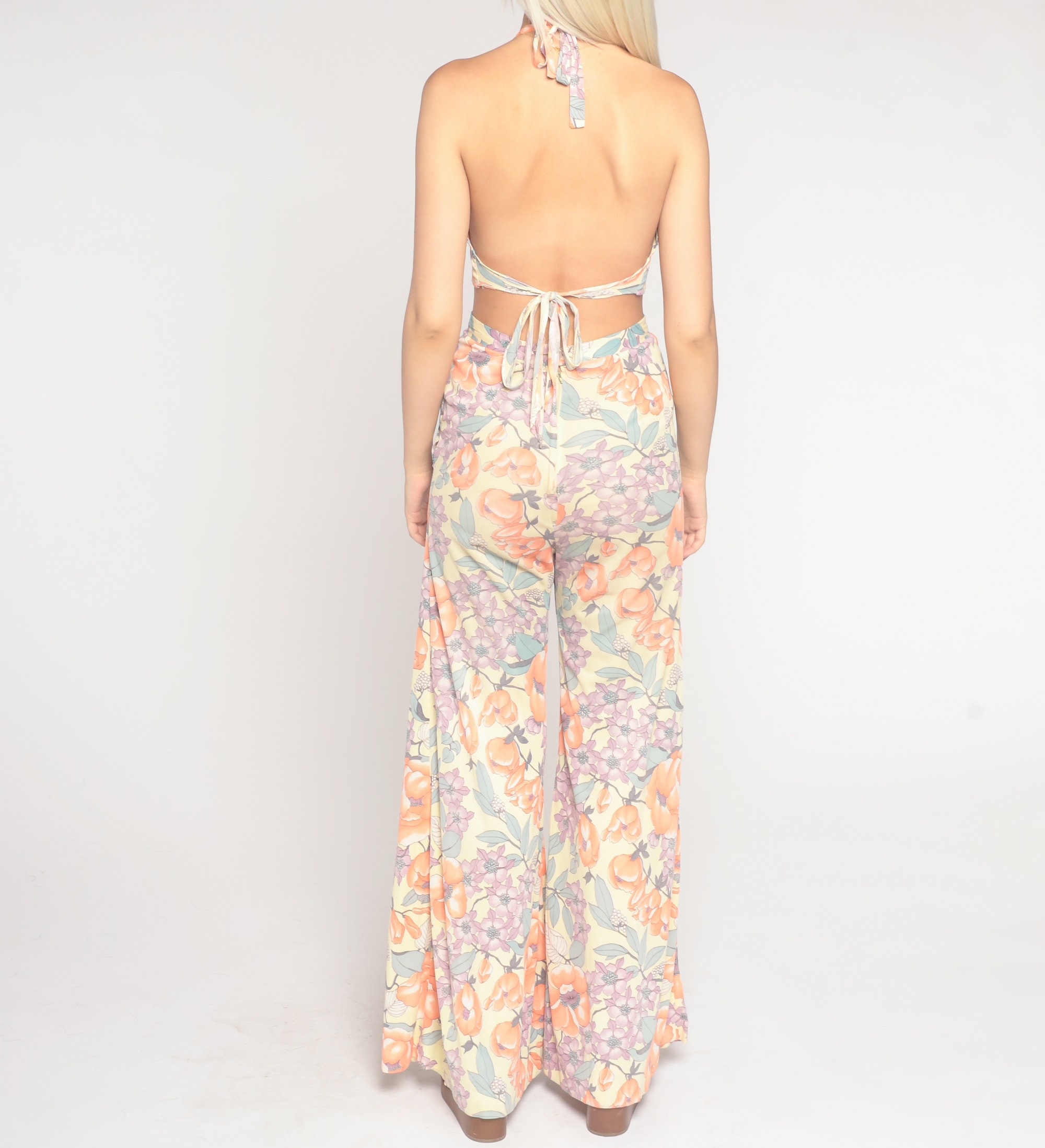 Vintage 70s two piece outfit in a floral print. Pants have a high waist with a rear zipper and a bell bottom leg, top has a halter cut with ties in the back.