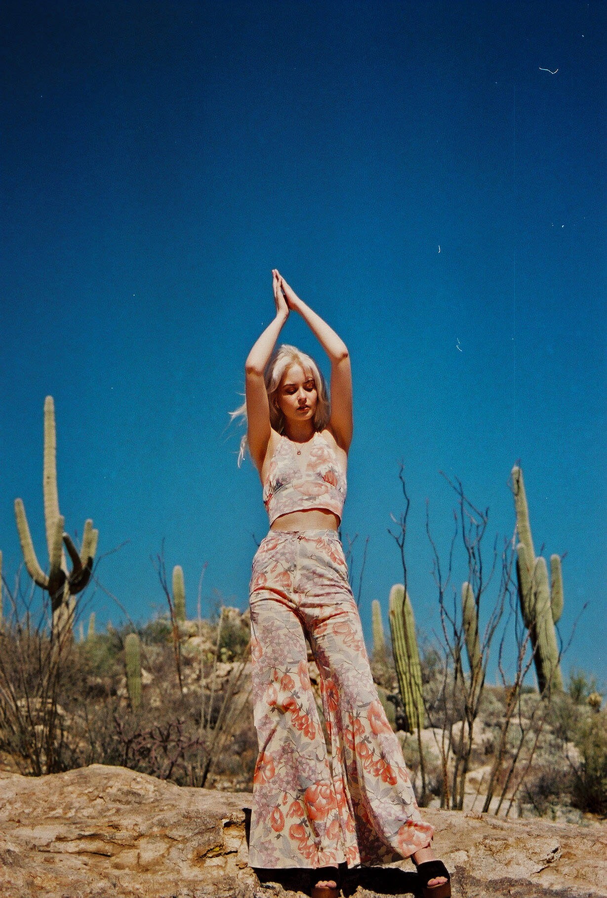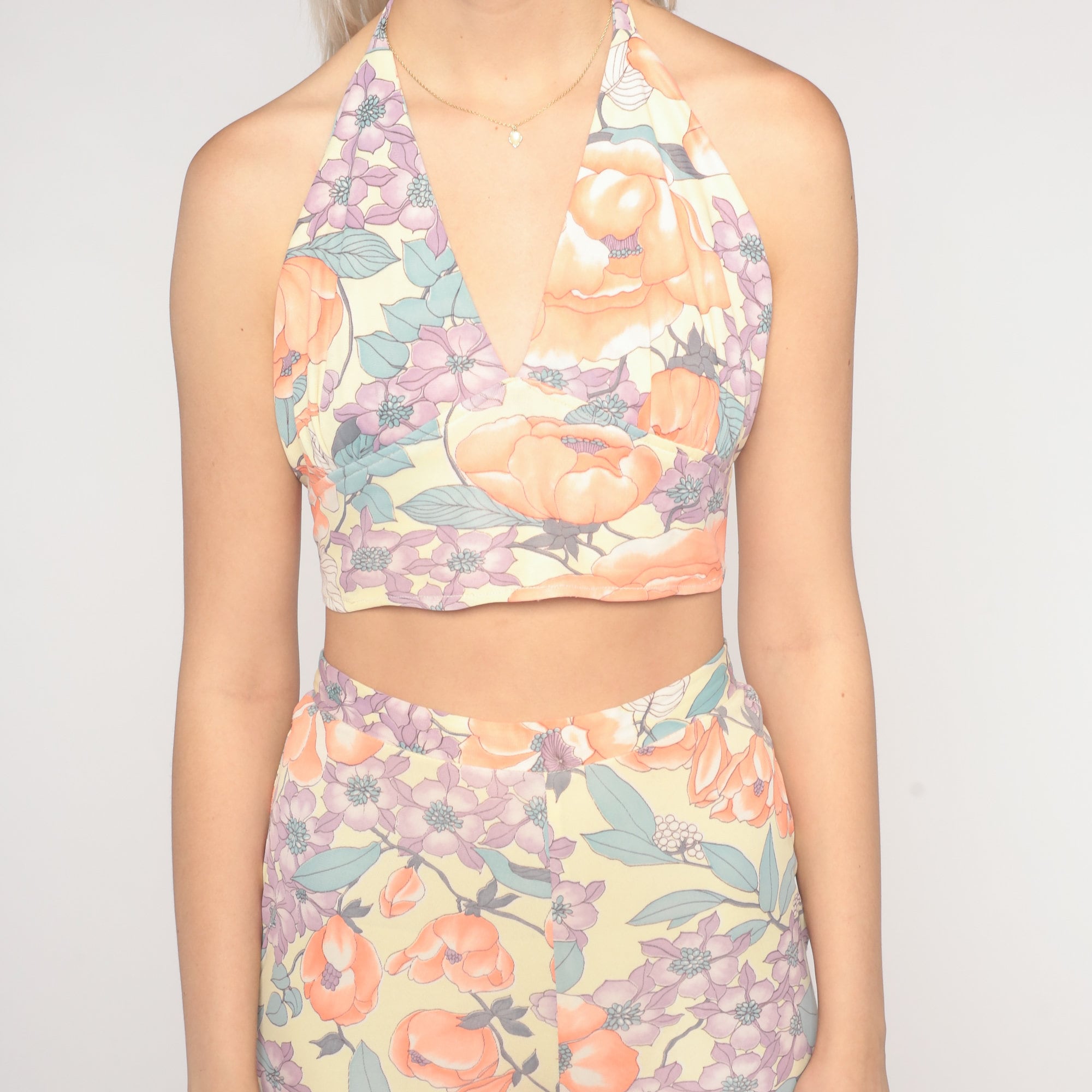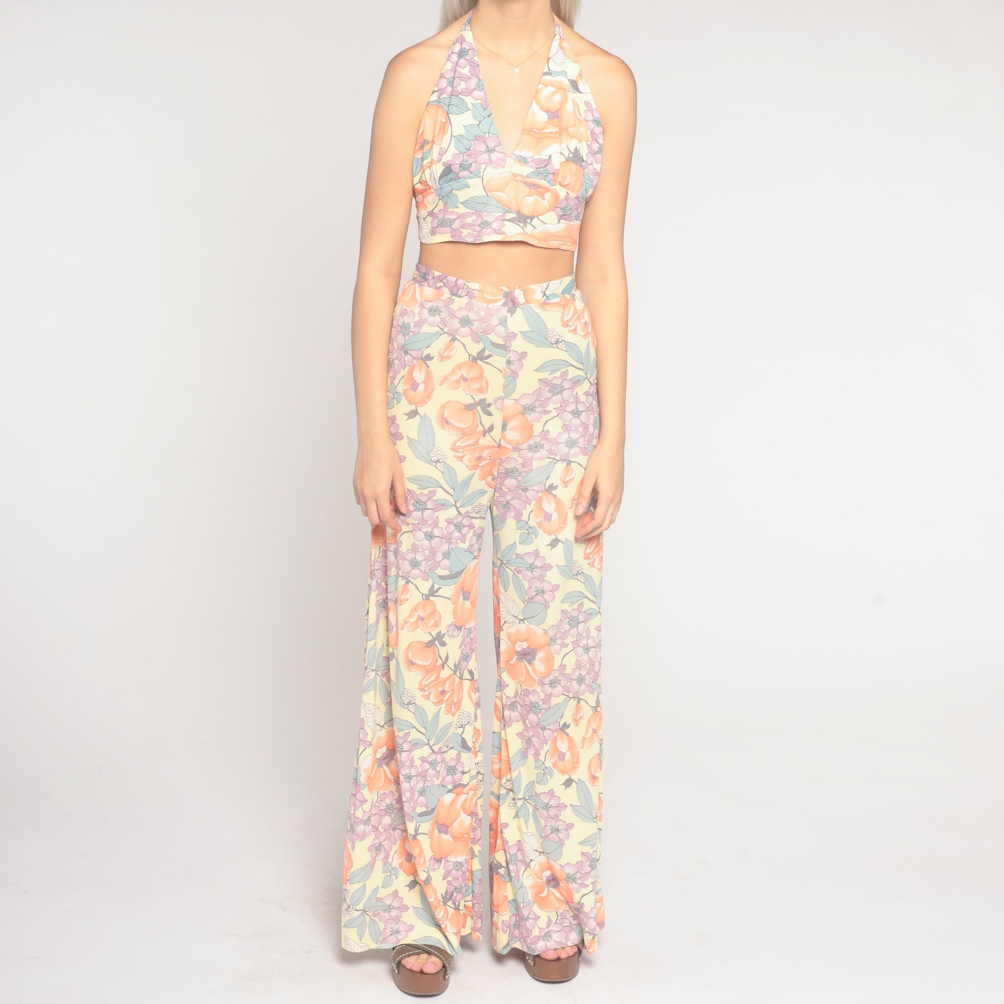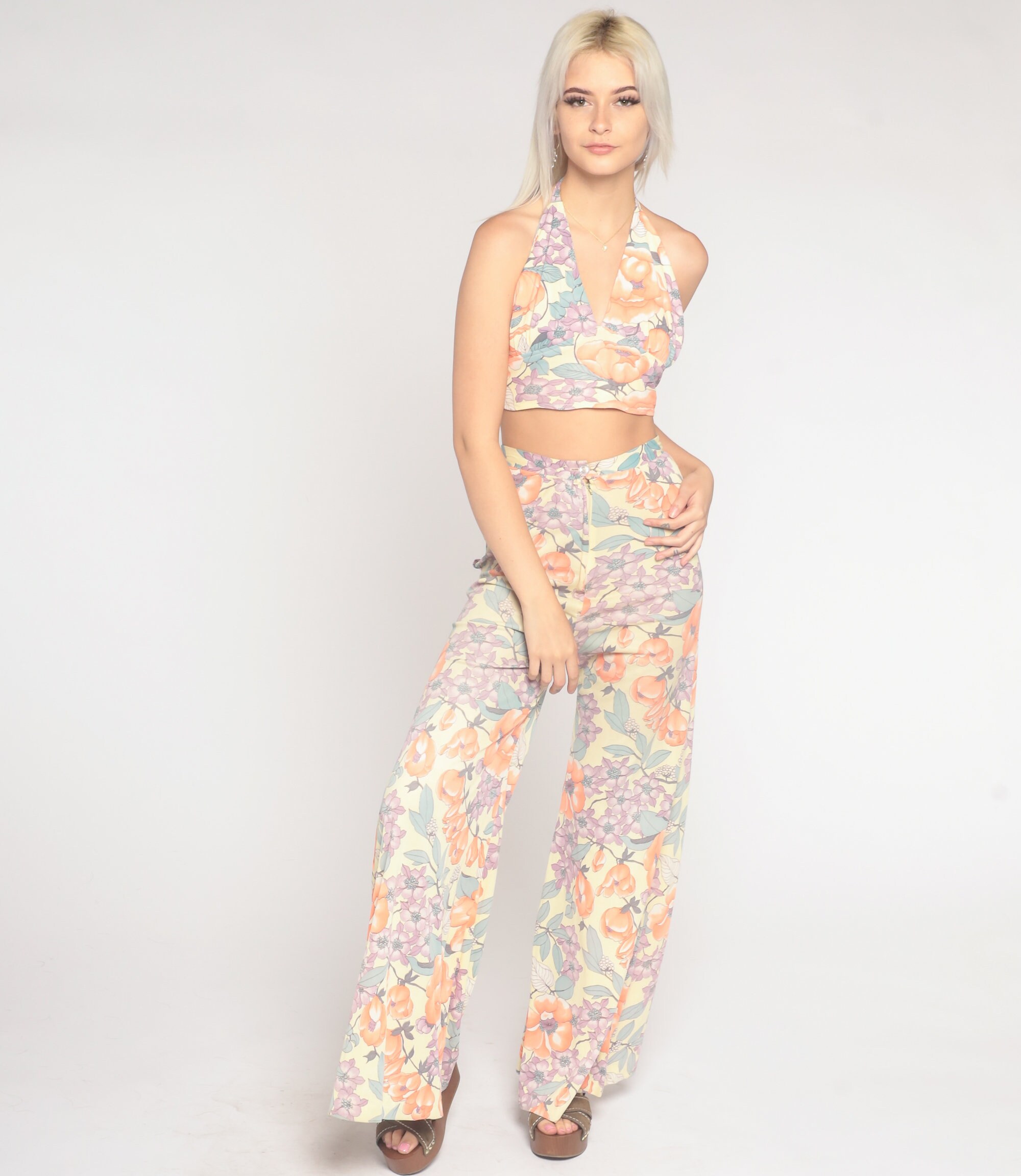 Vintage 70s two piece outfit in a floral print. Pants have a high waist with a rear zipper and a bell bottom leg, top has a halter cut with ties in the back.