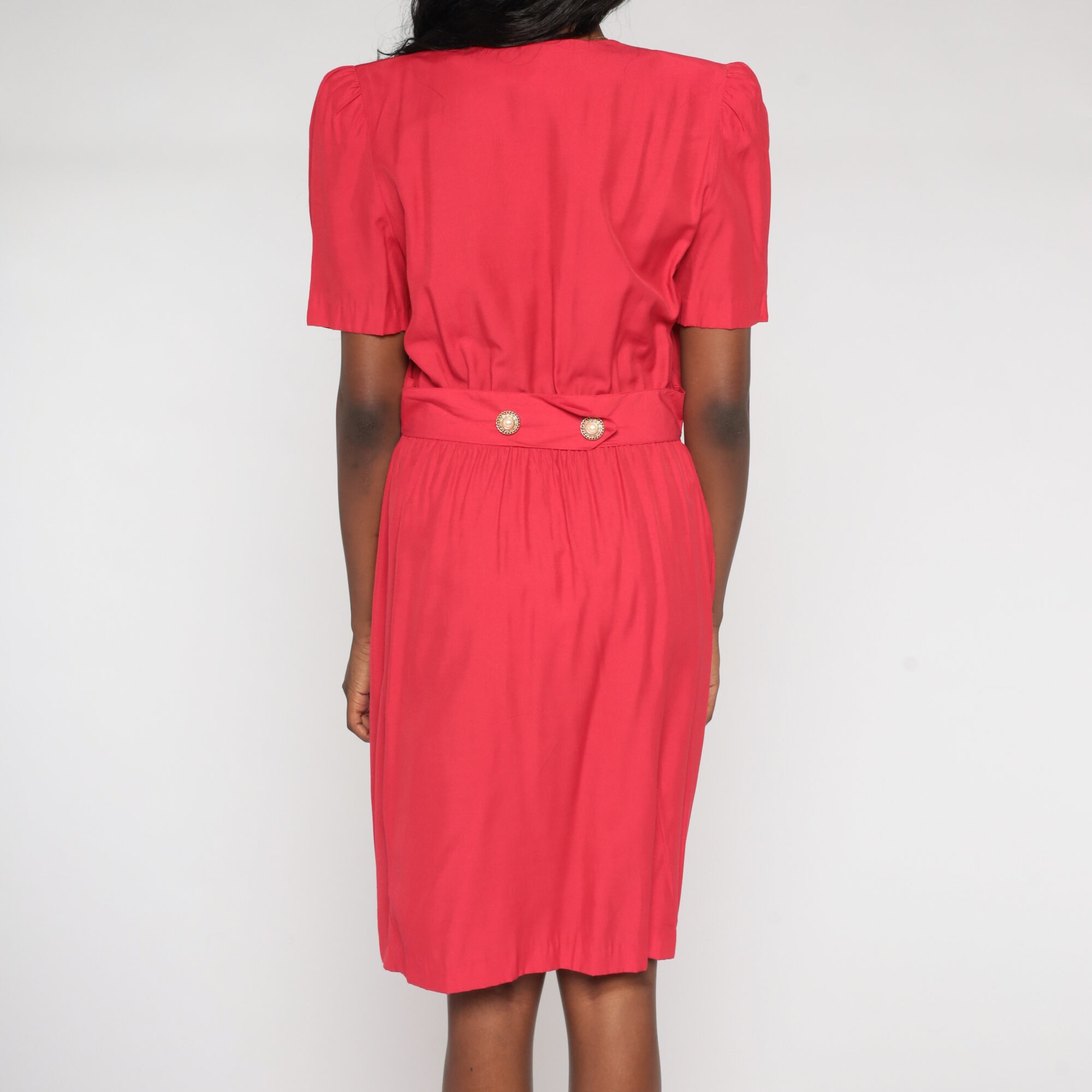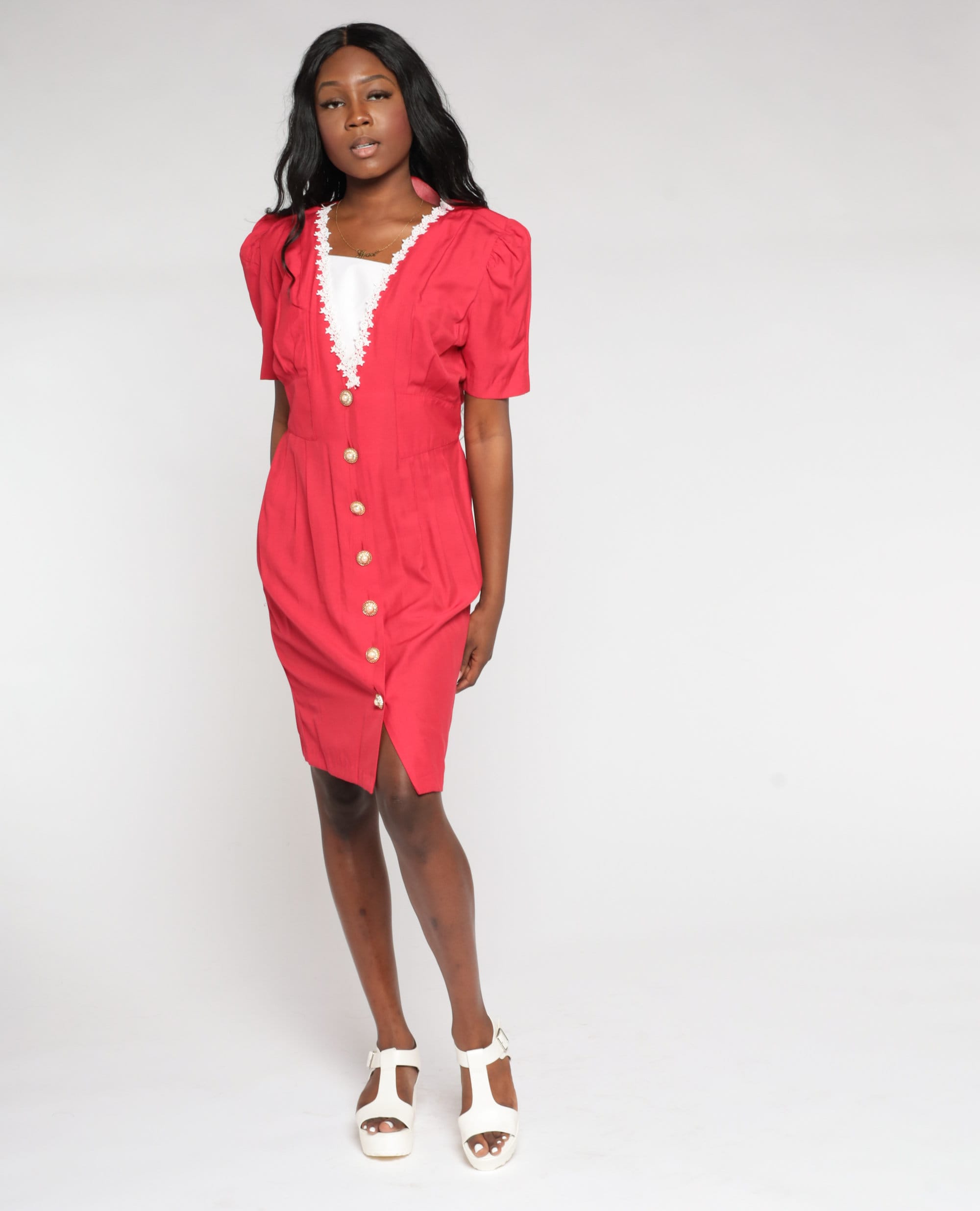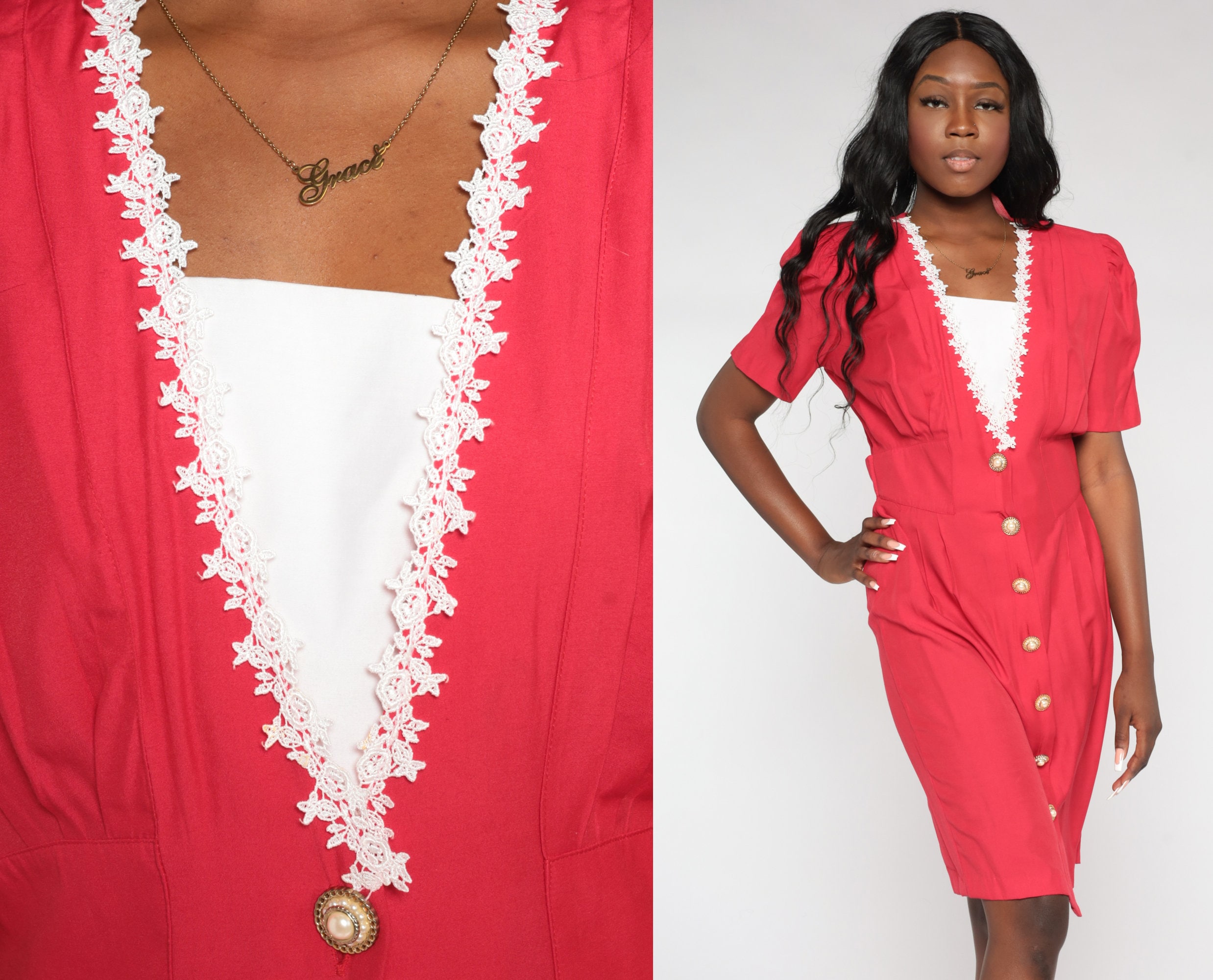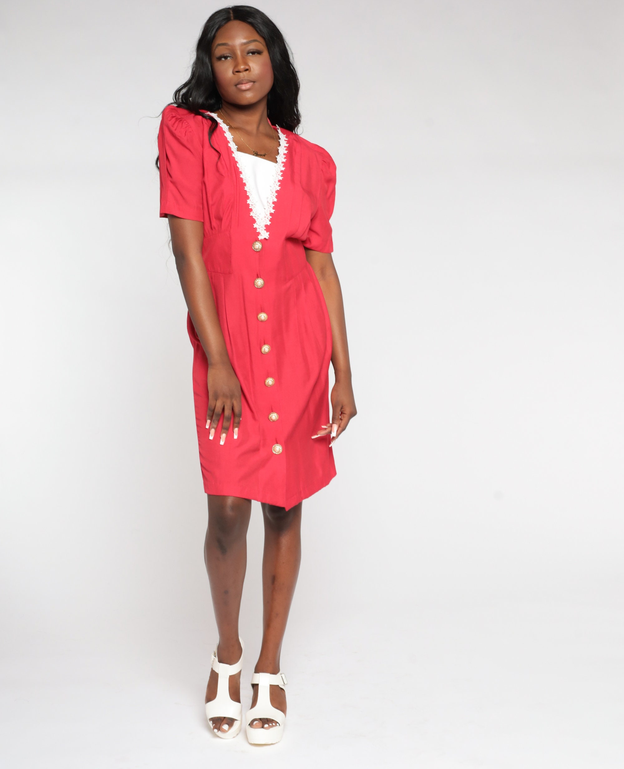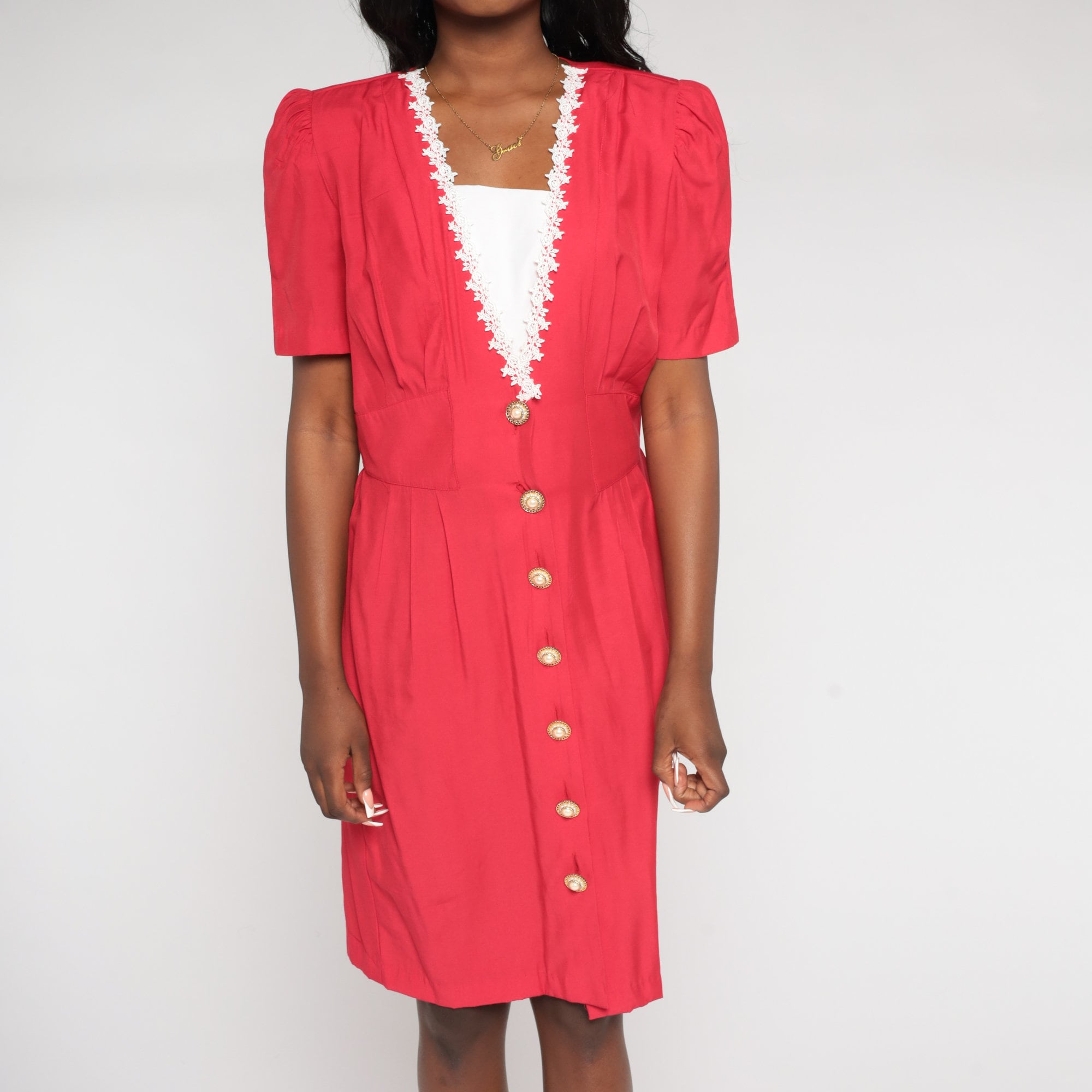 Vintage 90s does 80s dress in red with a layered v neck and lace floral trim. It has short puff sleeves, ornate buttons up the front, and a high waist with a button belt in the back. Midi length.