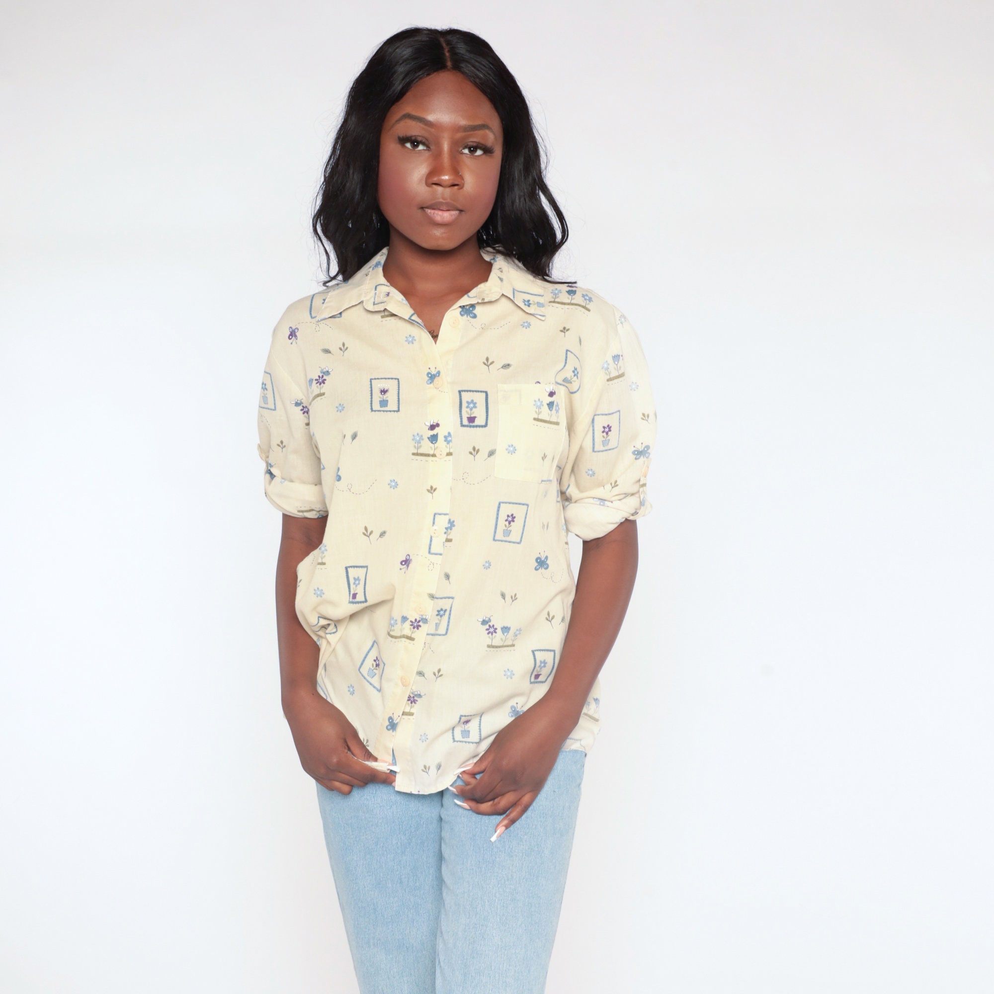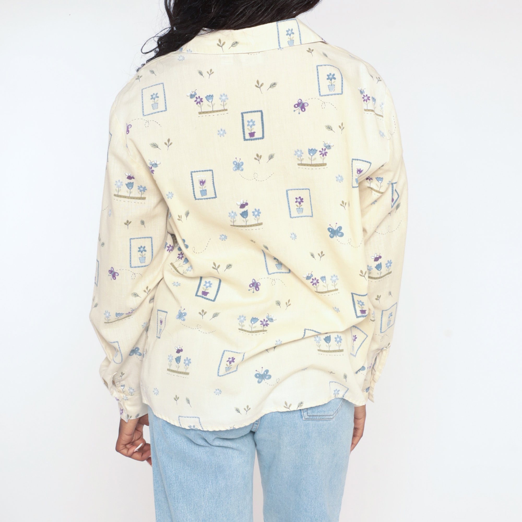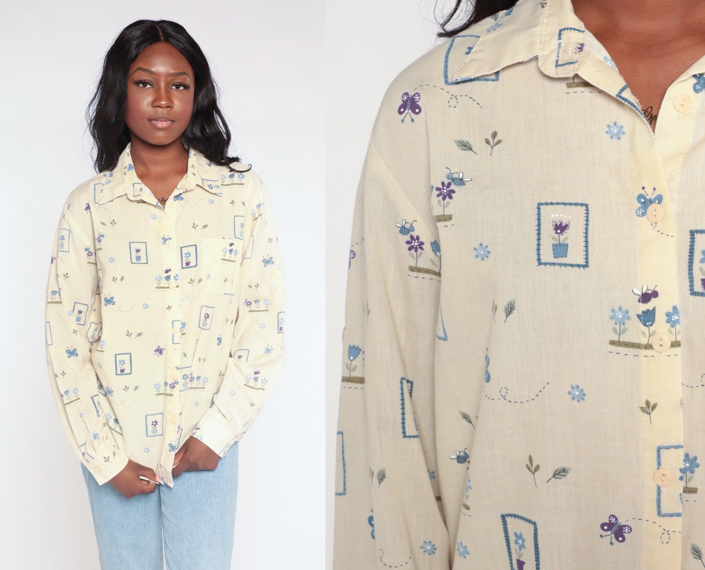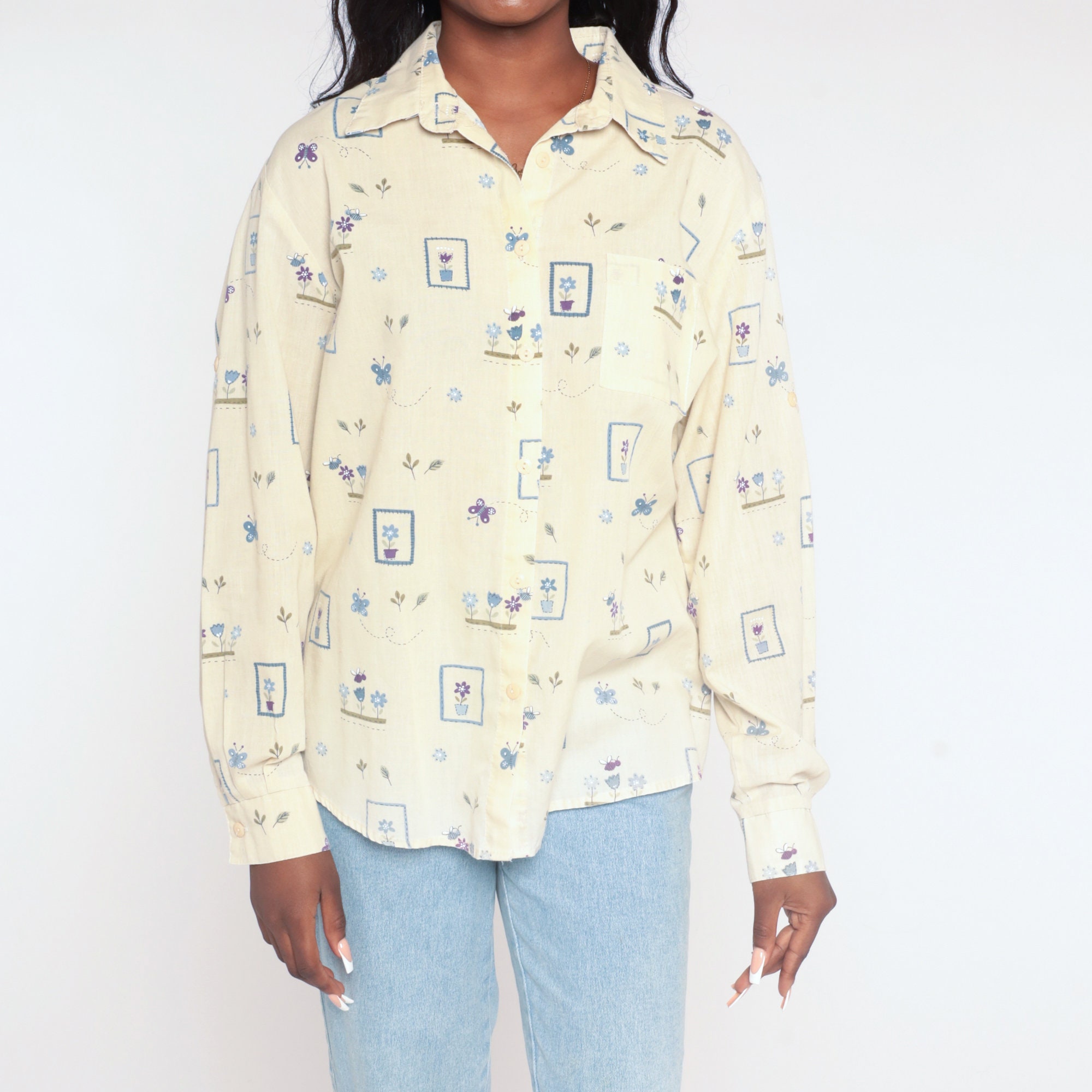 Vintage 90s shirt in yellow with a butterfly and flower print. Buttons up the front with long sleeves.