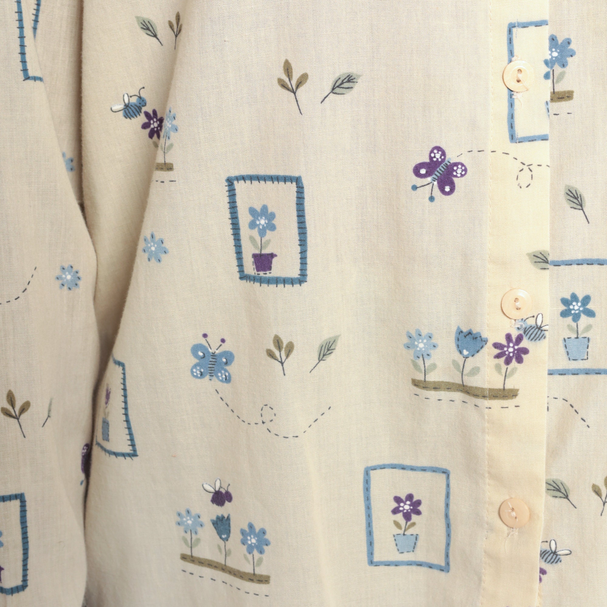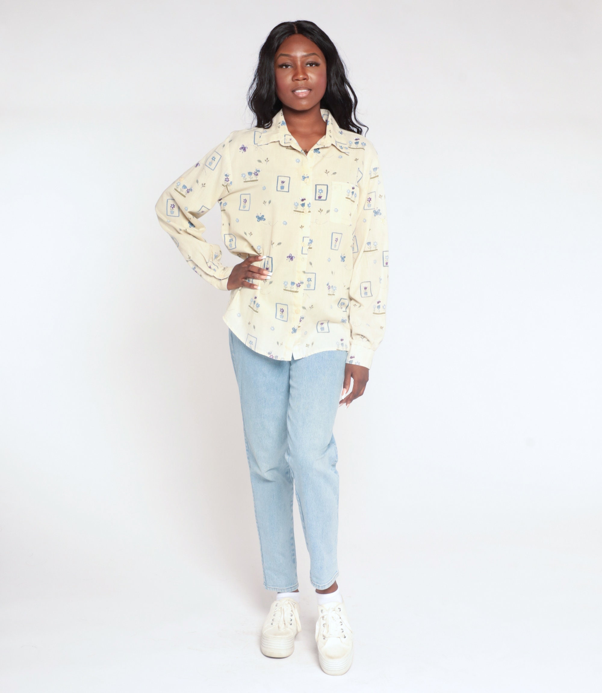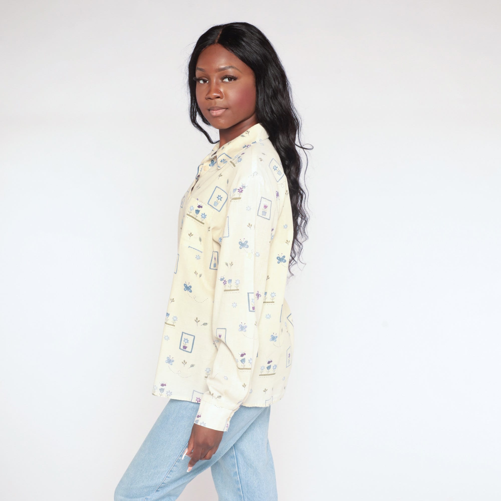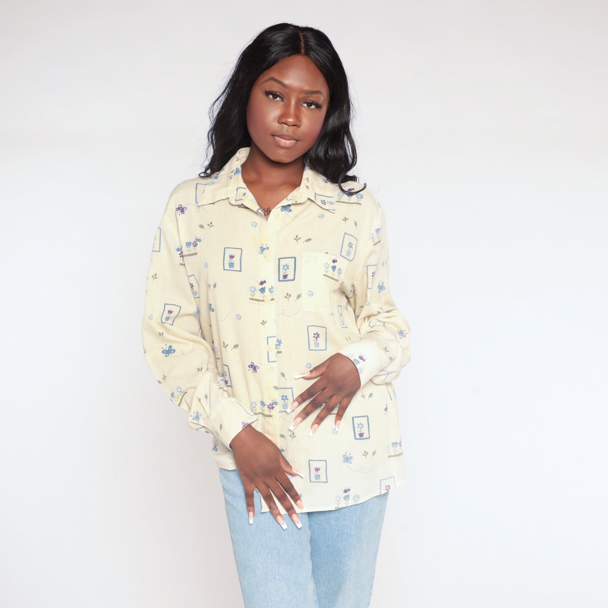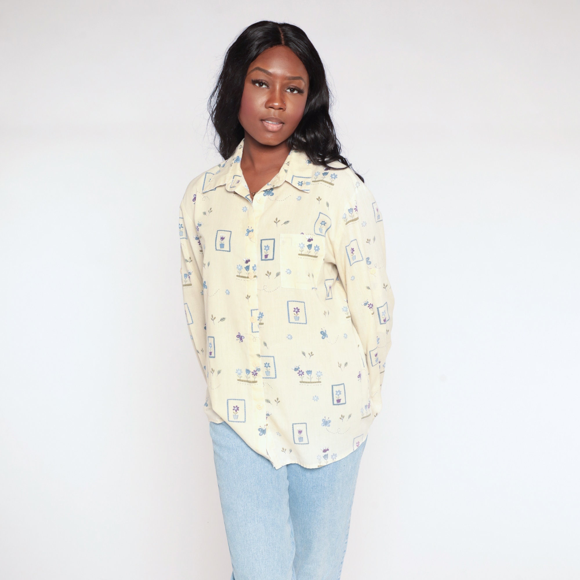 Vintage 90s shirt in yellow with a butterfly and flower print. Buttons up the front with long sleeves.