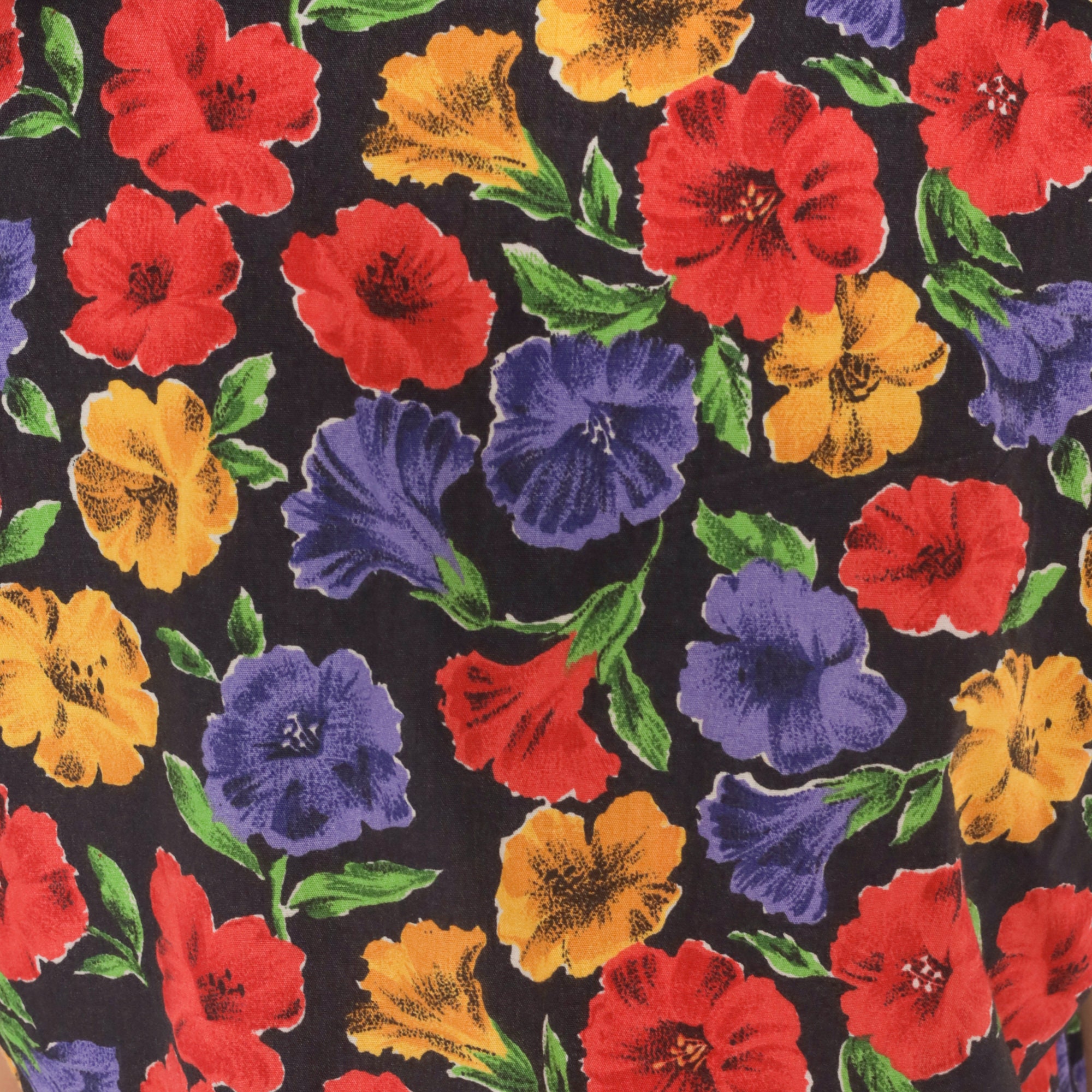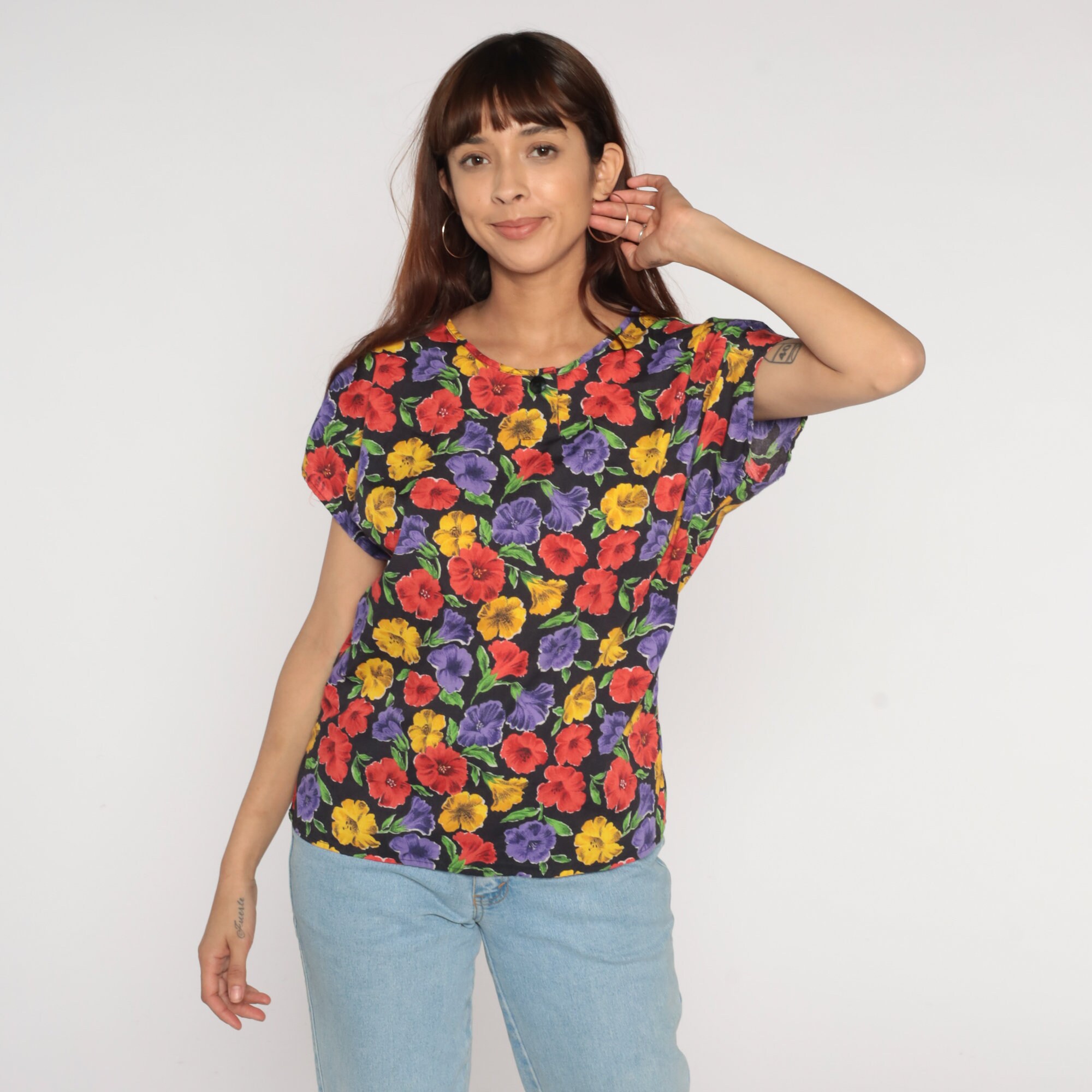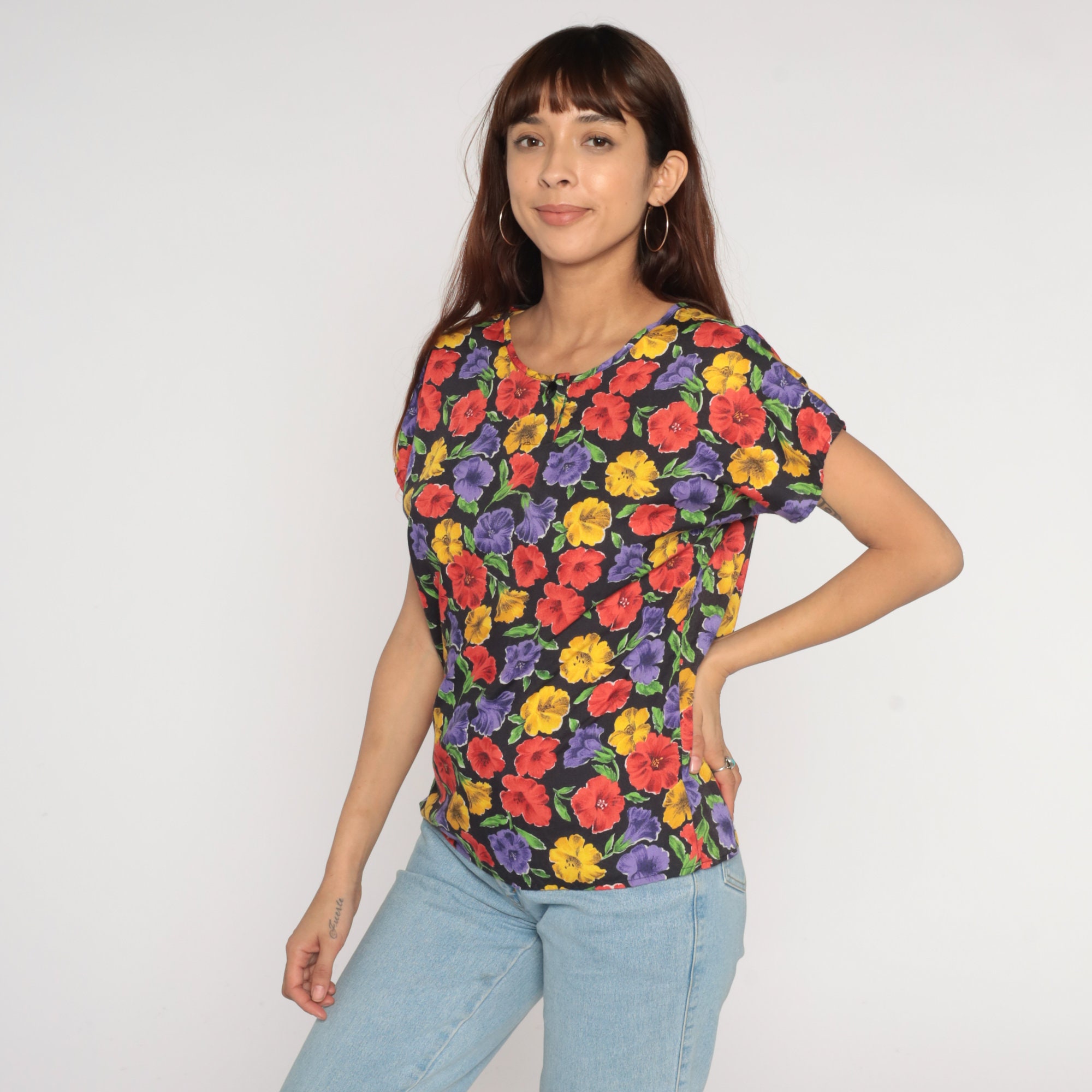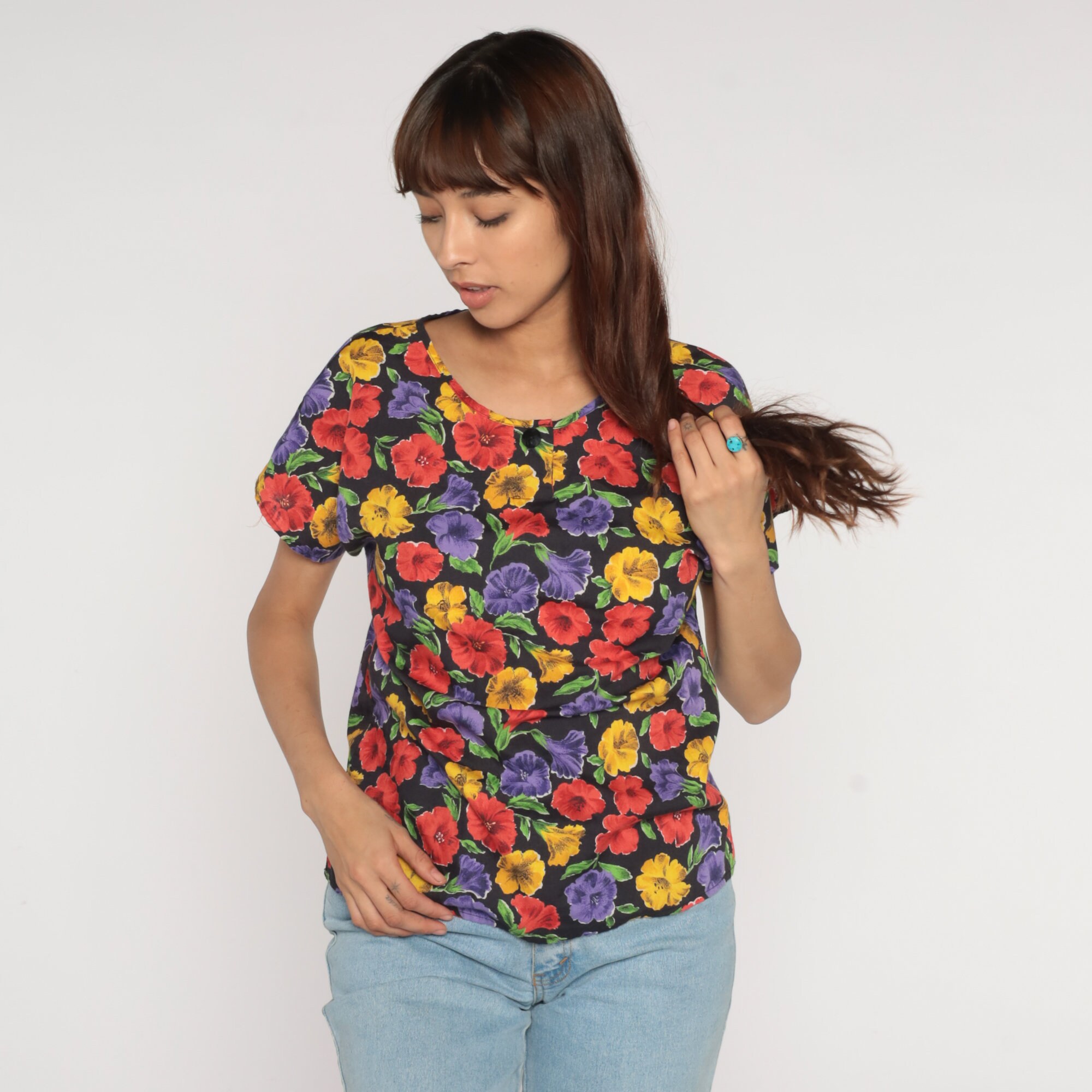 Vintage 90s shirt in black with a floral print. It has short sleeves and a button at the neck.