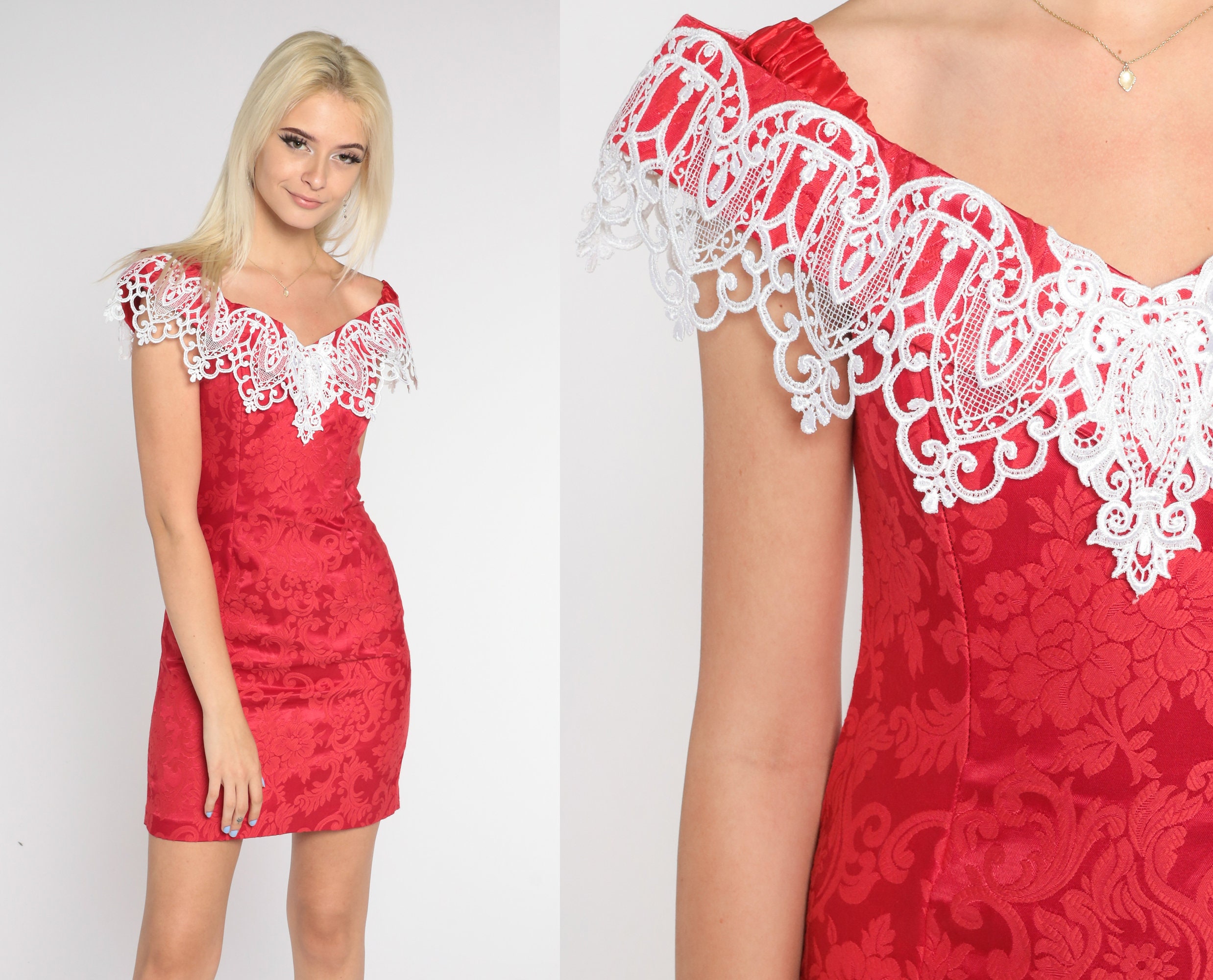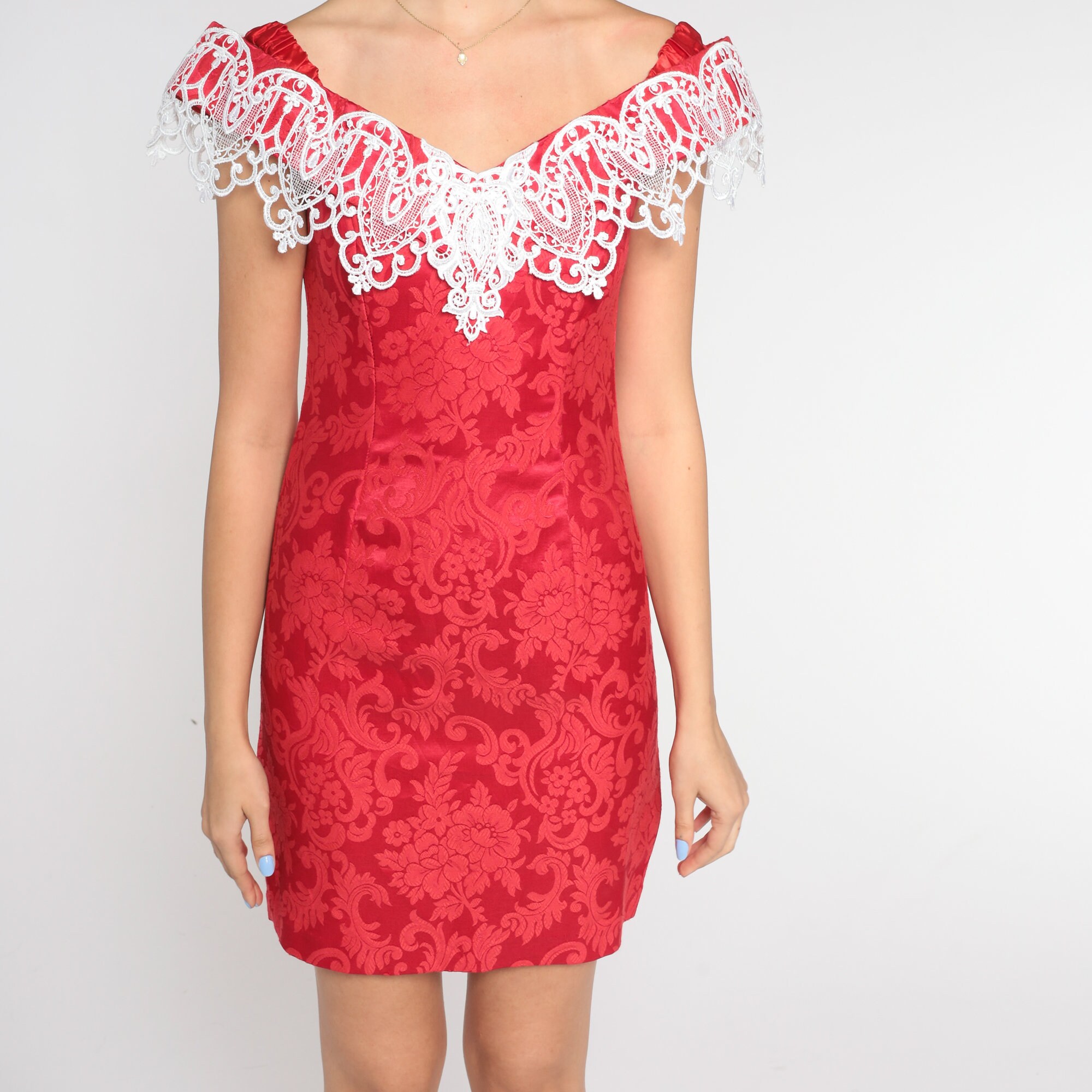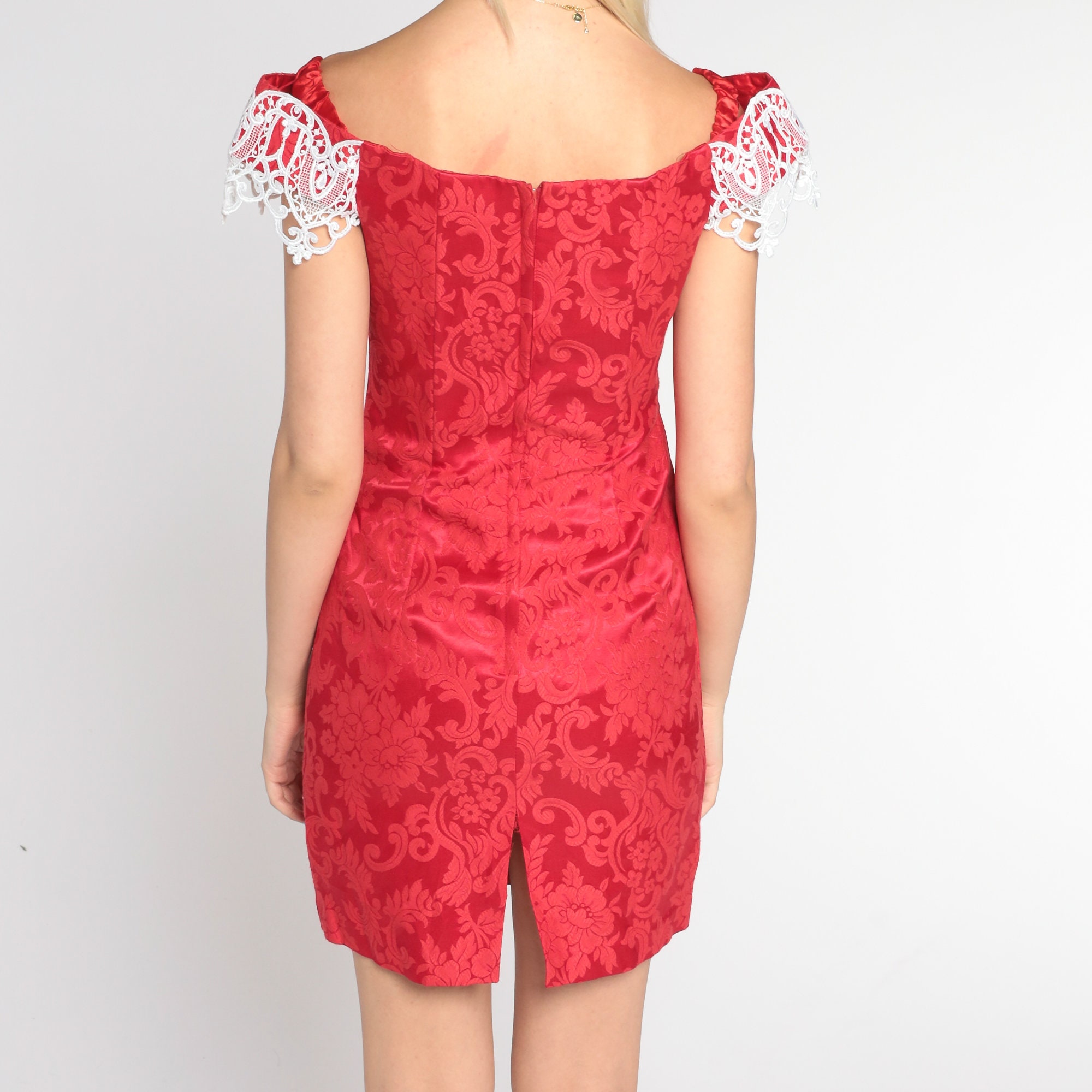 Vintage 80s dress in red with a floral embossed design and an off shoulder lace trim neckline. Mini length with a pencil skirt and a rear zipper.