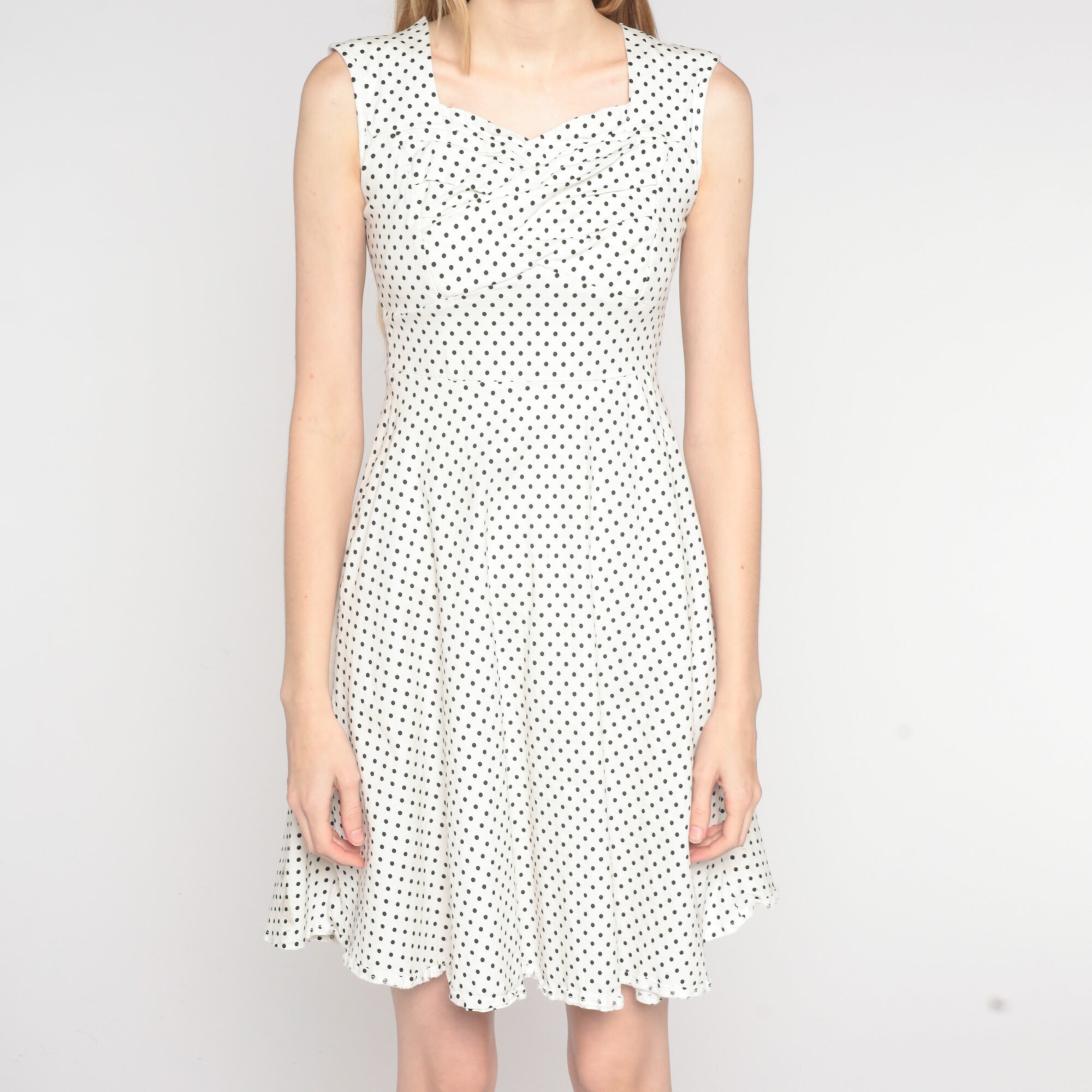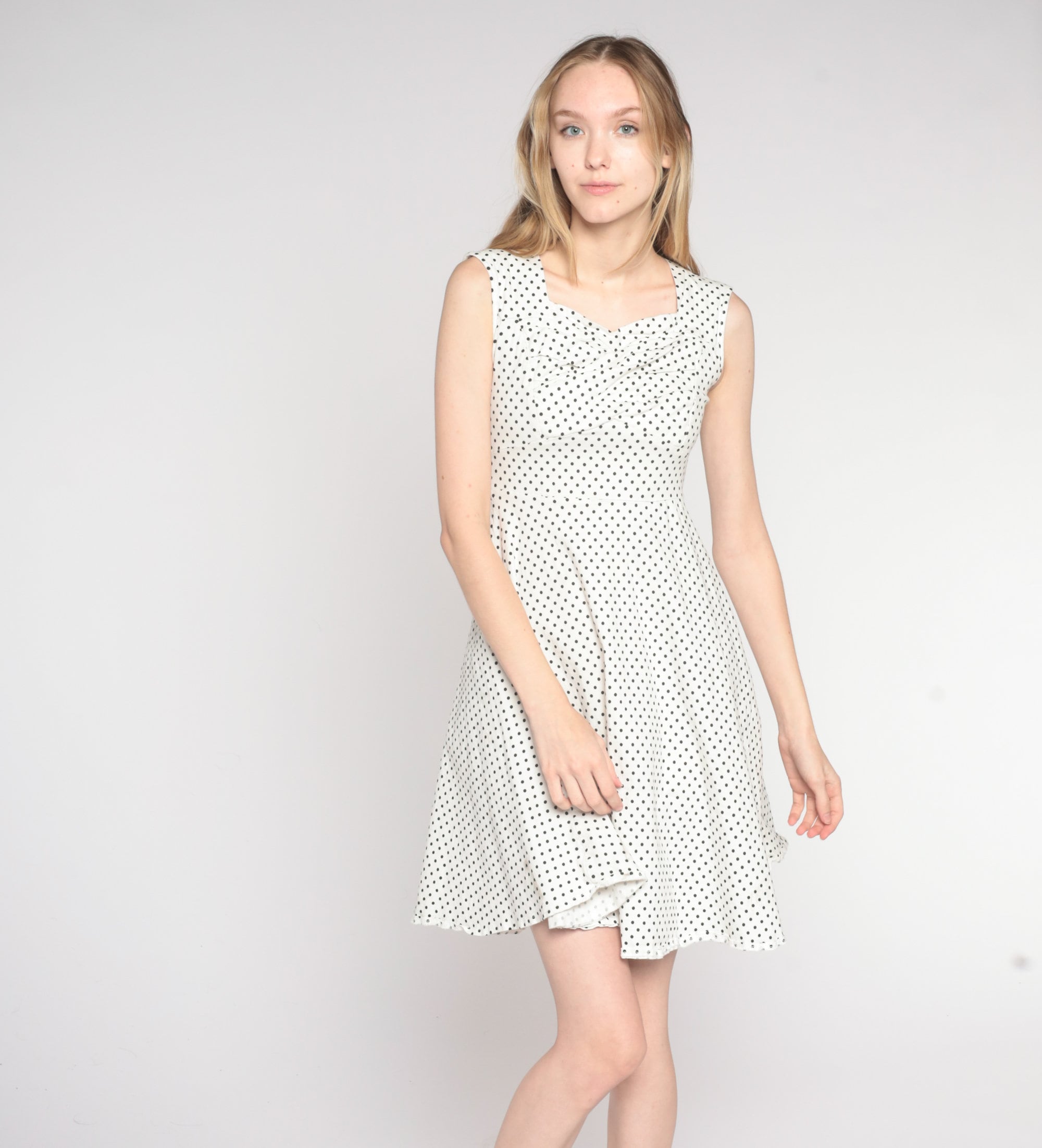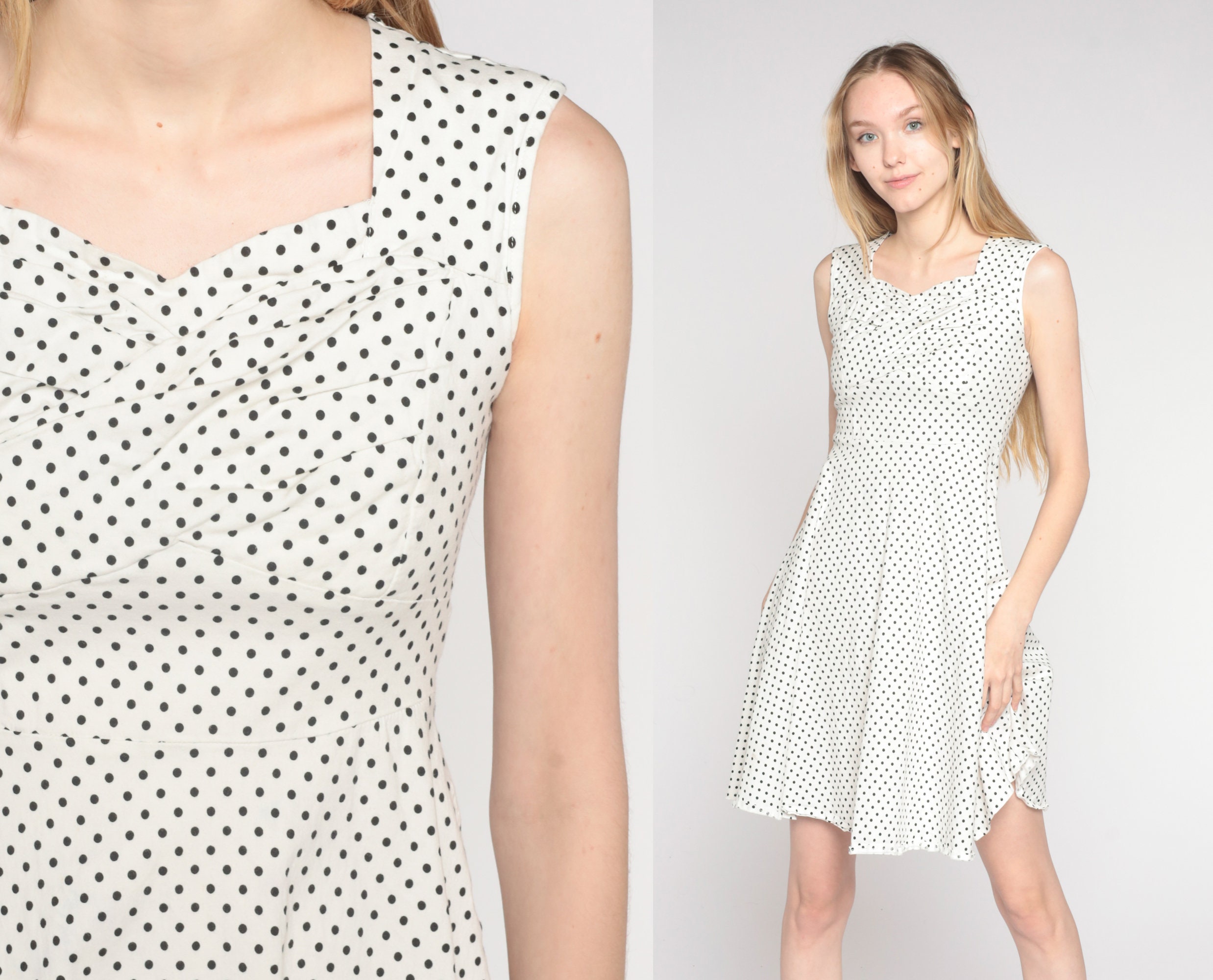 Vintage Y2K dress in white with black polka dots. Sleeveless with a sweetheart neckline and a fit and flare cut. Mini length with a rear zipper.