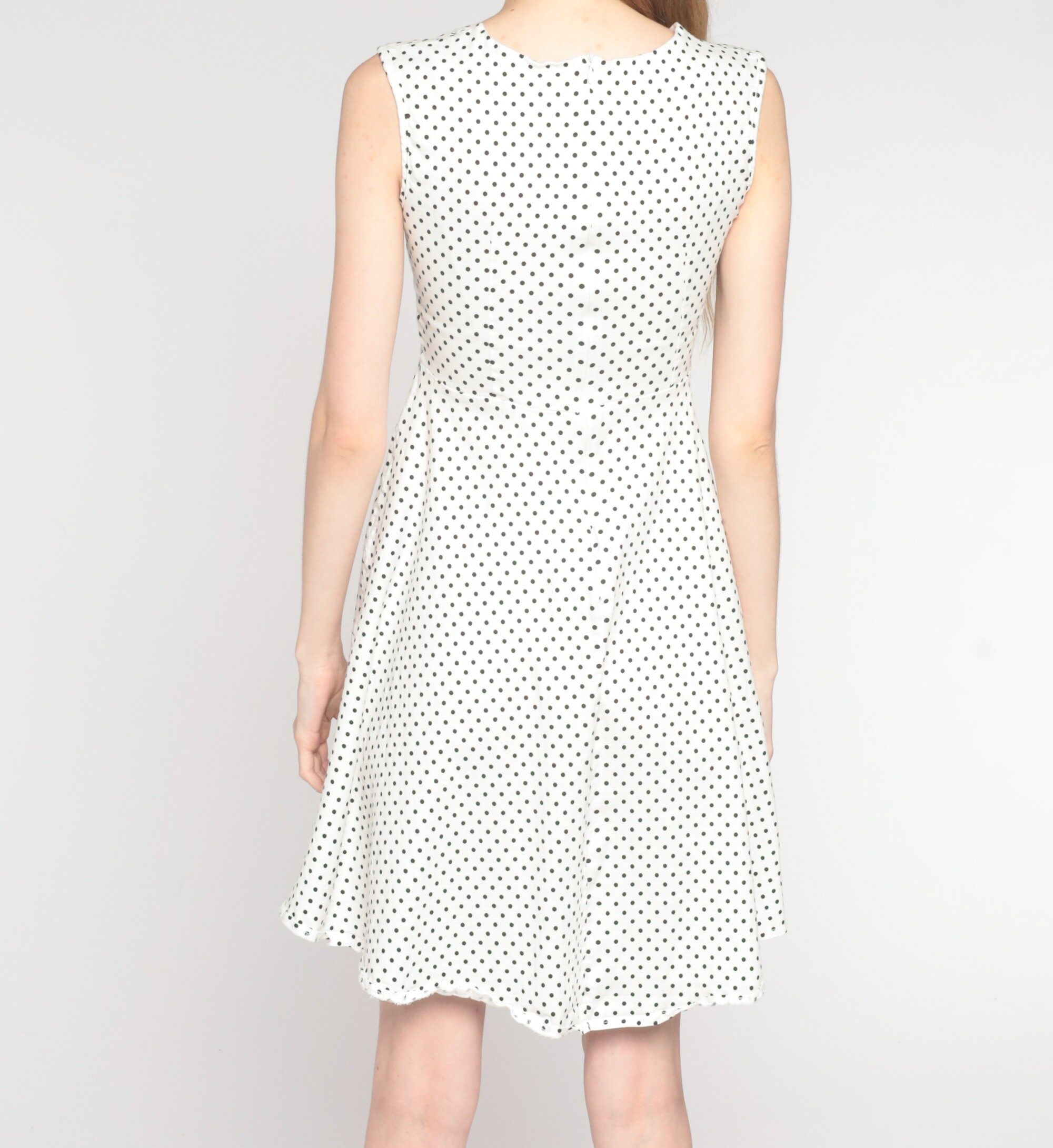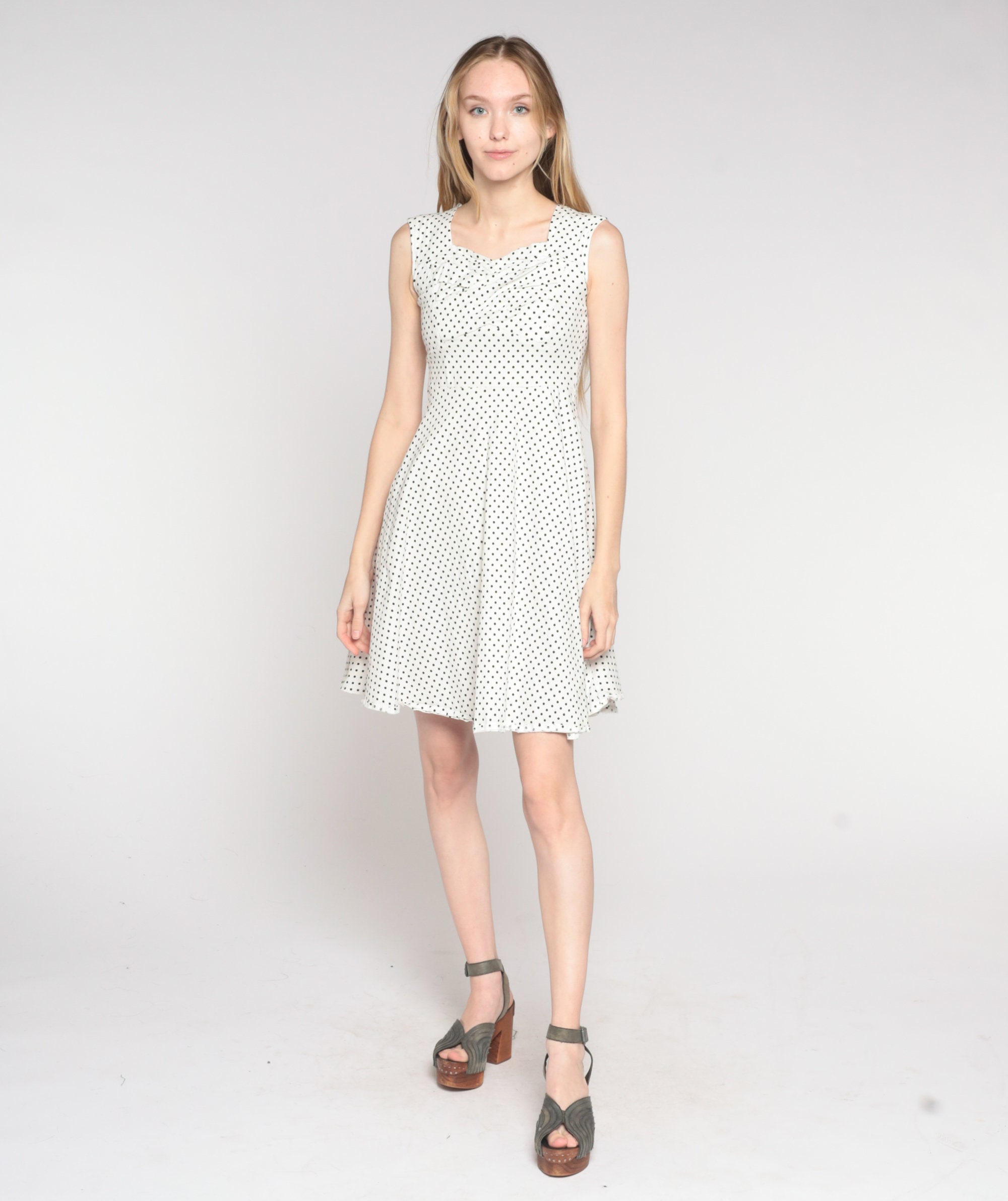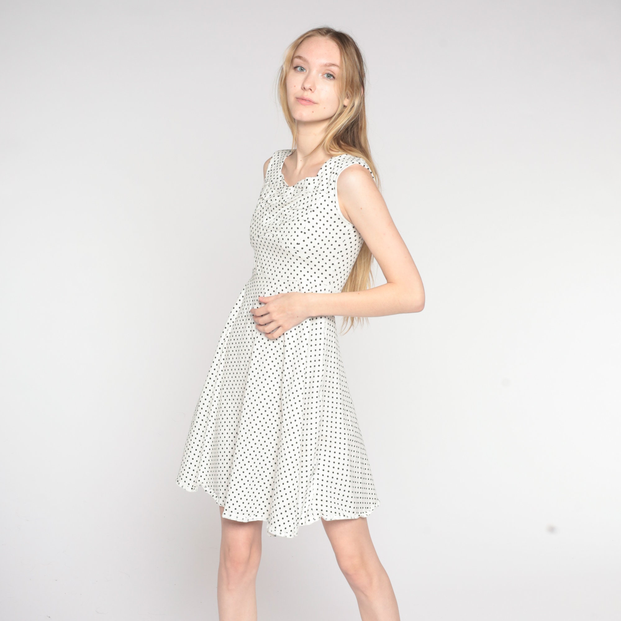 Vintage Y2K dress in white with black polka dots. Sleeveless with a sweetheart neckline and a fit and flare cut. Mini length with a rear zipper.