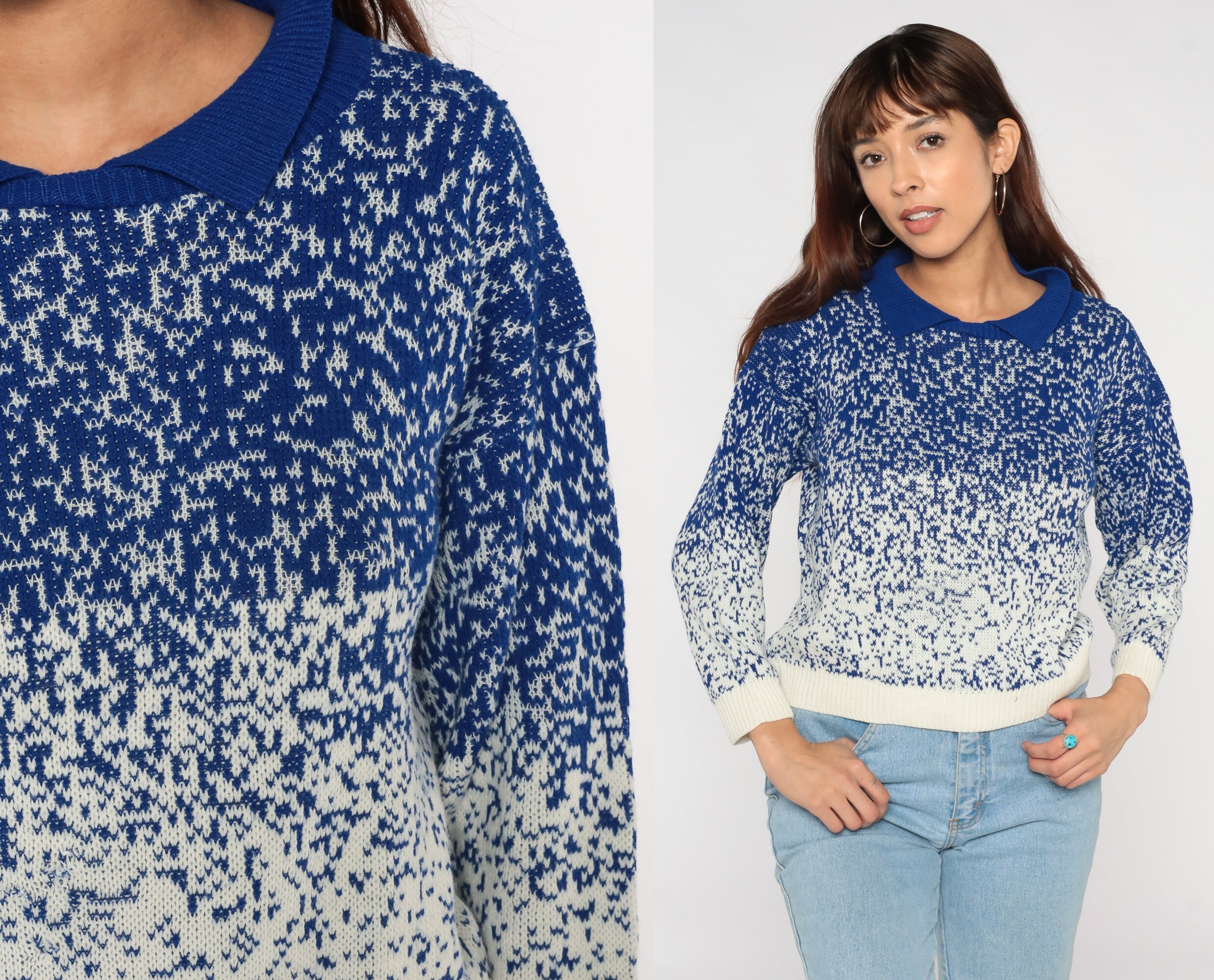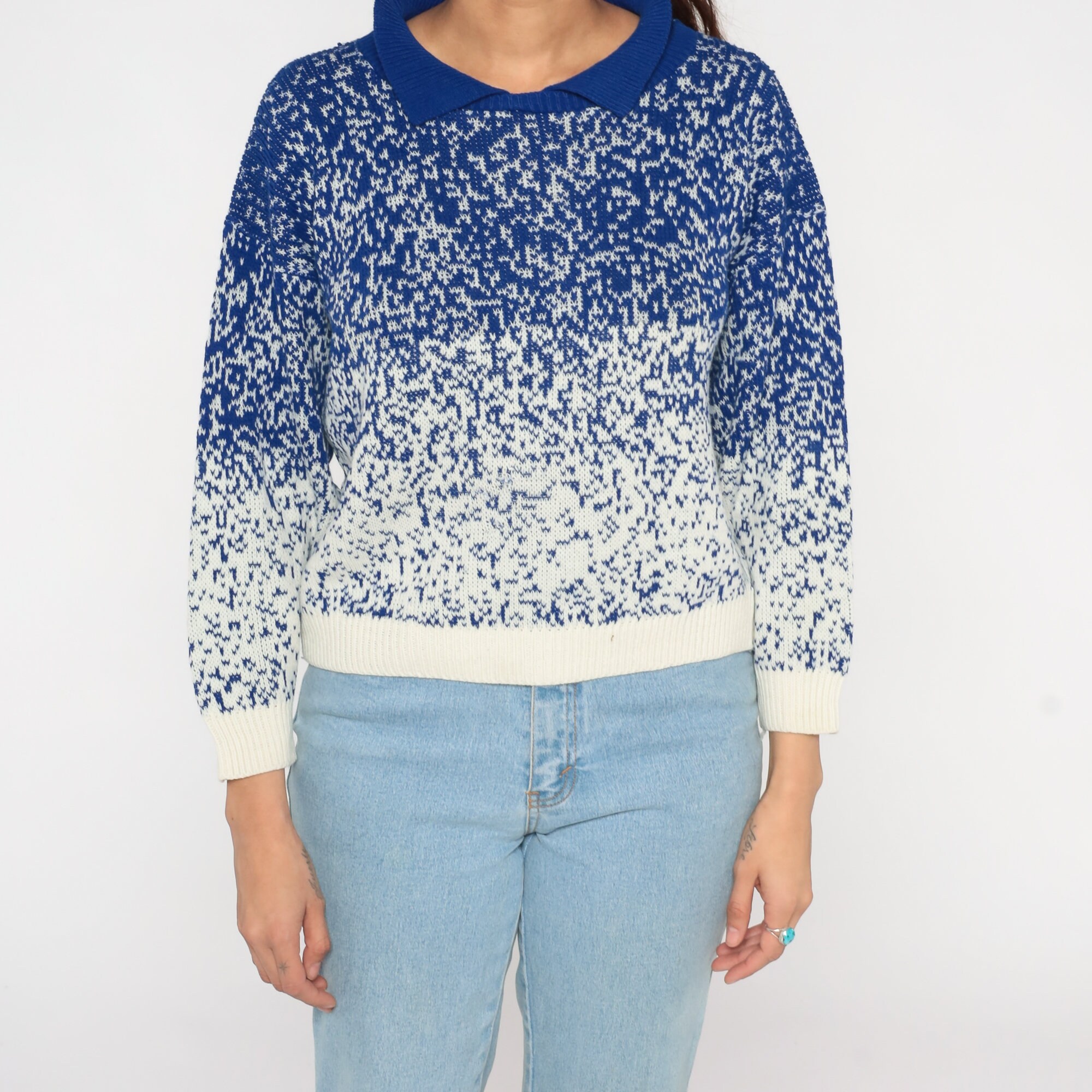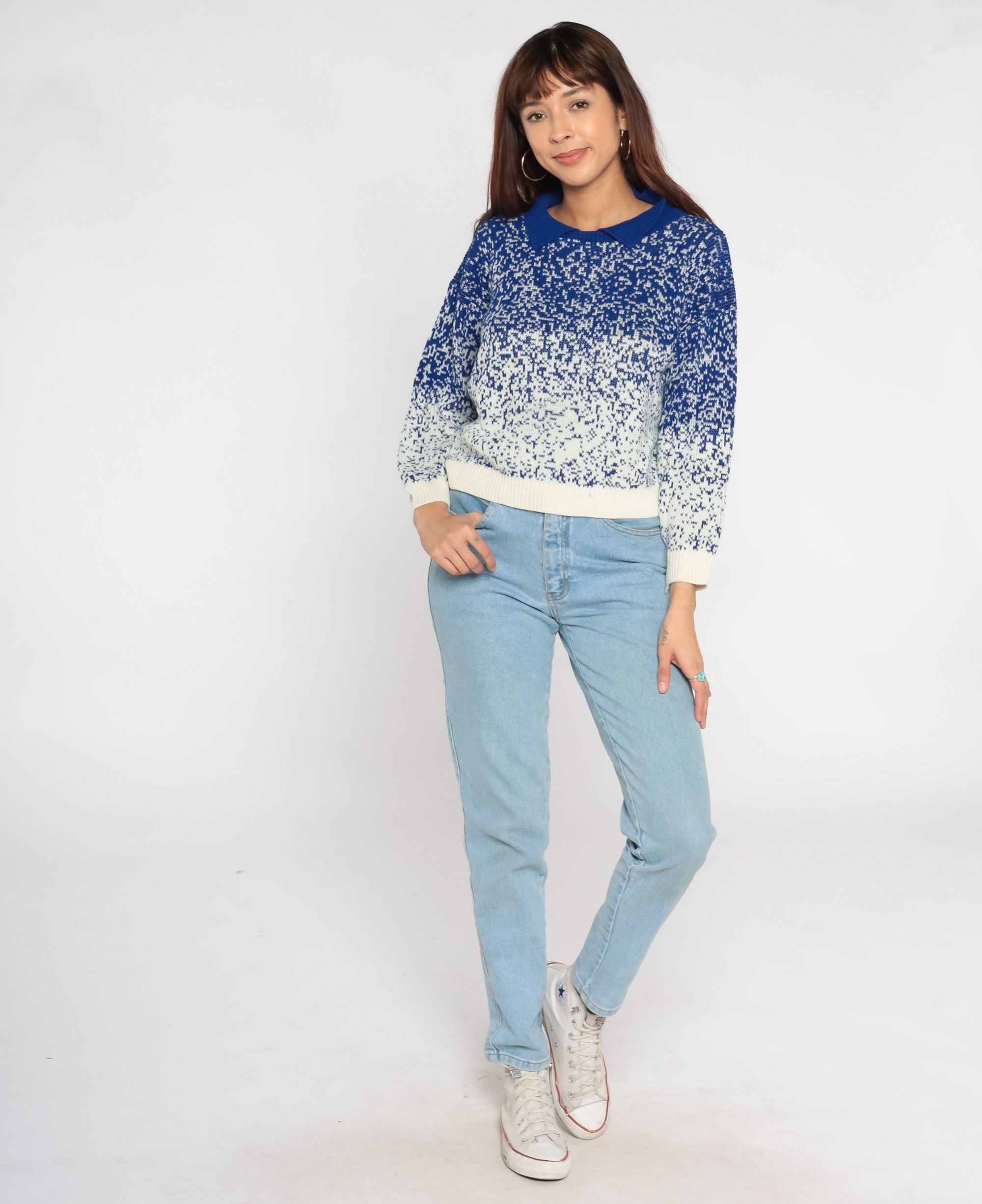 Vintage 80s sweater in blue and white gradient knit with a blue collar.