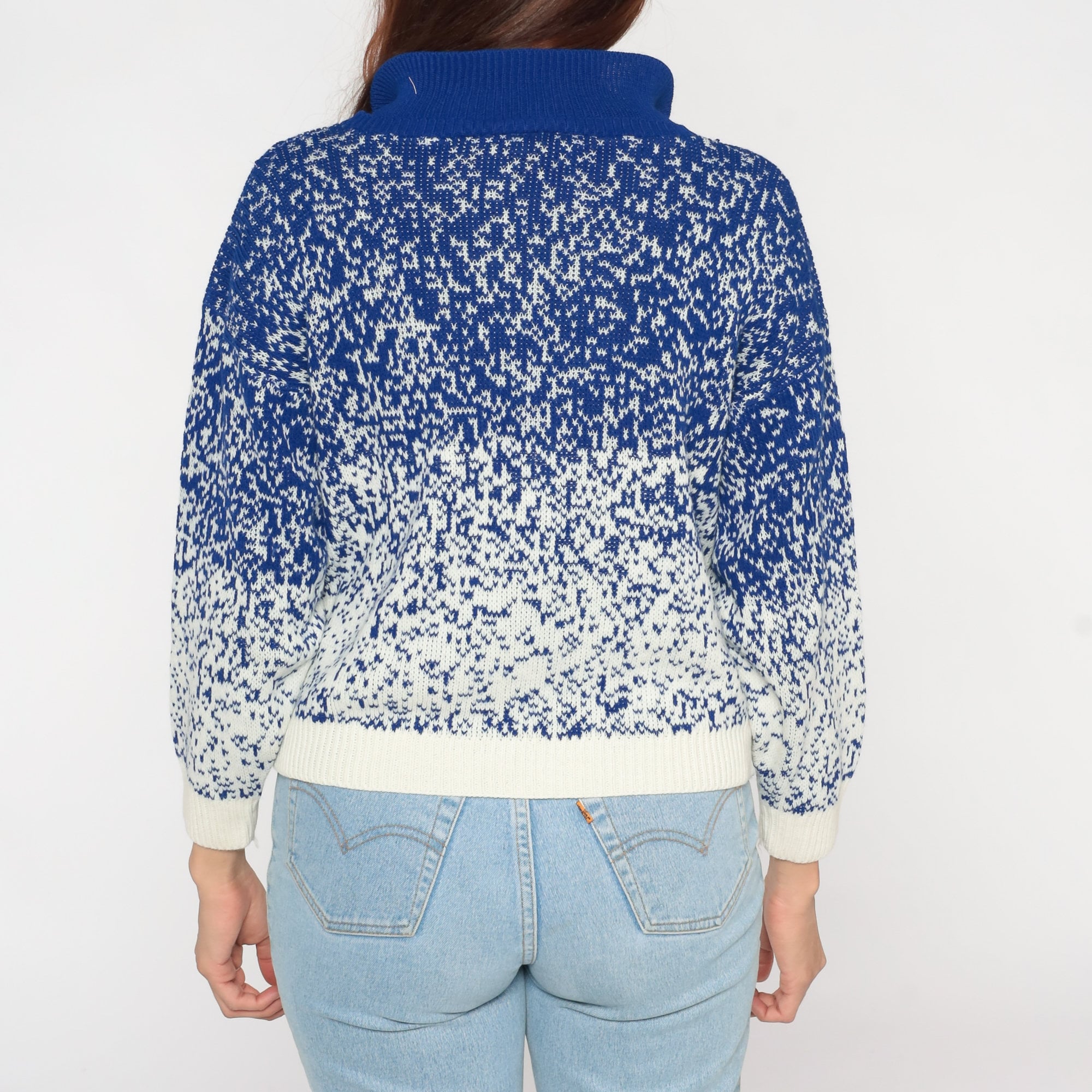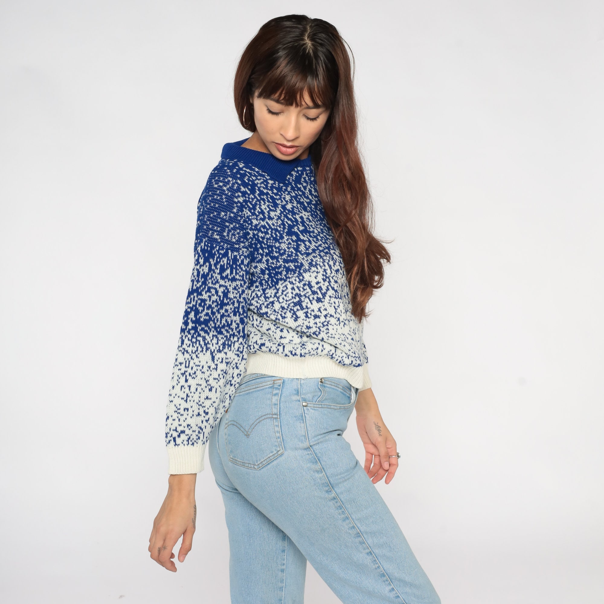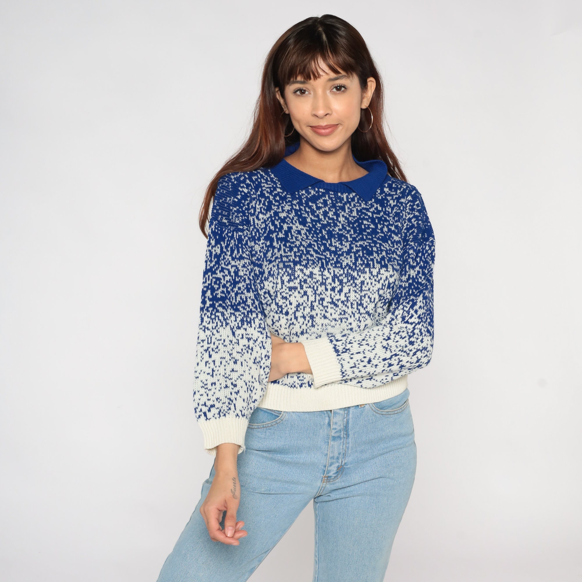 Vintage 80s sweater in blue and white gradient knit with a blue collar.