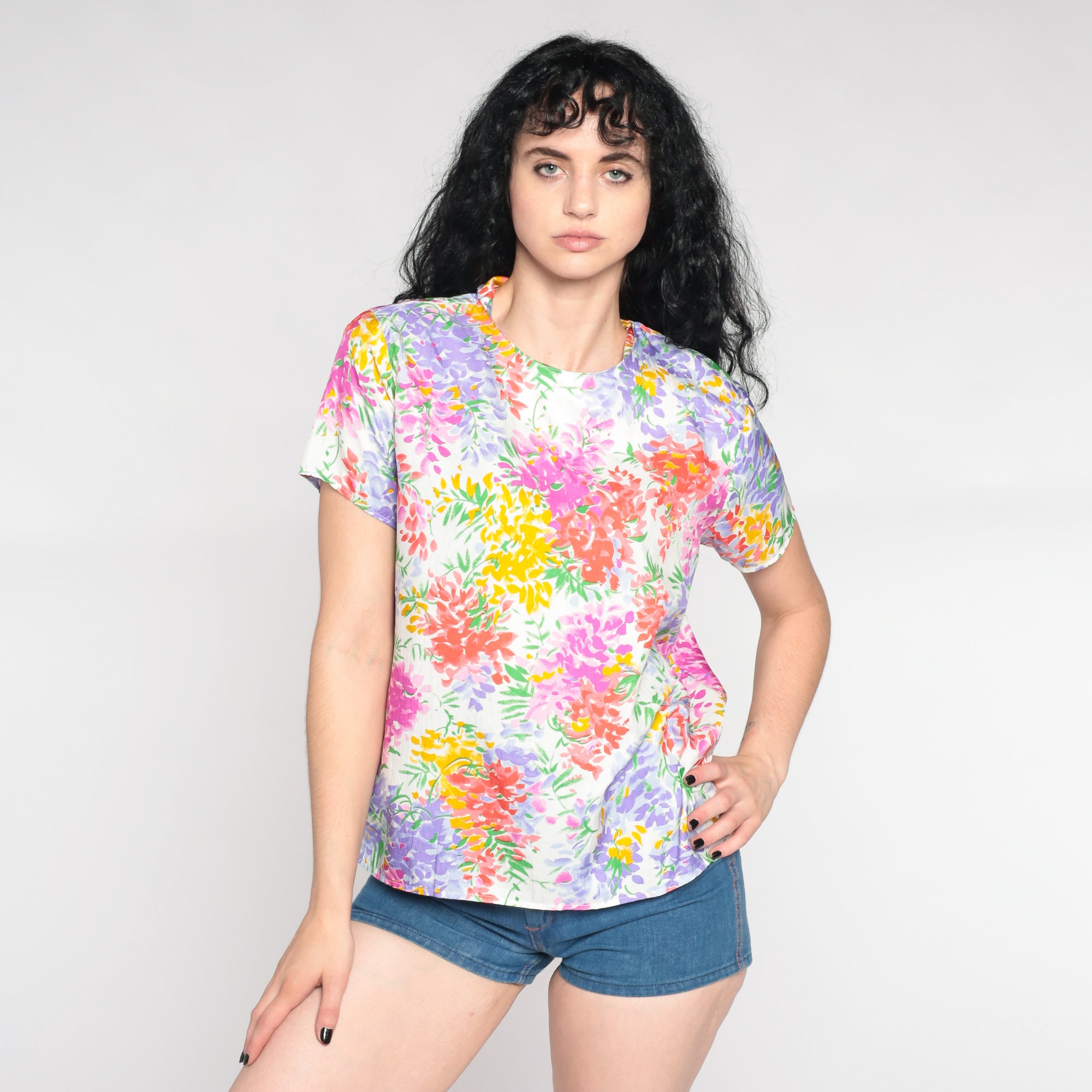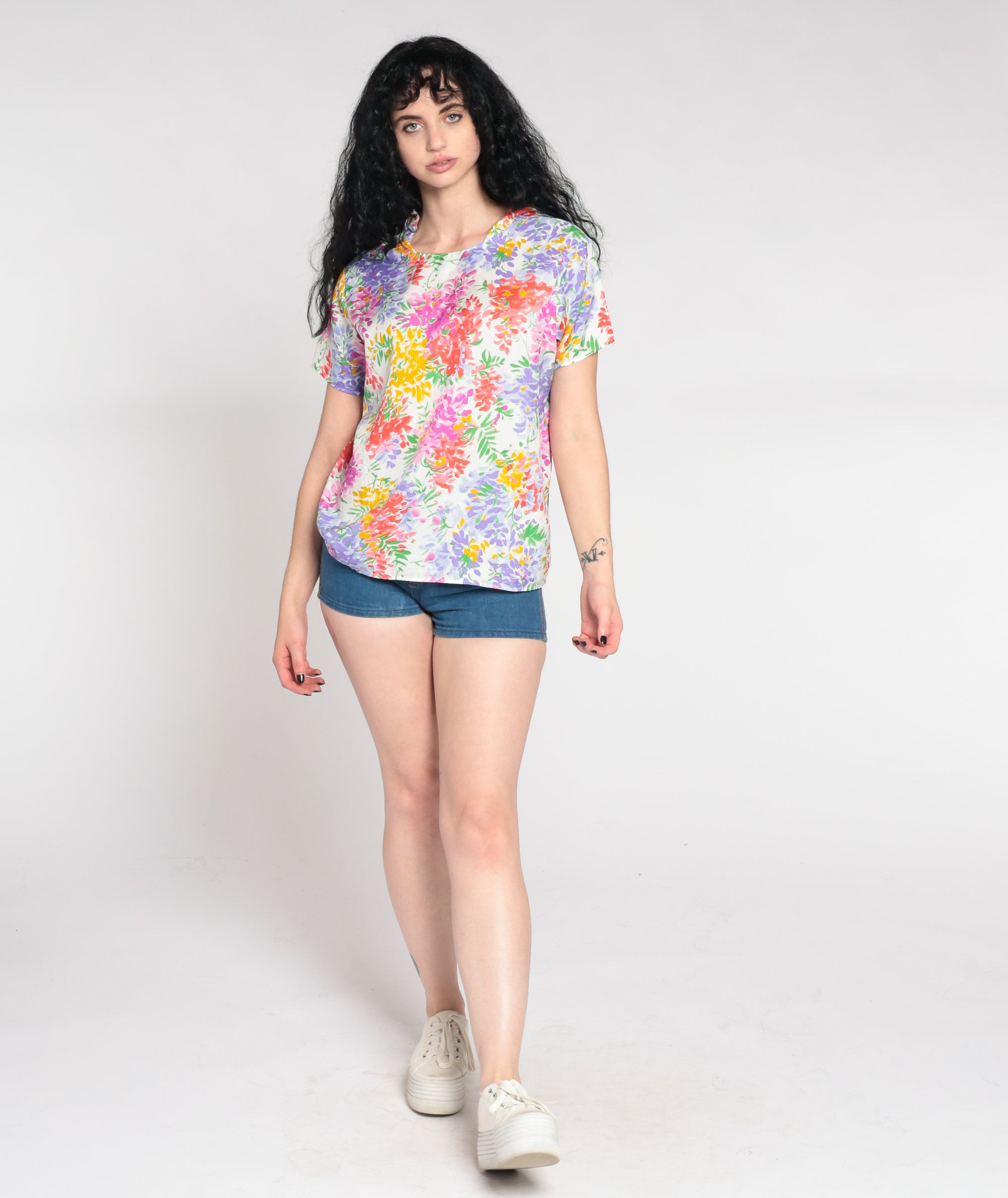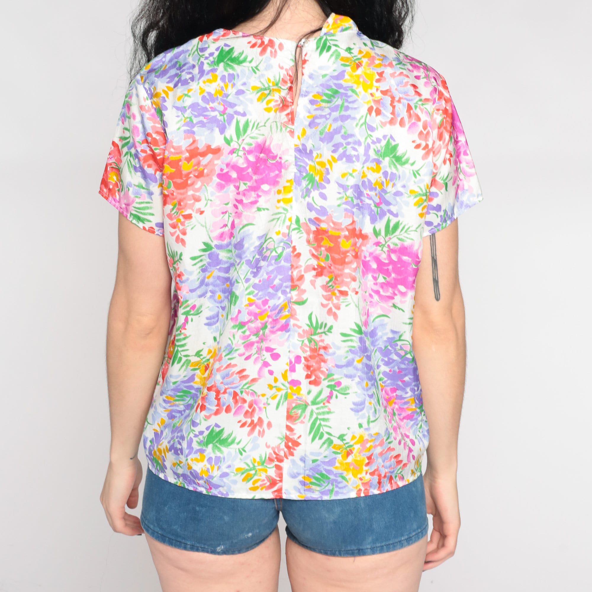 Vintage 90s shirt in white with a floral print and short sleeves. It has a single button closure at the back of the neck.