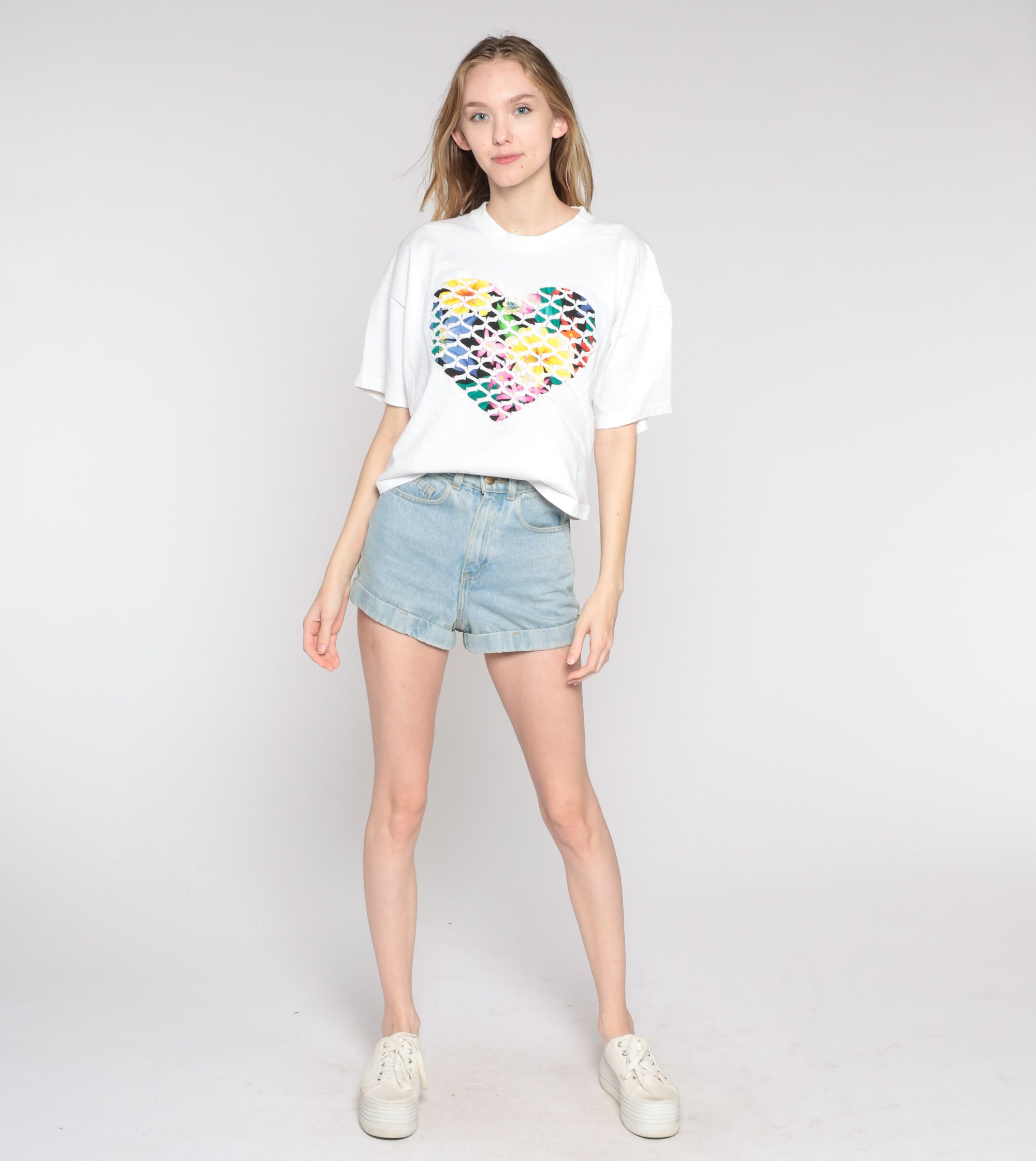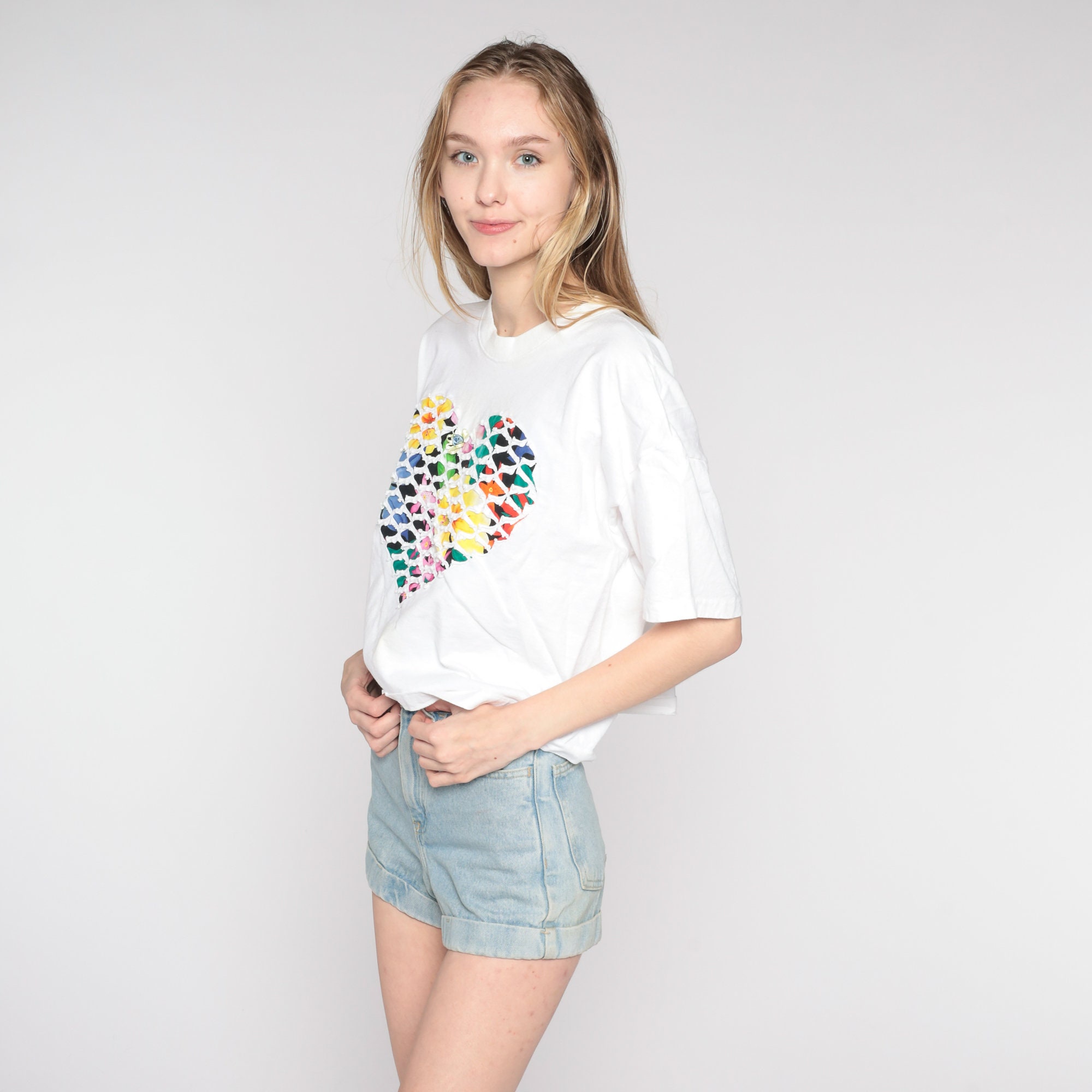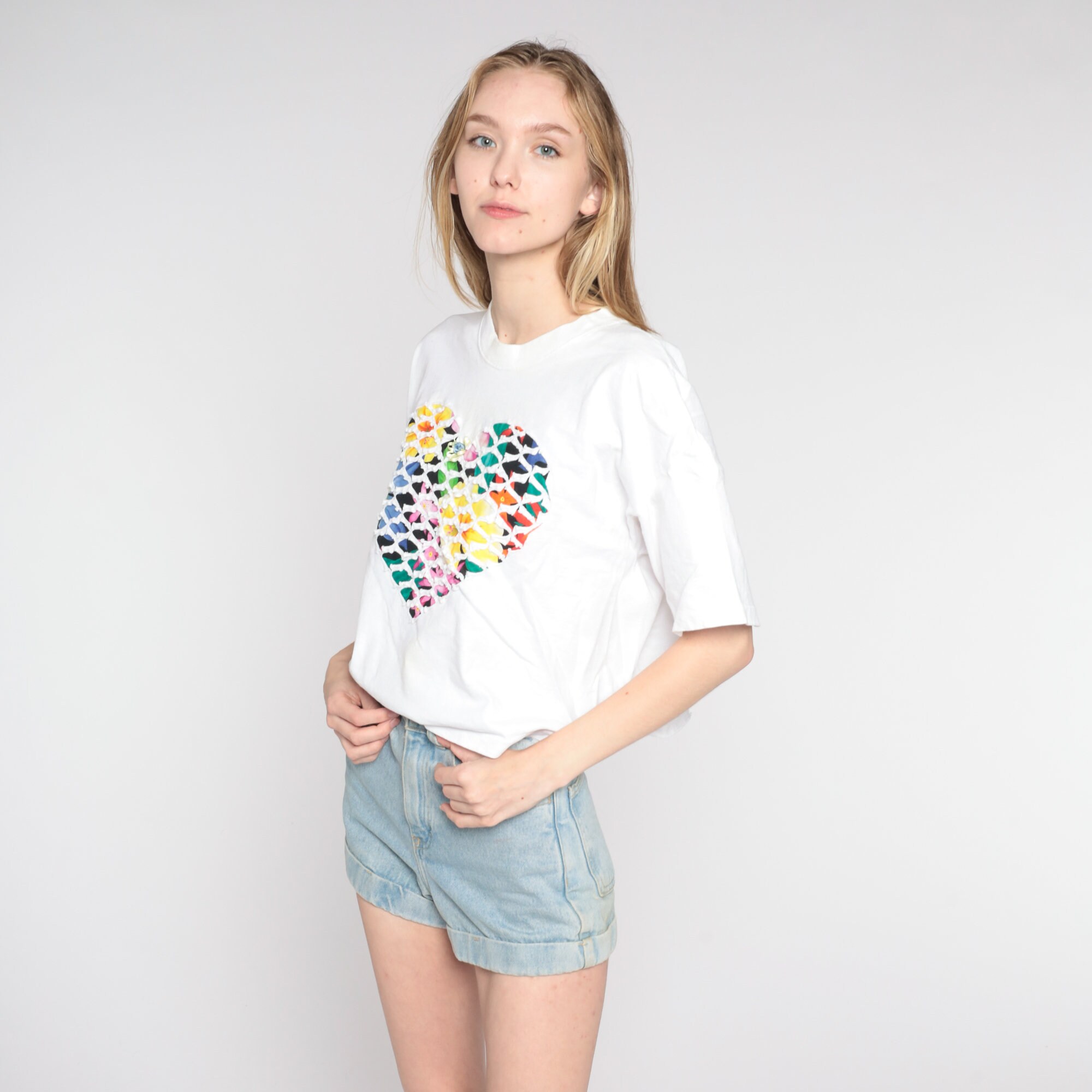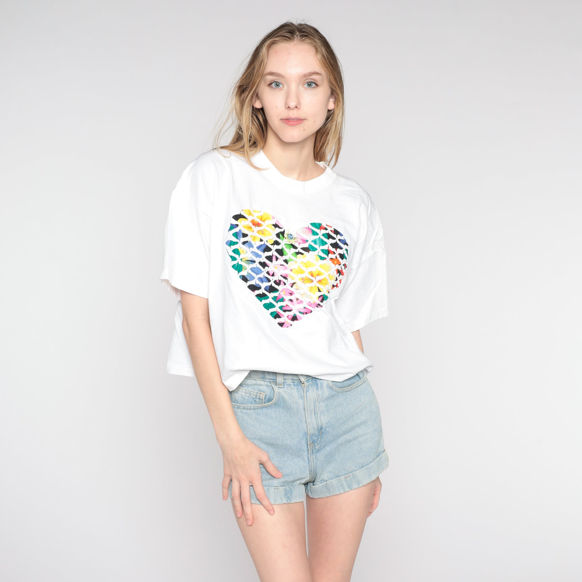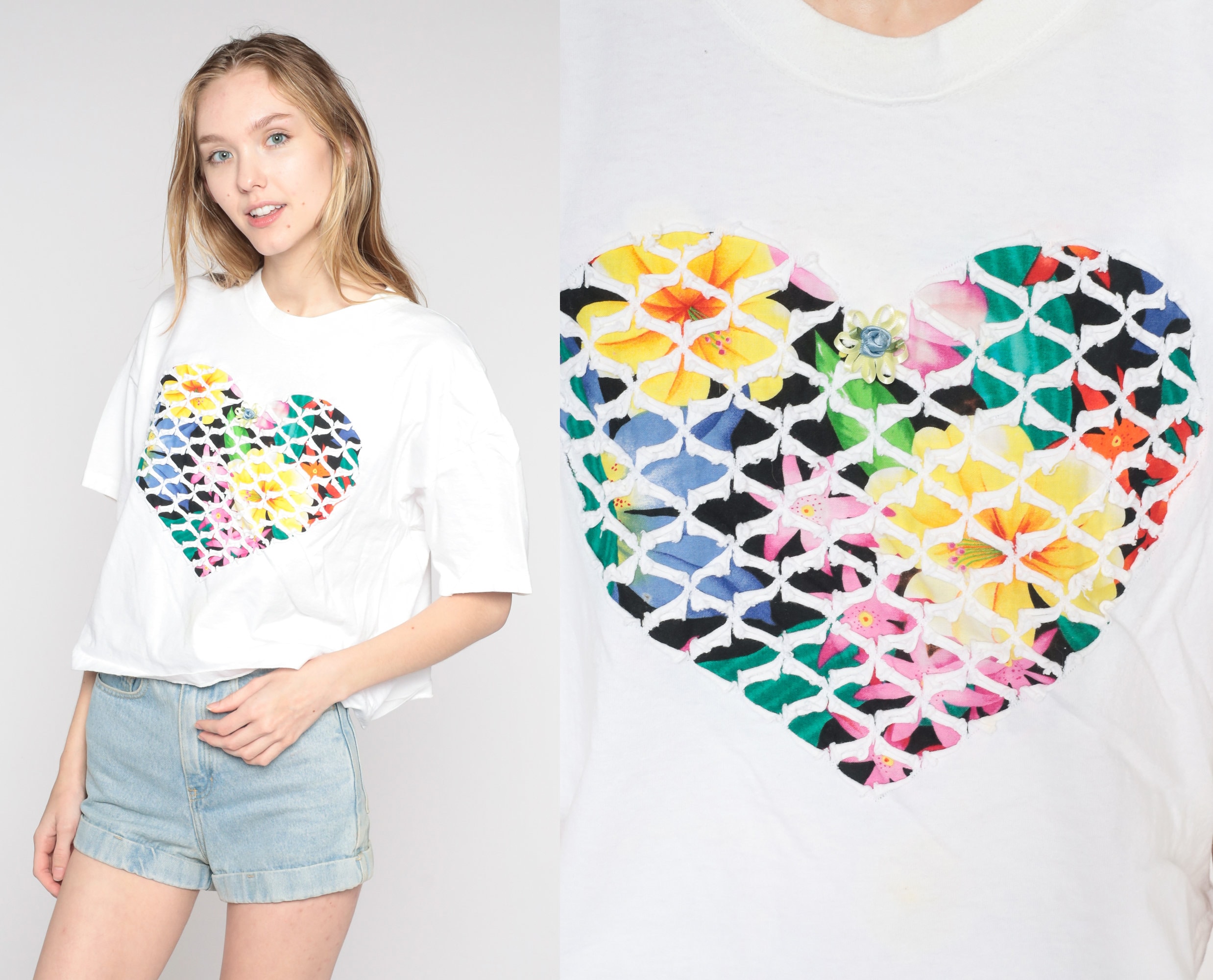 Vintage 90s t shirt with a bright floral heart design with a white textured overlay and a rosette on the chest.