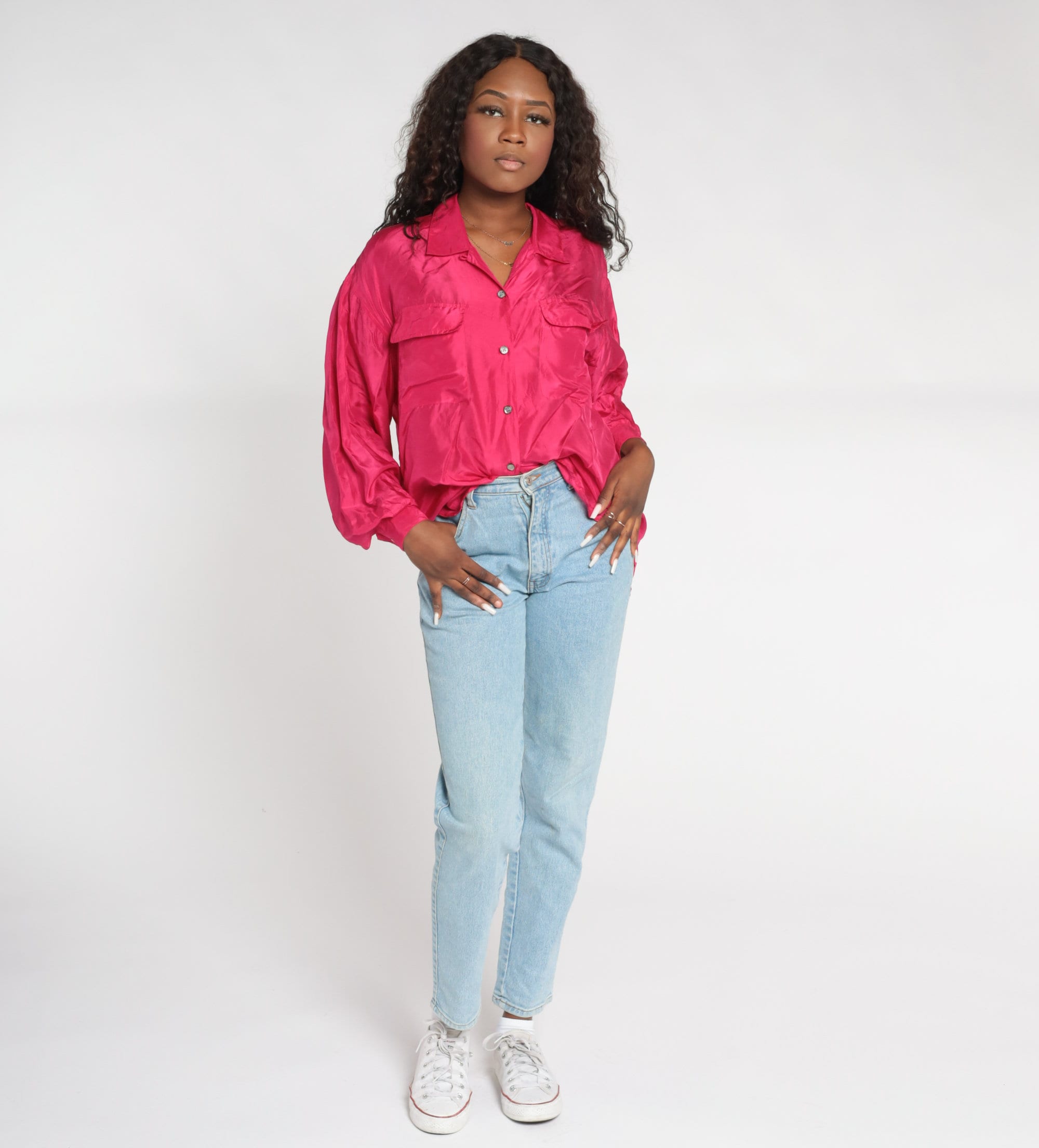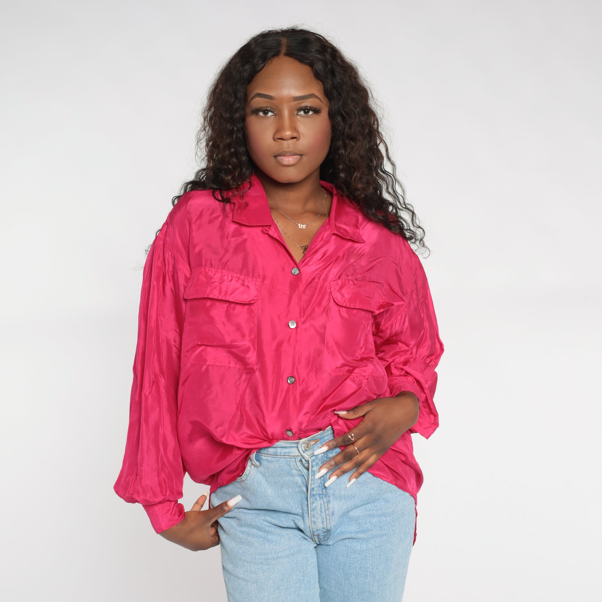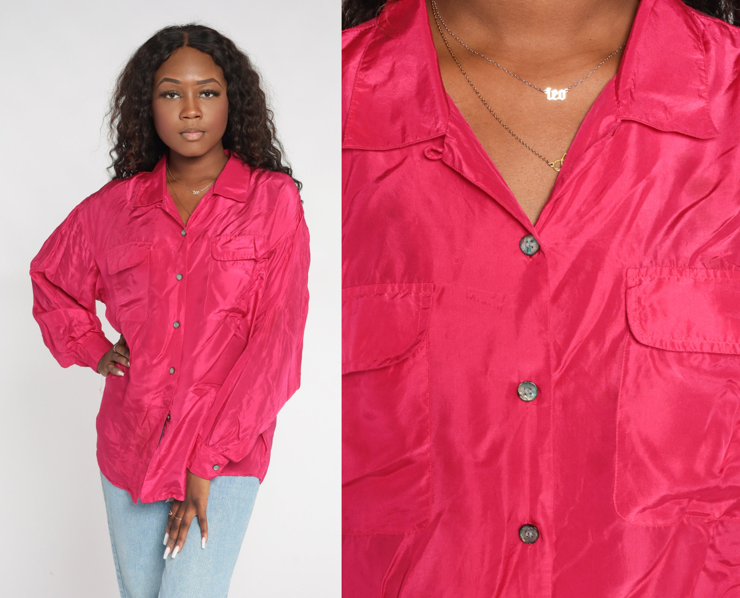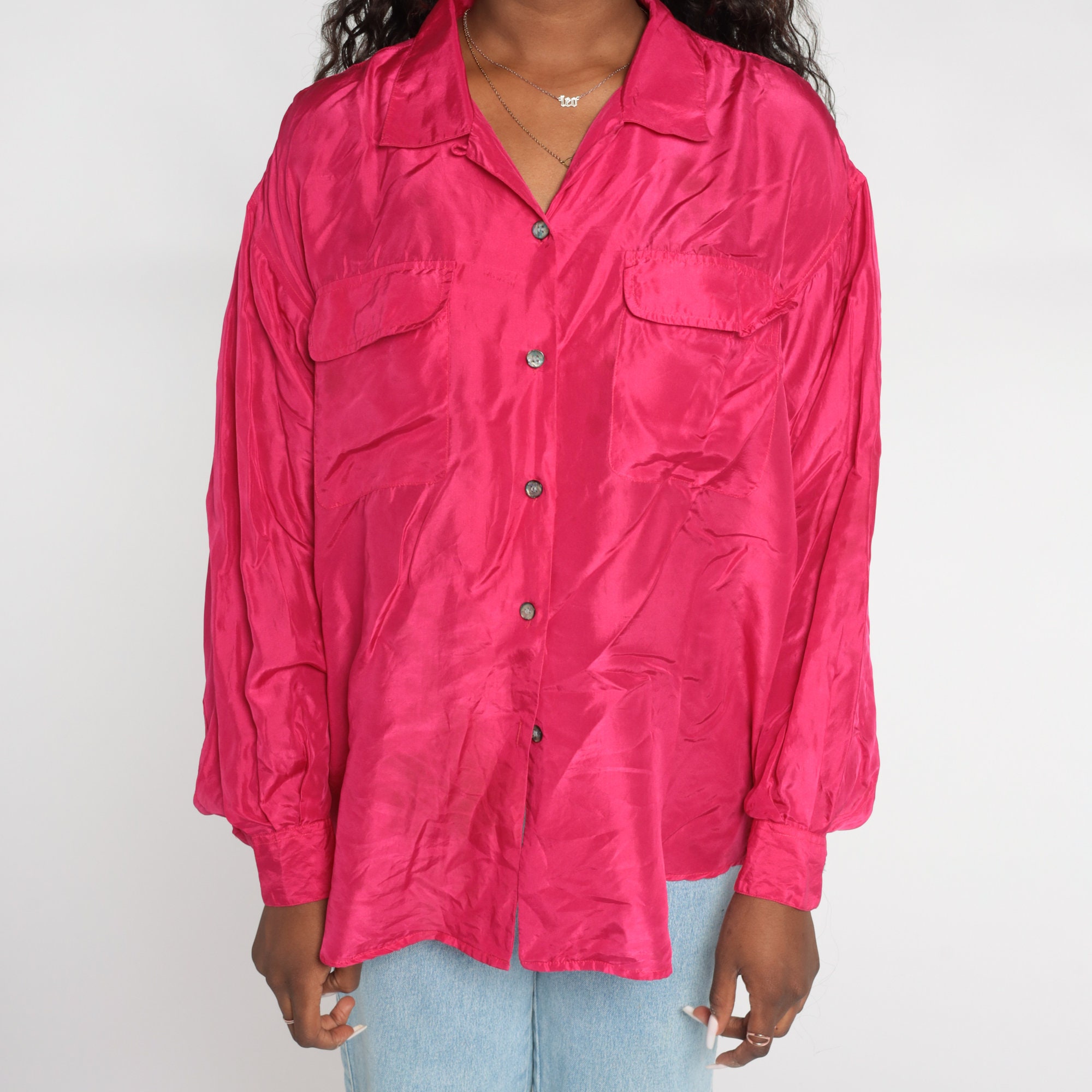Vintage 00s shirt in hot pink silk with long sleeves and buttons up the front.