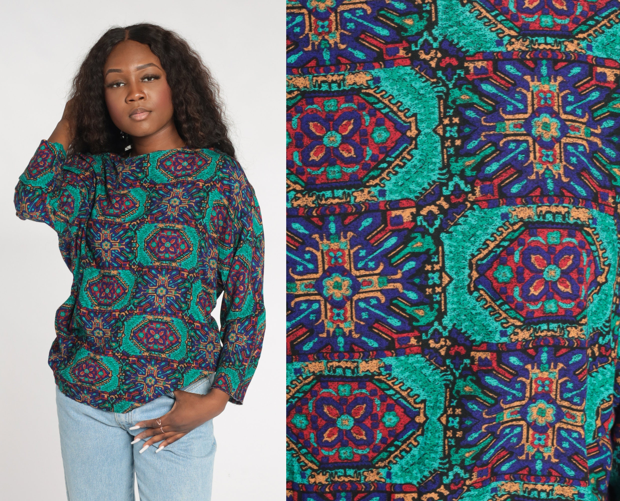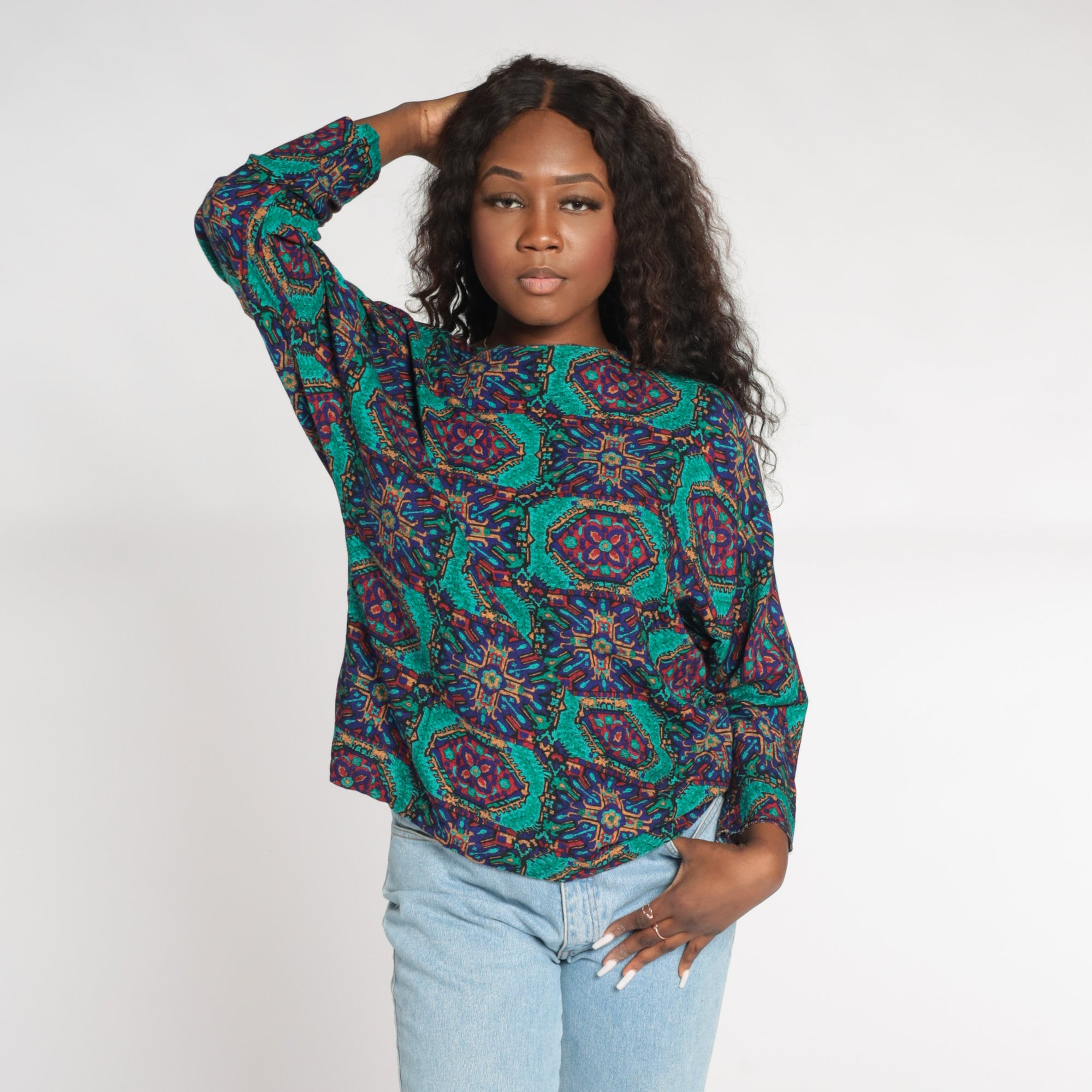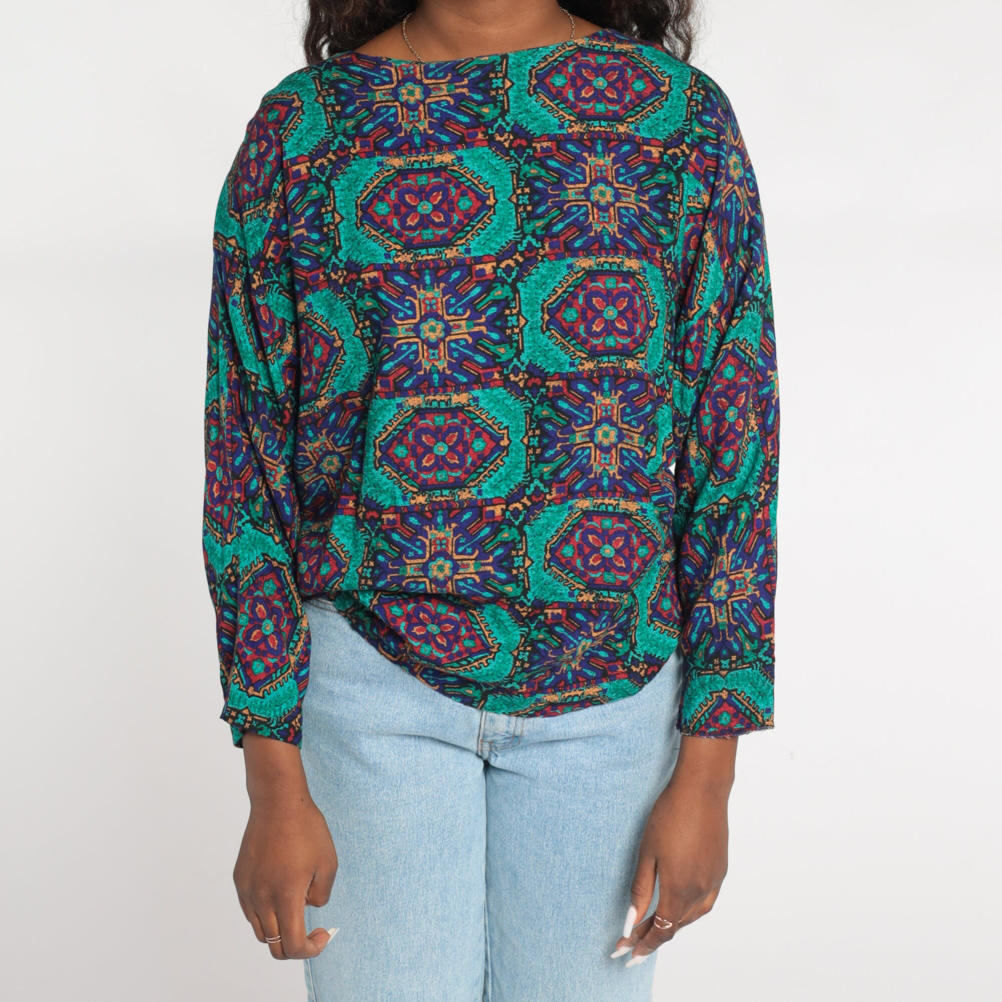 Vintage 90s shirt in a colorful Geometric tile print with long sleeves.
