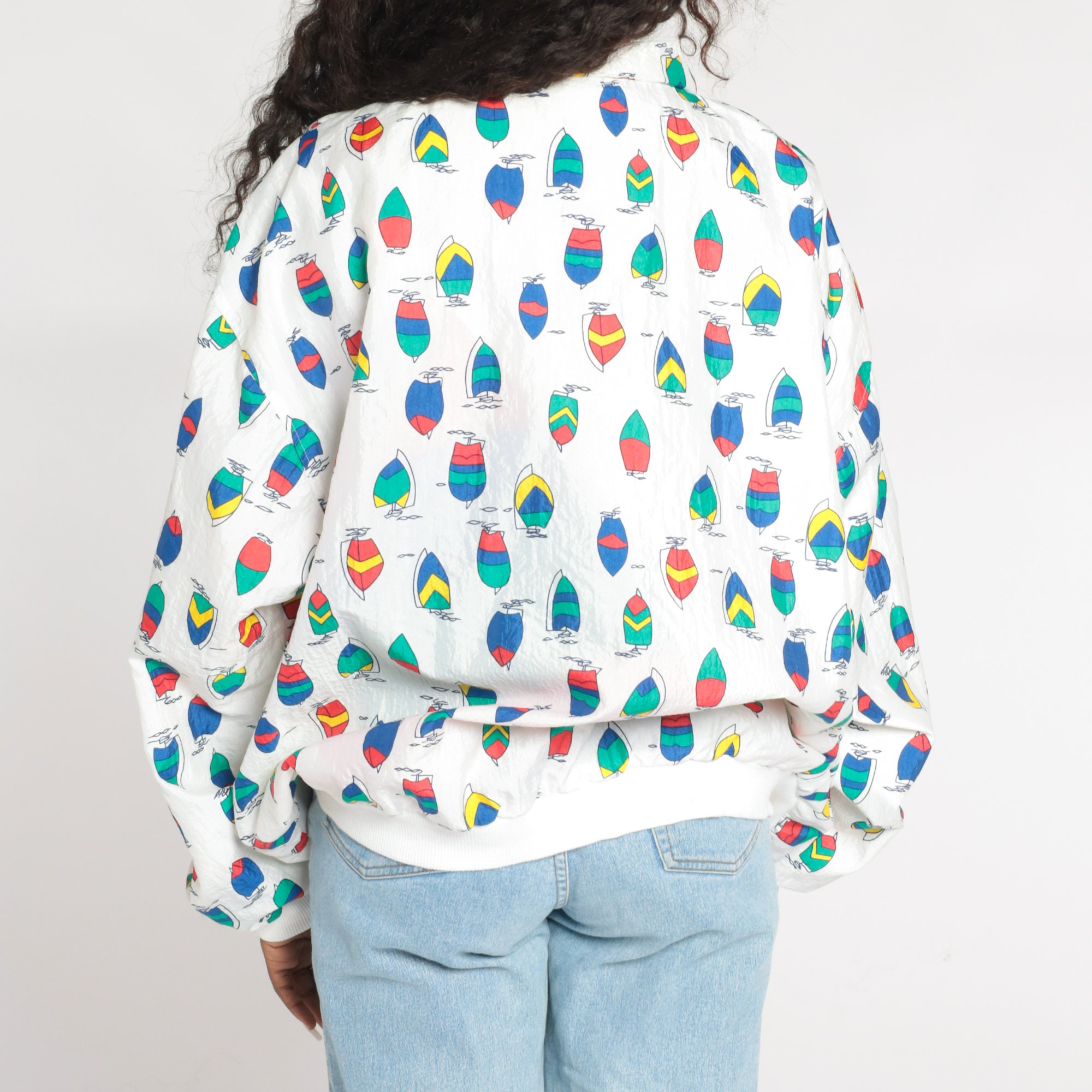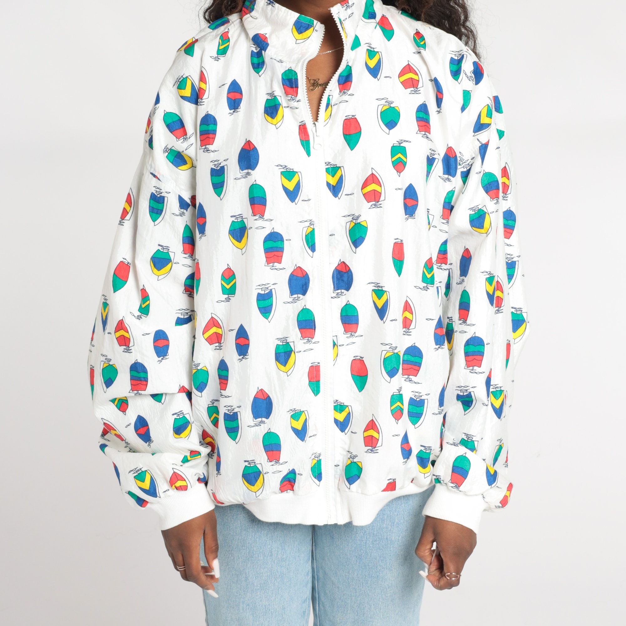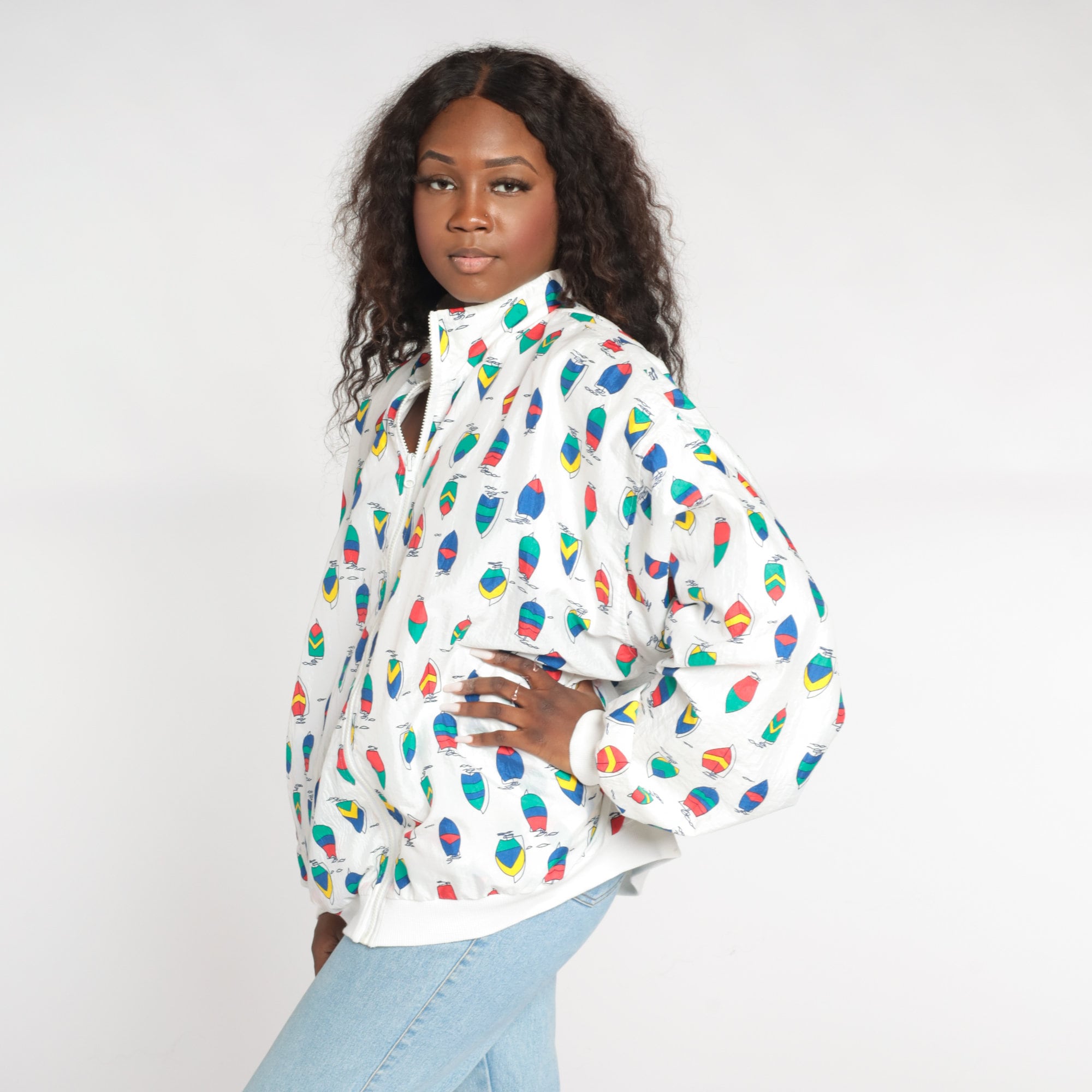 Vintage 90s windbreaker jacket in white nylon with a windsurfing print and a zipper up the front.