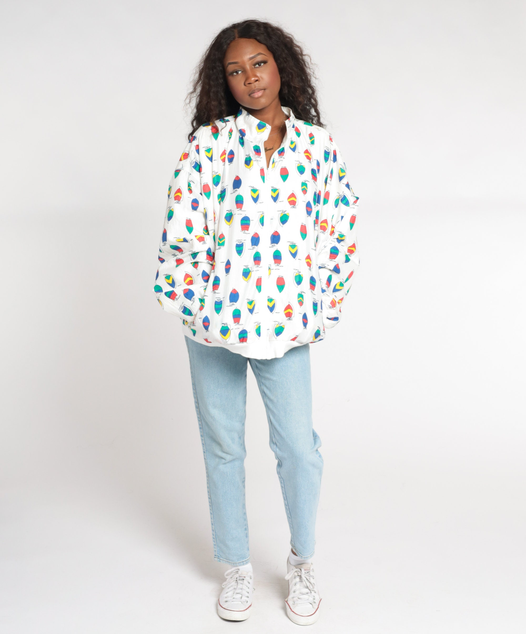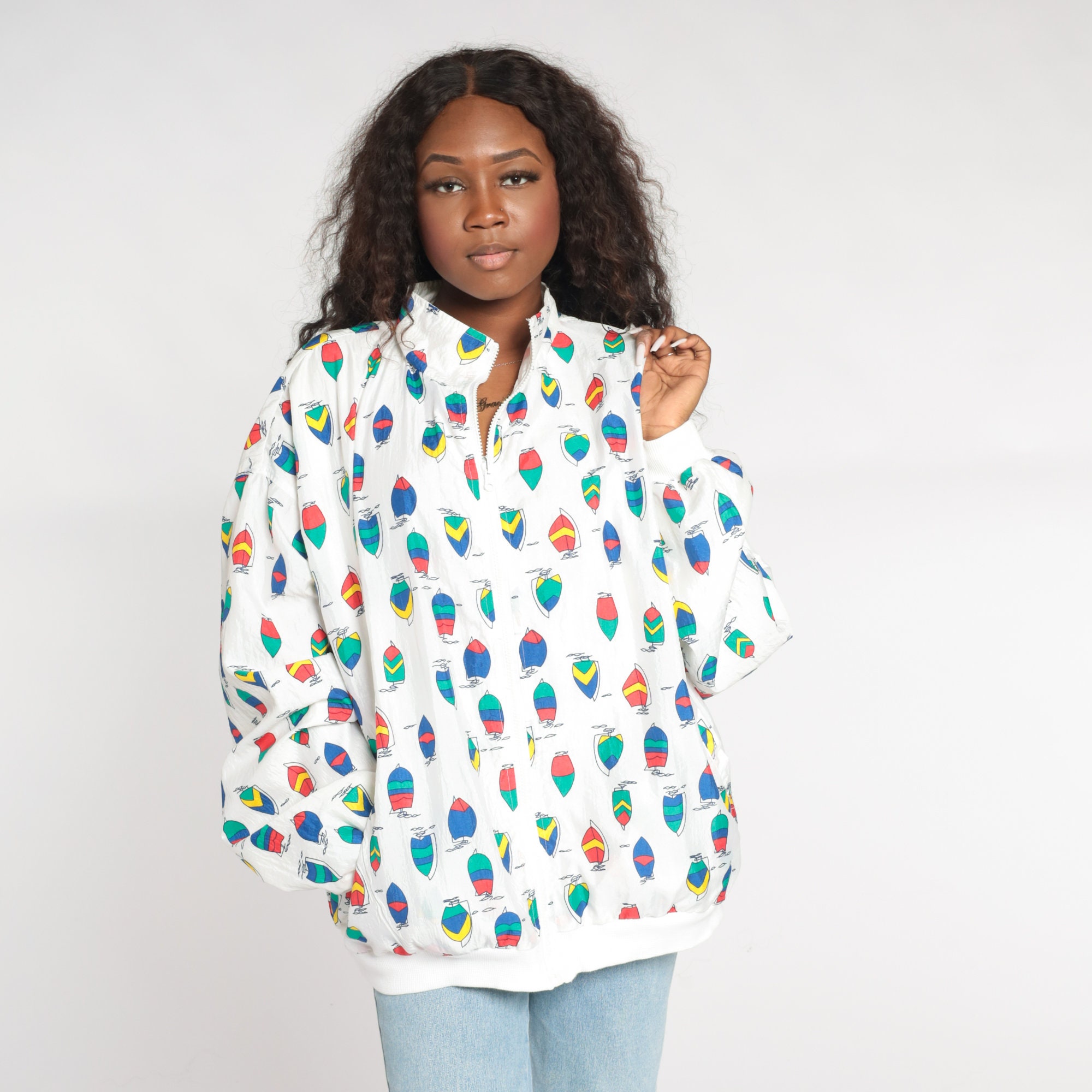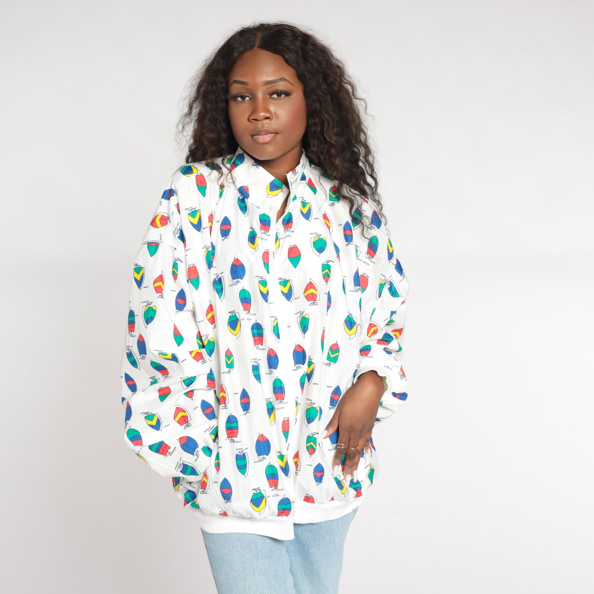 Vintage 90s windbreaker jacket in white nylon with a windsurfing print and a zipper up the front.