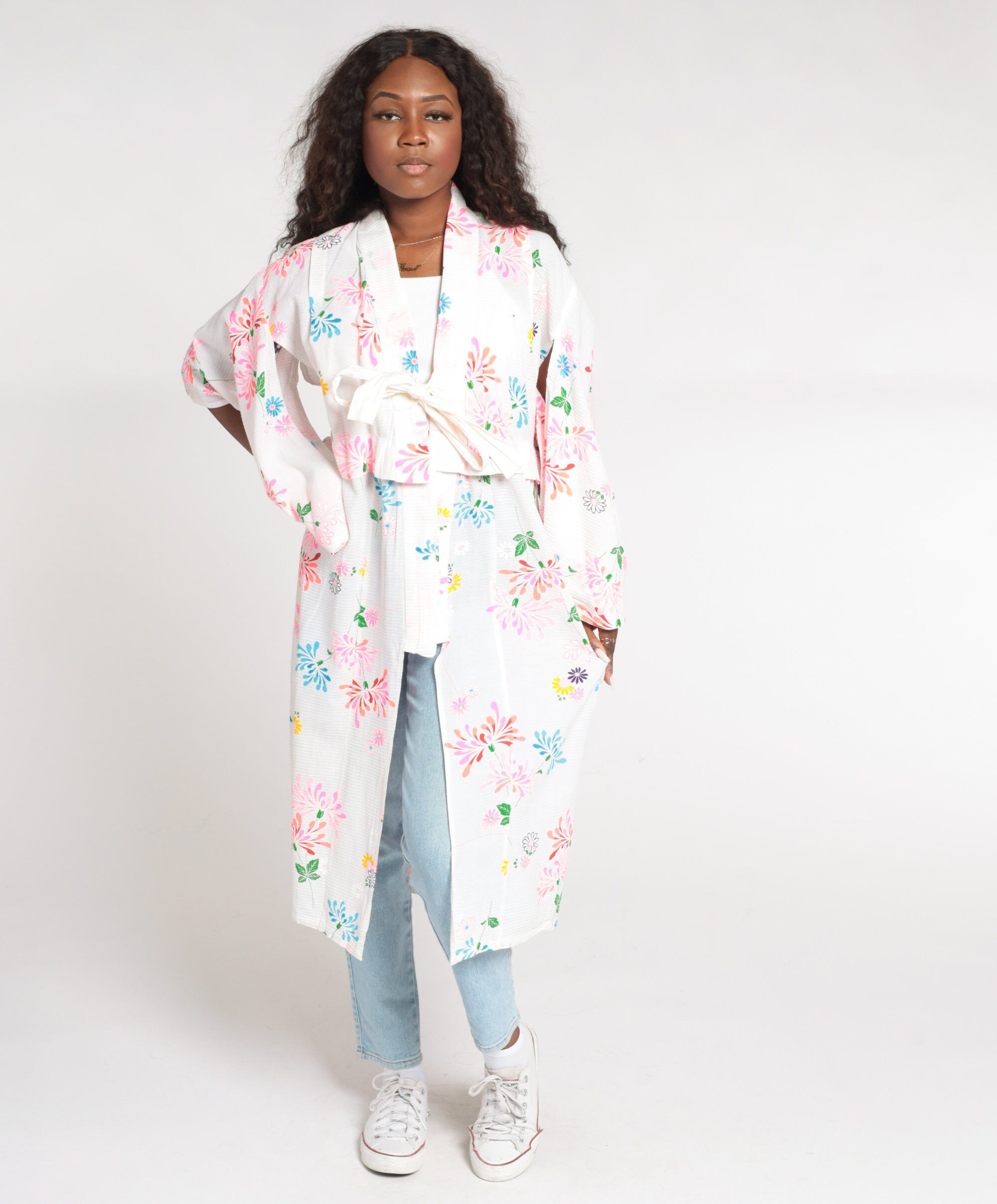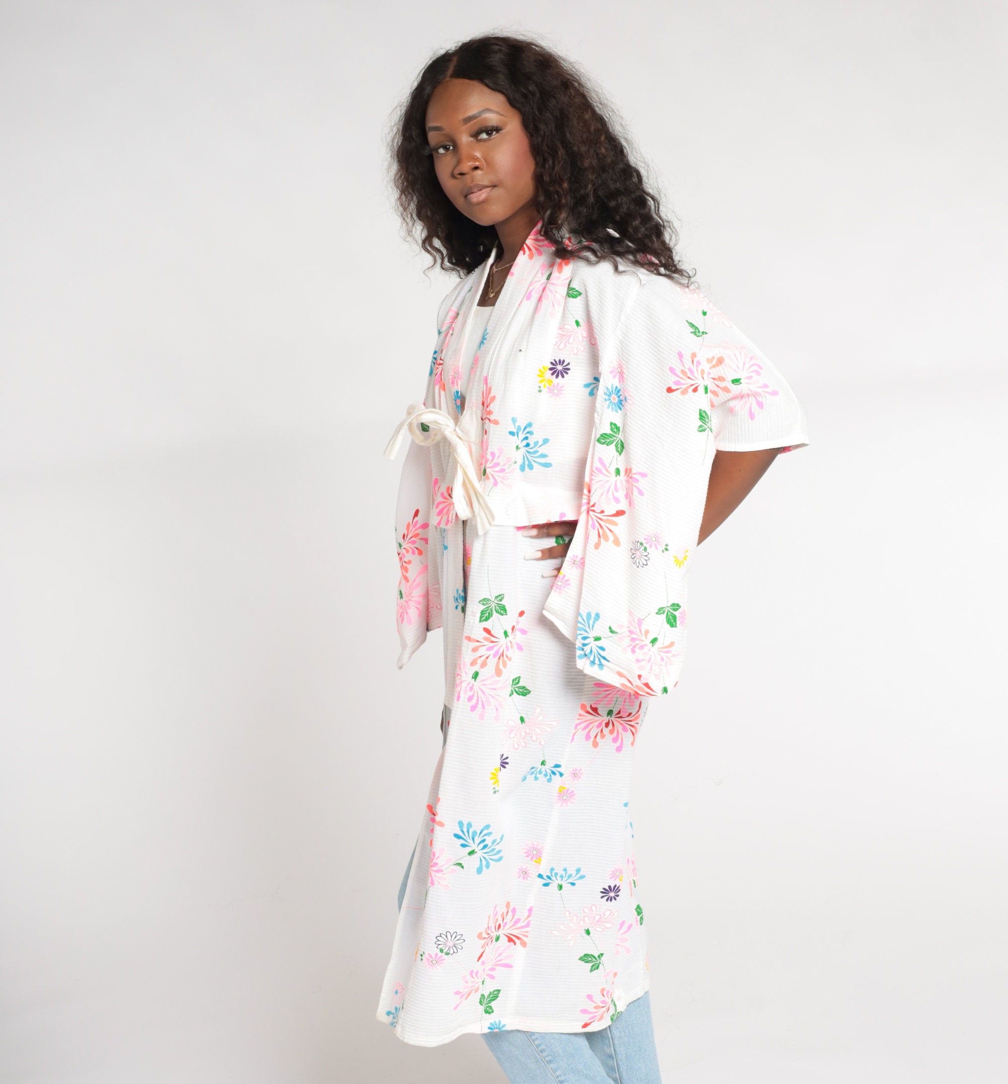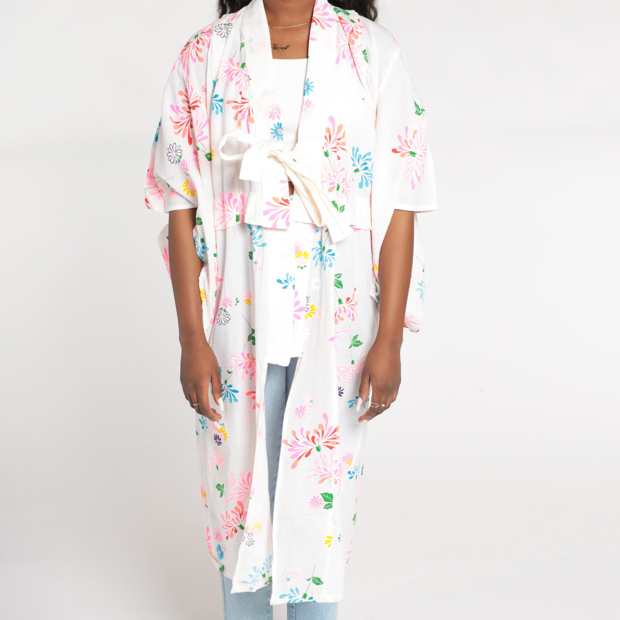 Vintage 90s kimono robe in Semi-Sheer white with a floral print. Midi length with kimono sleeves and a tie in the front.