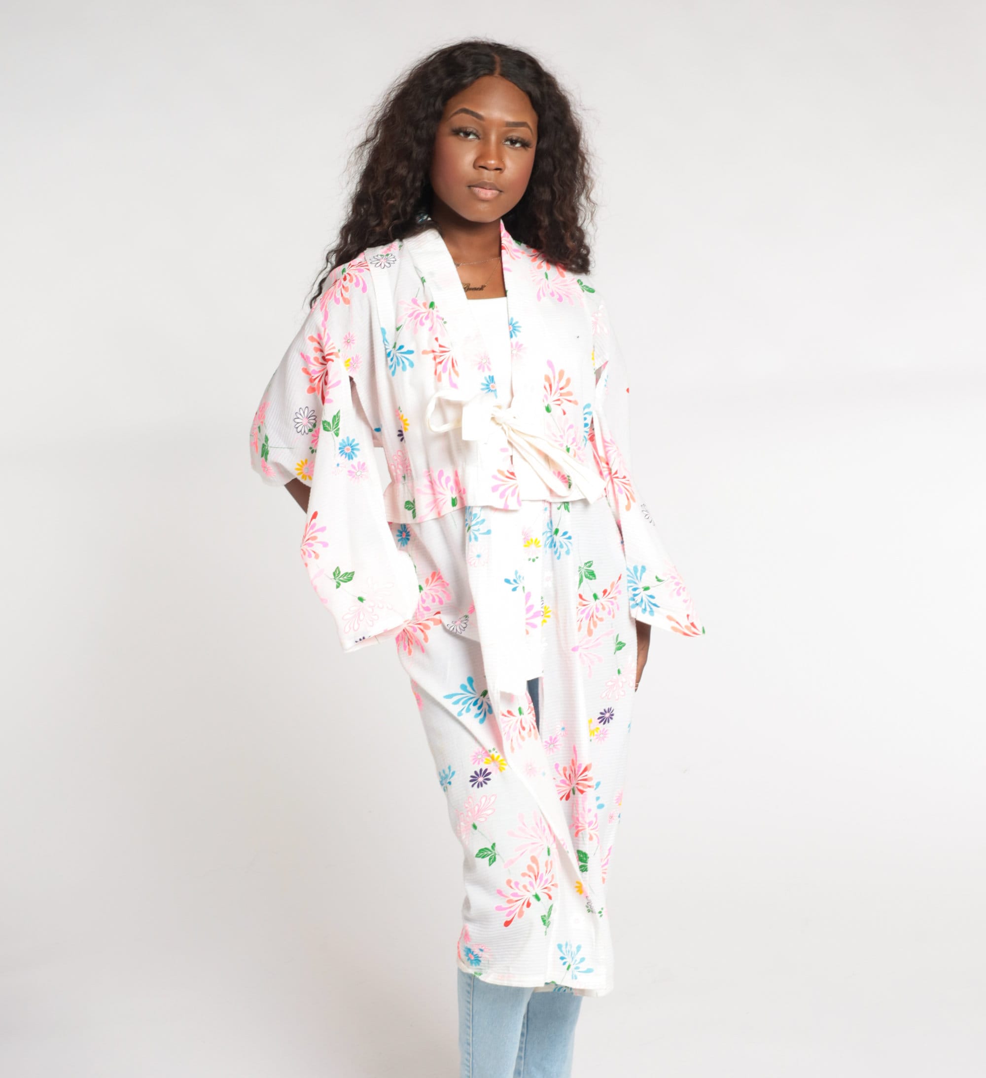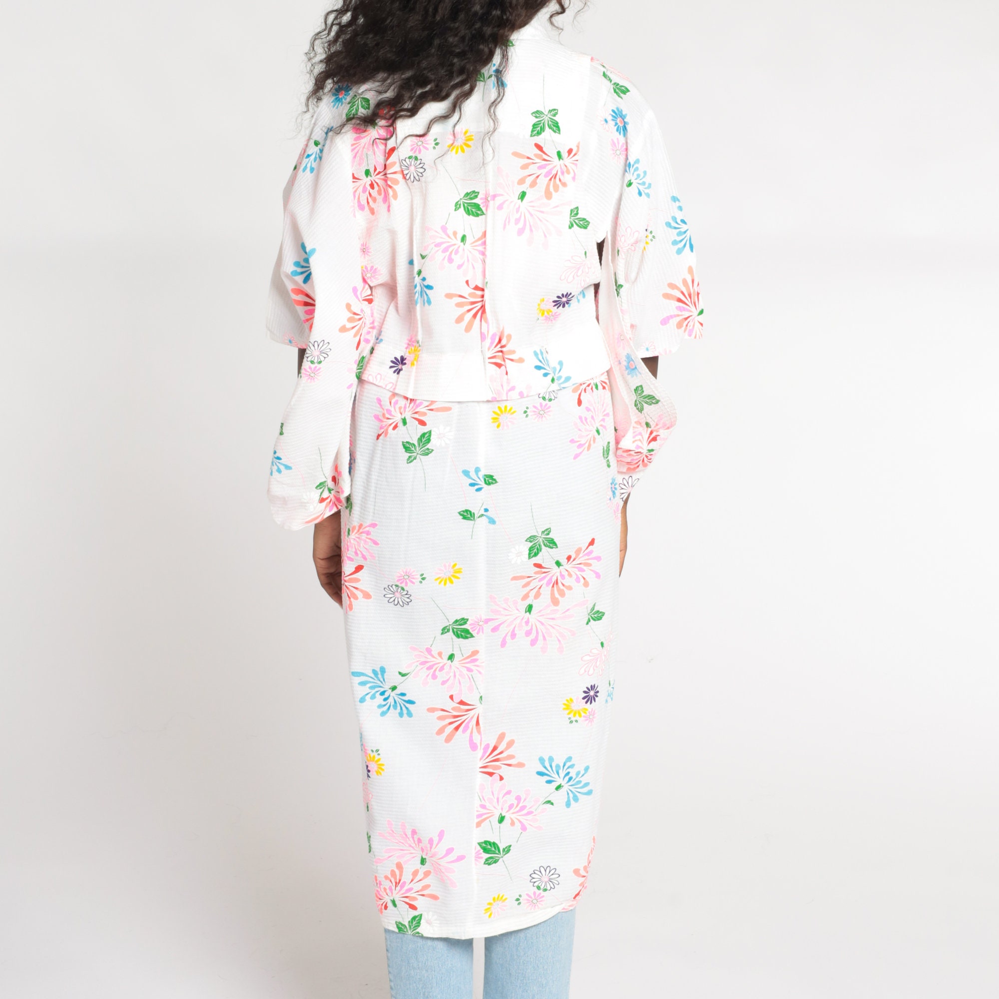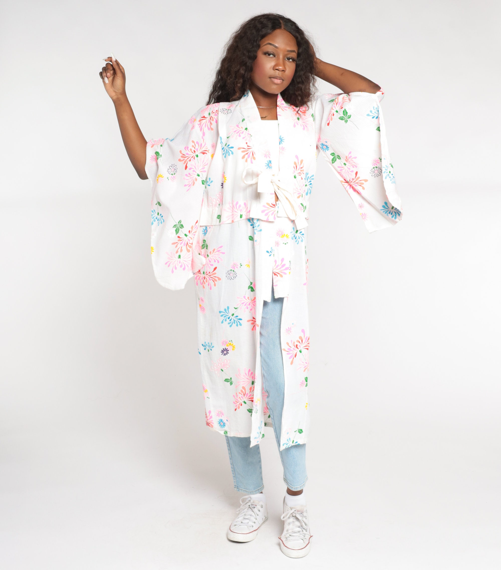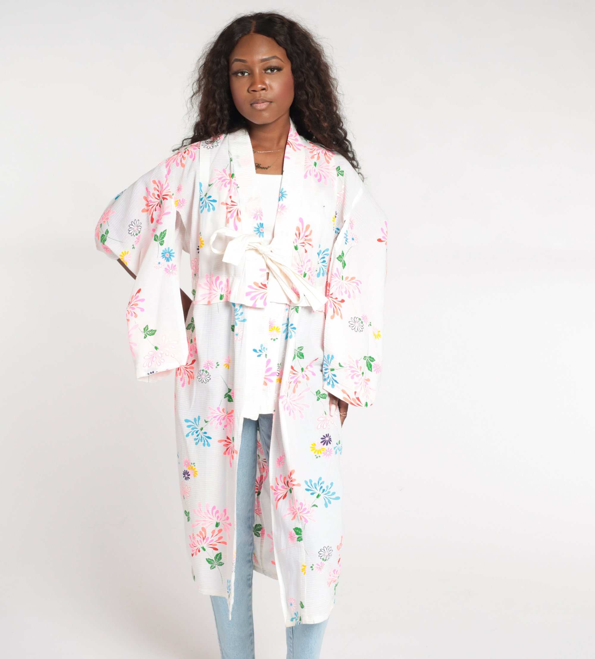 Vintage 90s kimono robe in Semi-Sheer white with a floral print. Midi length with kimono sleeves and a tie in the front.