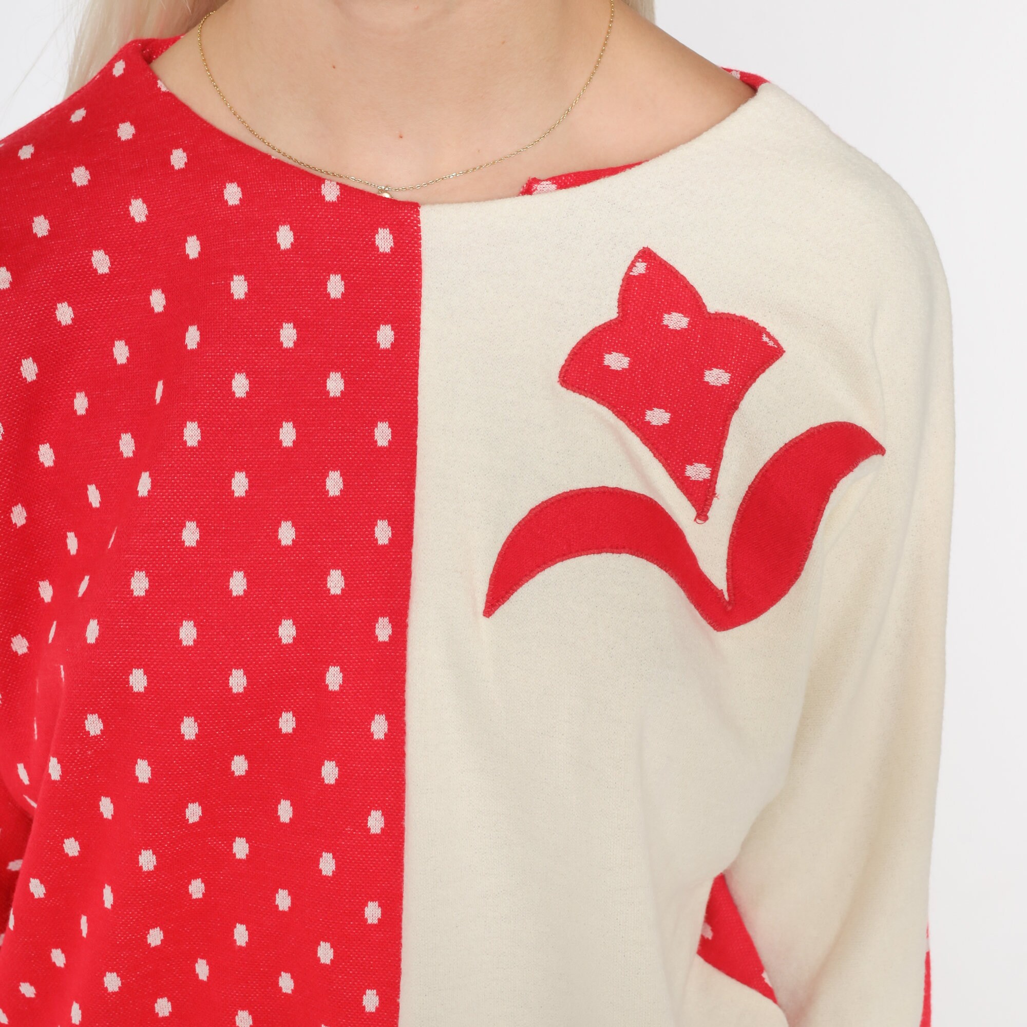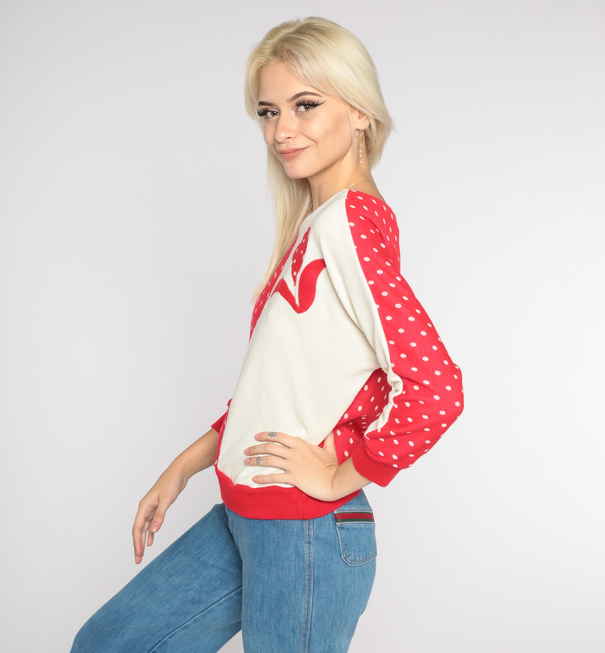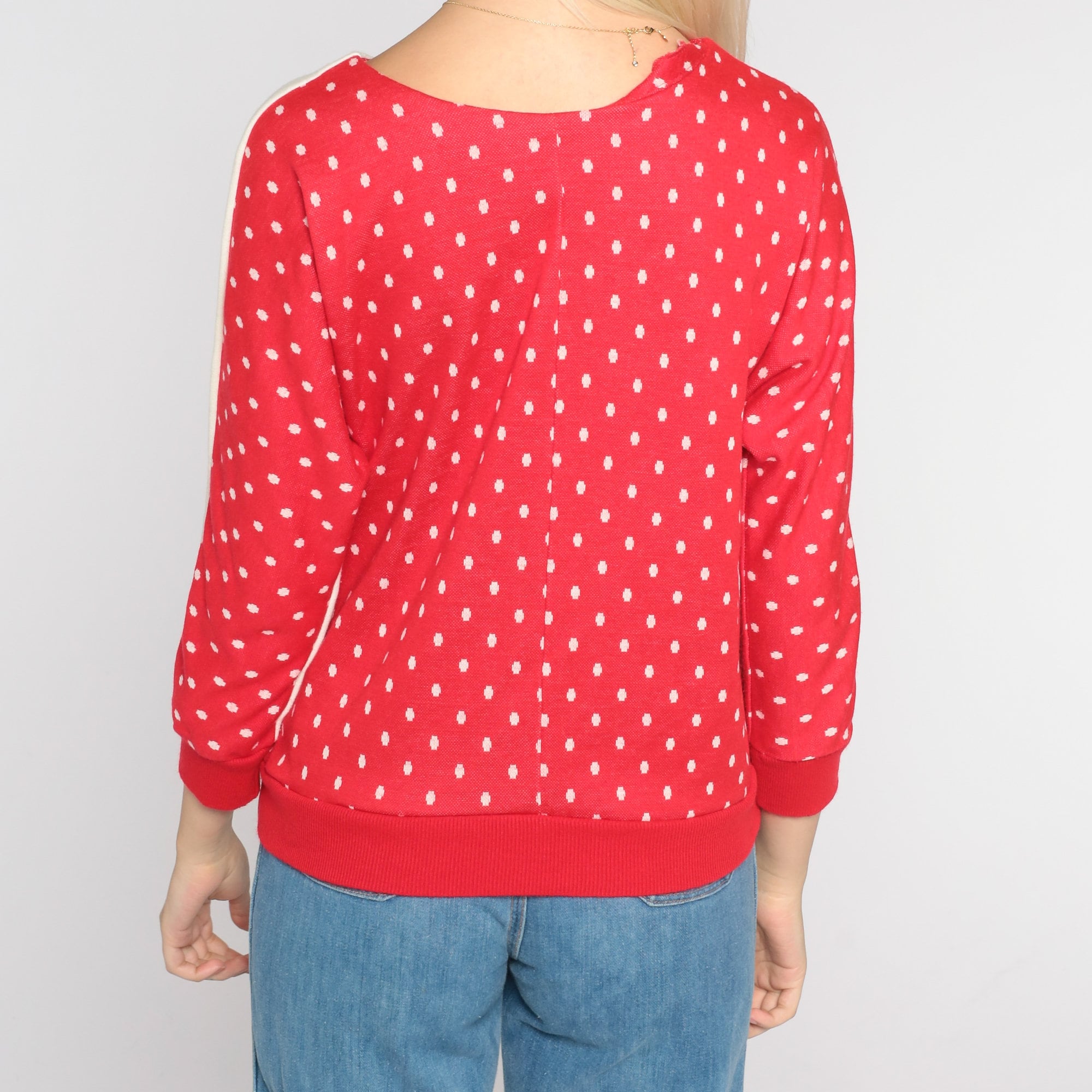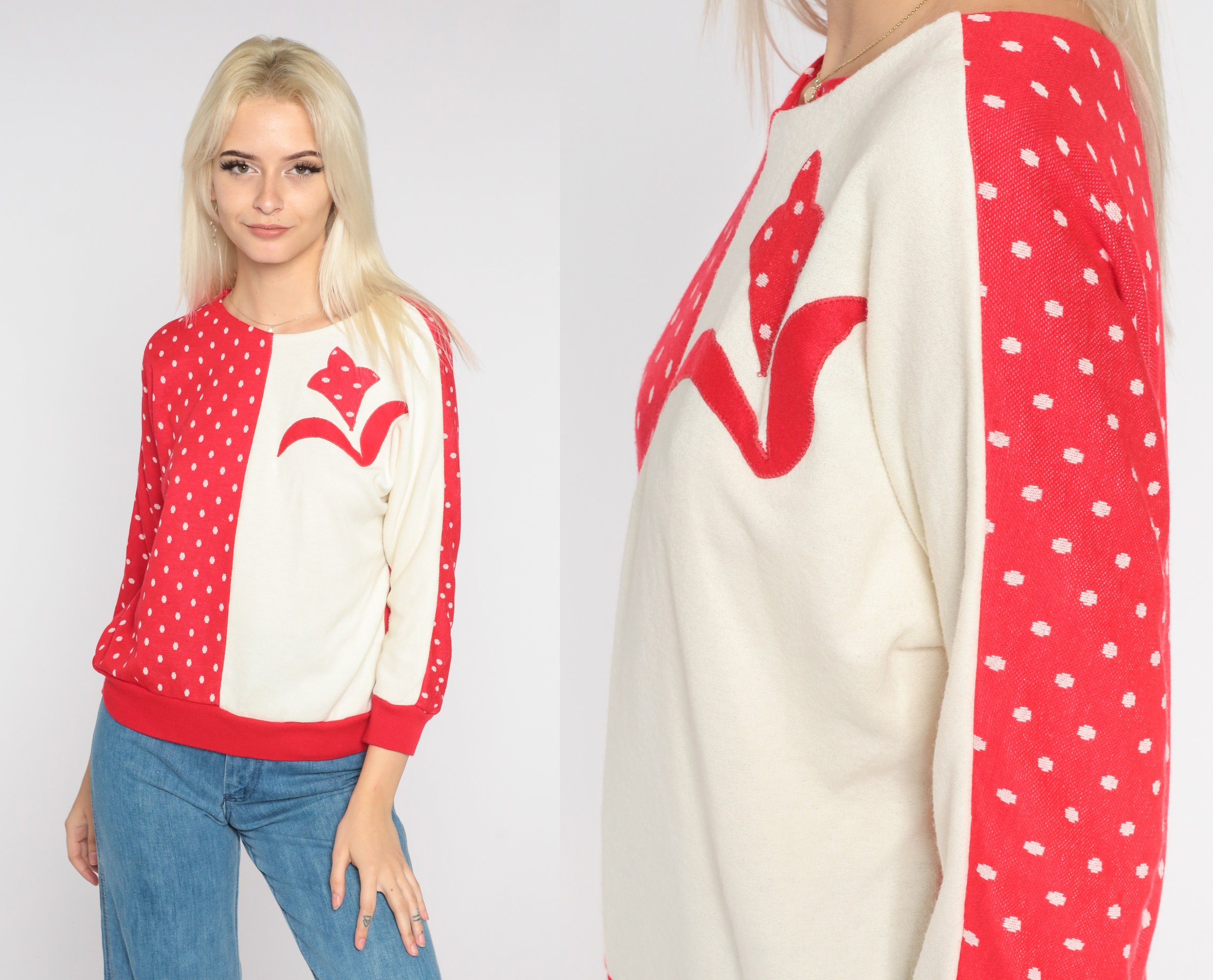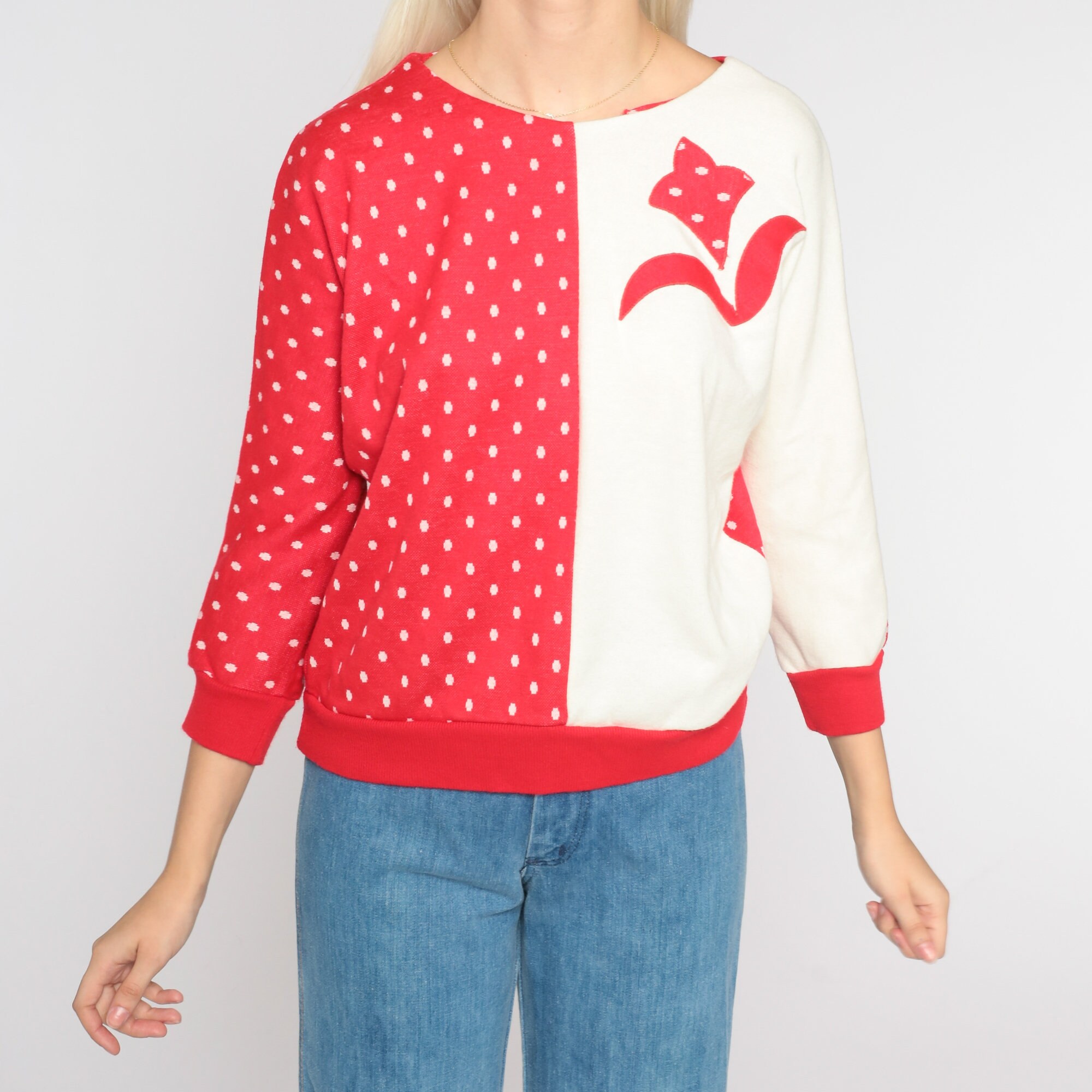 Vintage 80s sweatshirt in red and white polka dot knit with a cream panel and a flower applique. Pullover style with long sleeves and a banded hem.