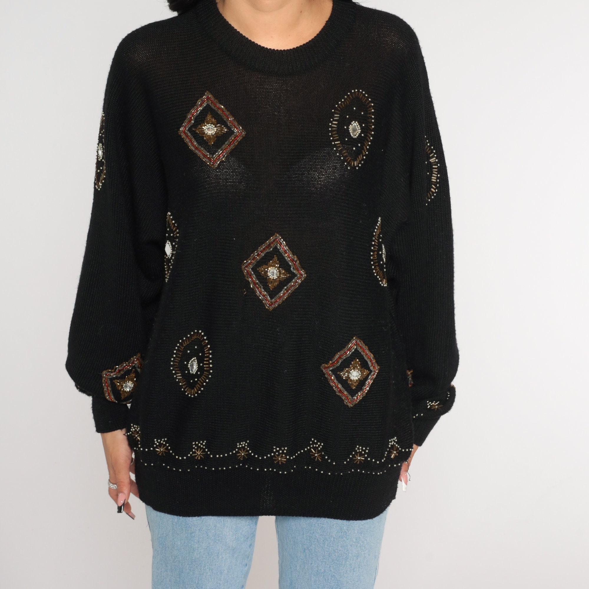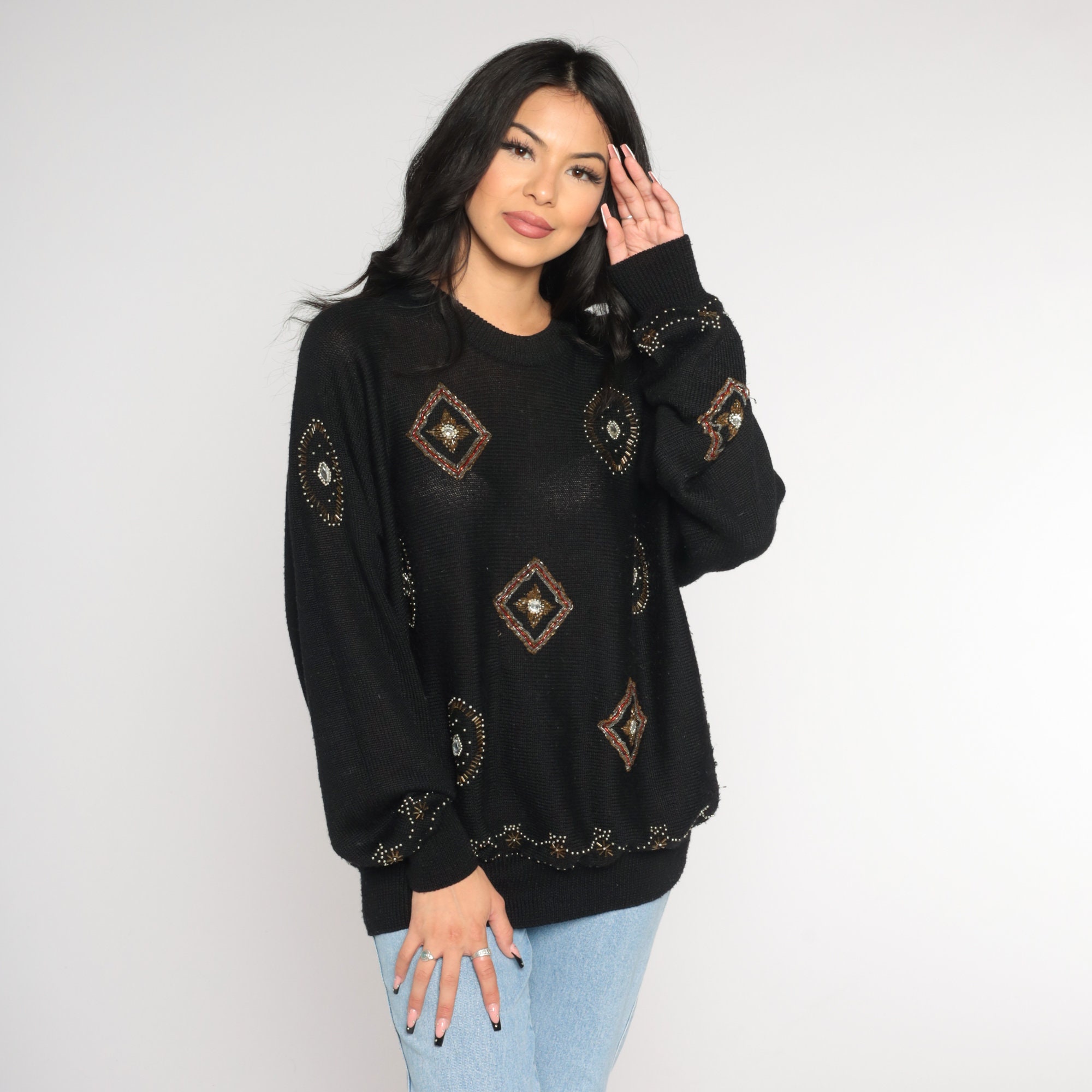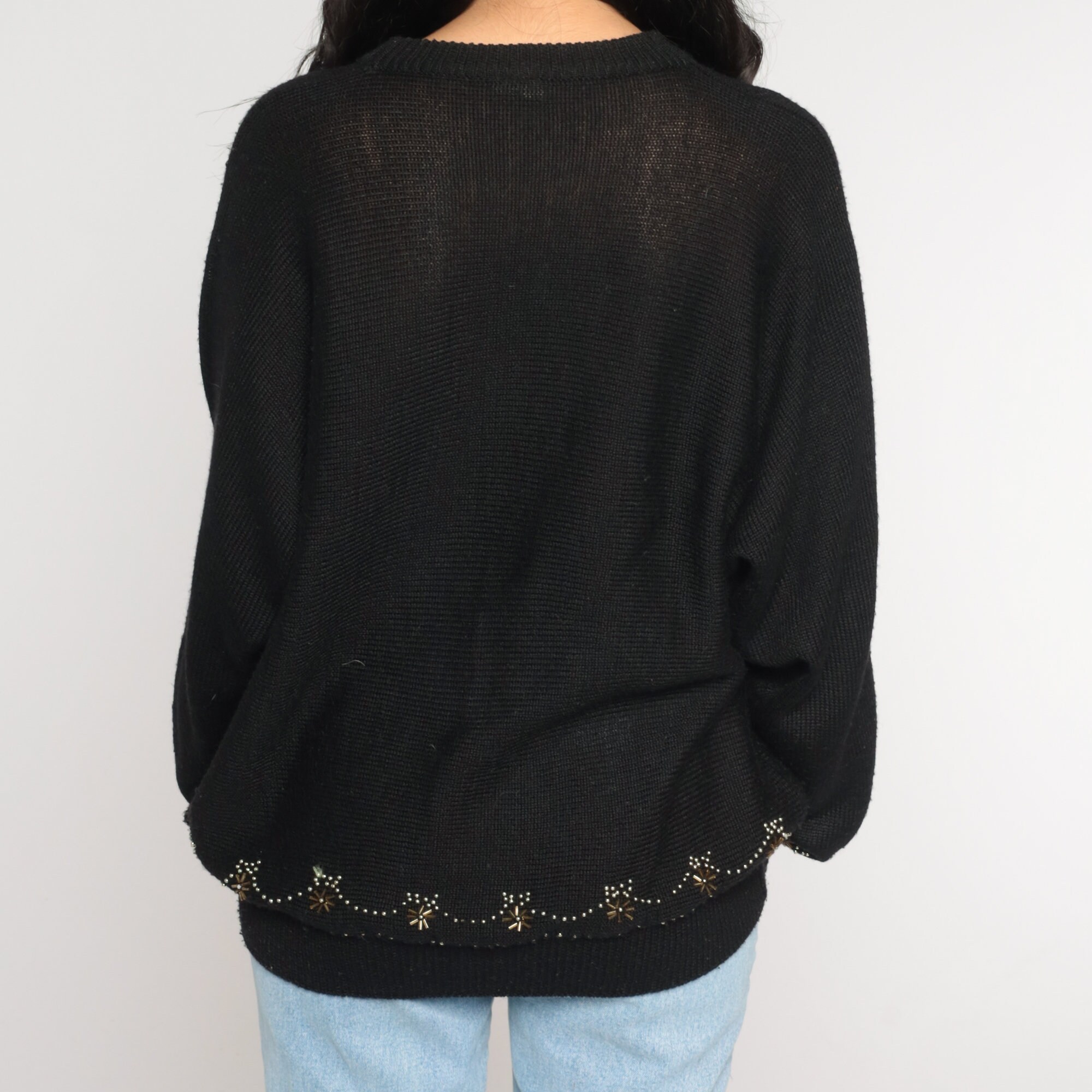 Vintage 90s sweater in semi sheer black knit with beading.
