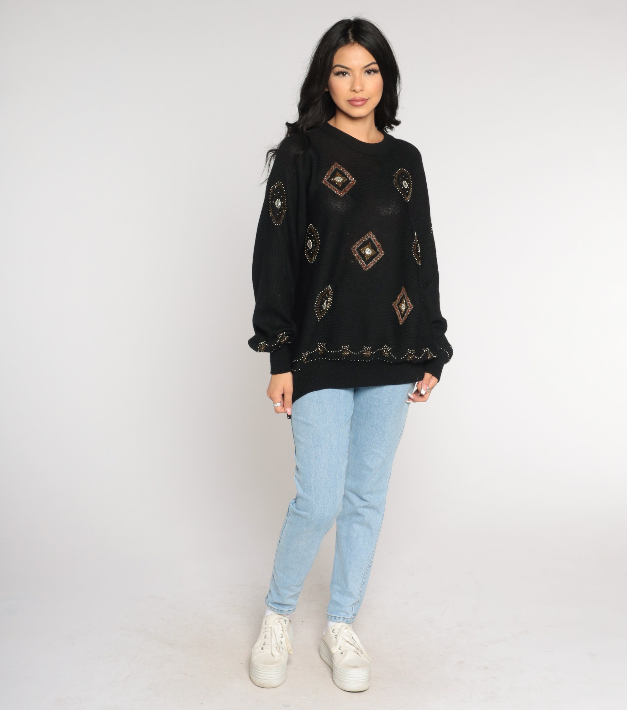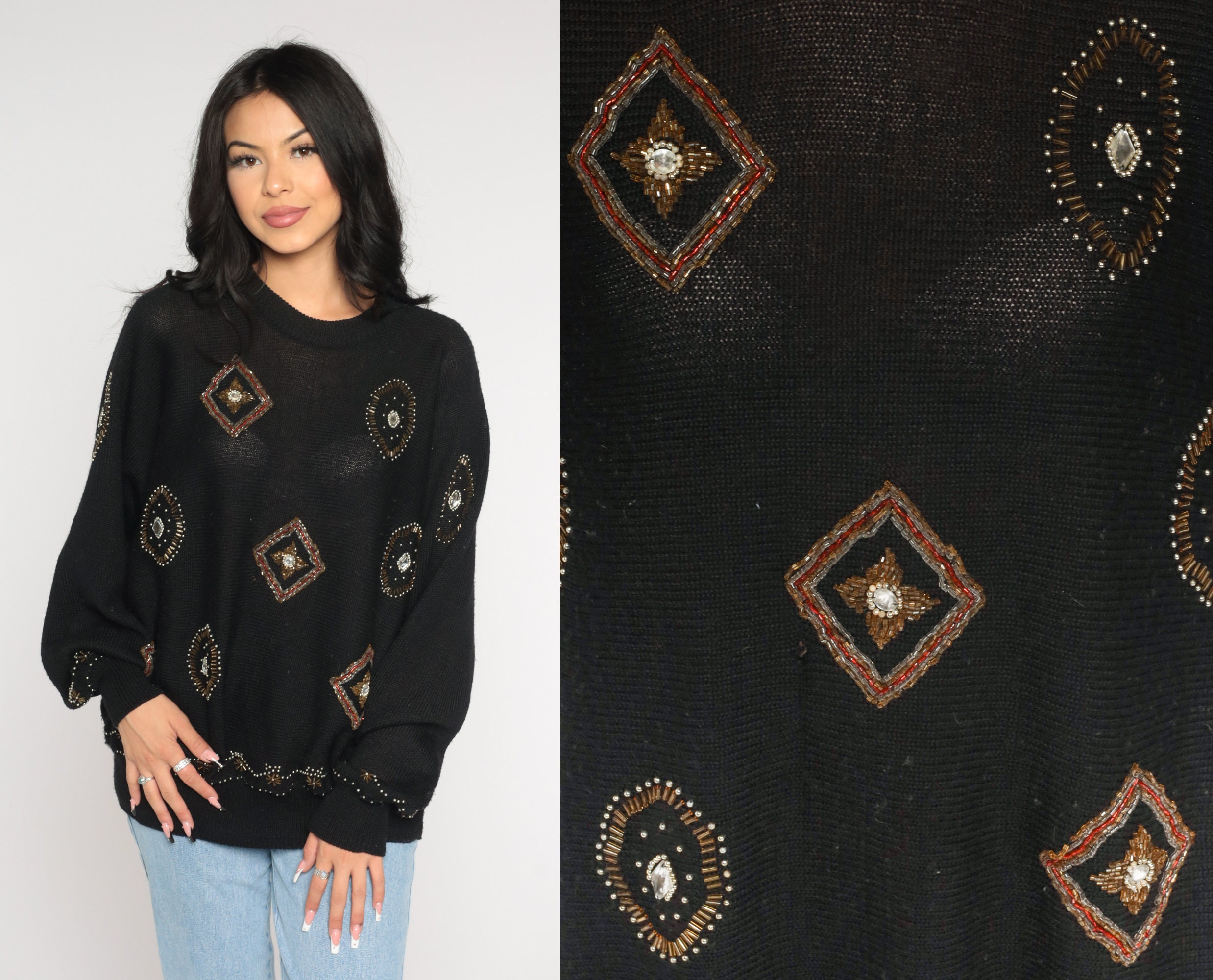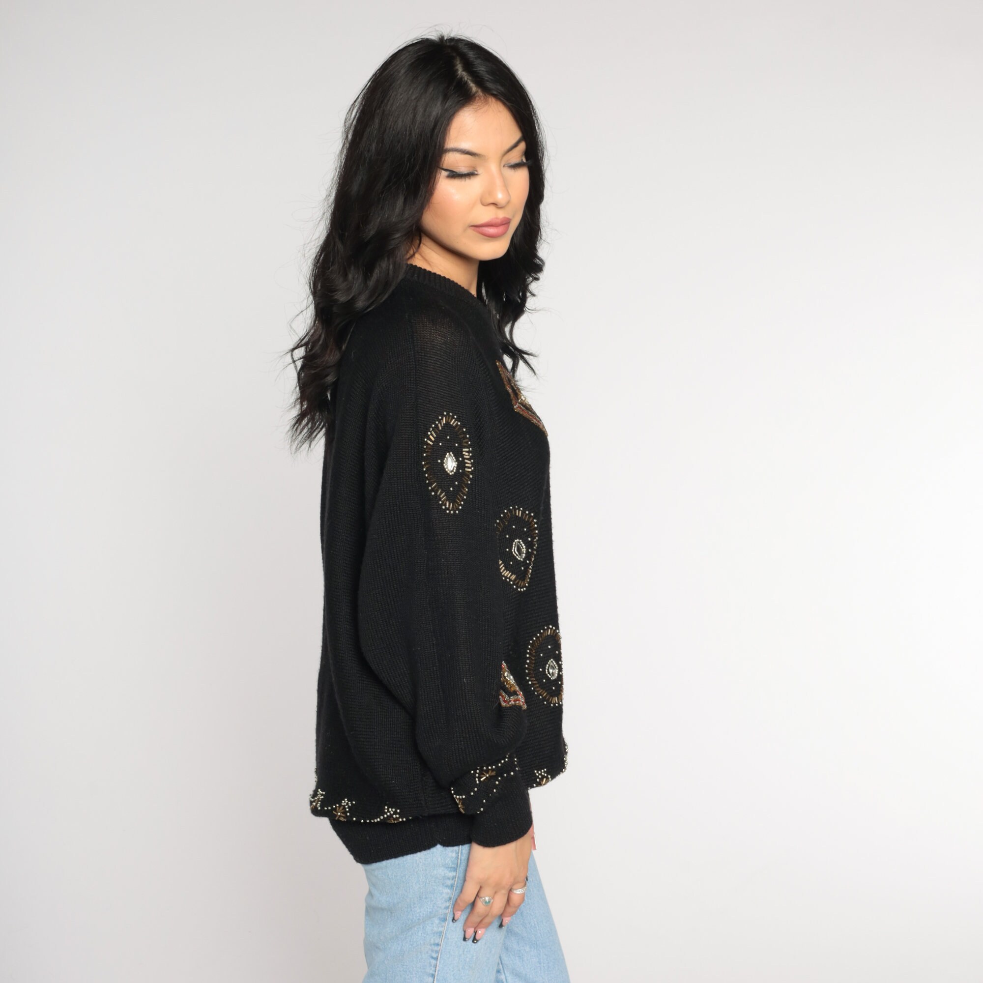 Vintage 90s sweater in semi sheer black knit with beading.