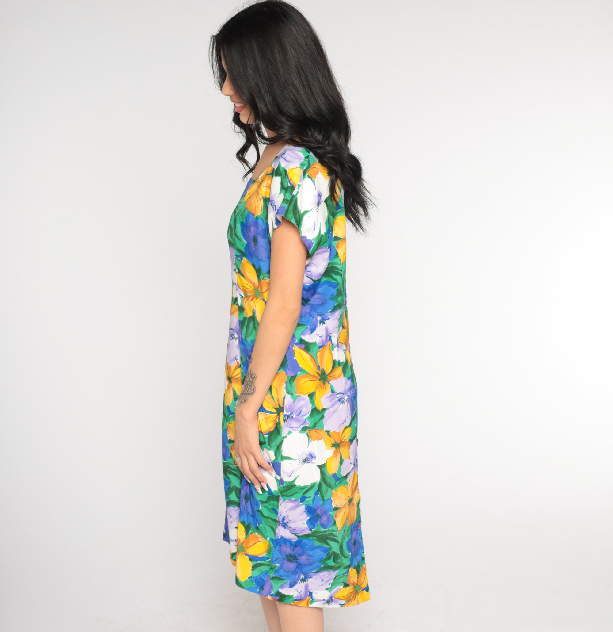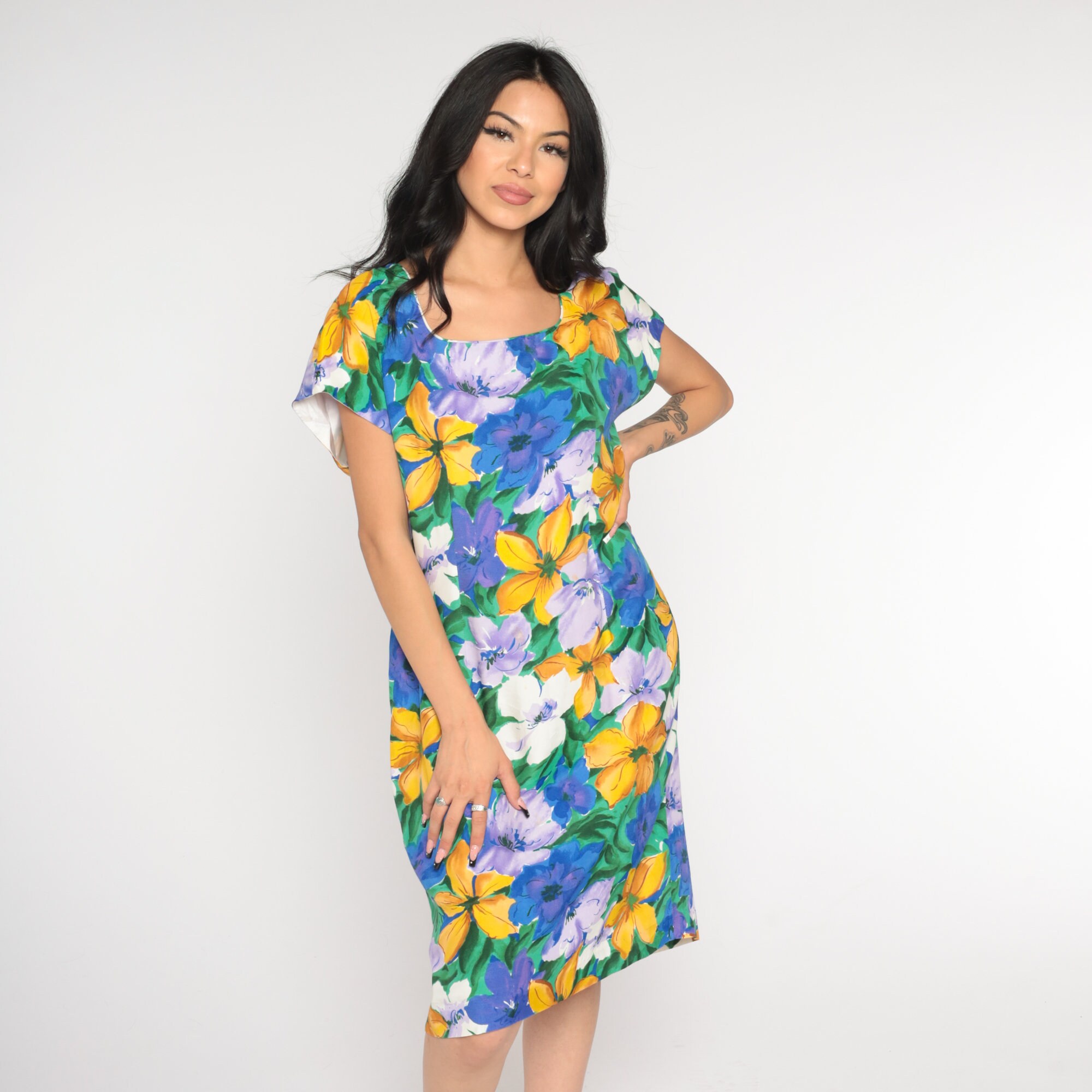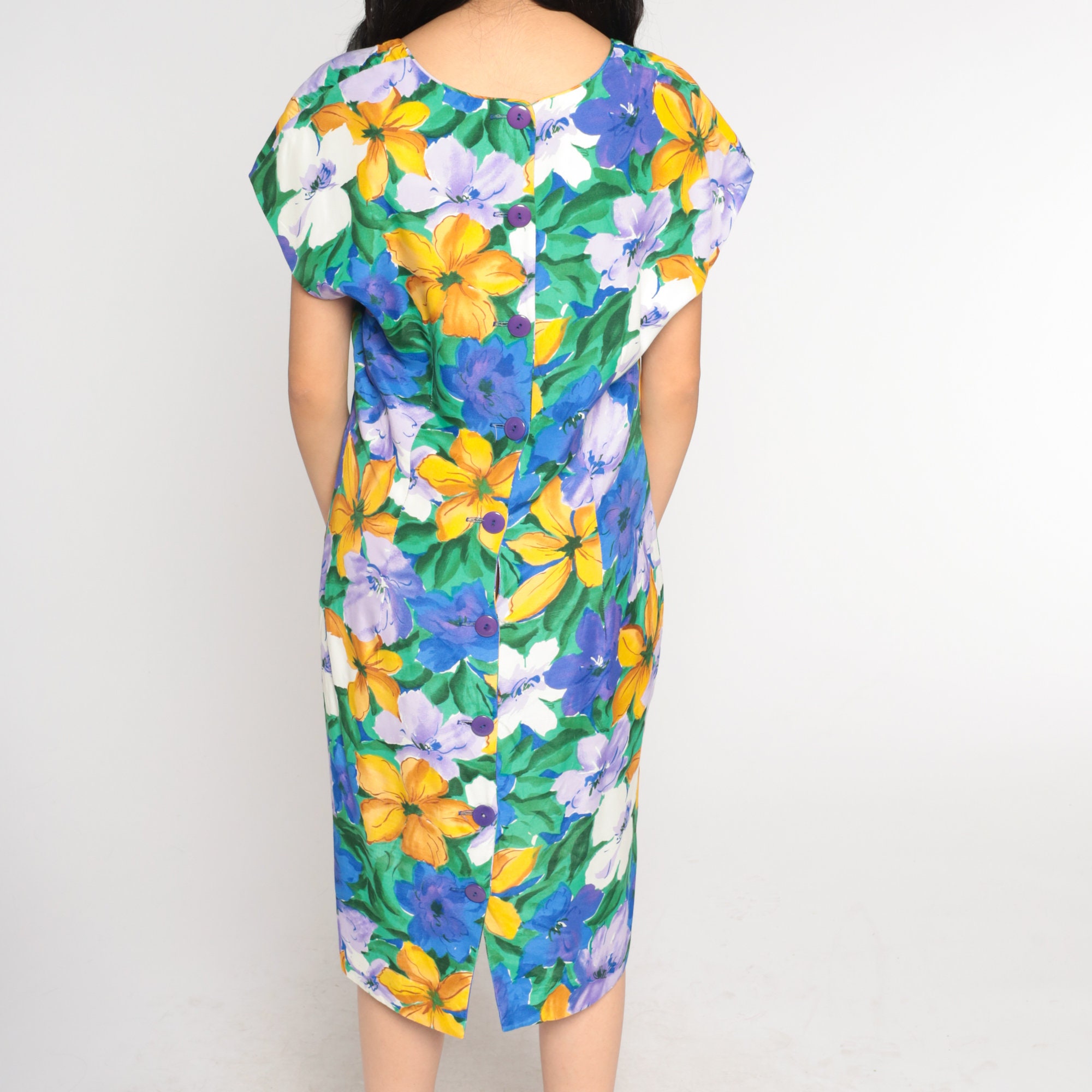 Vintage 90s dress in a floral print with short sleeves and a sheath cut. Knee length with buttons up the back.