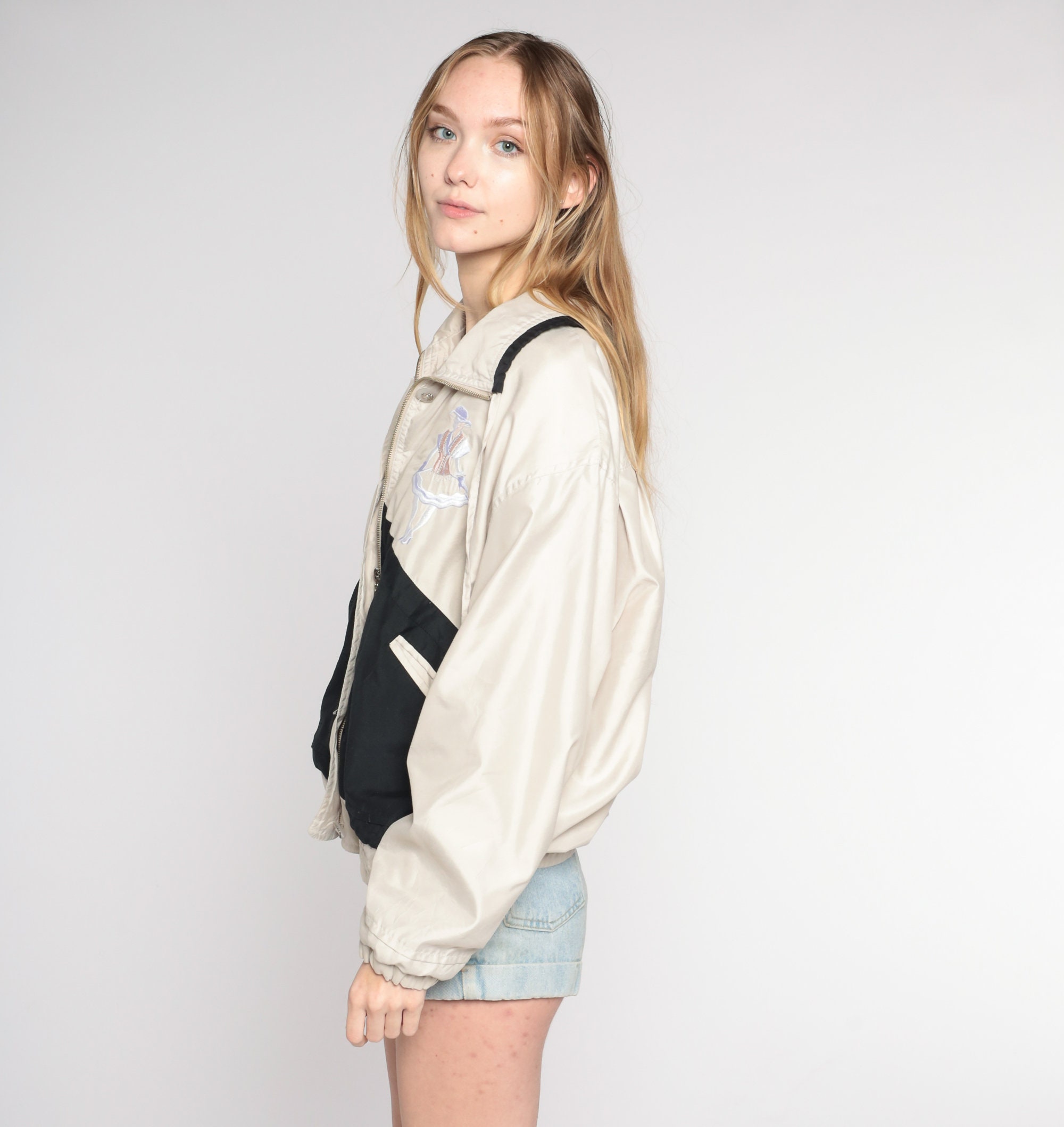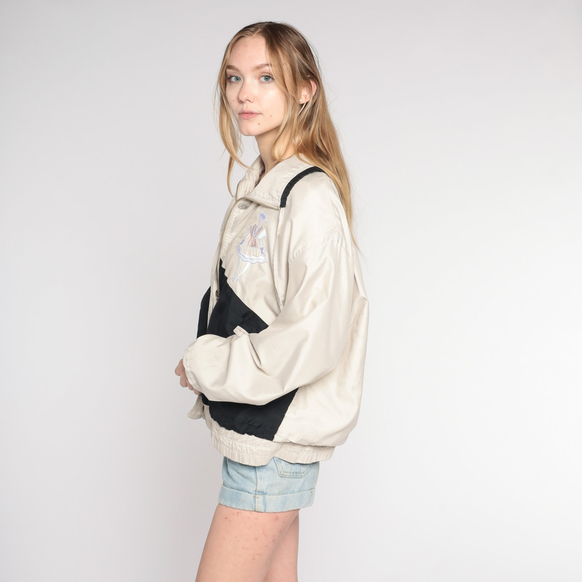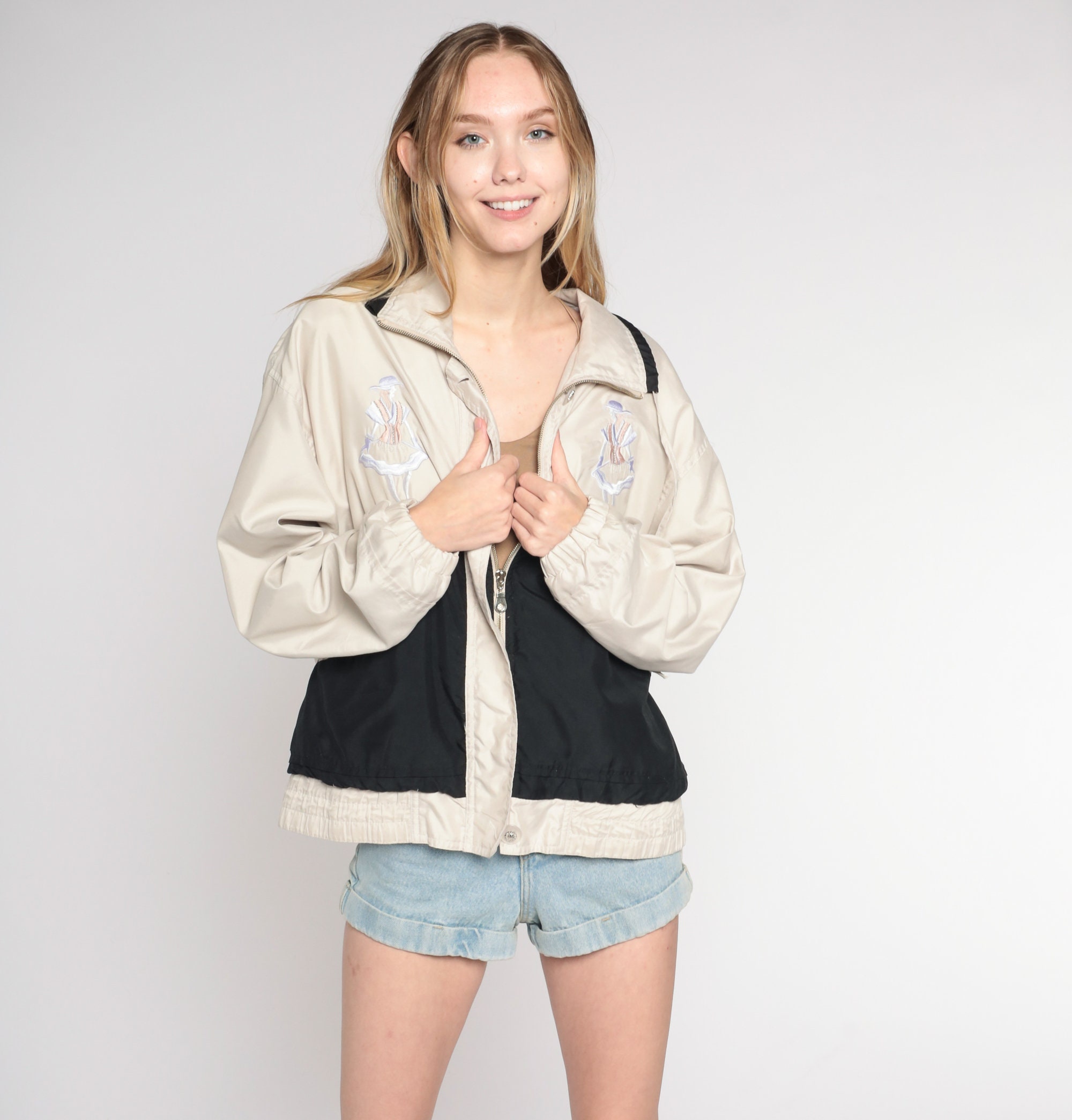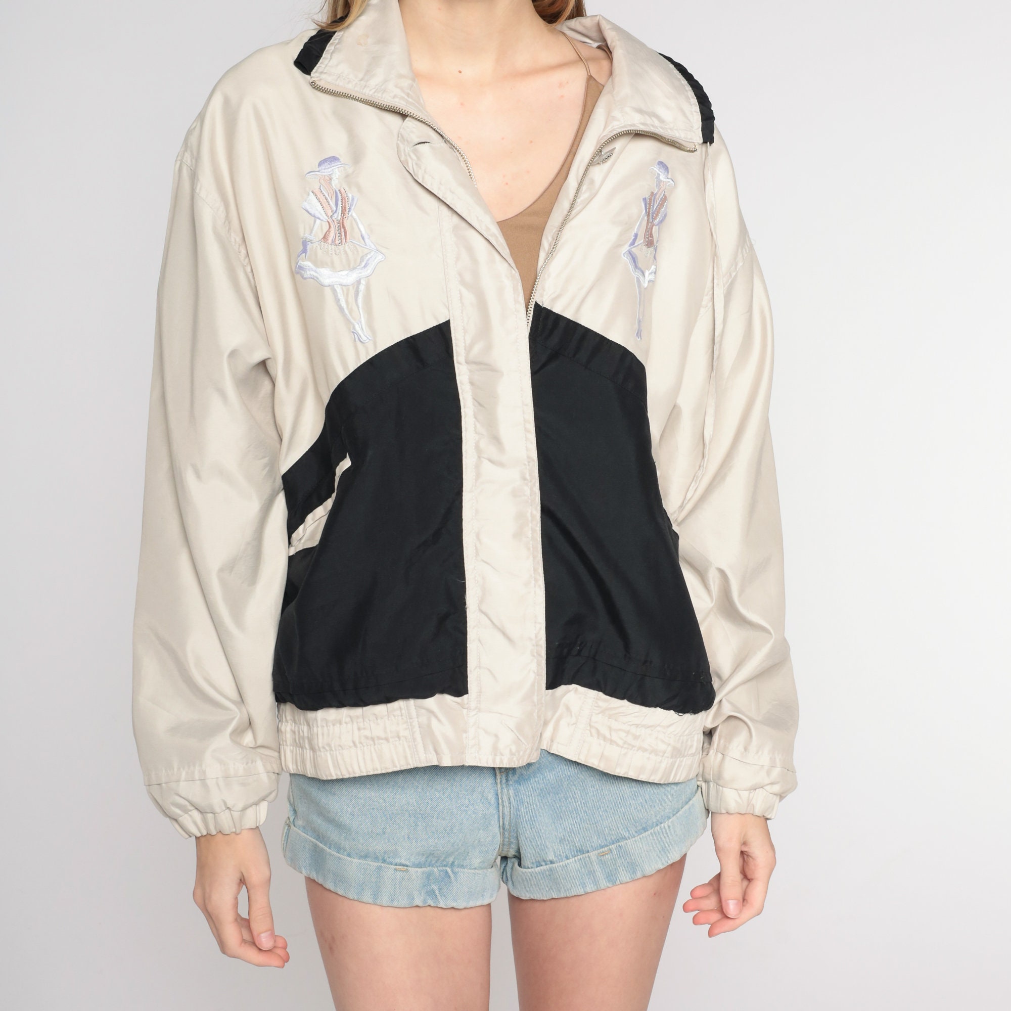Vintage 00s windbreaker jacket in beige and black color blocking with embroidered ladies on the chest and a zipper up the front.