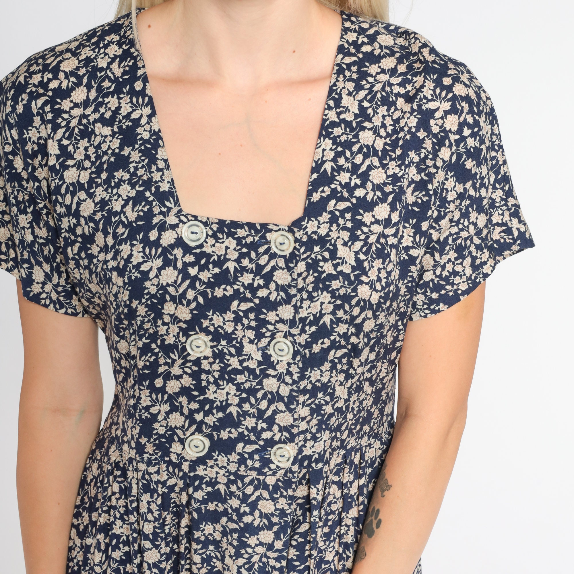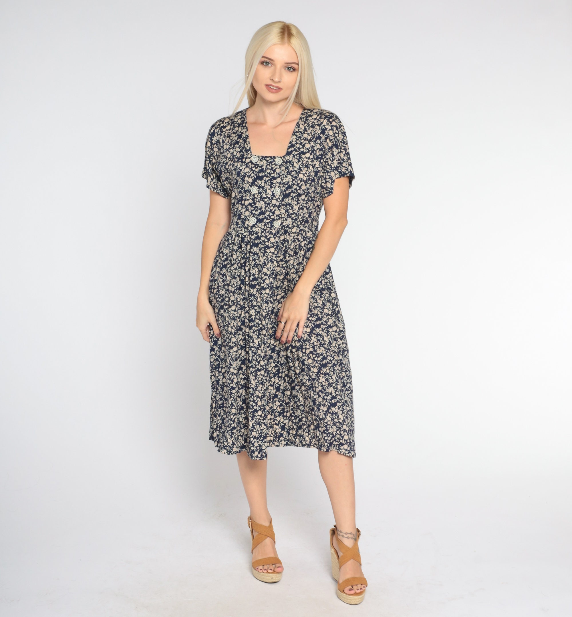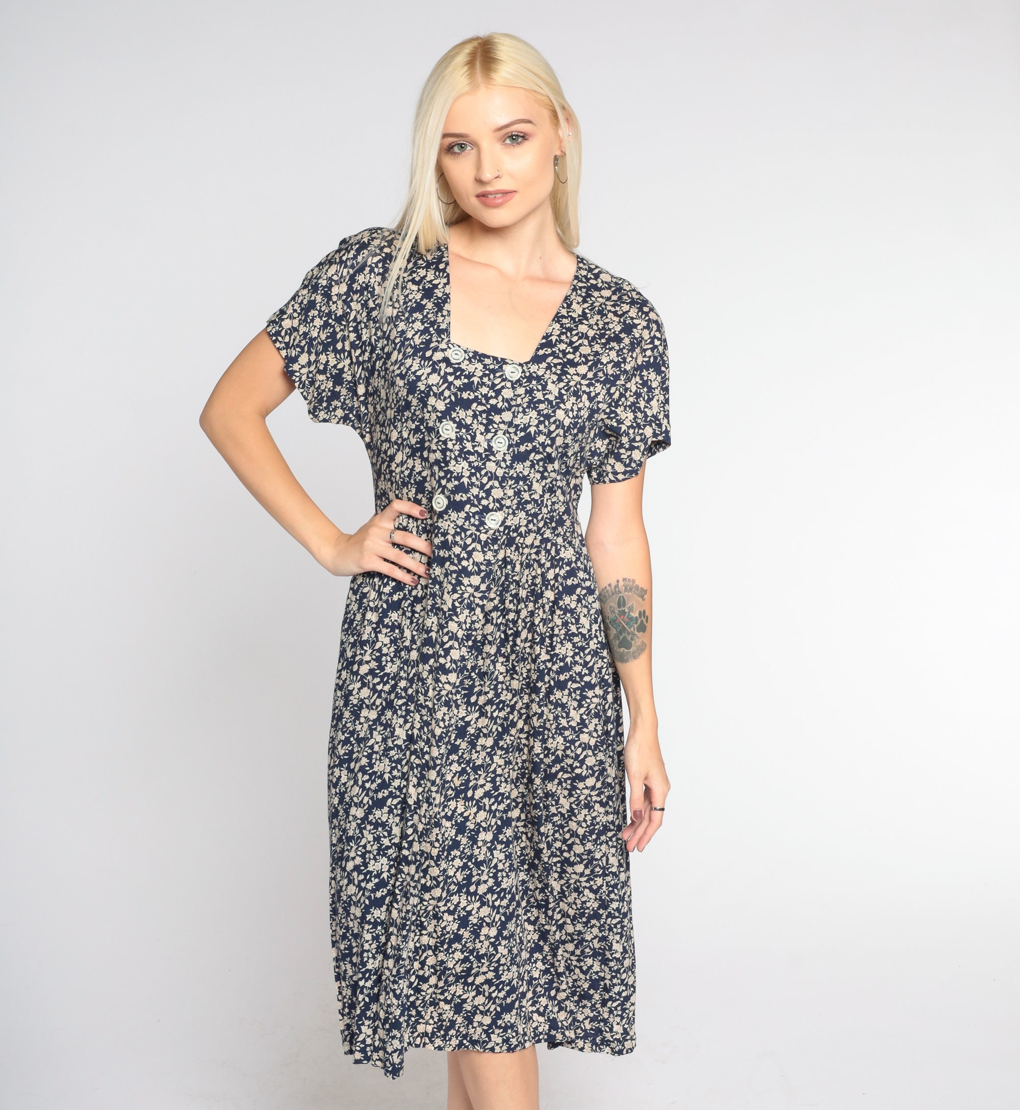 Vintage 90s dress in navy blue with a floral print. It has a high waist, short sleeves, and double breasted buttons on the chest. Midi length.