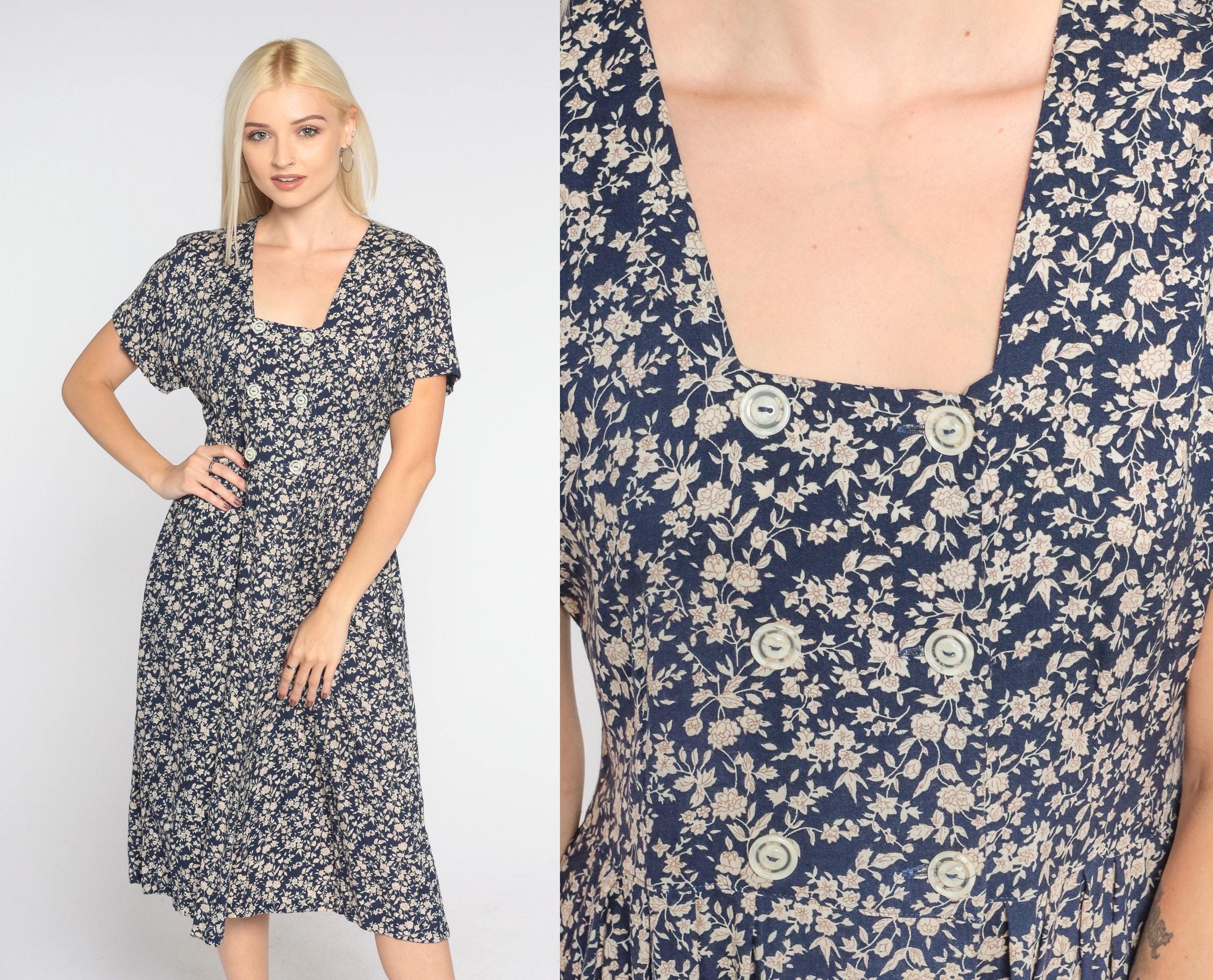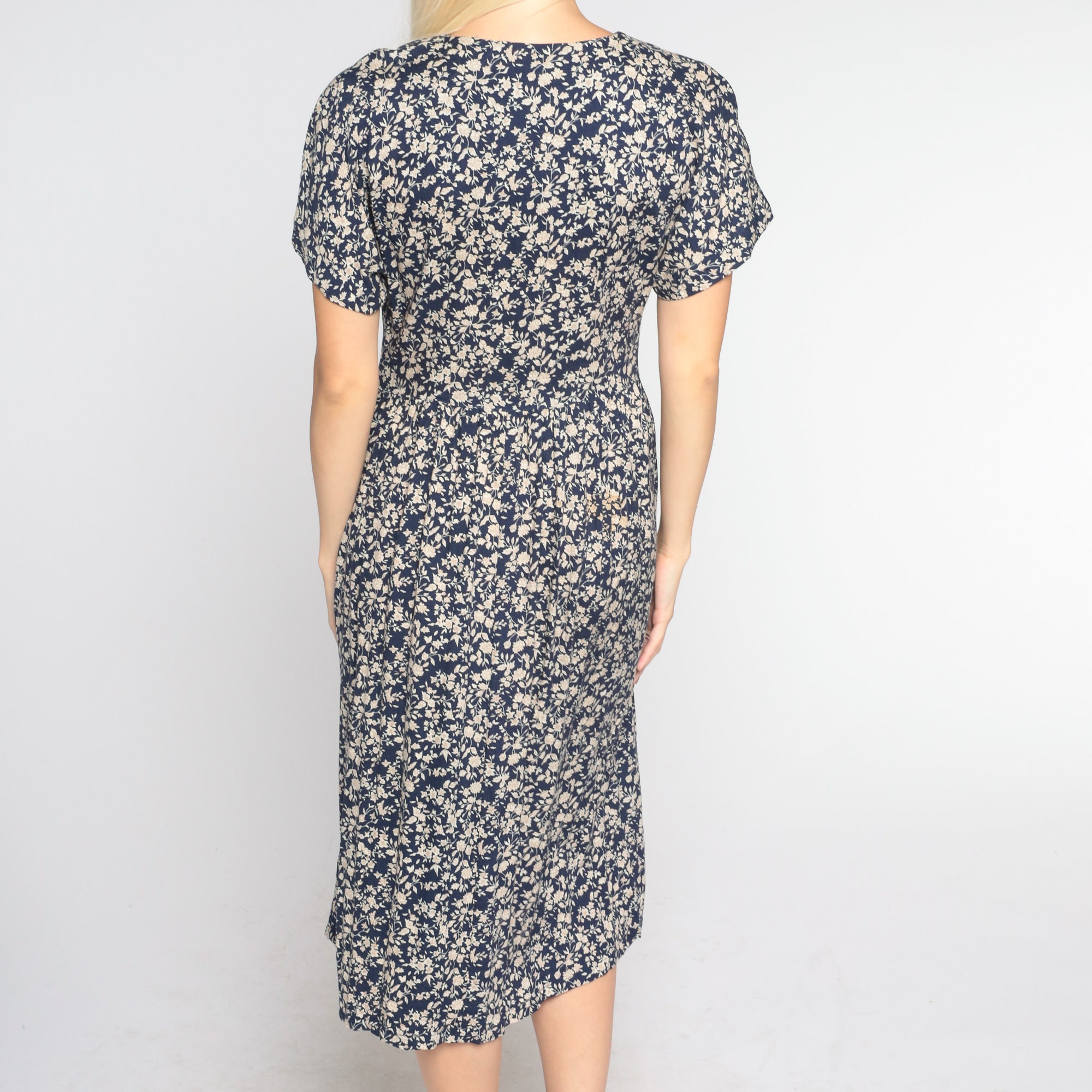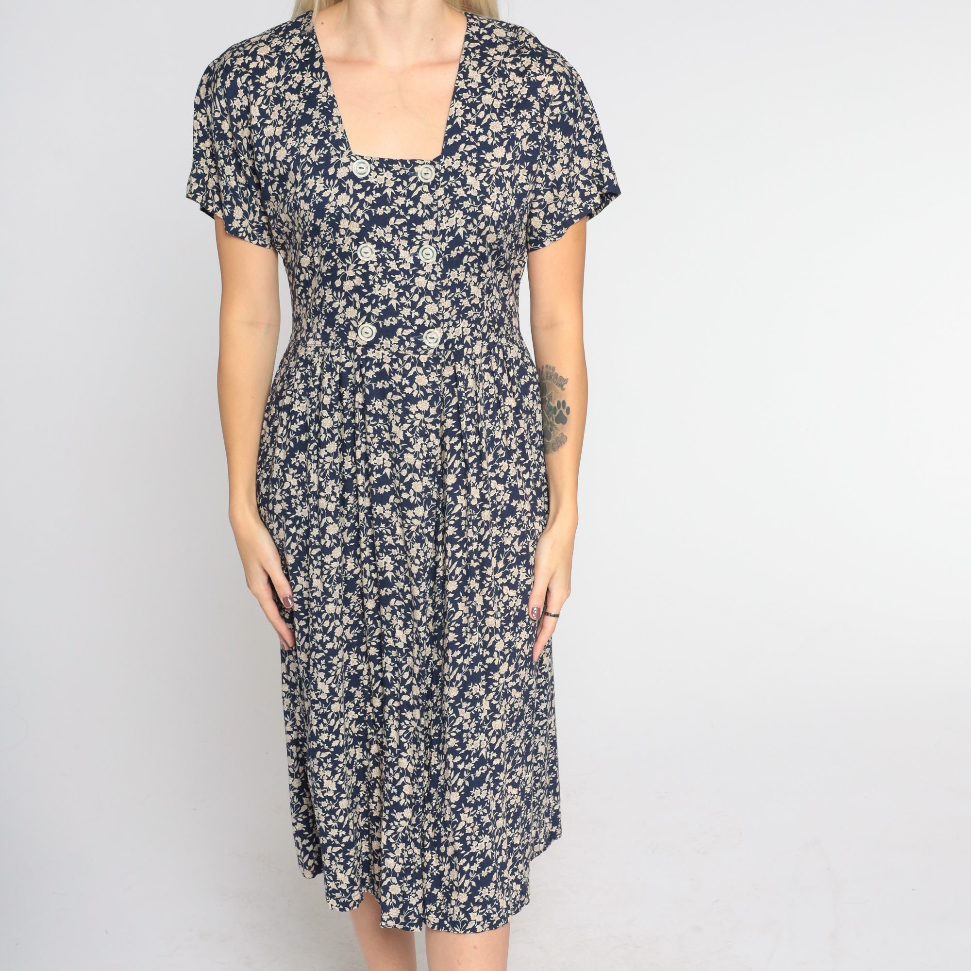 Vintage 90s dress in navy blue with a floral print. It has a high waist, short sleeves, and double breasted buttons on the chest. Midi length.