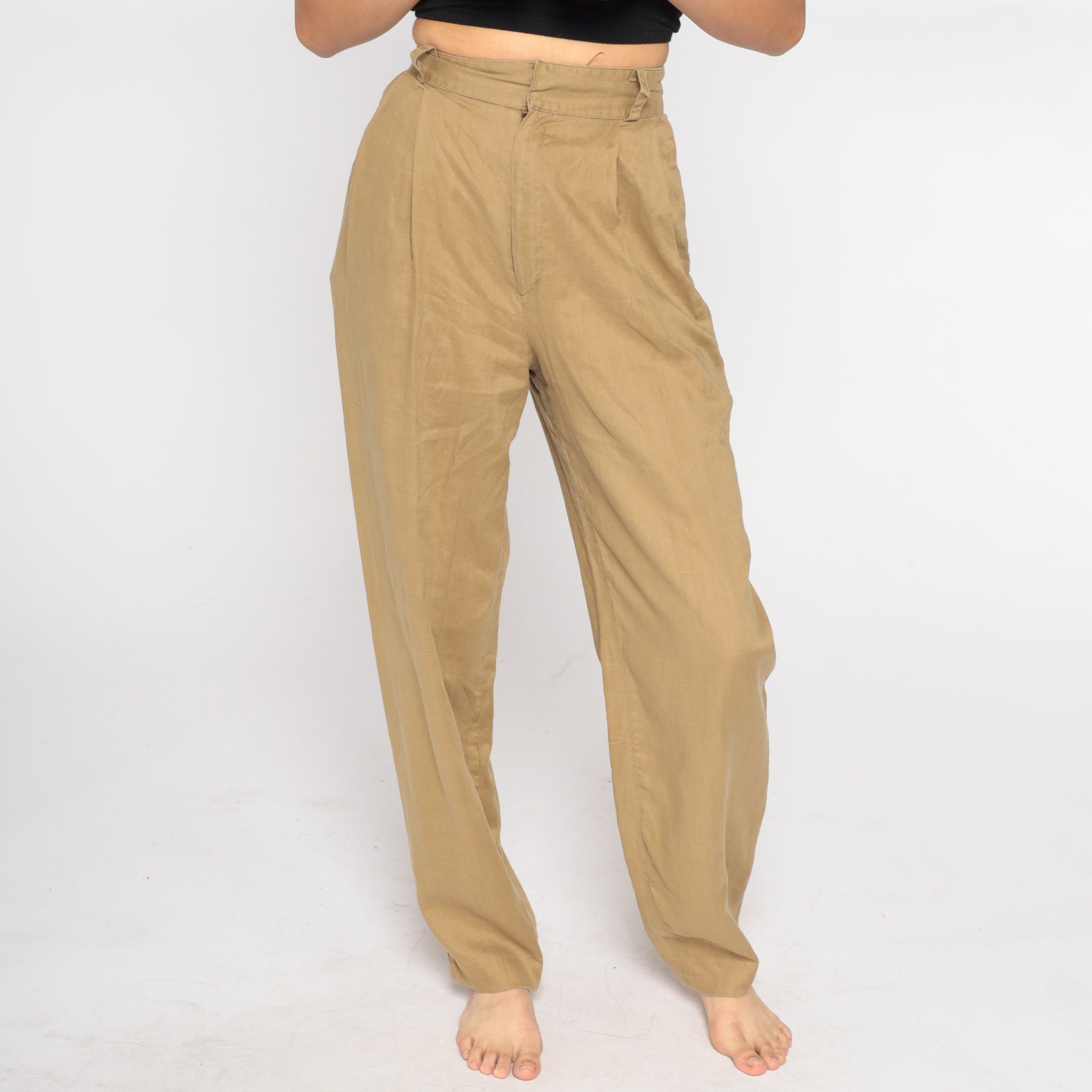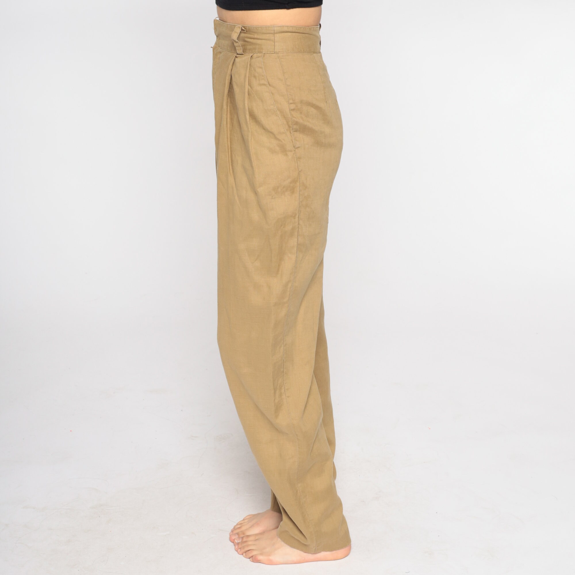Vintage 90s pants in olive brown linen with a high pleated waist and a straight leg.