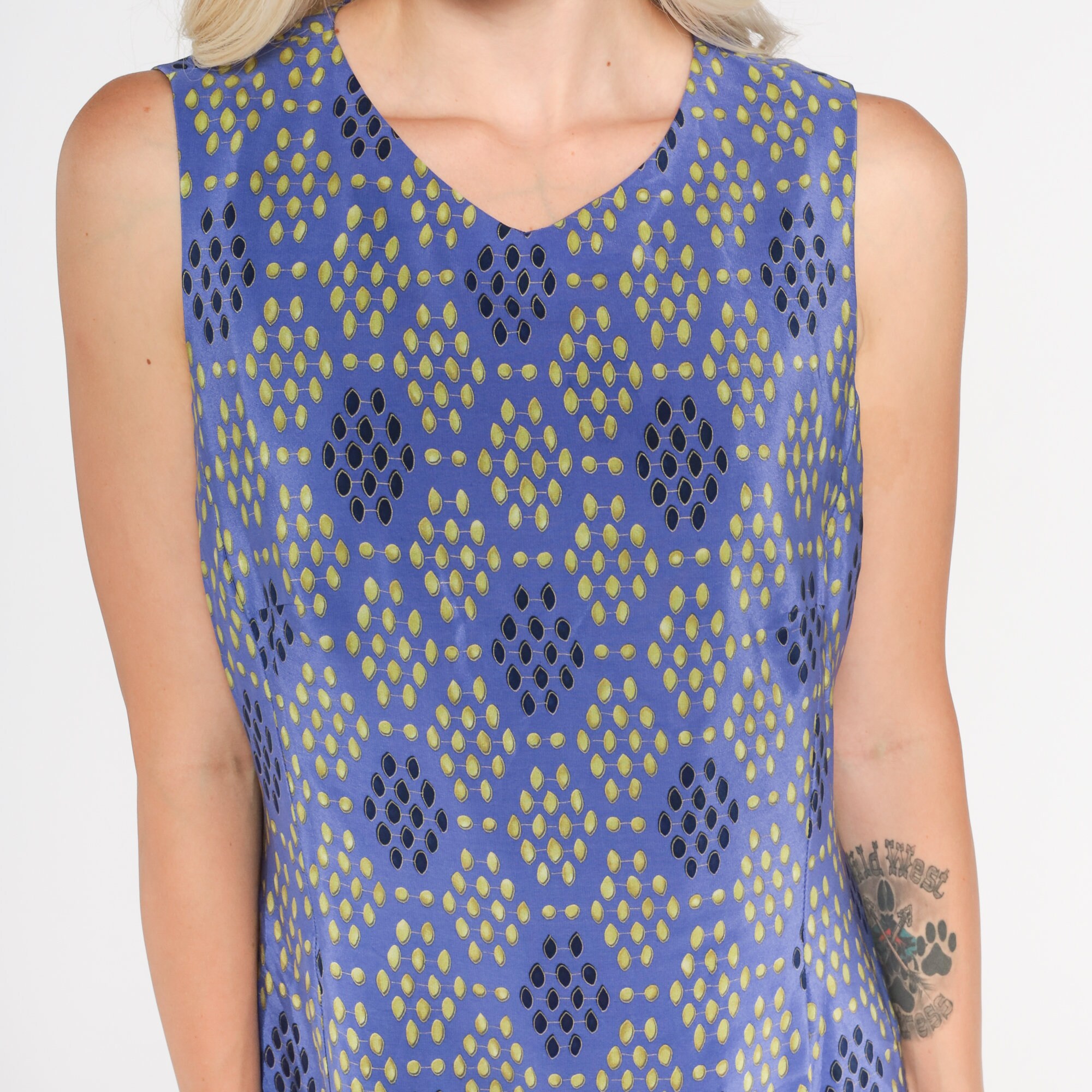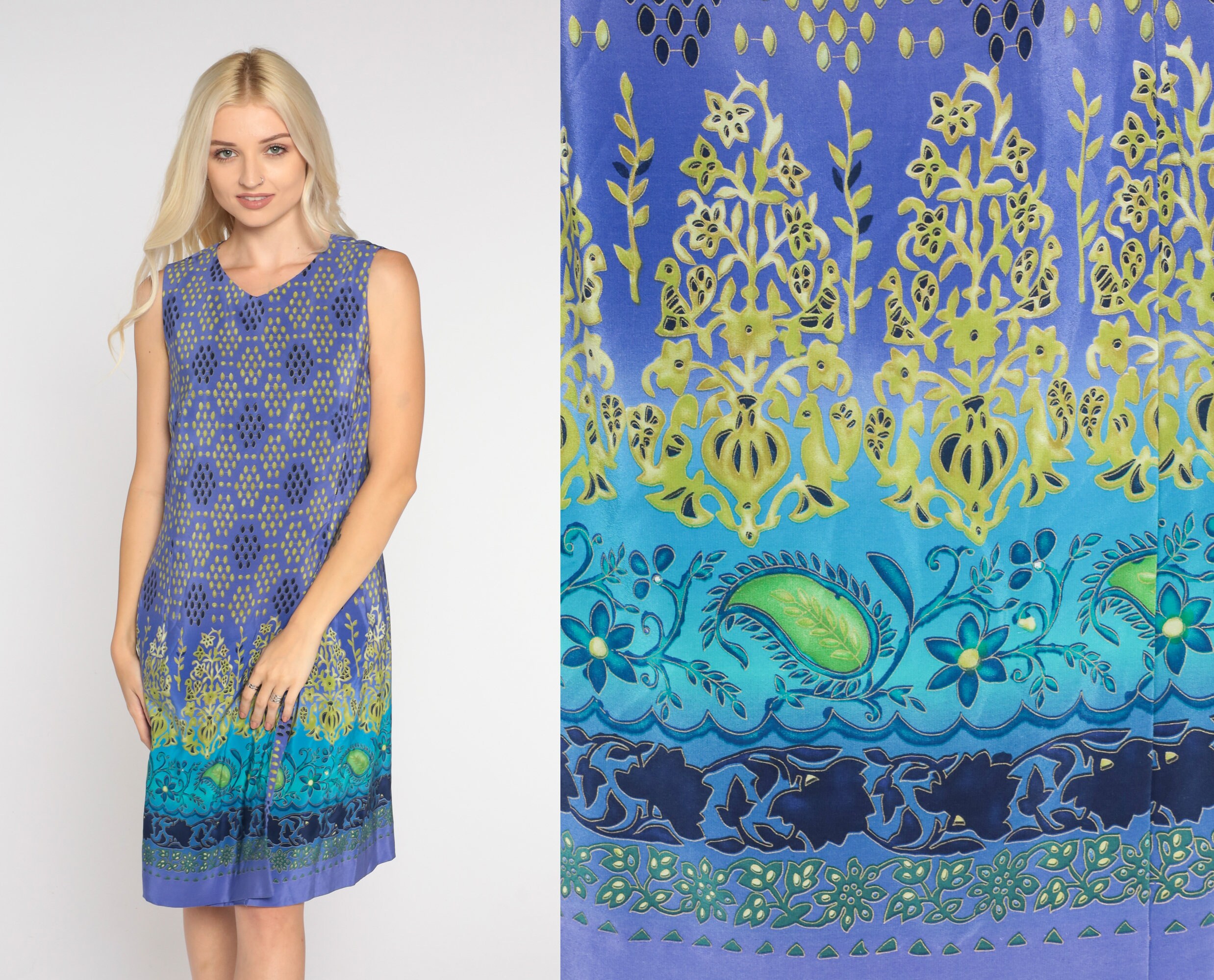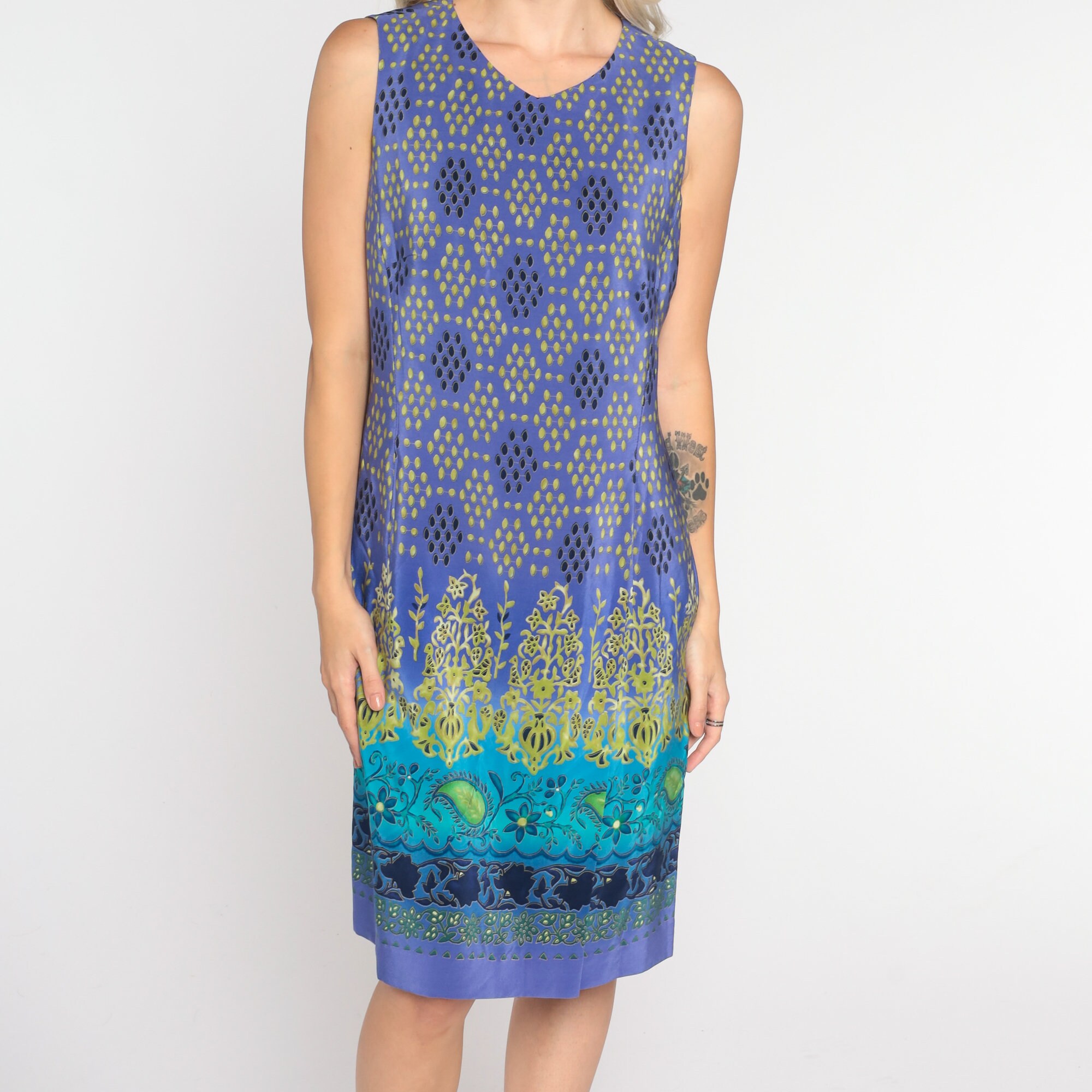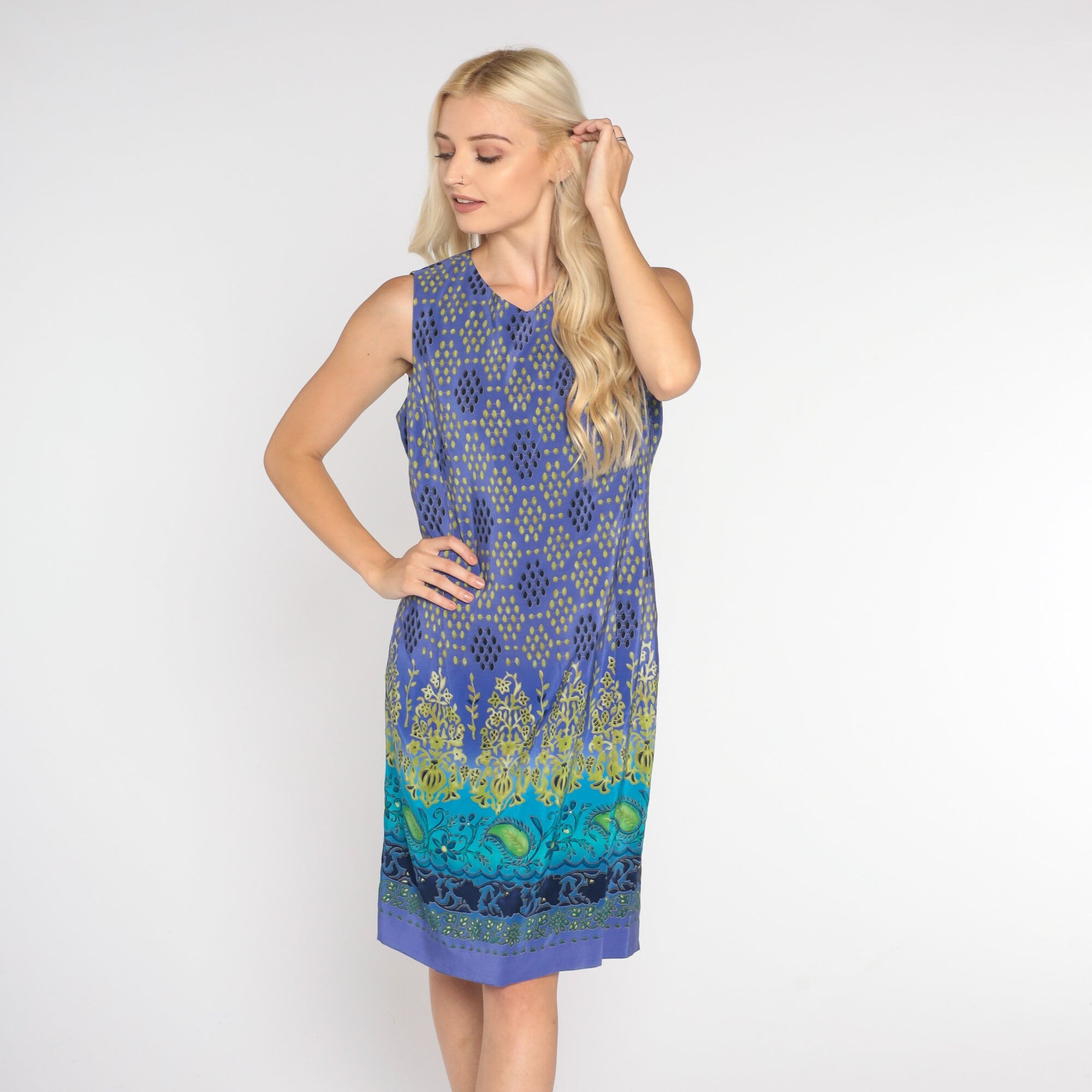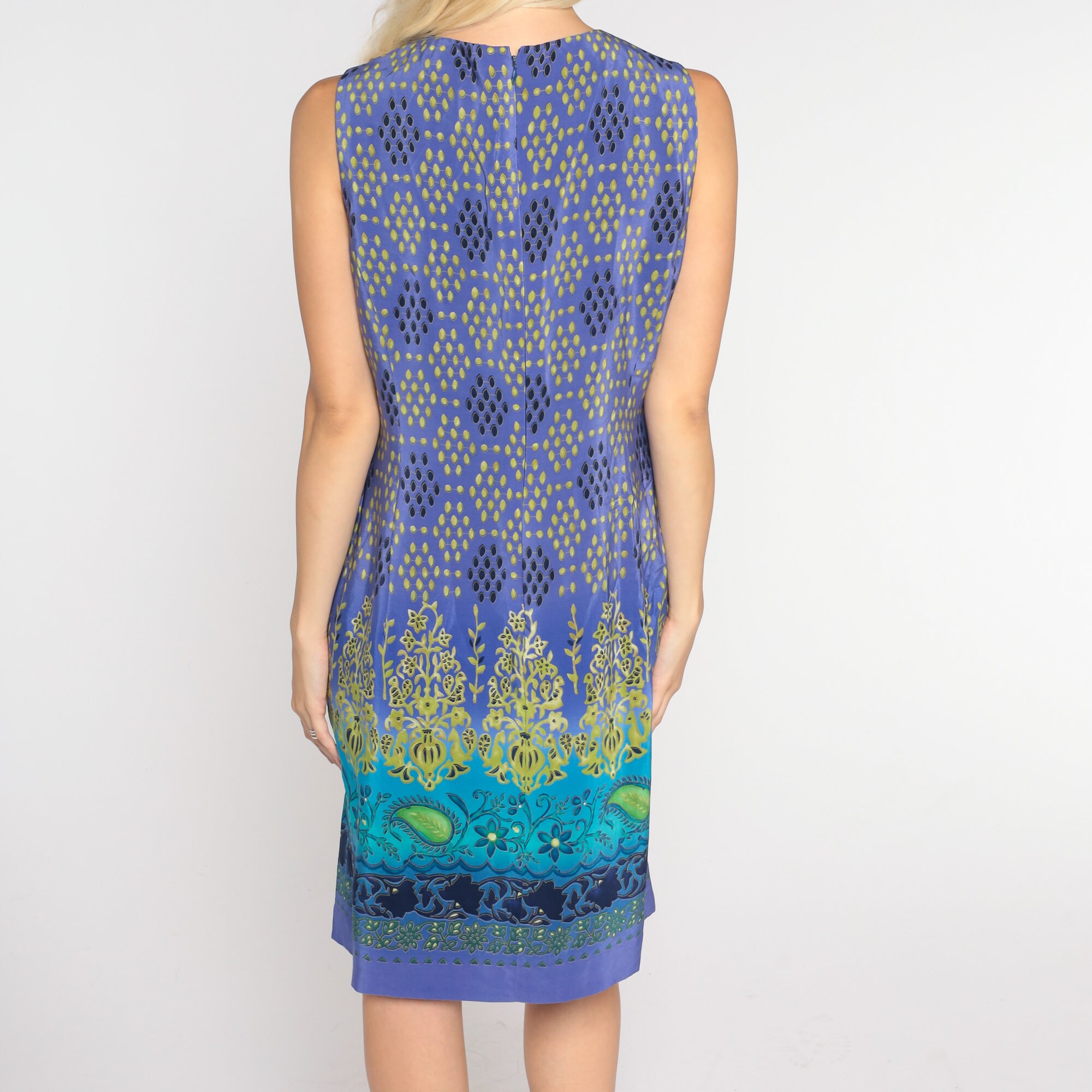 Vintage 00s dress in purple silk in a boho floral, paisley, and dot print with a sheath cut. Mini length with a rear zipper.