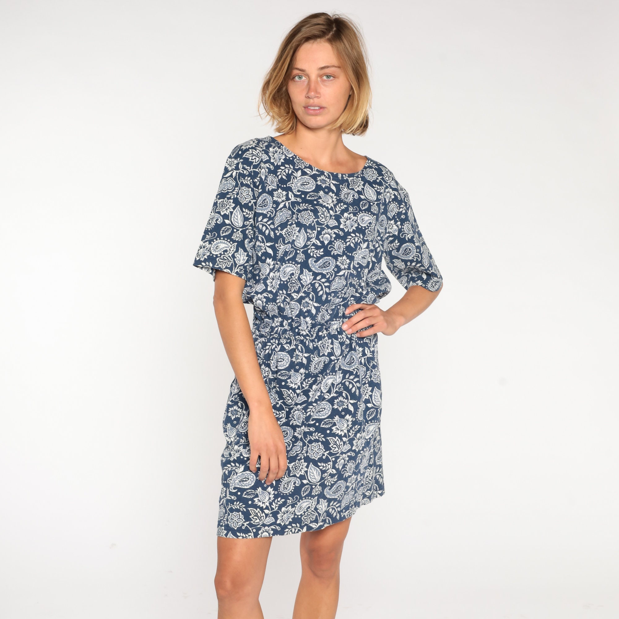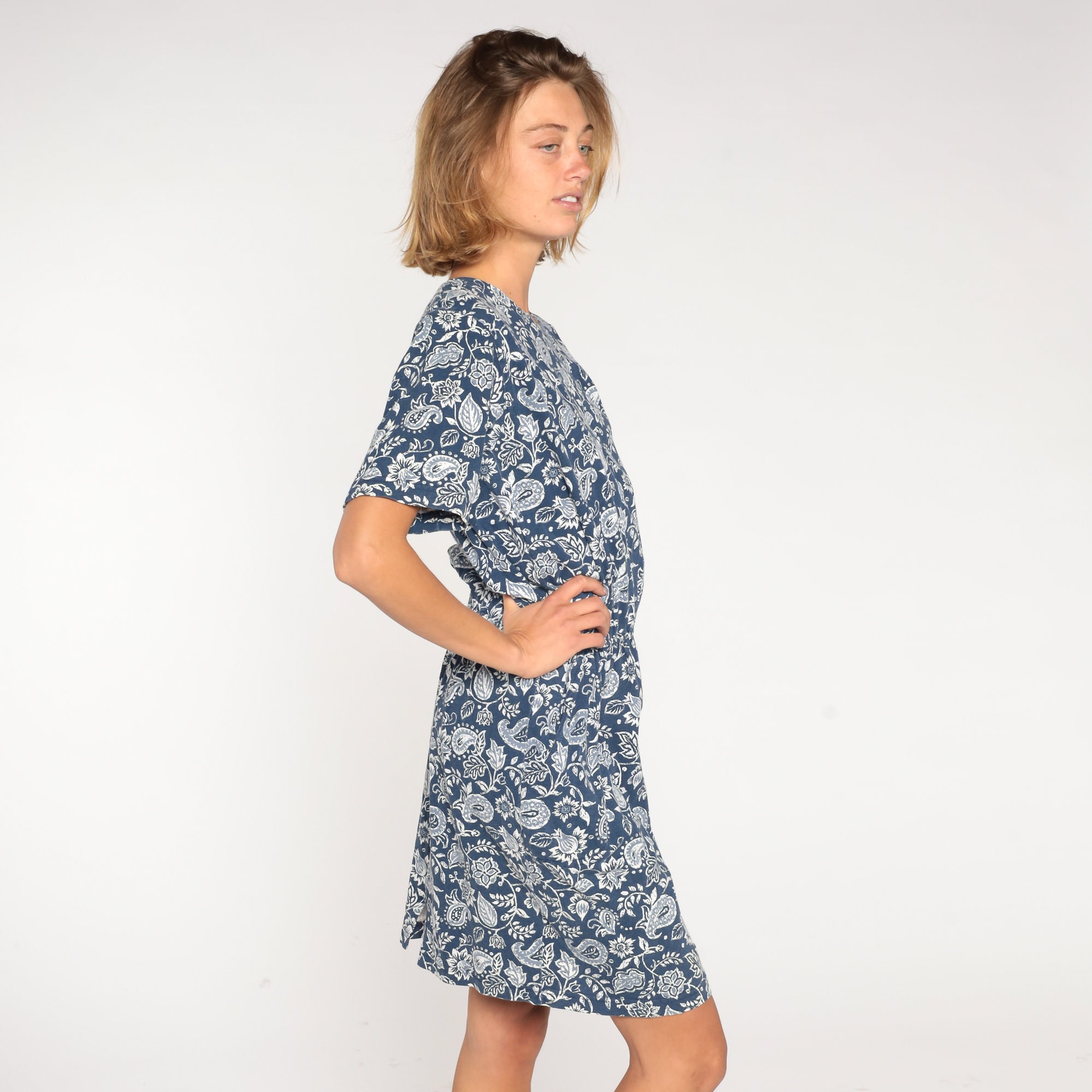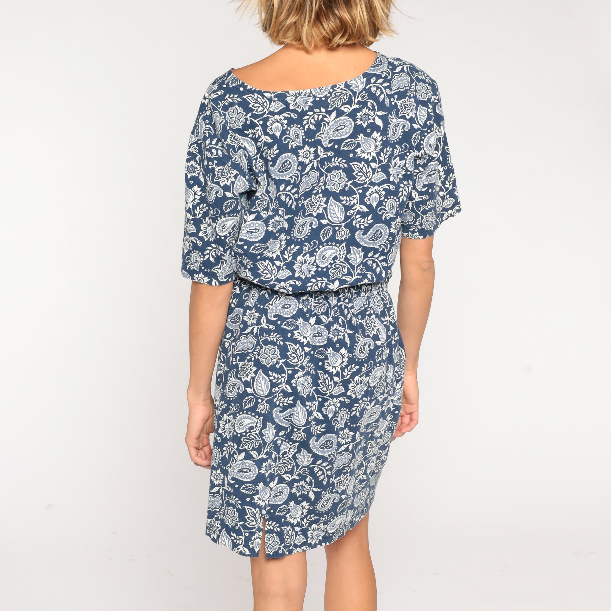 Vintage 00s dress in blue with a paisley floral print and a high waist. Short sleeves, mini length.