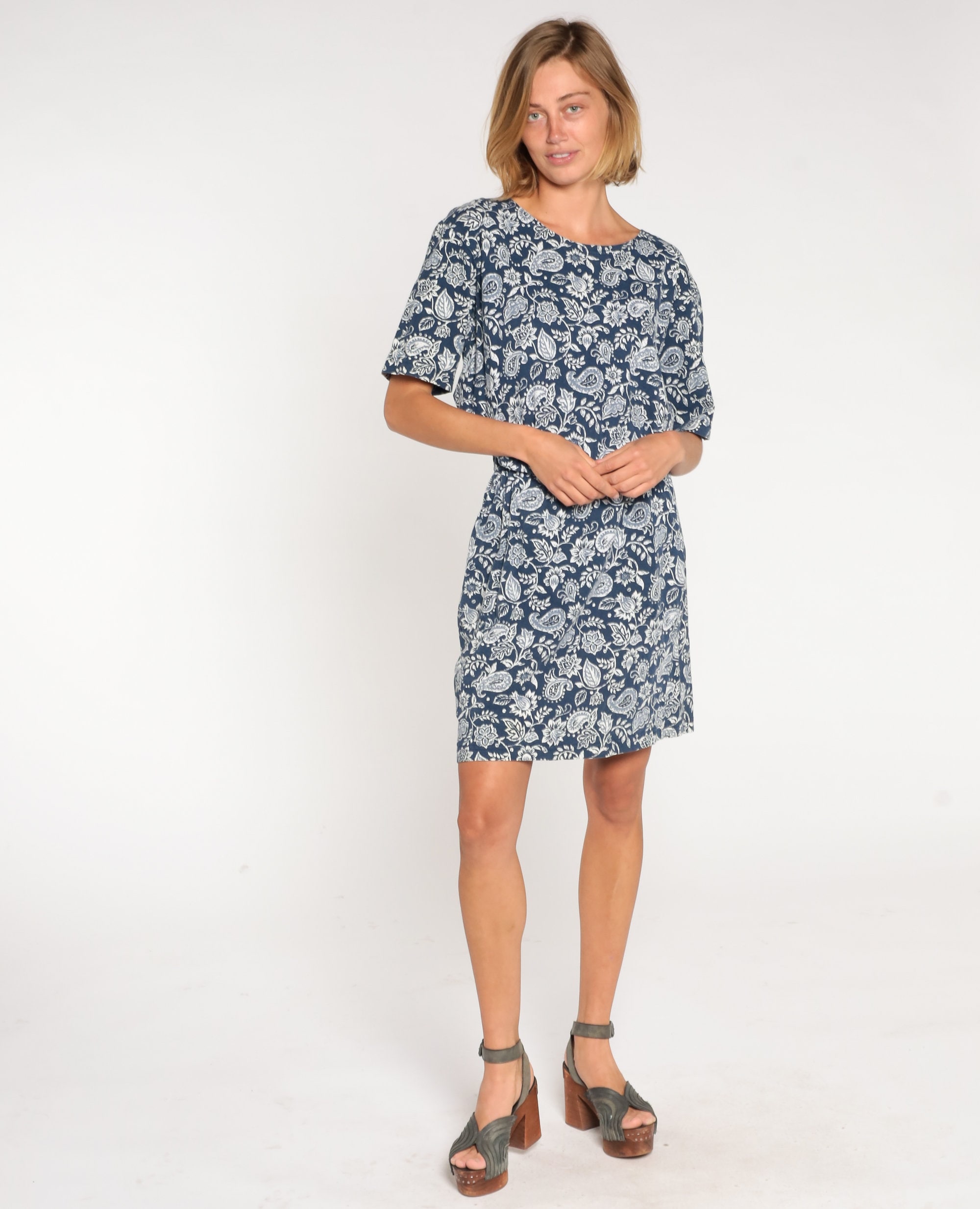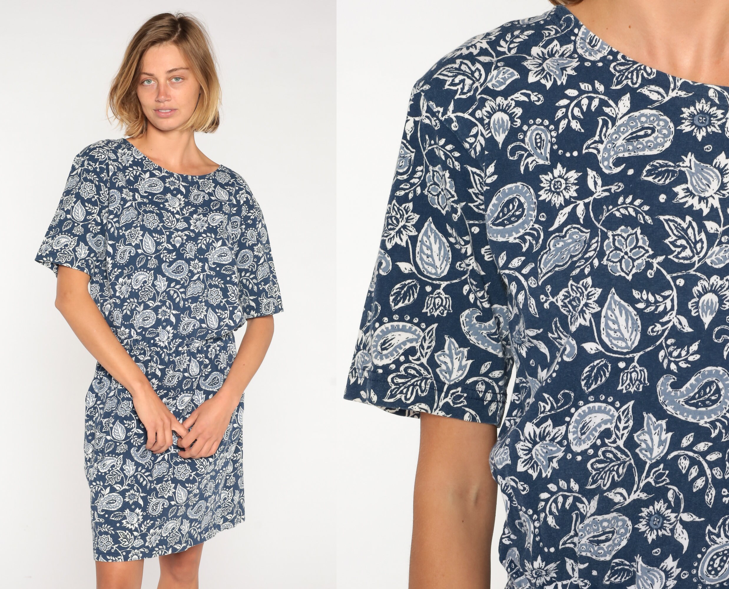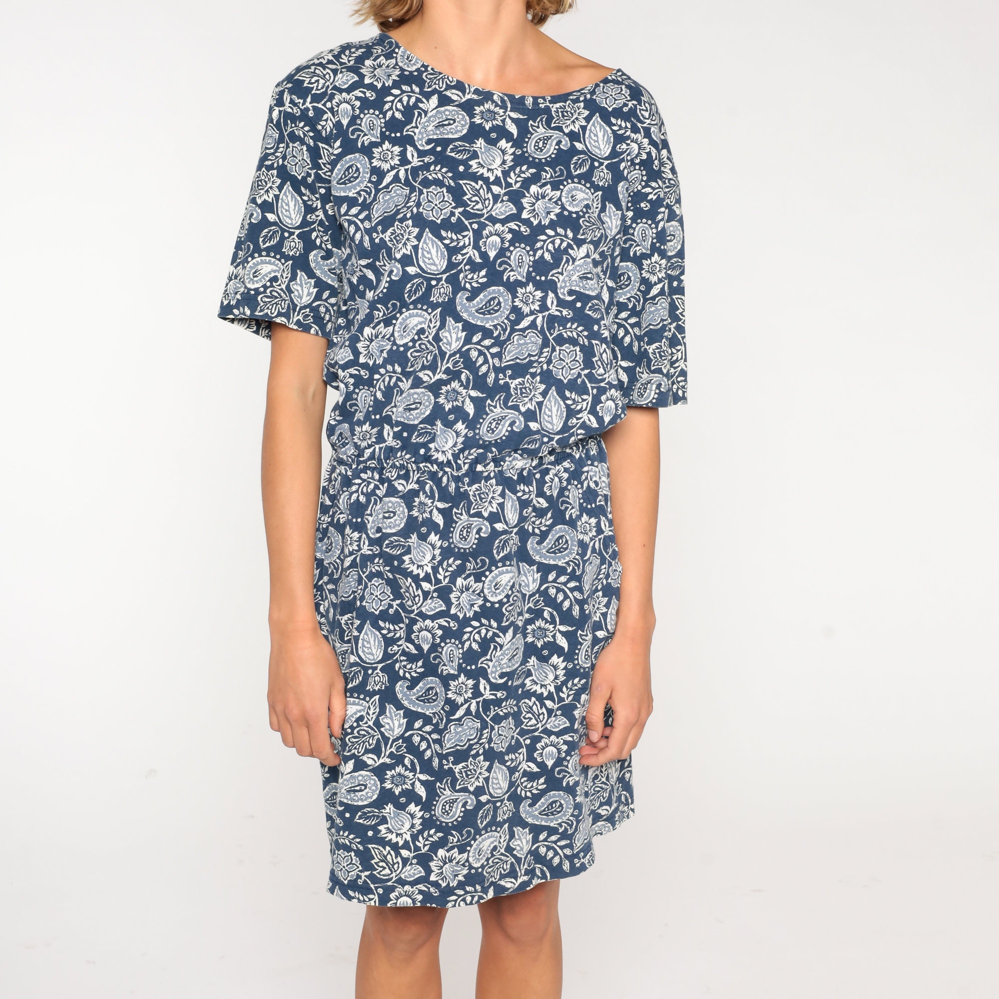 Vintage 00s dress in blue with a paisley floral print and a high waist. Short sleeves, mini length.