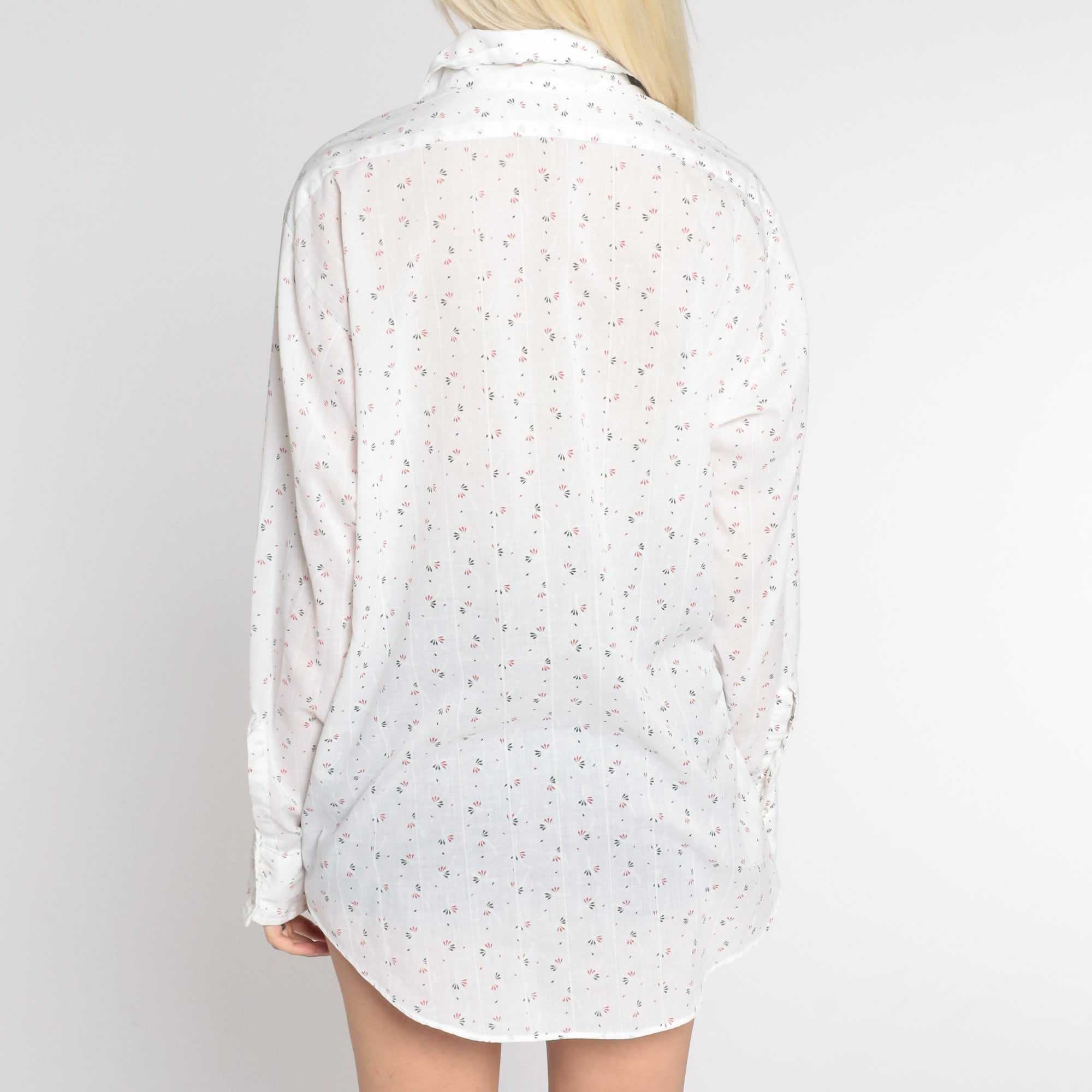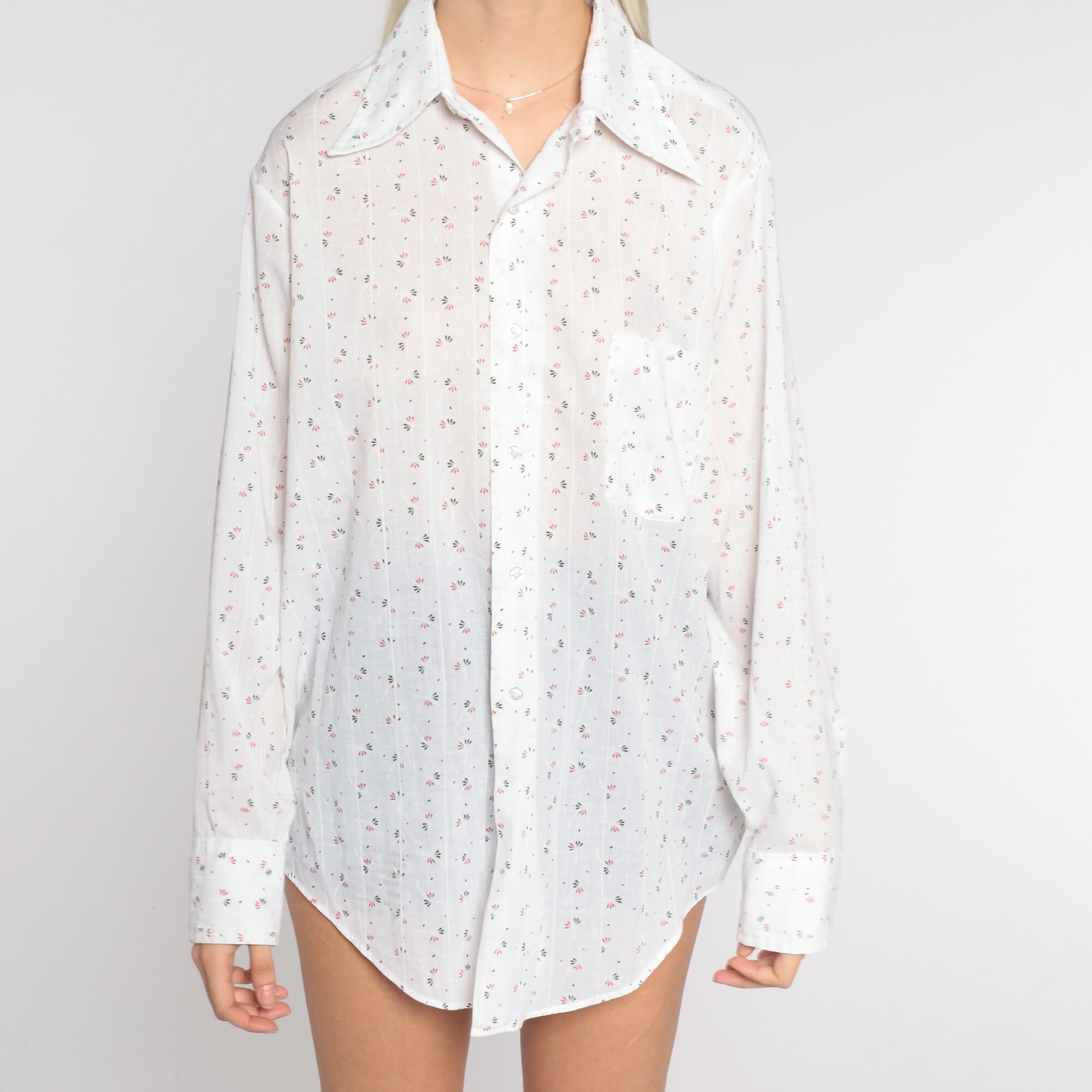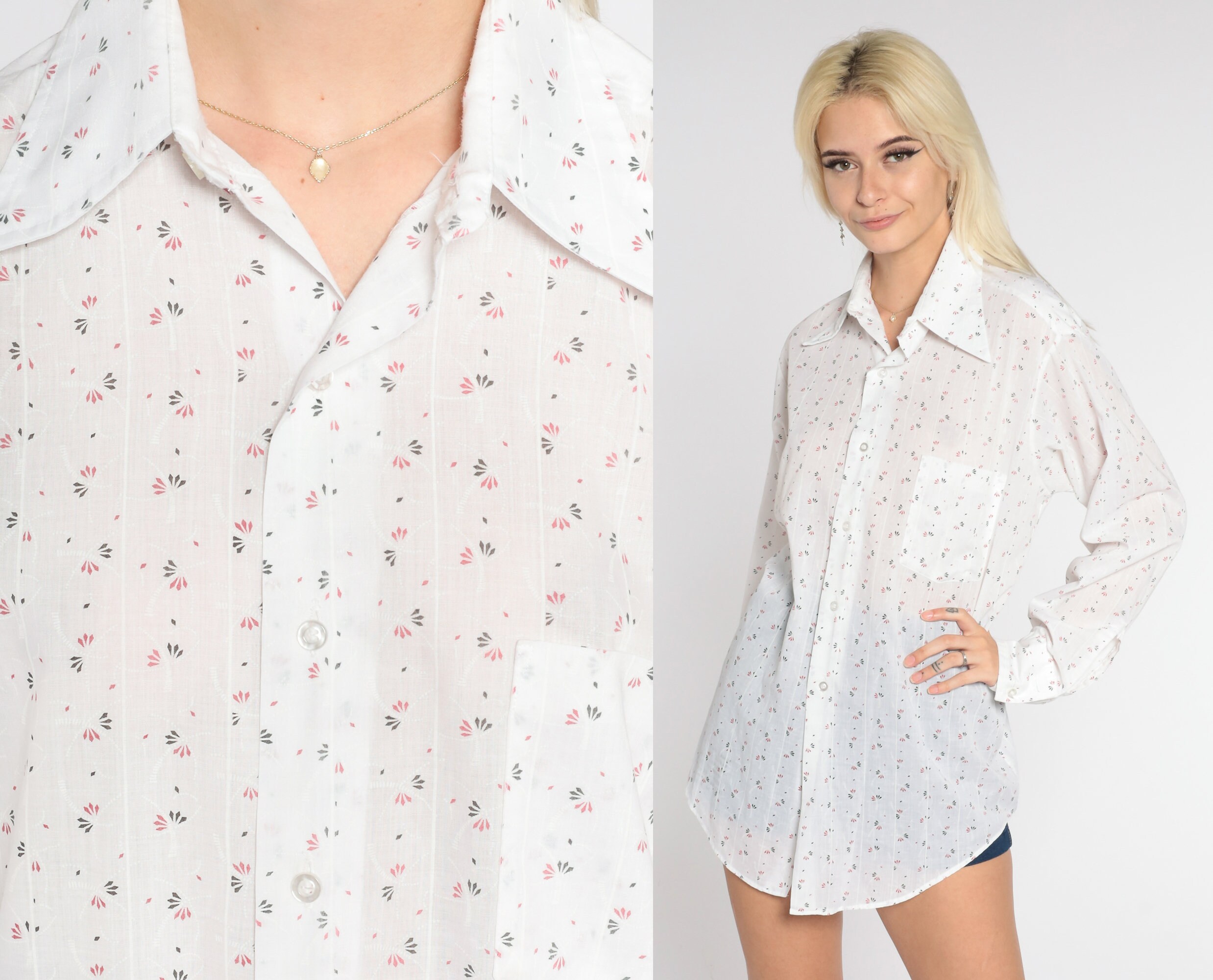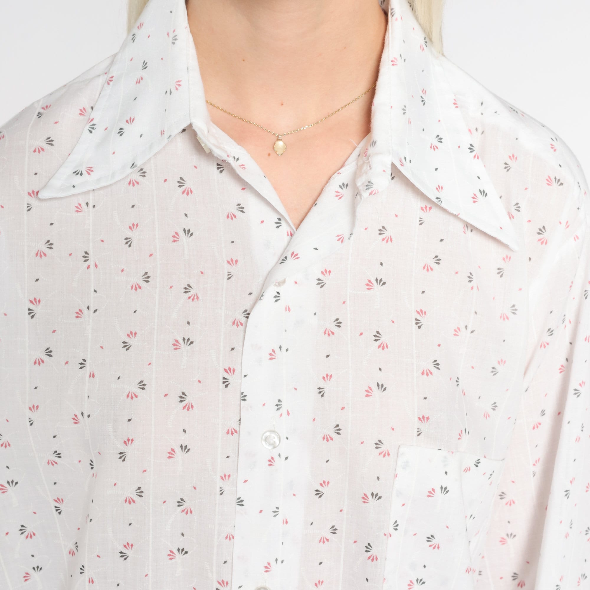 Vintage 70s shirt in white with subtle stripes and a tiny floral design. It has a collar, long sleeves, and buttons down the front.