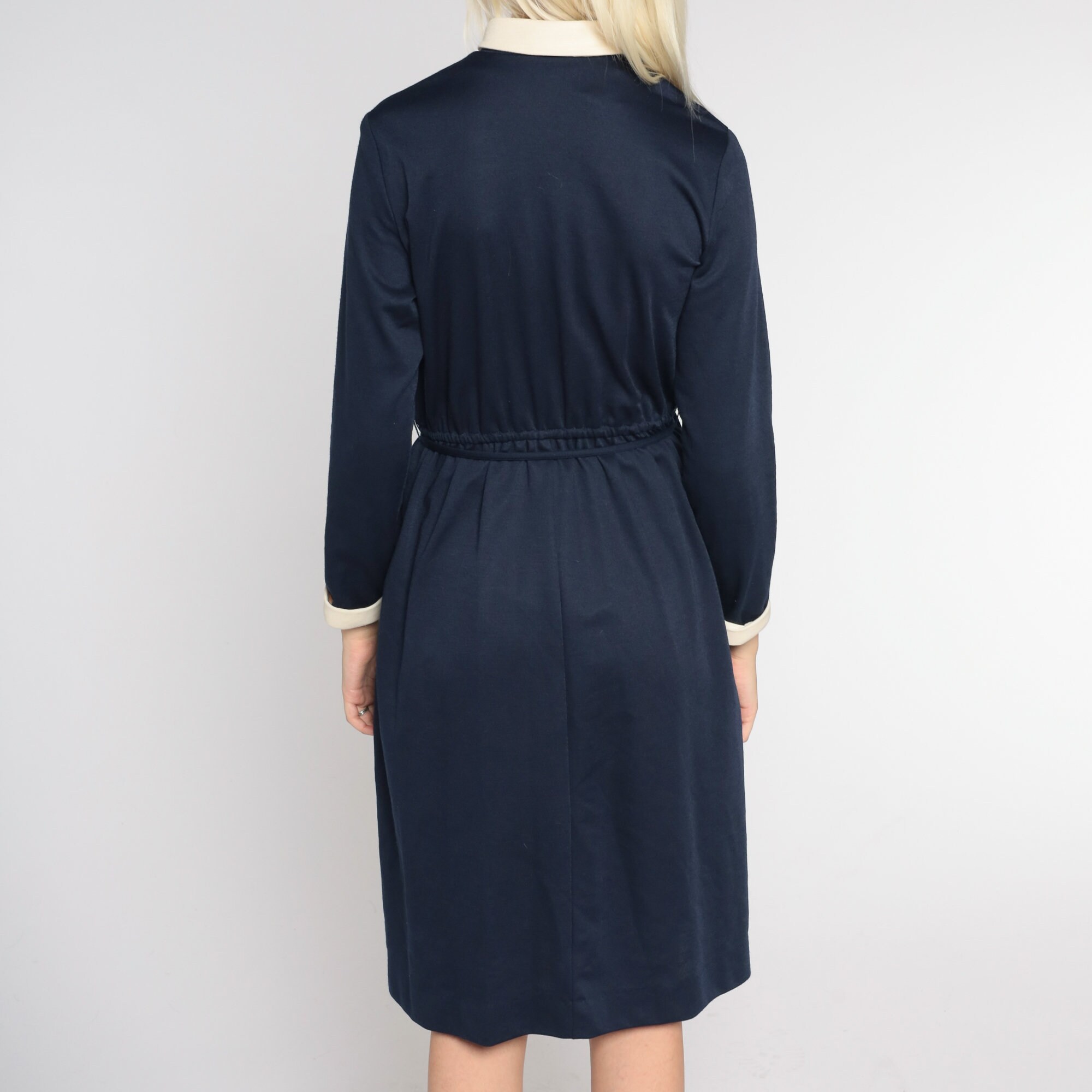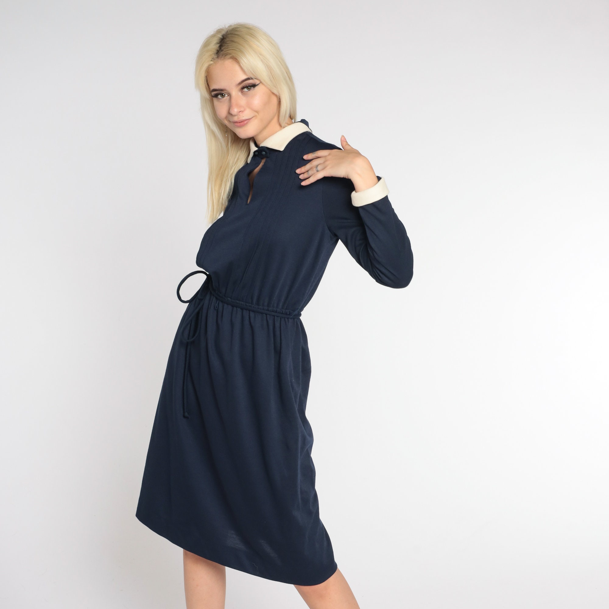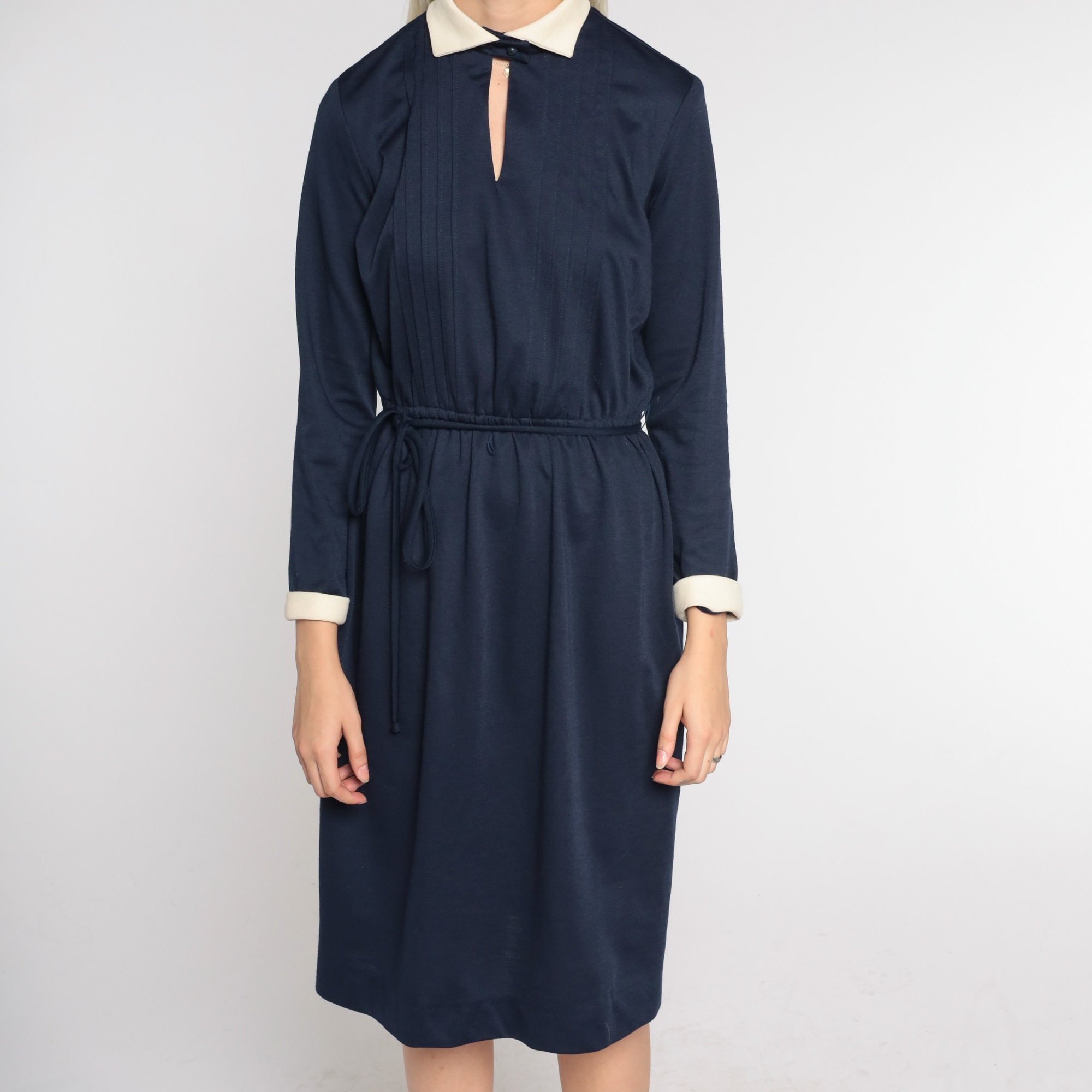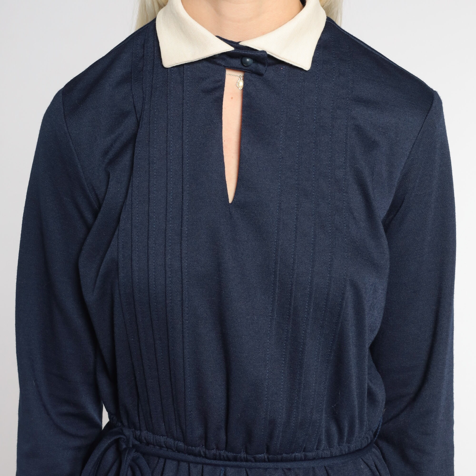 Vintage 80s dress in navy blue with a cream collar and a keyhole at the neckline. It has long sleeves, a pleated bodice, and a high waist with a tie belt. Midi length.