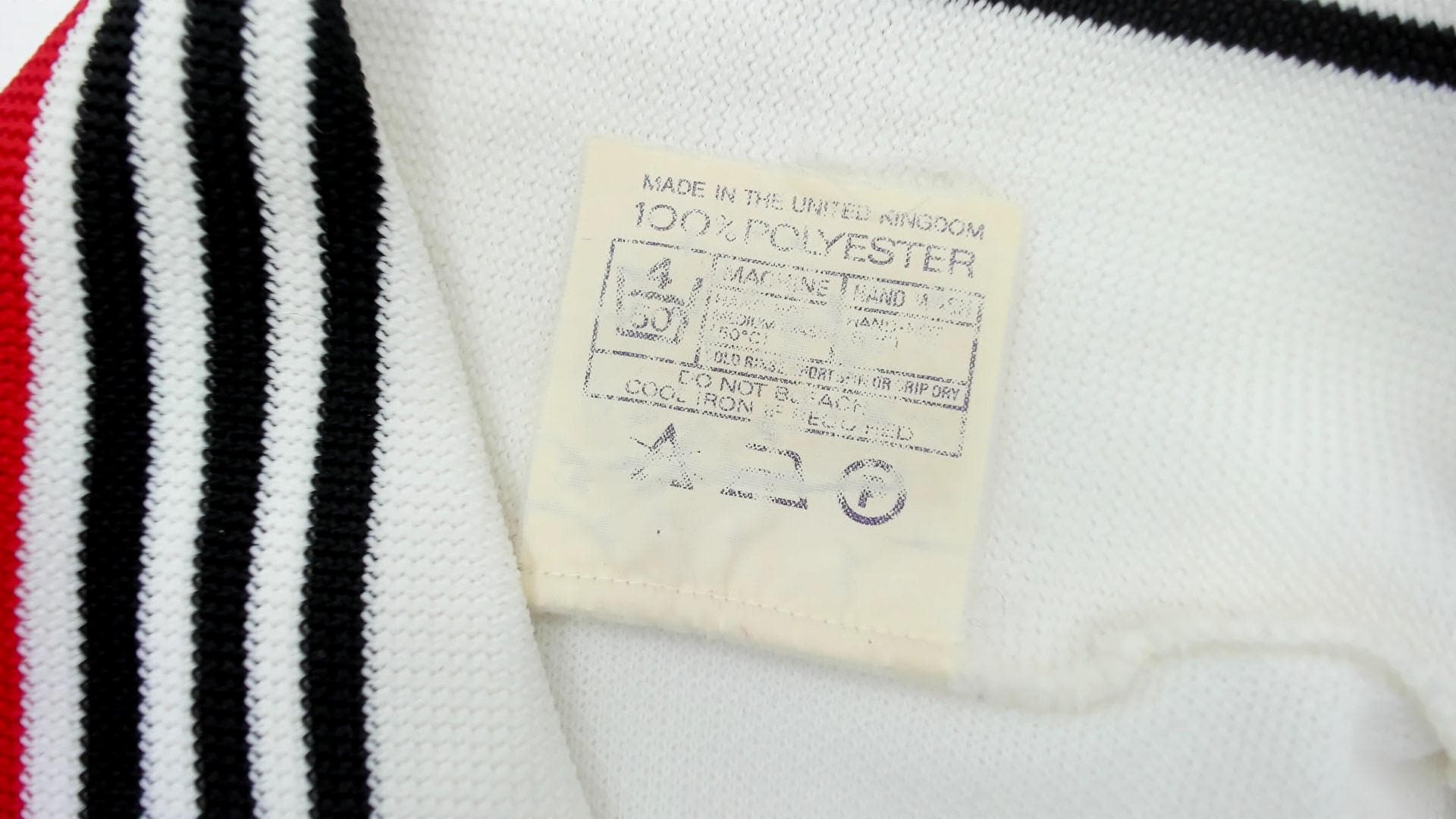 Vintage 90s polo shirt in white with black and red stripes and a faded logo on the chest. Short sleeves.