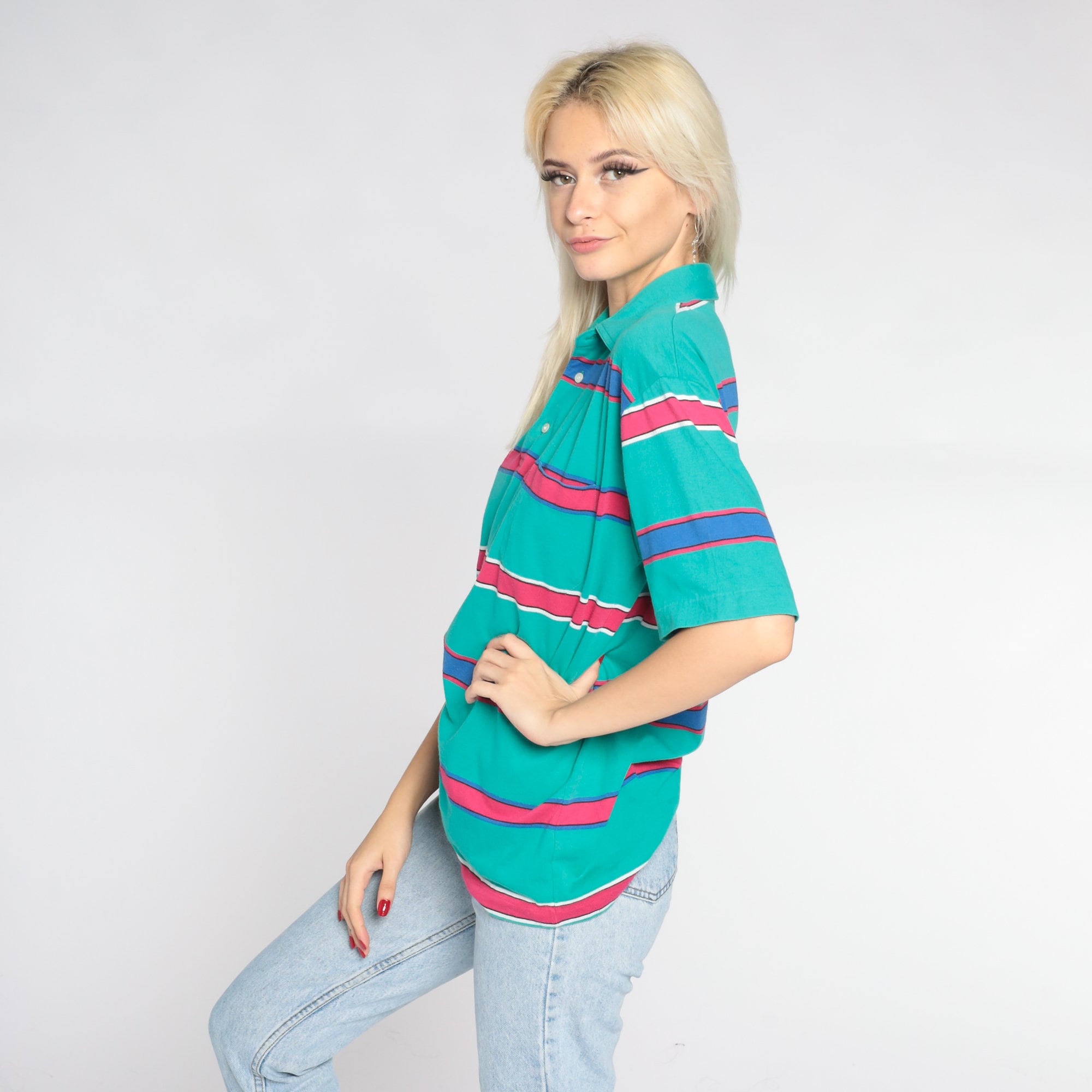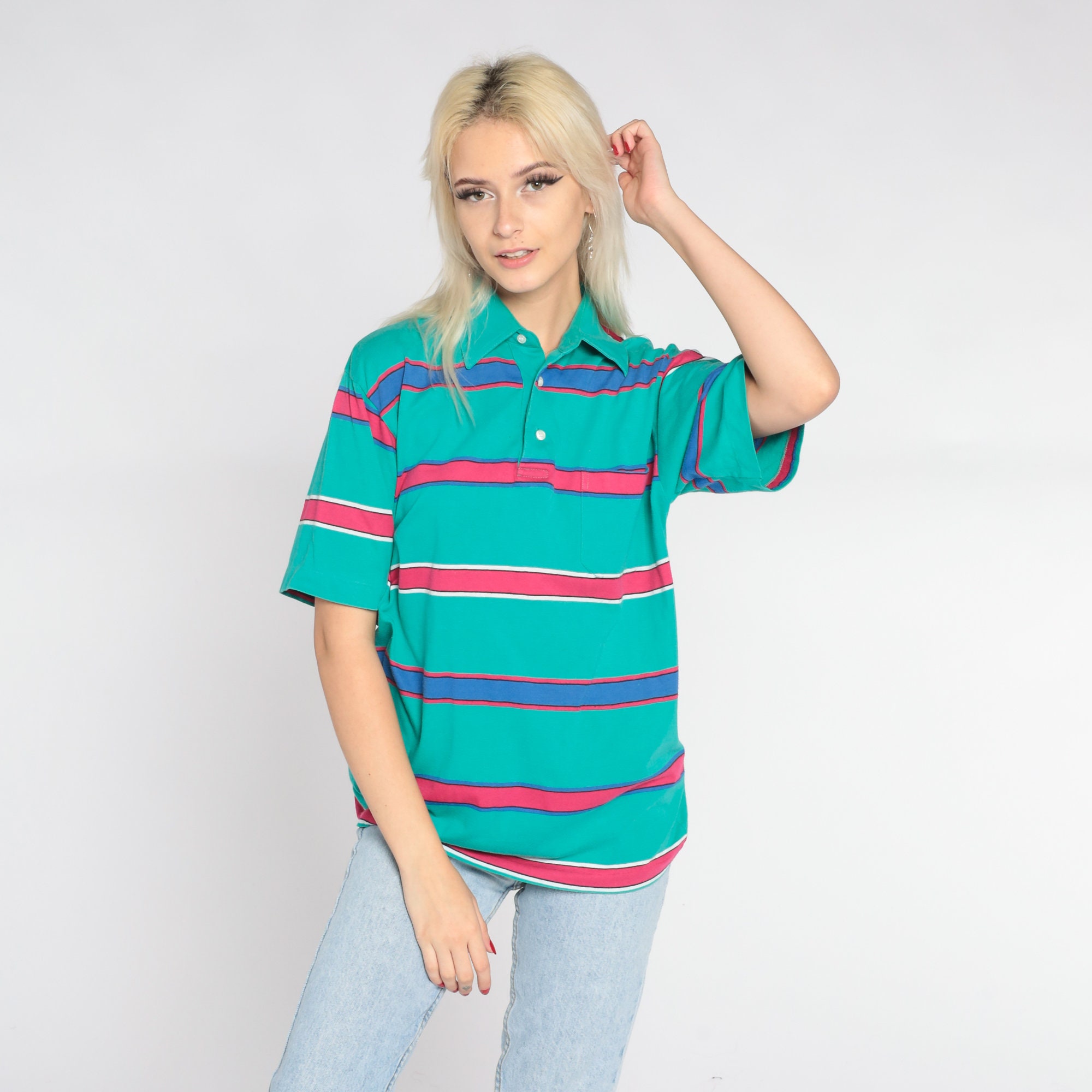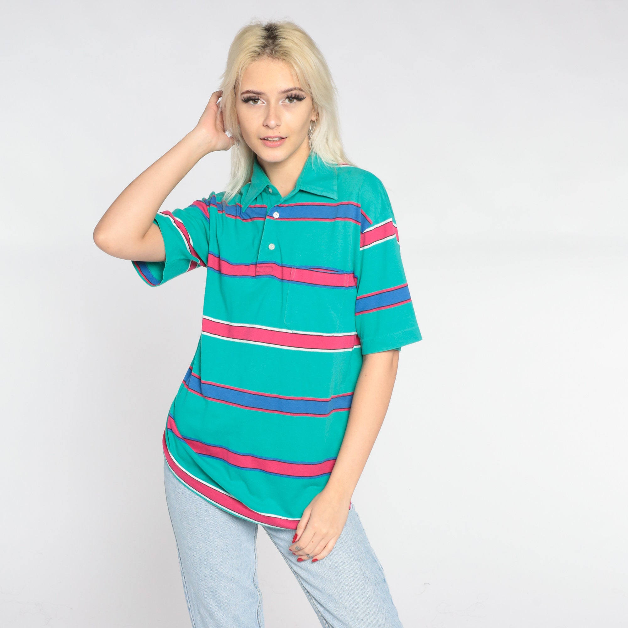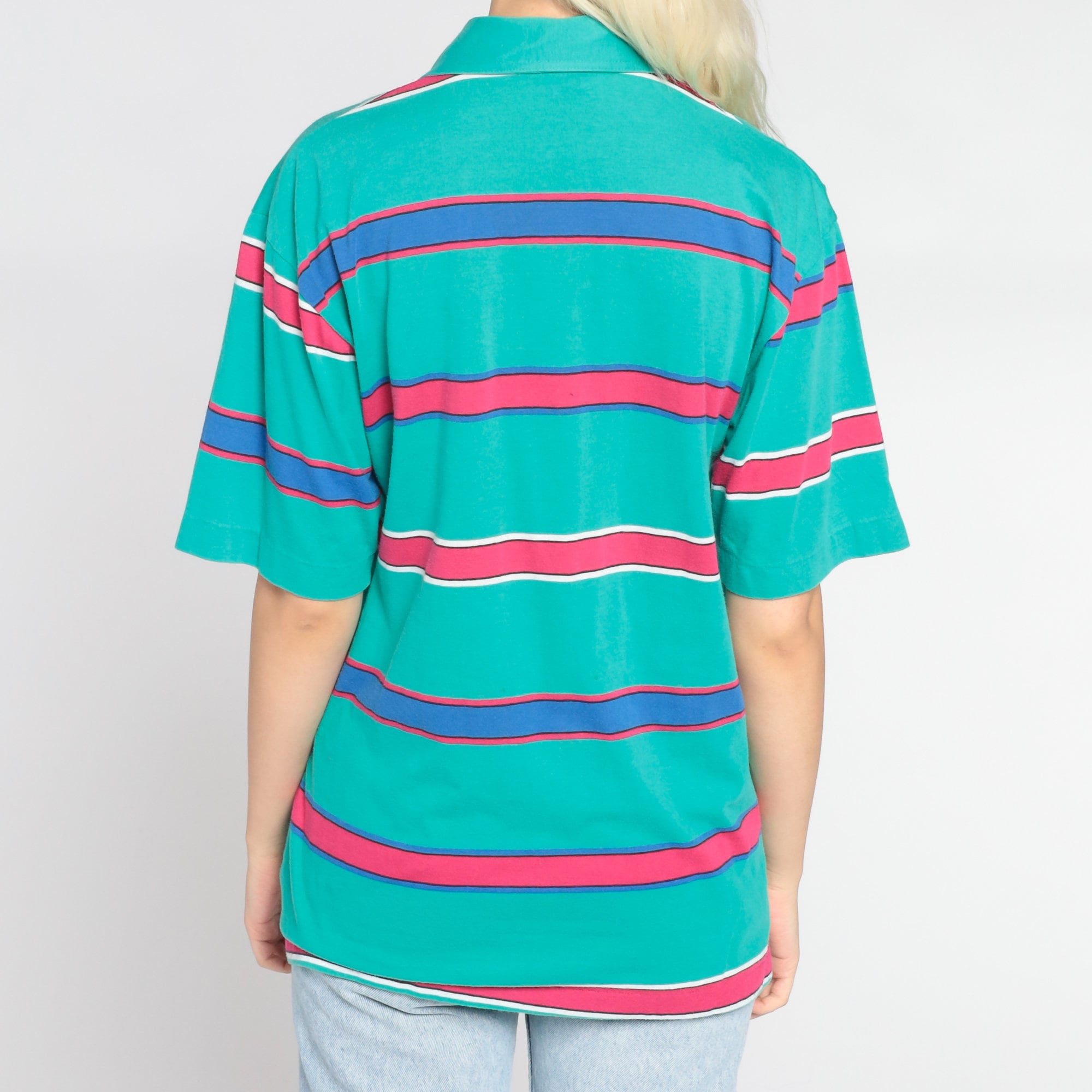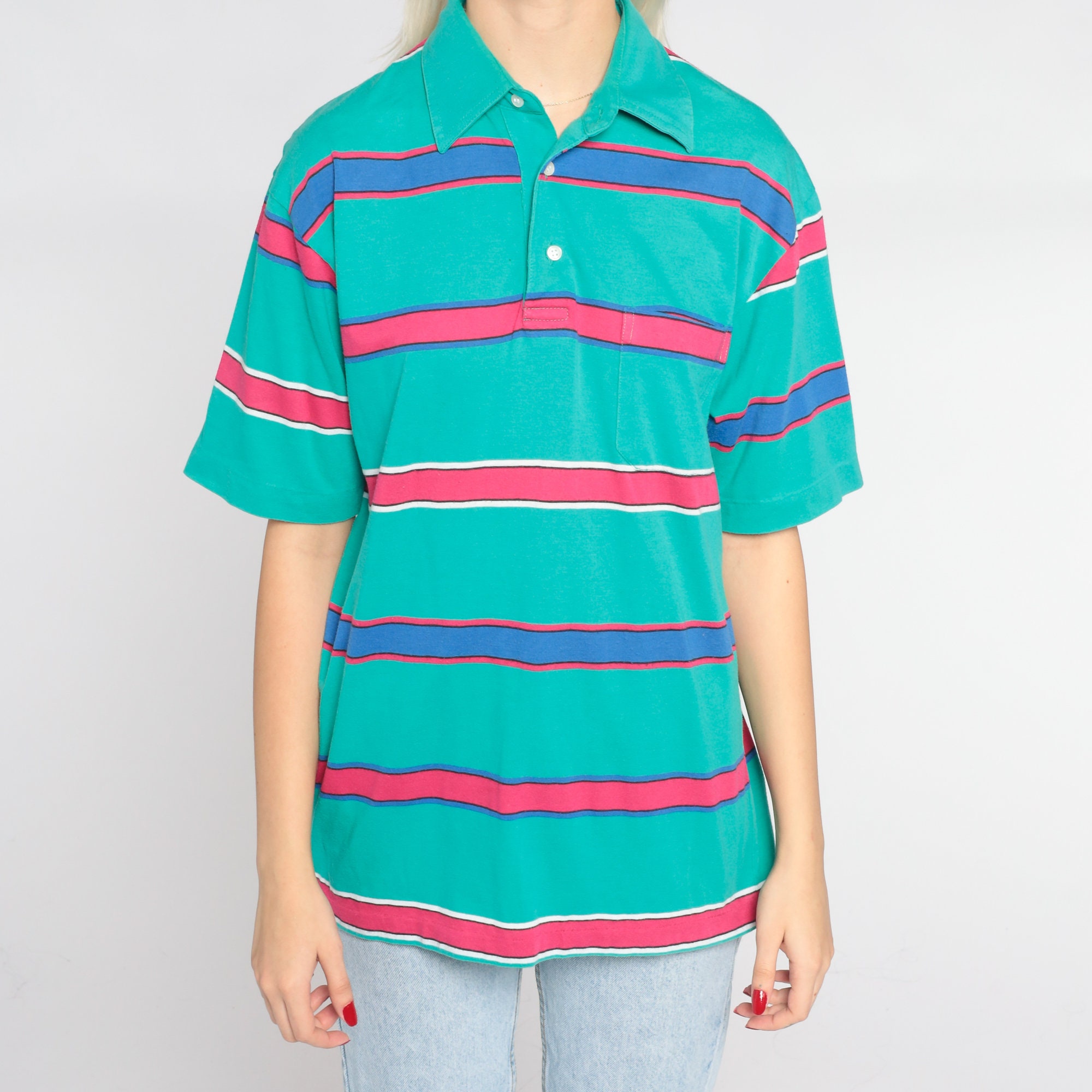 Vintage 90s polo shirt in green with pink and blue stripes. It has short sleeves, a collar, and buttons on the chest.