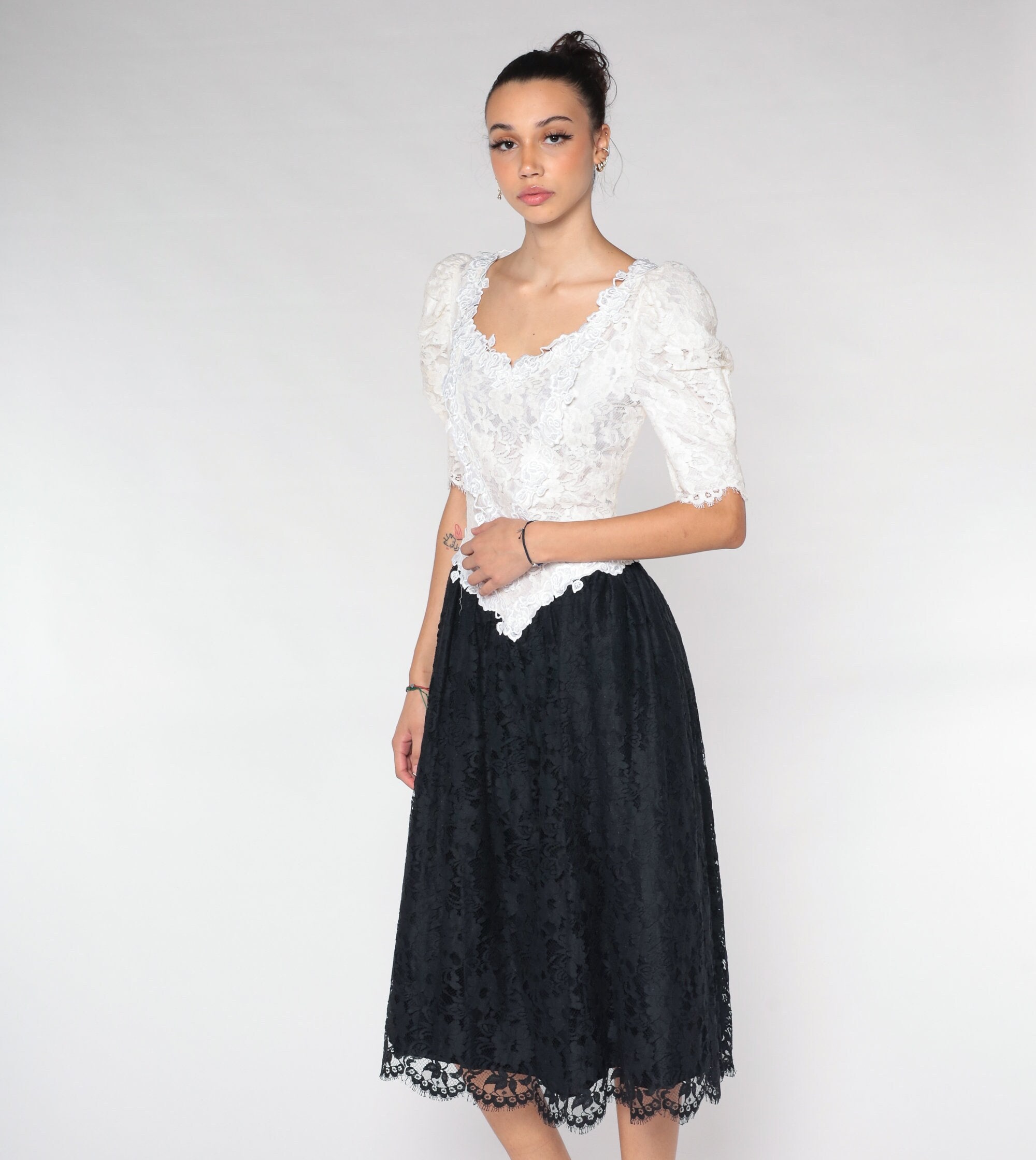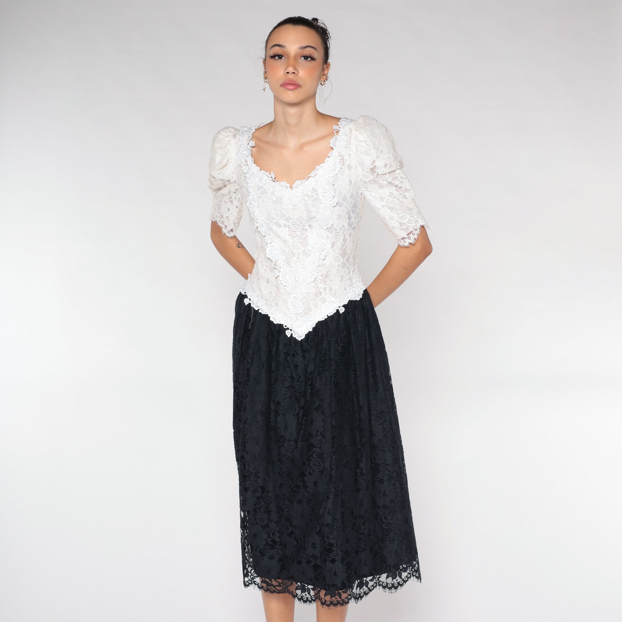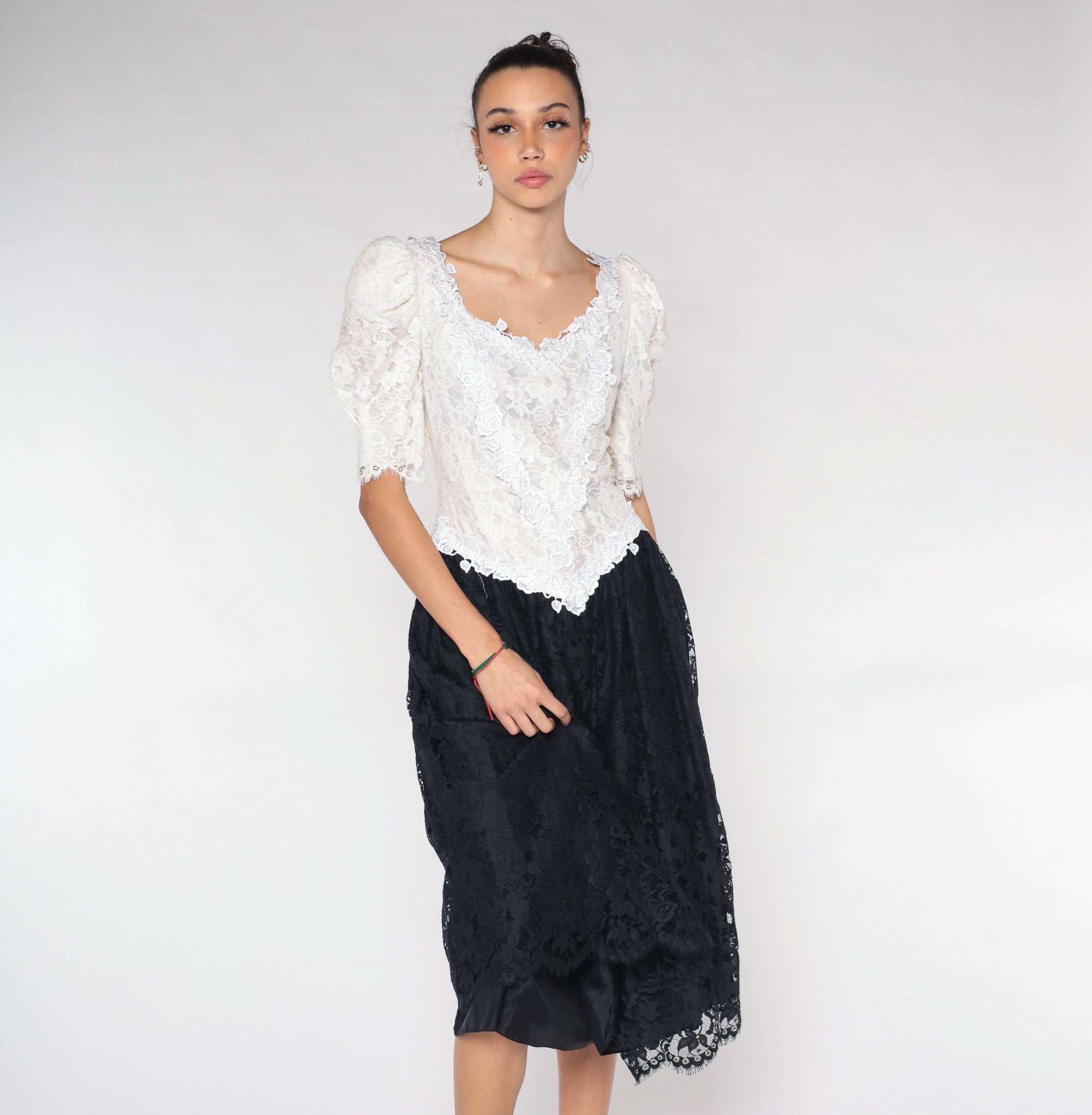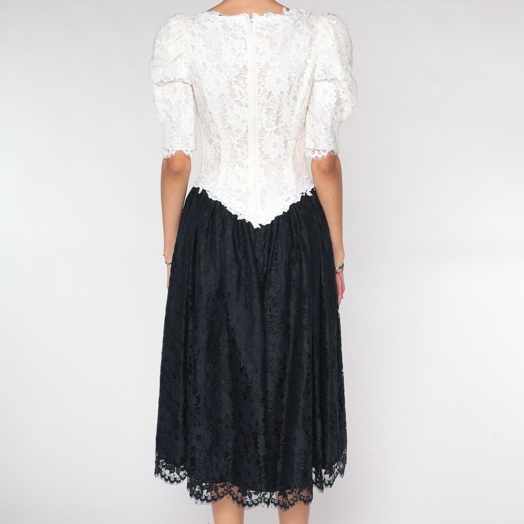Vintage 80s dress with a white lace bodice and a black lace skirt. It has puff sleeves and a basque waist. Midi length with a rear zipper.
