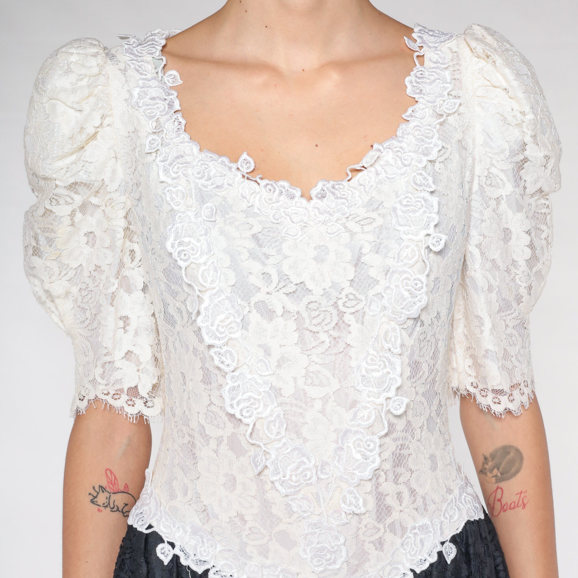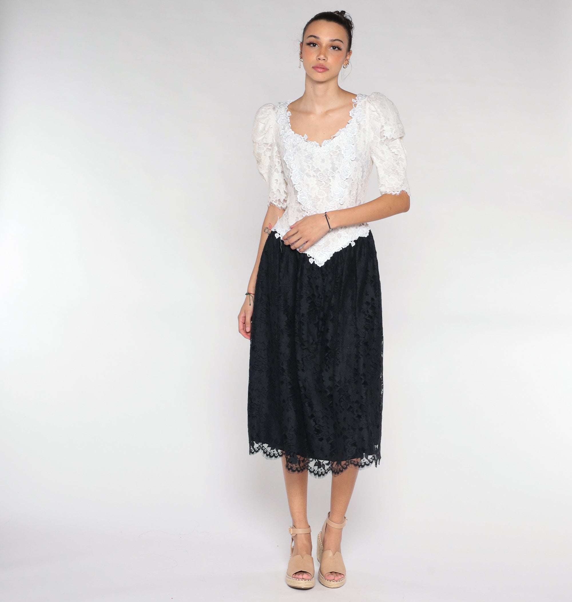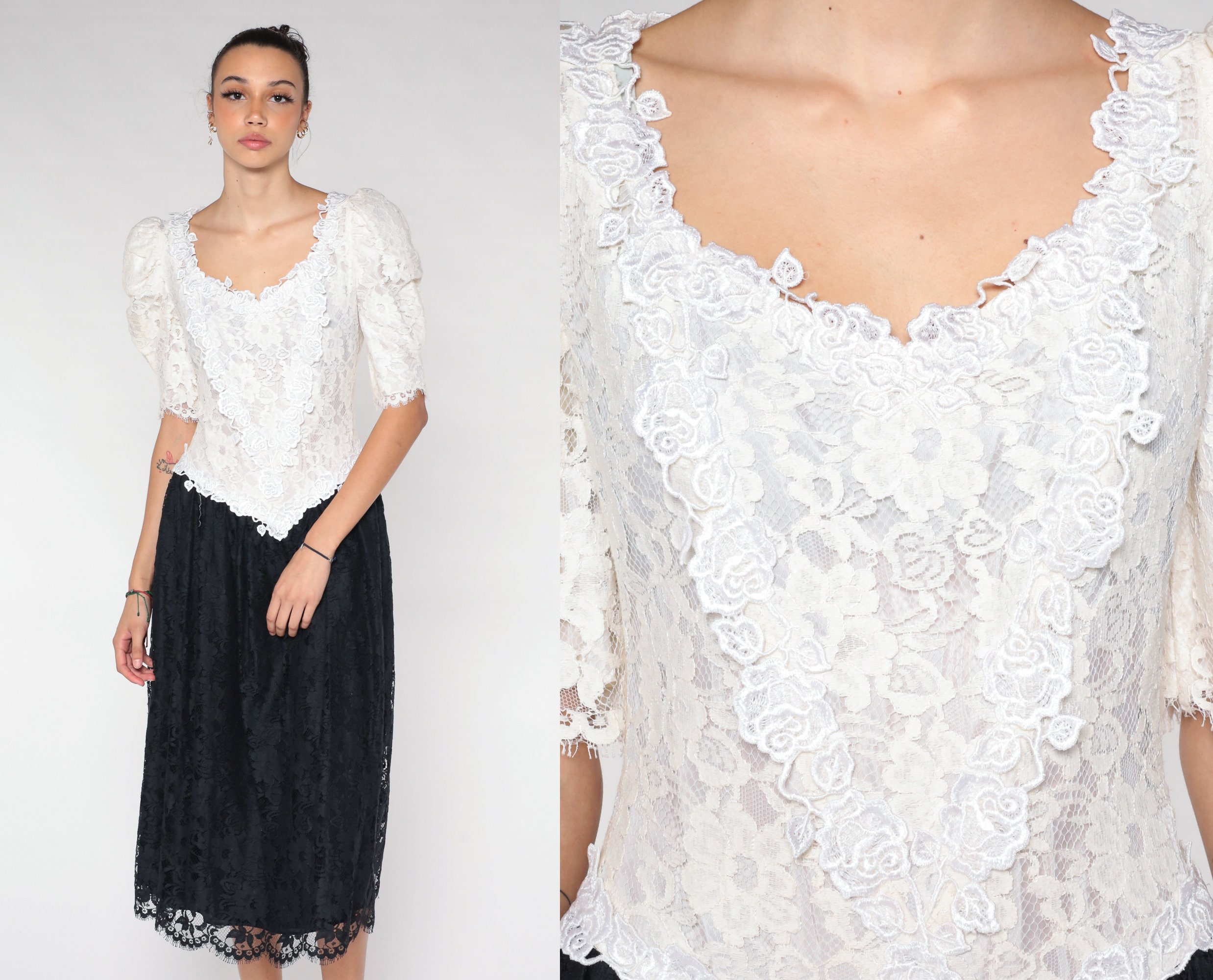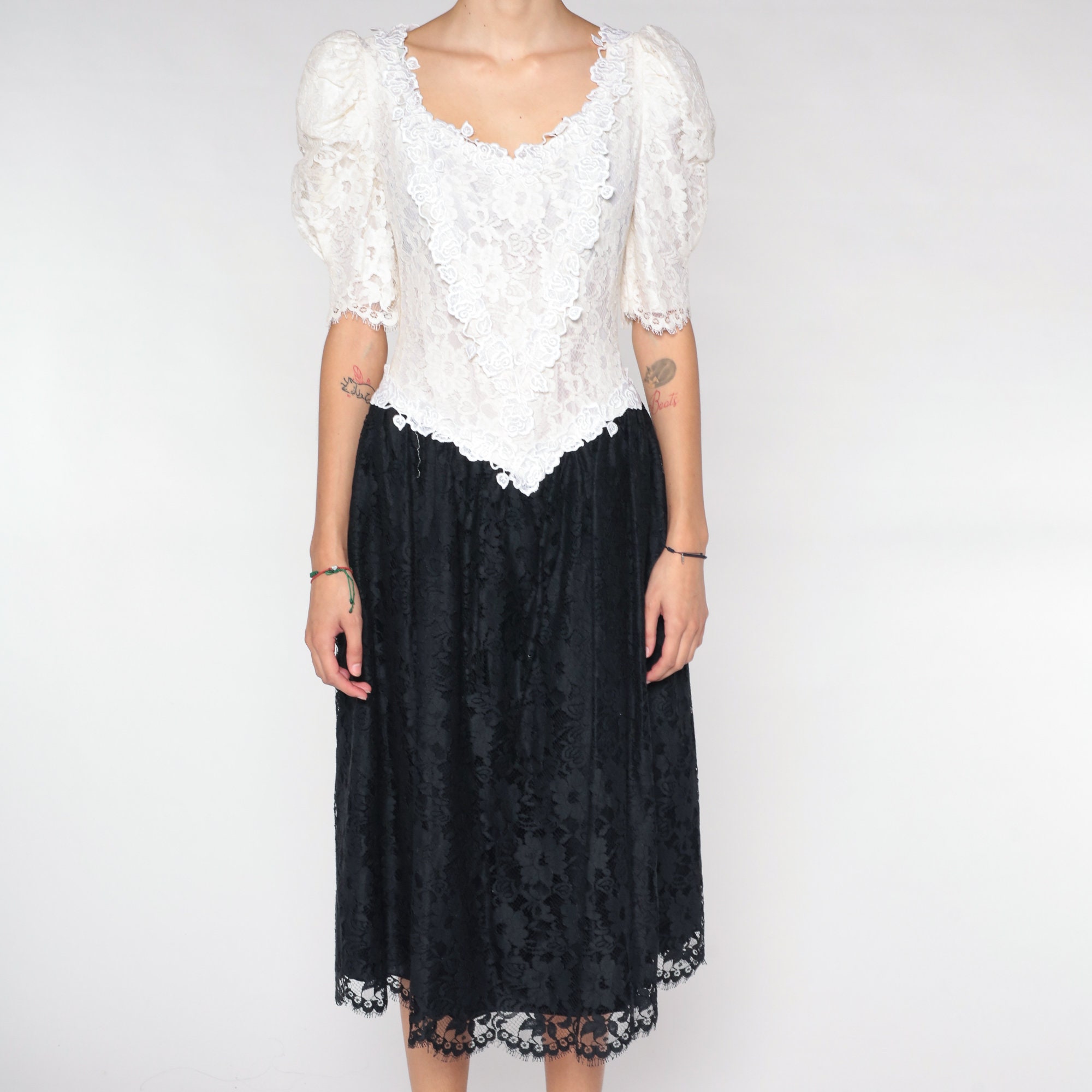 Vintage 80s dress with a white lace bodice and a black lace skirt. It has puff sleeves and a basque waist. Midi length with a rear zipper.