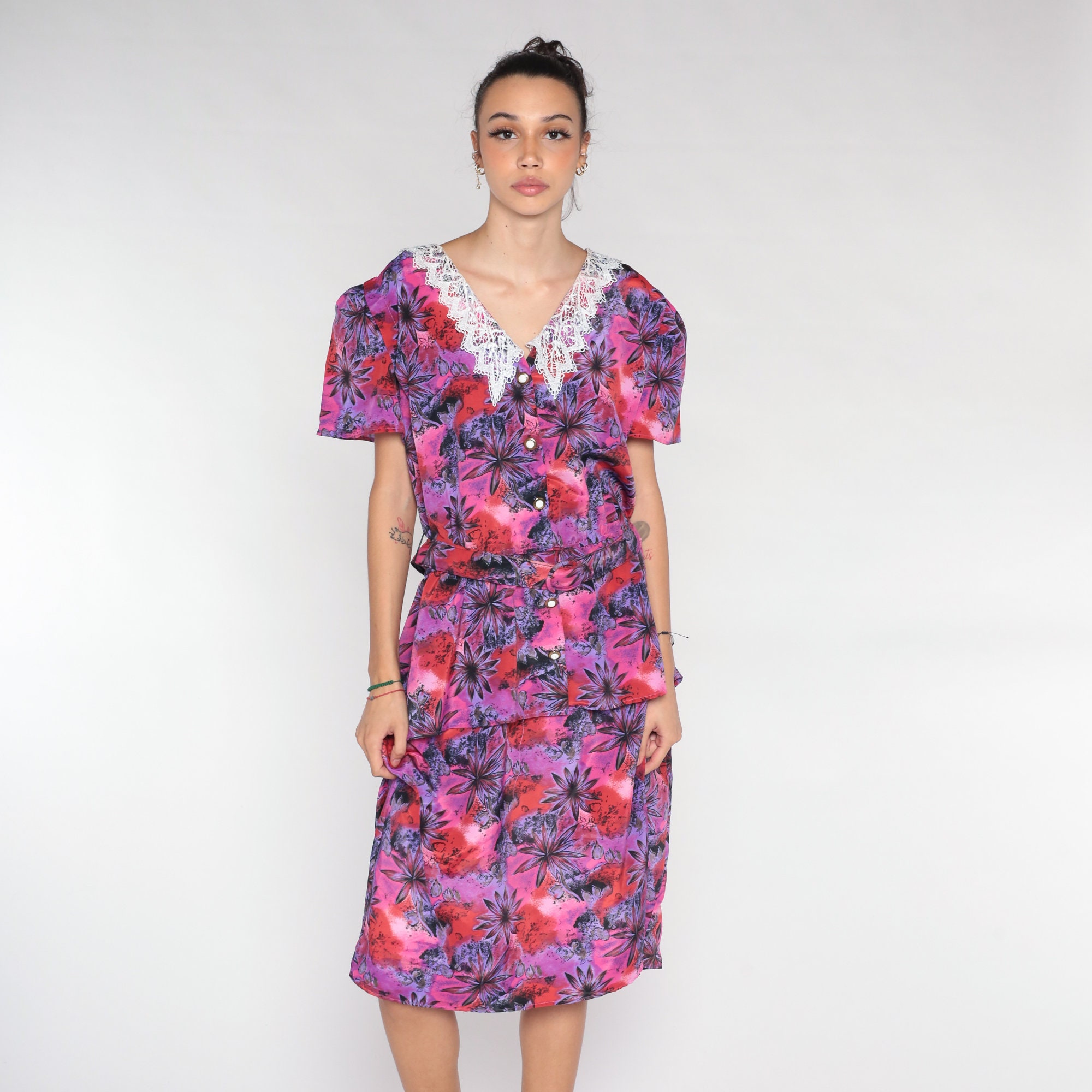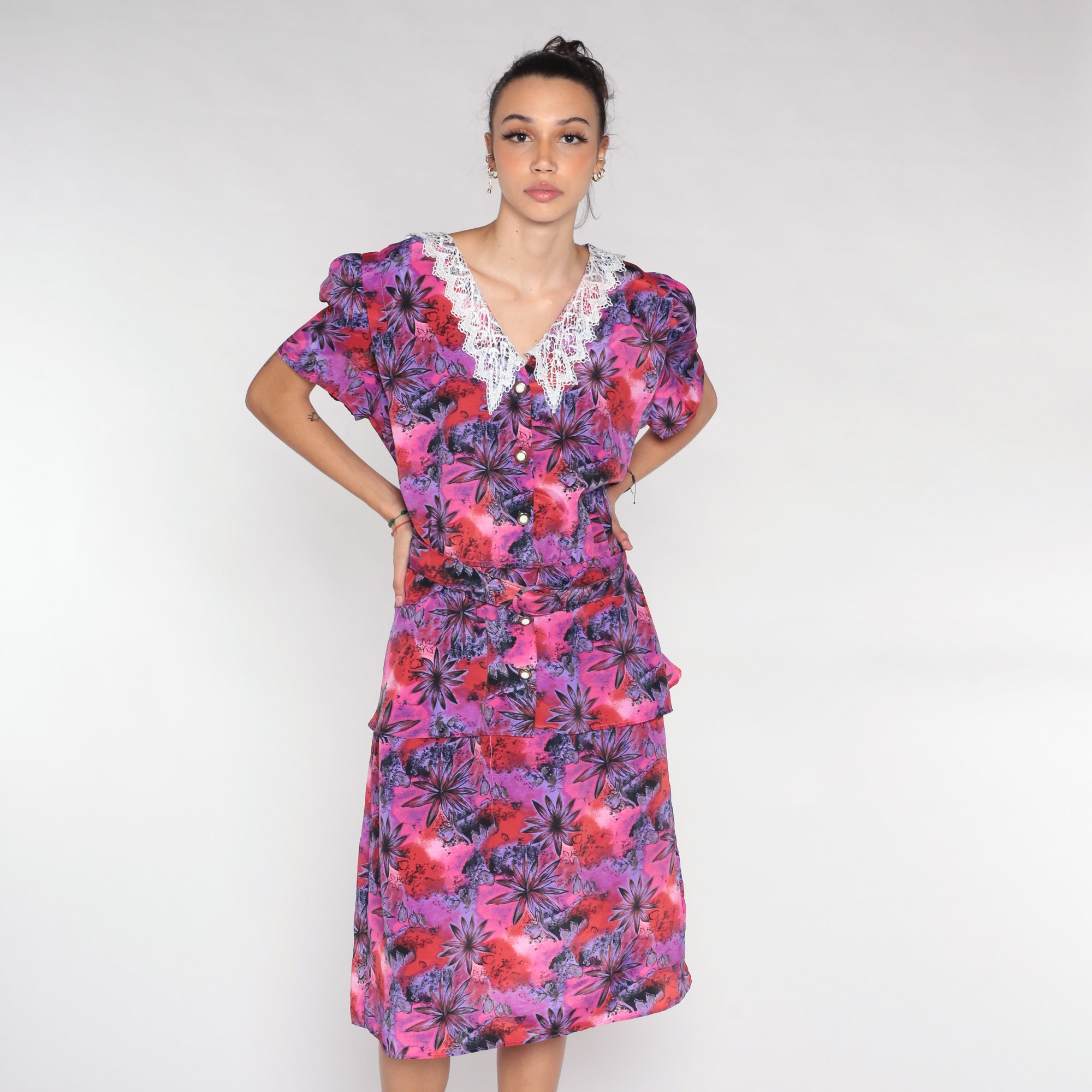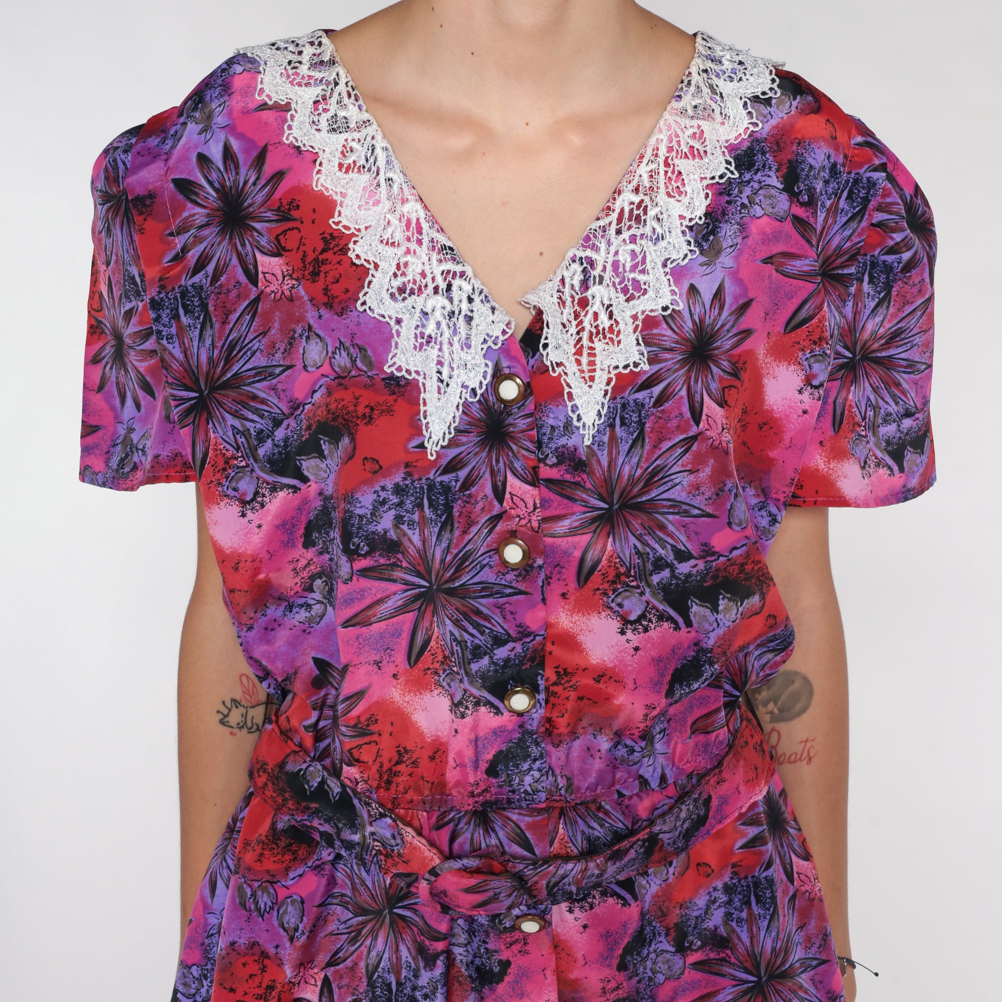 Vintage 80s dress in pink and purple with a floral print and lace collar. It has buttons down the chest, a matching belt, and a high waist with a peplum. Midi length.