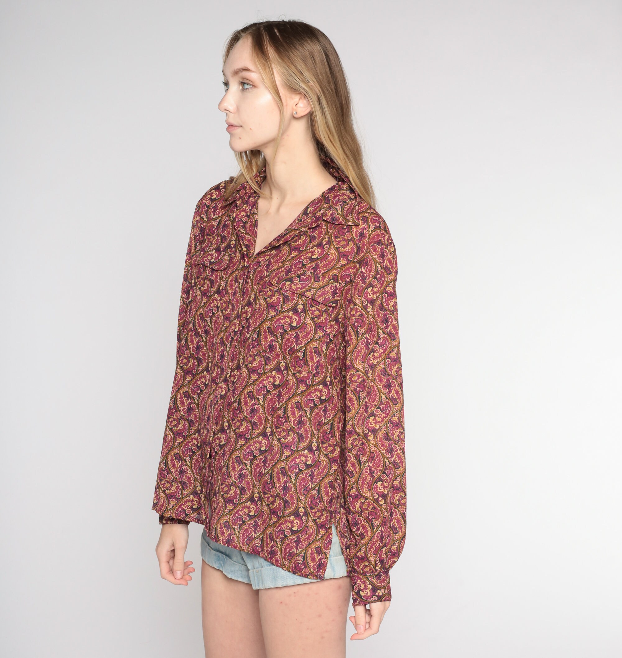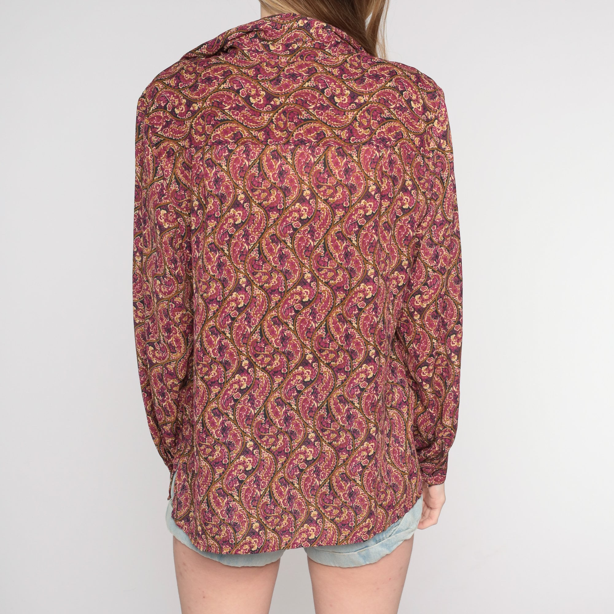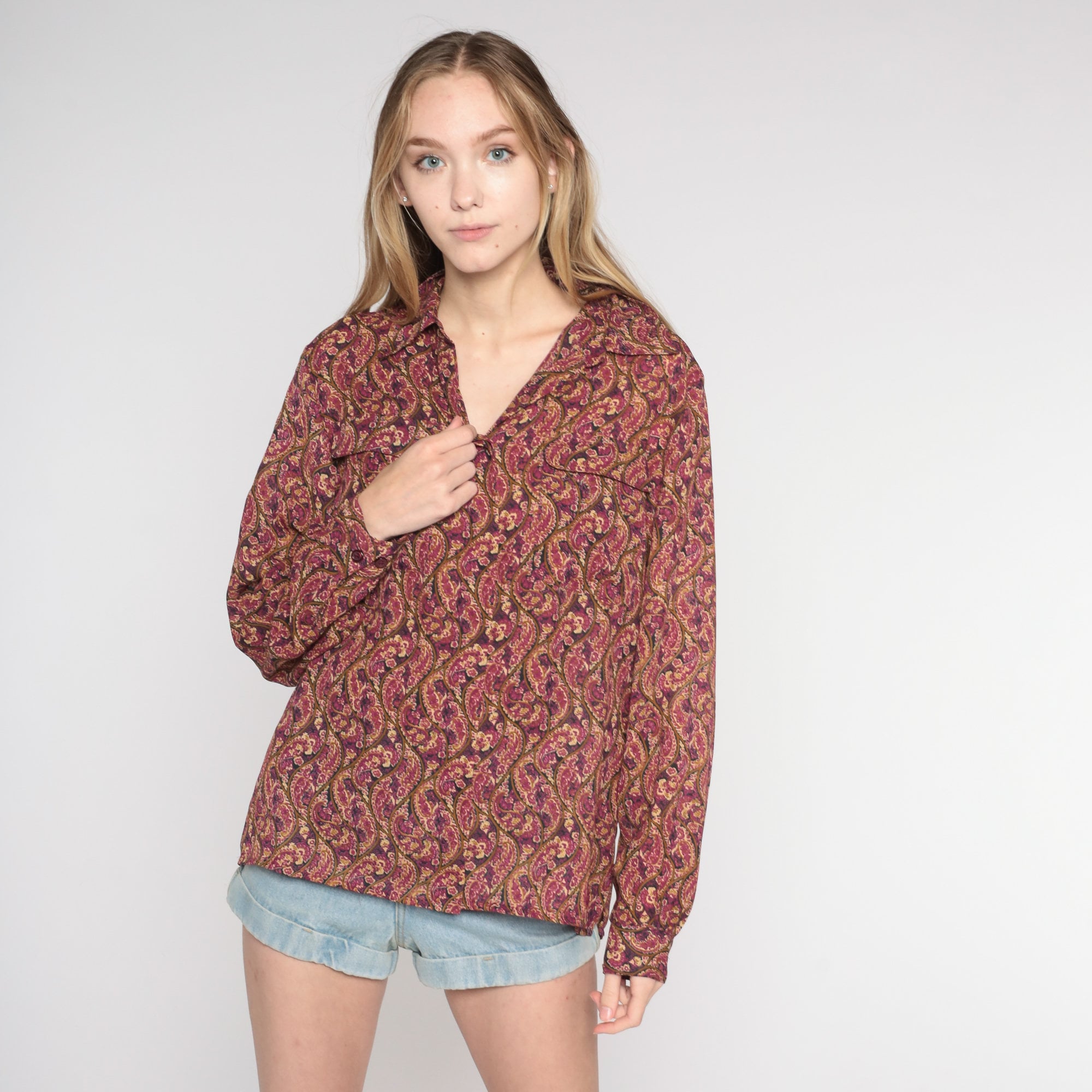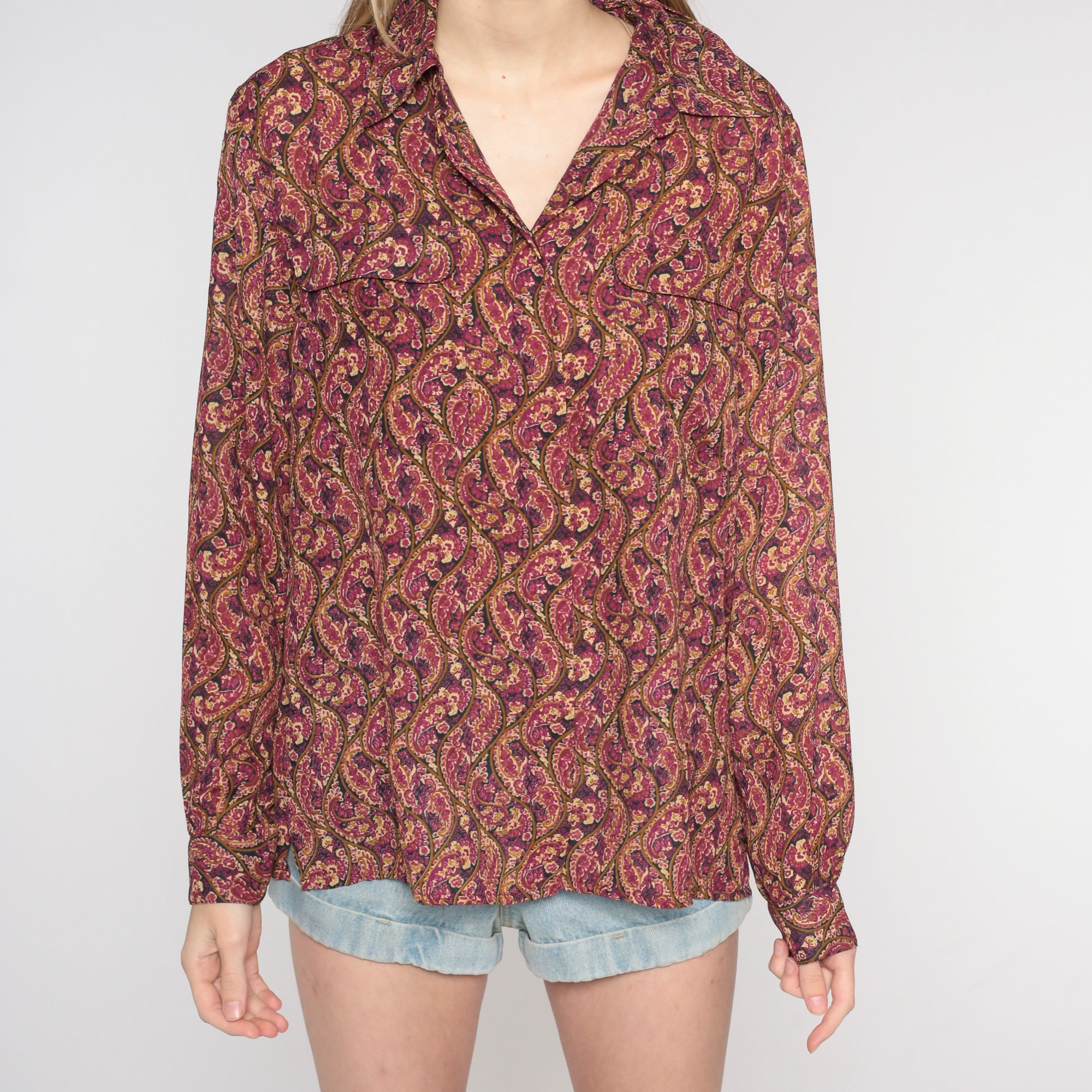 Vintage 90s blouse in a purple, pink, and tan paisley print. Long sleeves, buttons up the front.